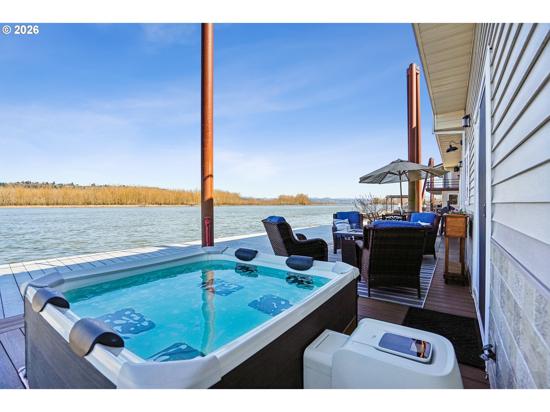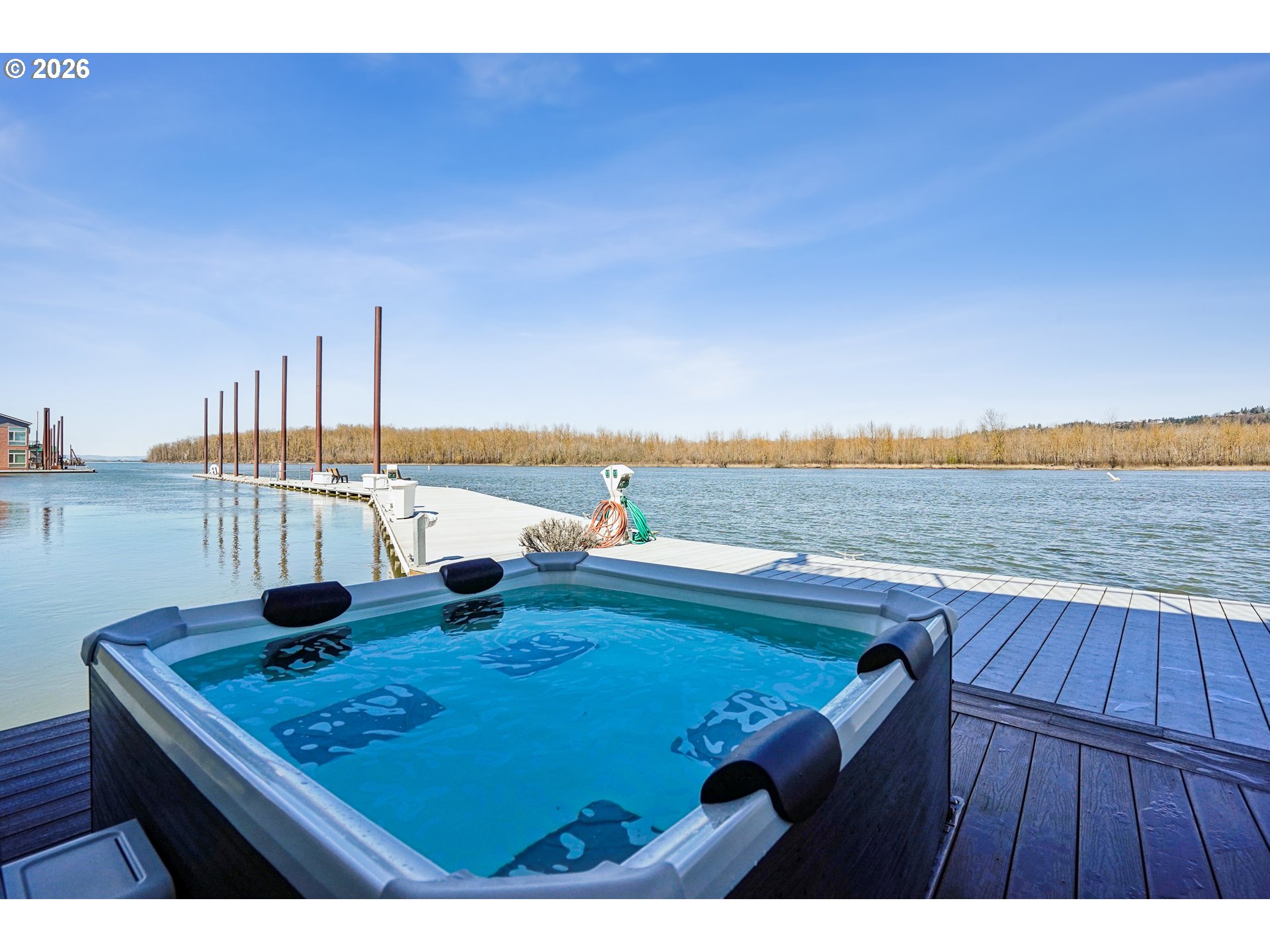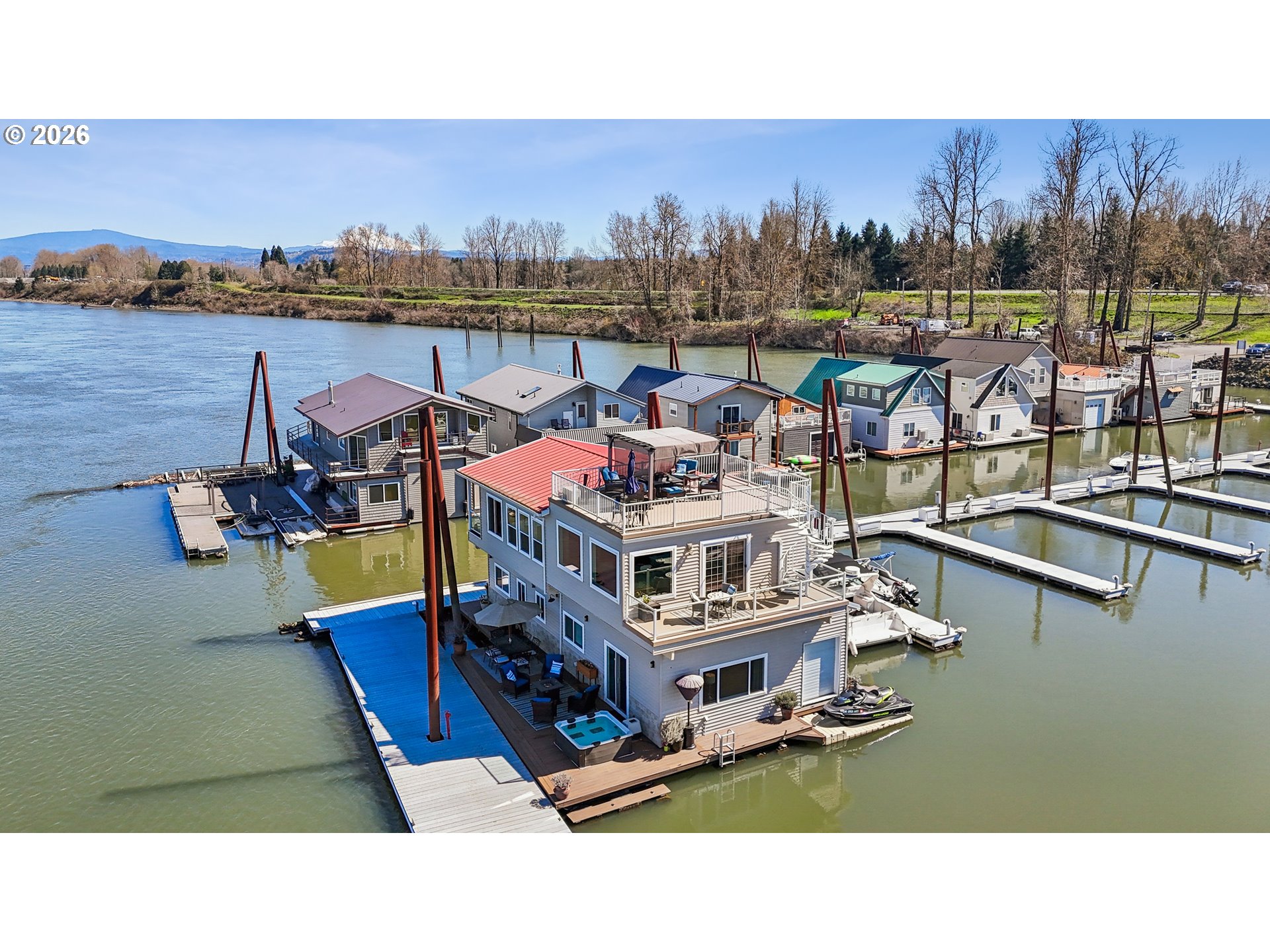 This elegantly renovated floating home occupies a rare end slip, providing enhanced privacy with no adjacent homes. Expansive windows throughout the space provide abundant natural light and unobstructed stunning views from dawn until dusk. The large open kitchen/ living space is a dream whether it’s a cozy night by the fireplace or having guests to share the luxury of a cooks kitchen with spacious counters where you know folks will congregate. Newer Luxury Vinyl Plank Flooring on both levels. Contemplate your day while enjoying sunrises and coffee off the dining room deck. There are four composite decks totaling 1400 SF with the roof top being the largest and Gazebo complete with sun shades & firepit! Hot tub is on the main level deck. What an opportunity to spend time enjoying nature and wildlife. The main level hosts three bedrooms, where laundry is located, 11 x 11 walk-in closet (could be 4th bedroom, exercise space, office) and heated floors on both levels. The luxurious primary ensuite includes a double marble top vanity and tiled shower w/ glass door as well as access to the large deck. Three fireplaces help you stay warm in winter and two mini splits keep you cool in the summer. Storage area off primary bedroom and gas hookup for BBQ grill on deck near kitchen. Residents benefit from a gated facility with guest parking and a boat launch. The solid float, rated 4 in March 2026, qualifies for all conventional financing options. While living on the river you have an intimate relationship with nature, water sports and fishing. Enjoy the gateway access to the Columbia River Gorge & live like a vacation every day!