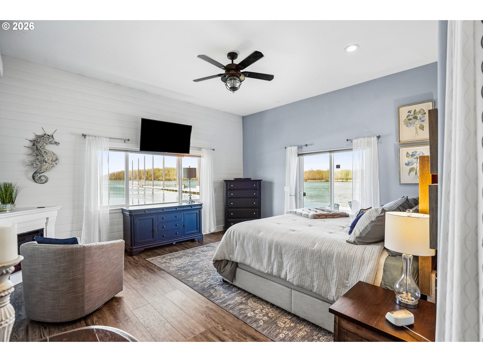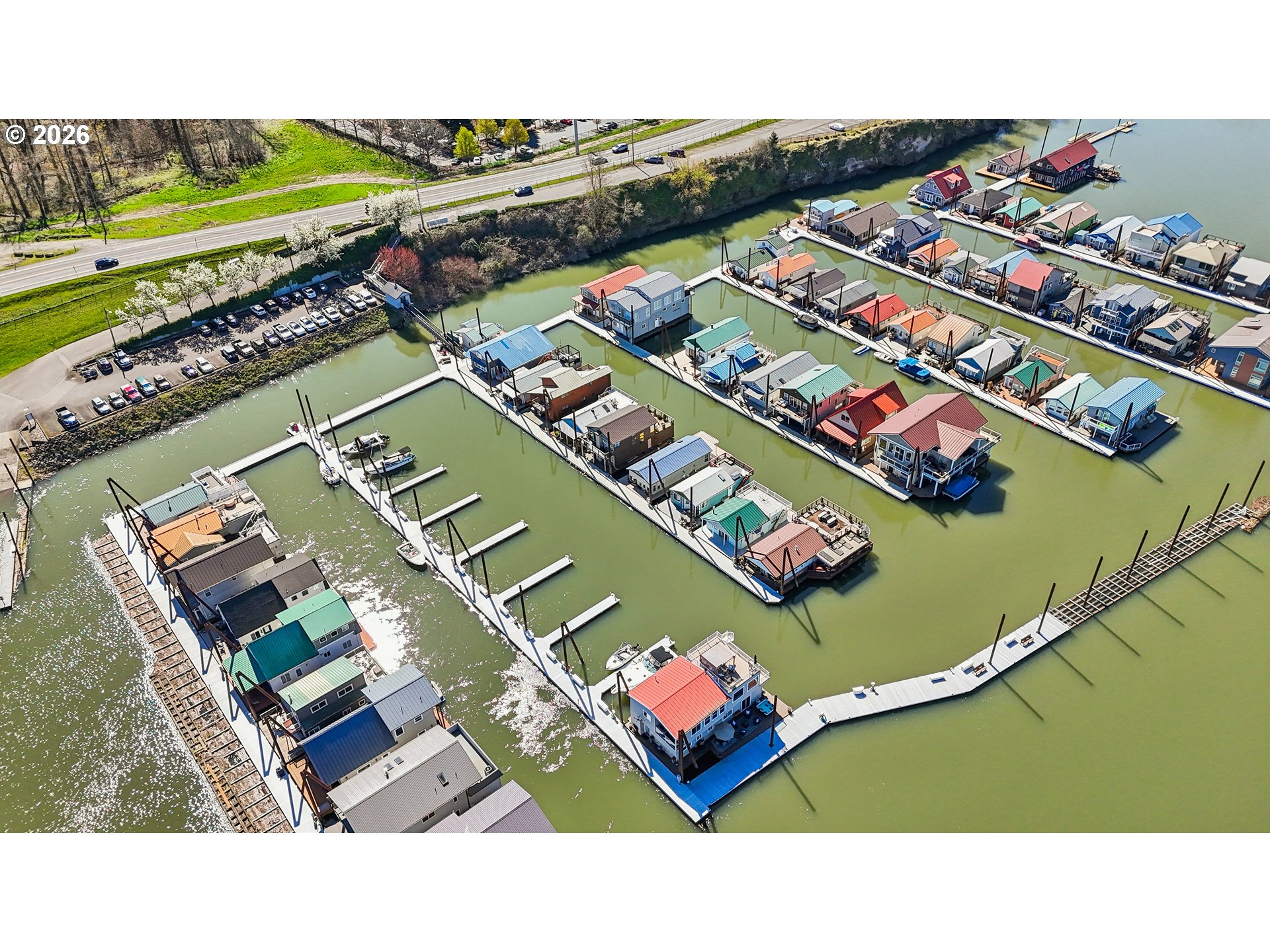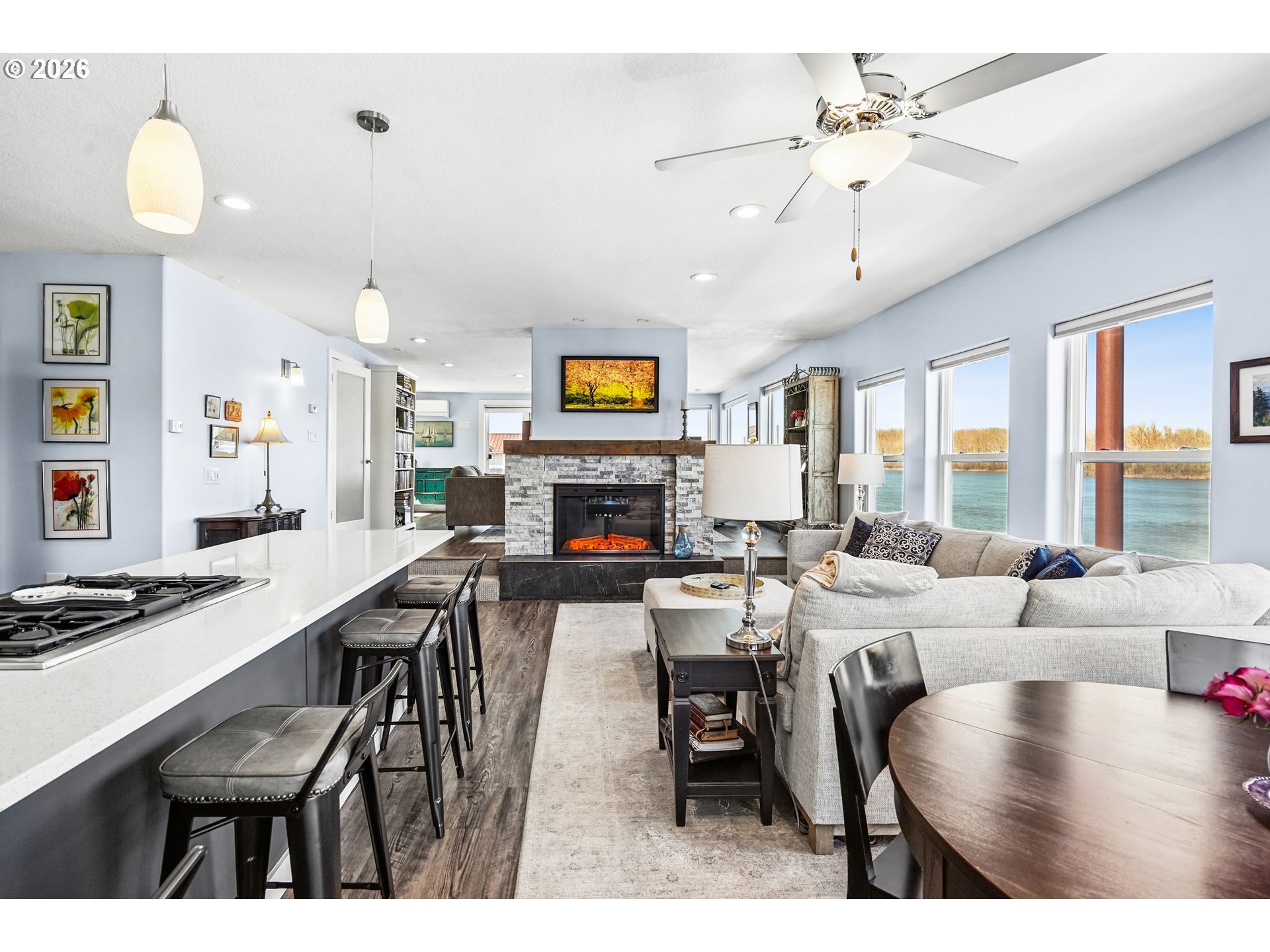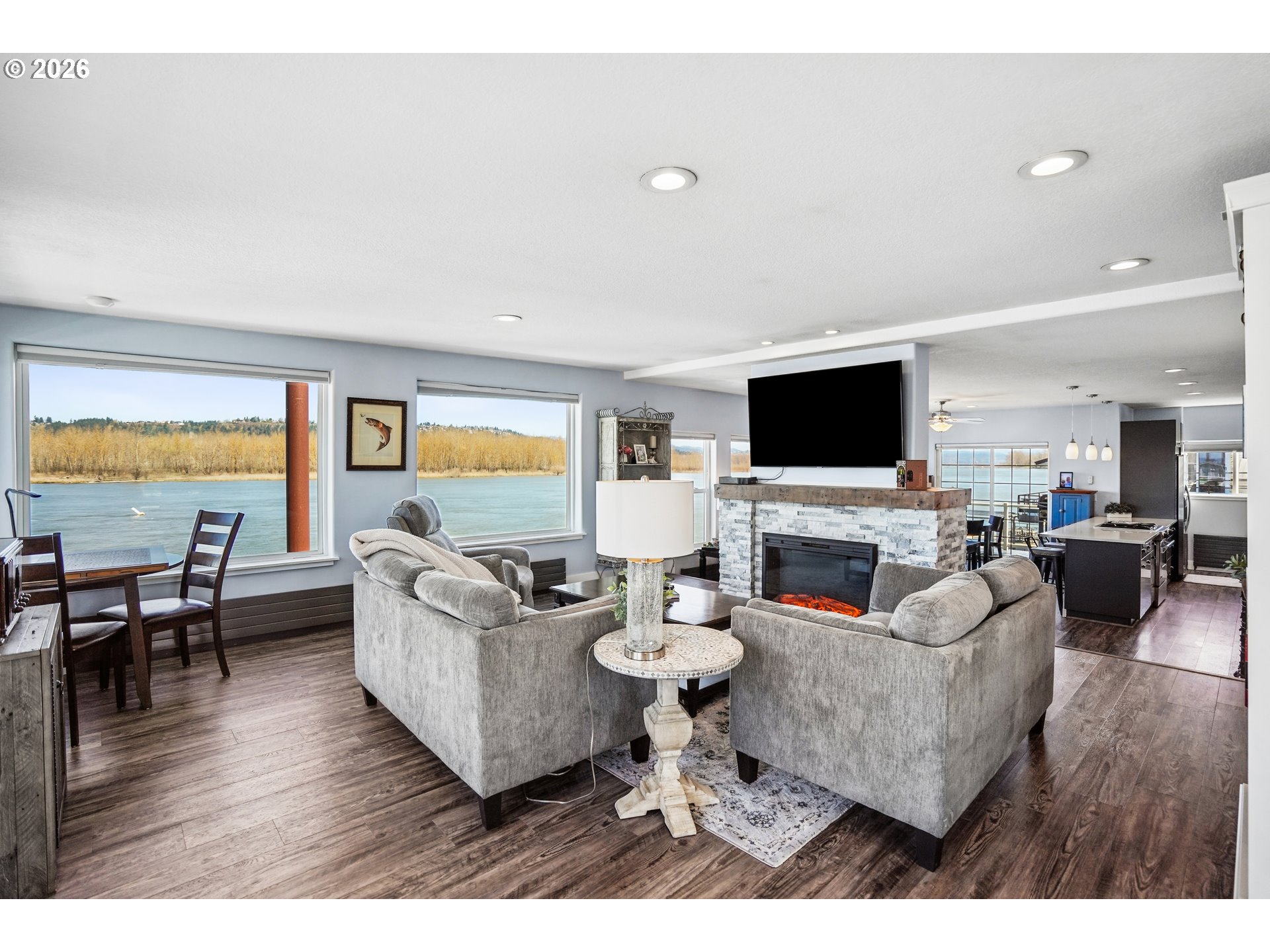 This elegantly renovated floating home occupies a rare end slip, providing enhanced privacy with no adjacent homes. Expansive windows throughout the space provide abundant natural light and unobstructed stunning views from dawn until dusk. The large open kitchen/ living space is a dream whether it’s a cozy night by the fireplace or having guests to share the luxury of a cooks kitchen with spacious counters where you know folks will congregate. Newer Luxury Vinyl Plank Flooring on both levels. Contemplate your day while enjoying sunrises and coffee off the dining room deck. There are four composite decks totaling 1400 SF with the roof top being the largest and Gazebo complete with sun shades & firepit! Hot tub is on the main level deck. What an opportunity to spend time enjoying nature and wildlife. The main level hosts three bedrooms, where laundry is located, 11 x 11 walk-in closet (could be 4th bedroom, exercise space, office) and heated floors on both levels. The luxurious primary ensuite includes a double marble top vanity and tiled shower w/ glass door as well as access to the large deck. Three fireplaces help you stay warm in winter and two mini splits keep you cool in the summer. Storage area off primary bedroom and gas hookup for BBQ grill on deck near kitchen. Residents benefit from a gated facility with guest parking and a boat launch. The solid float, rated 4 in March 2026, qualifies for all conventional financing options. While living on the river you have an intimate relationship with nature, water sports and fishing. Enjoy the gateway access to the Columbia River Gorge & live like a vacation every day!