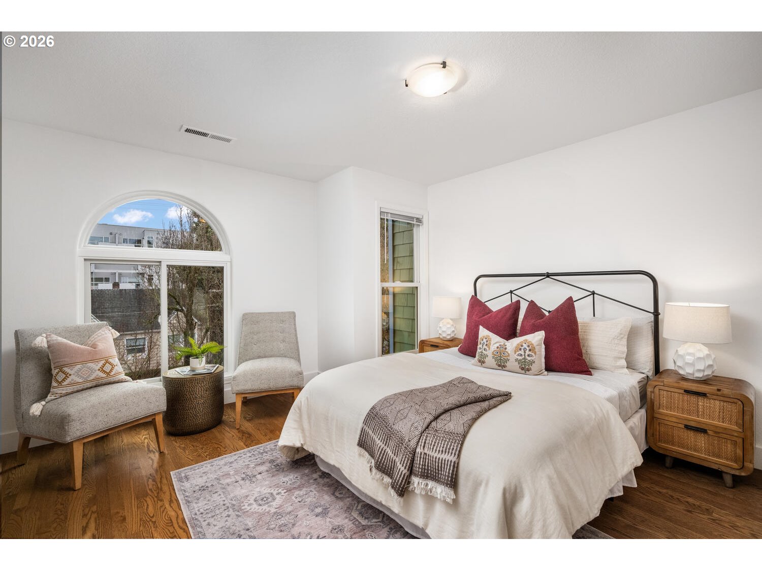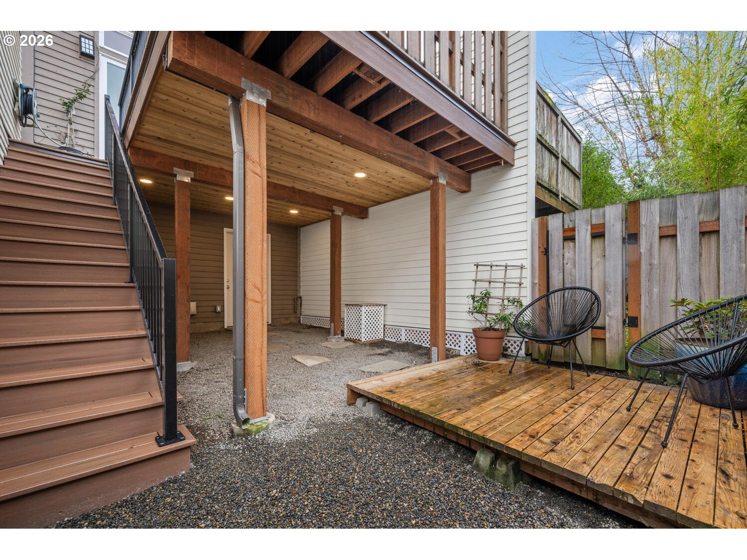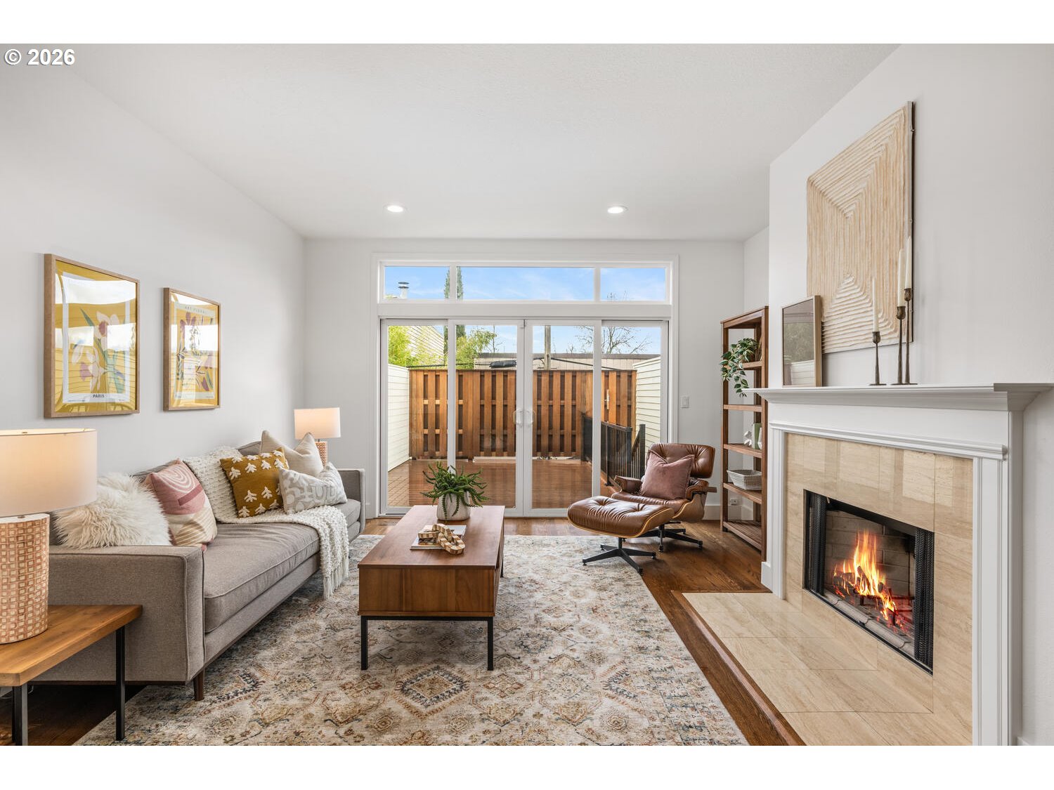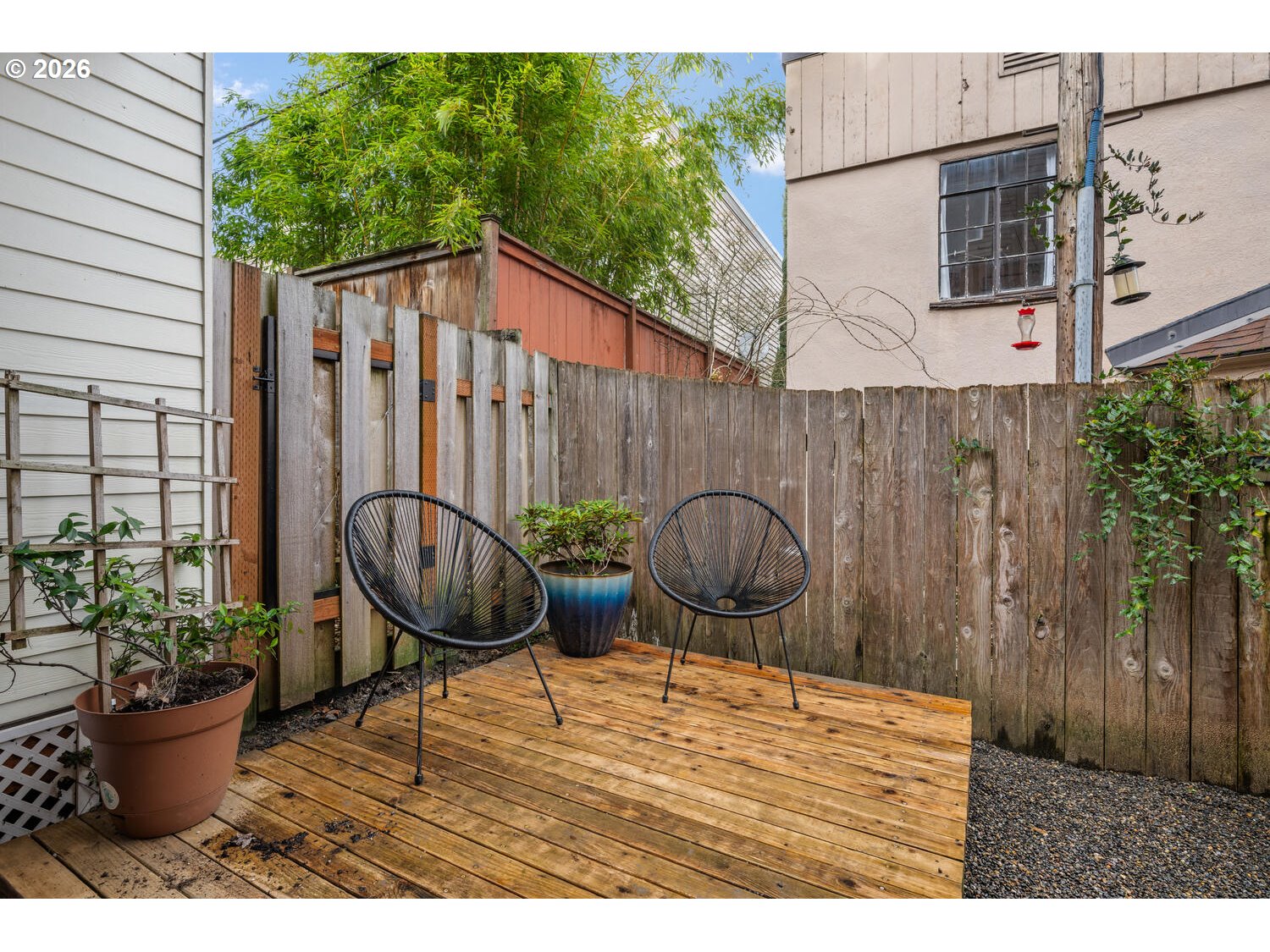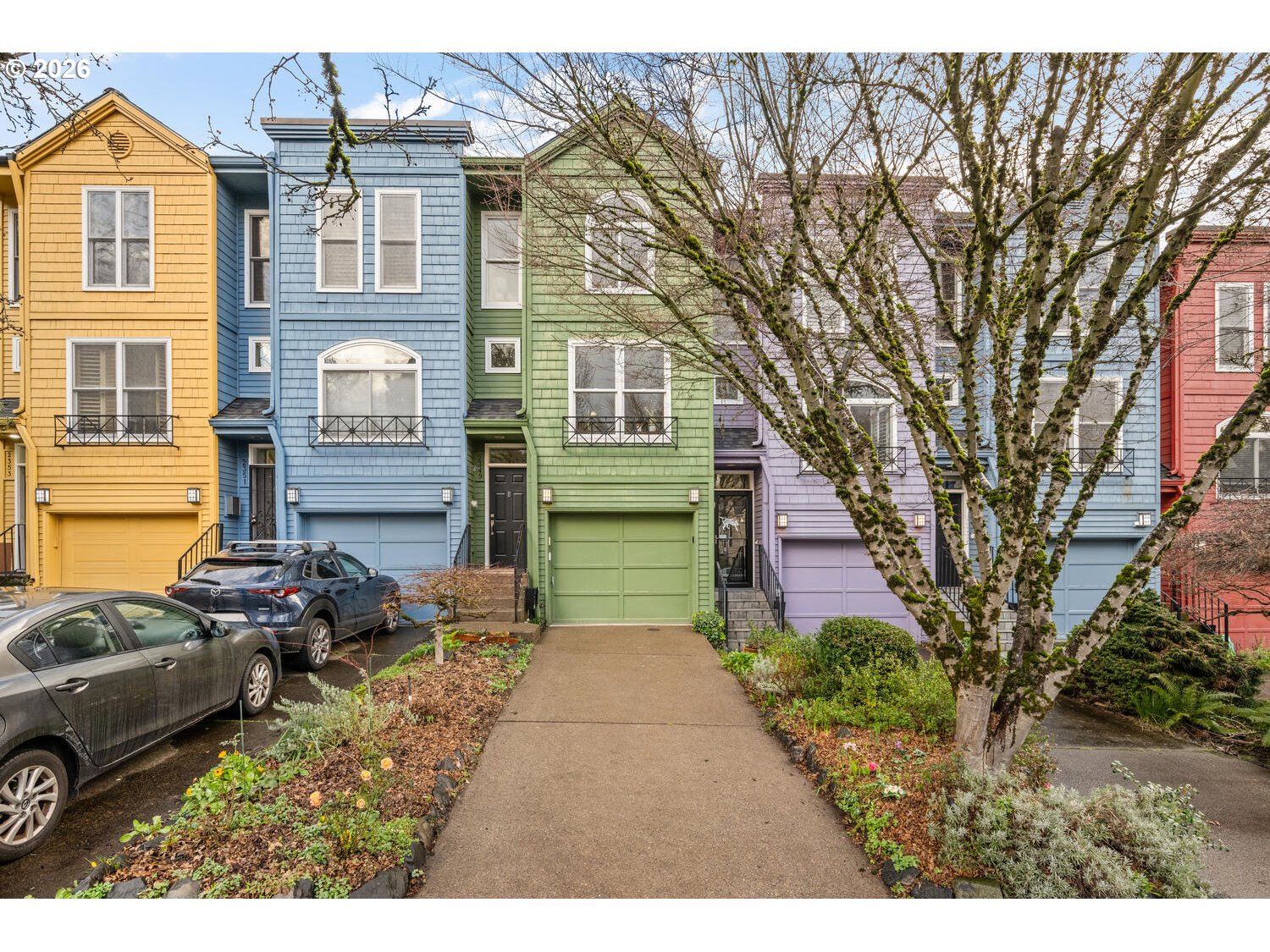 Welcome to the iconic “Crayola Crayon” Overton Rowhouses, perfectly positioned just steps from vibrant NW 23rd Ave in the heart of NW Portland. This 2BD + den residence lives like a detached home with its own private entry, backyard, and an exceptionally deep 51.5’ tandem garage (approx. 749 SF)—ideal for multiple vehicles, storage, a workshop, or home gym—plus two off-street driveway spaces, a rare find in this neighborhood. Inside, soaring ceilings and abundant natural light create an airy feel, complemented by hardwood floors, fresh interior paint, and a cozy wood-burning fireplace. The open-concept main level flows seamlessly to a rebuilt TimberTech Azek Mahogany deck (2023) with stairs to a low-maintenance backyard—perfect for entertaining or relaxing. Upstairs, both bedrooms feature attached full baths, offering flexibility for guests or dual primary suites. Additional highlights include a 2023 roof and thoughtful updates throughout. Annual HOA fee currently $240. and a Walk Score of 98—just moments to cafés, boutiques, parks, and Forest Park trails. Add a little color to your world and experience the energy, convenience, and timeless appeal of a Crayola Crayon rowhouse.