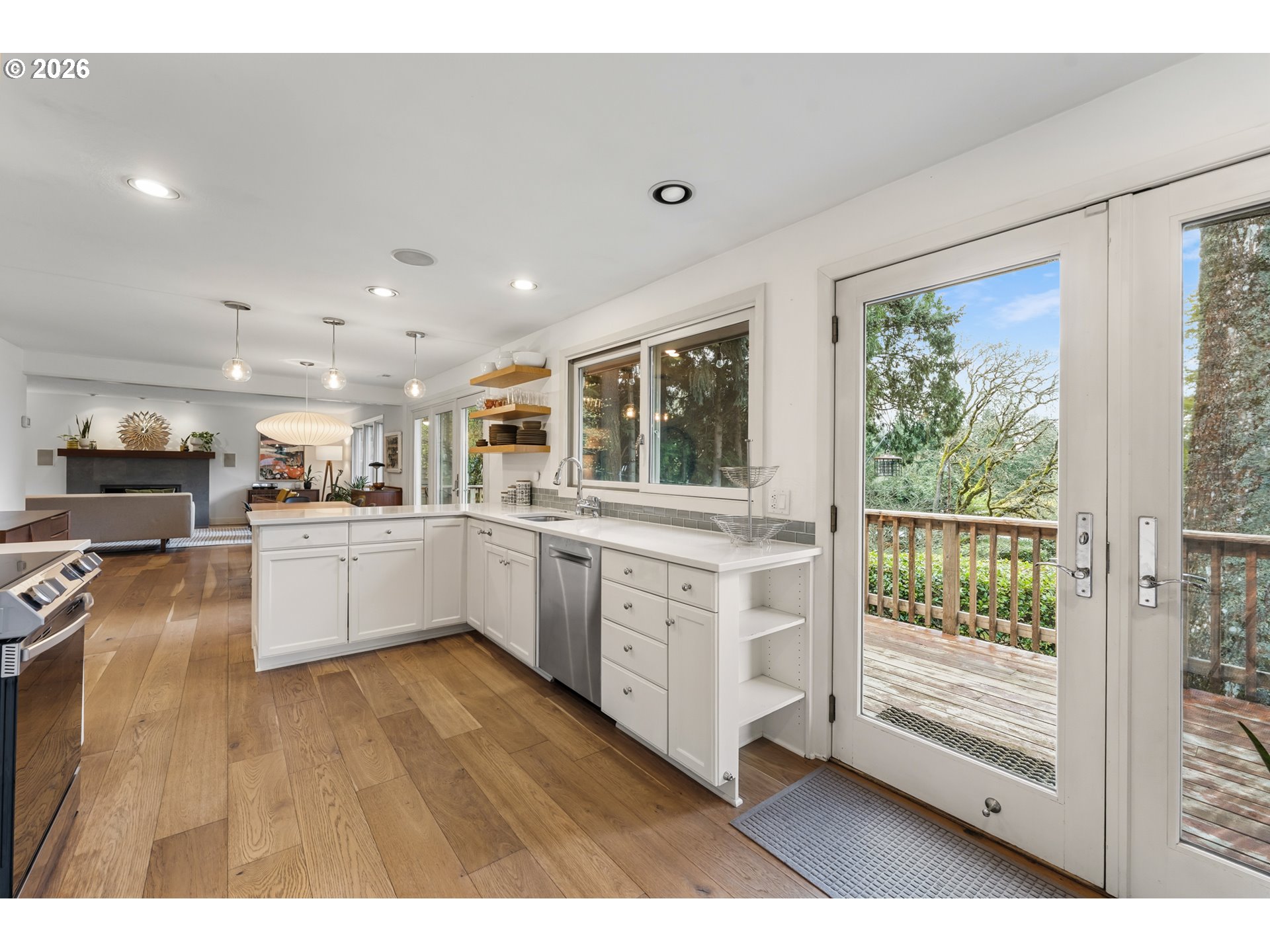 Beautifully updated mid-century, daylight ranch in the desirable Hillsdale area. Situated on a stunning private 0.43 acre lot on a quiet cul-de-sac. The open floor plan draws you to the feature walls of windows overlooking tranquil, south facing park-like yard. The bright and airy living room, with contemporary gas fireplace and dining area, flows to the updated kitchen with high-end appliances, quartz counters and custom cabinetry. An expansive deck runs the length of the home providing true indoor-outdoor living. The main floor also offers a full bath and secondary bedroom. Just a half a flight up is the private primary bedroom and adjoining bath with double sinks, walk in shower, separate water closet and walk in closet. Hardwoods run throughout the main level. The lower level provides space for a third bedroom, full bath with walk in shower, separate office area with exterior entrance, laundry room, and a large family room with built-in bookcases and a second gas fireplace. Yard features a second oversized deck, perfect for entertaining, huge lawn, sport court and patio with fire pit. The home offers radiant heat plus A/C. Conveniently located to Hillsdale restaurants, bakery, shops, library etc. [Home Energy Score = 6. HES Report at https://rpt.greenbuildingregistry.com/hes/OR10113439]
