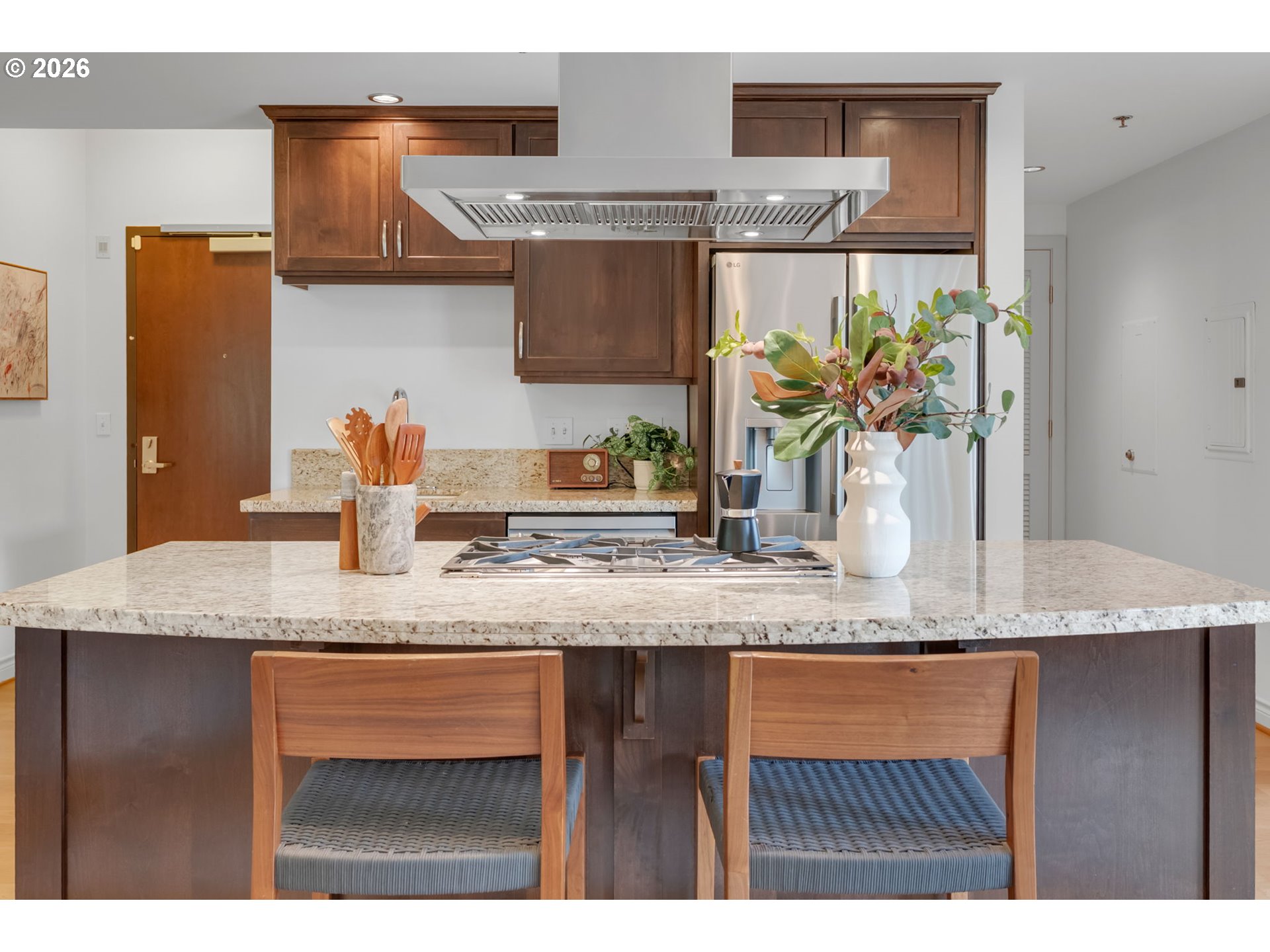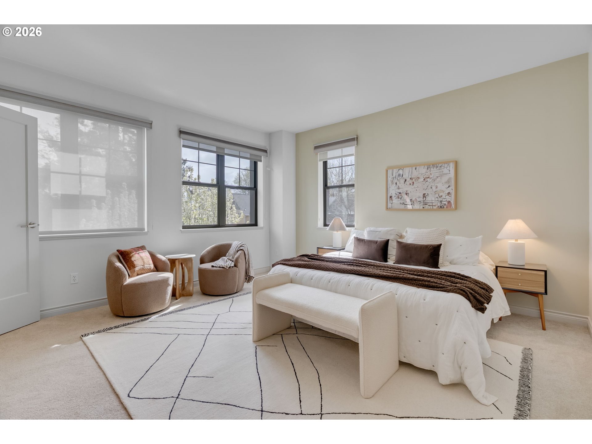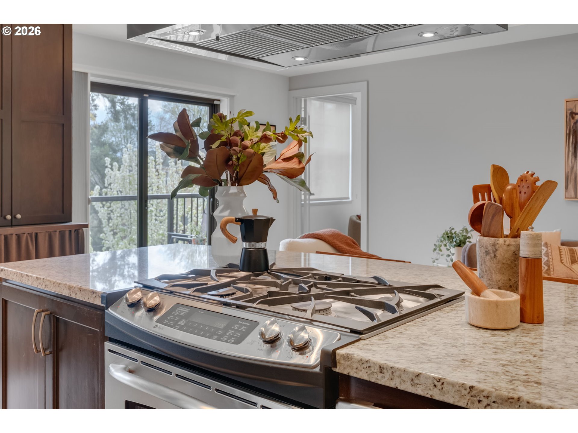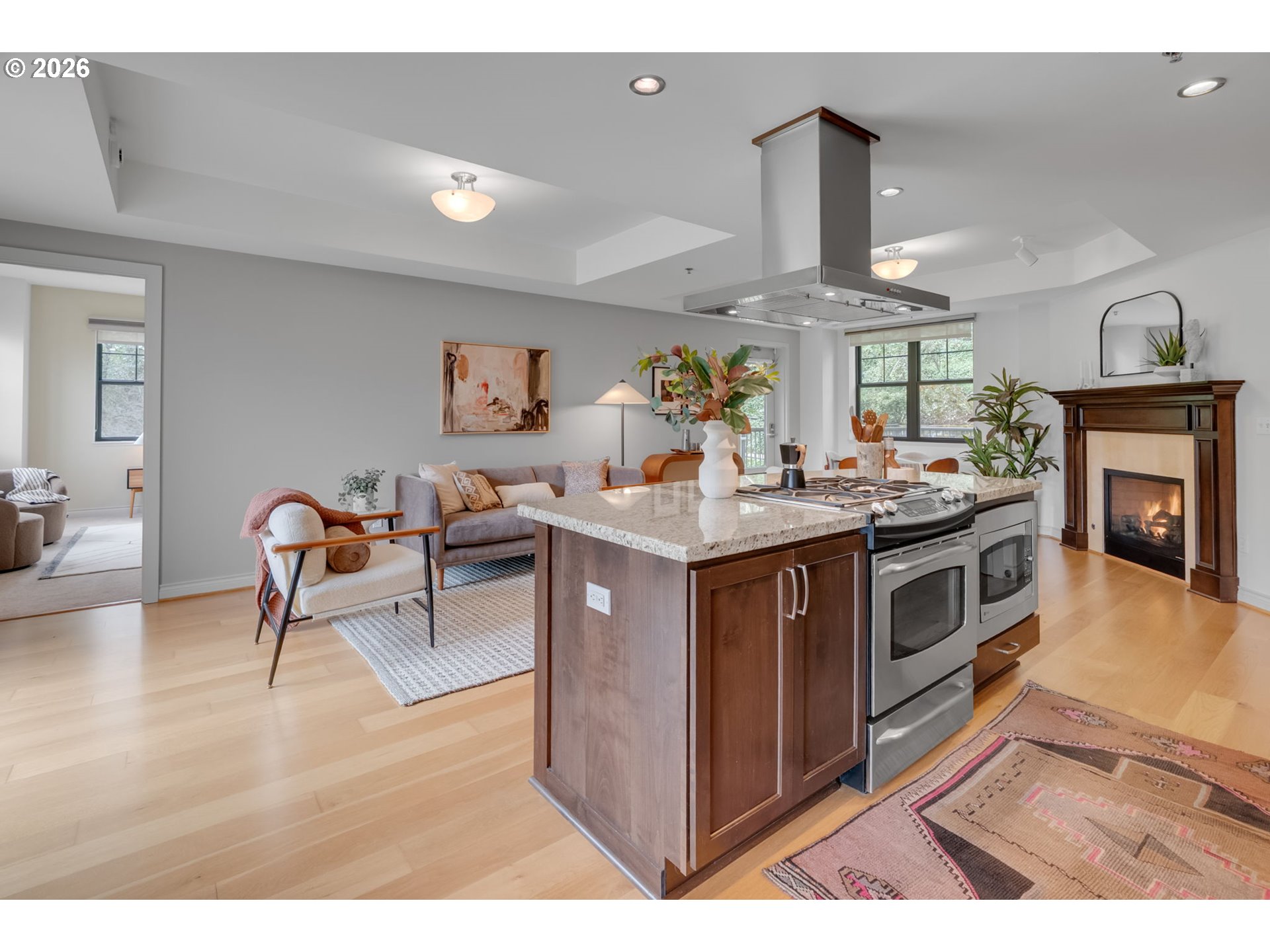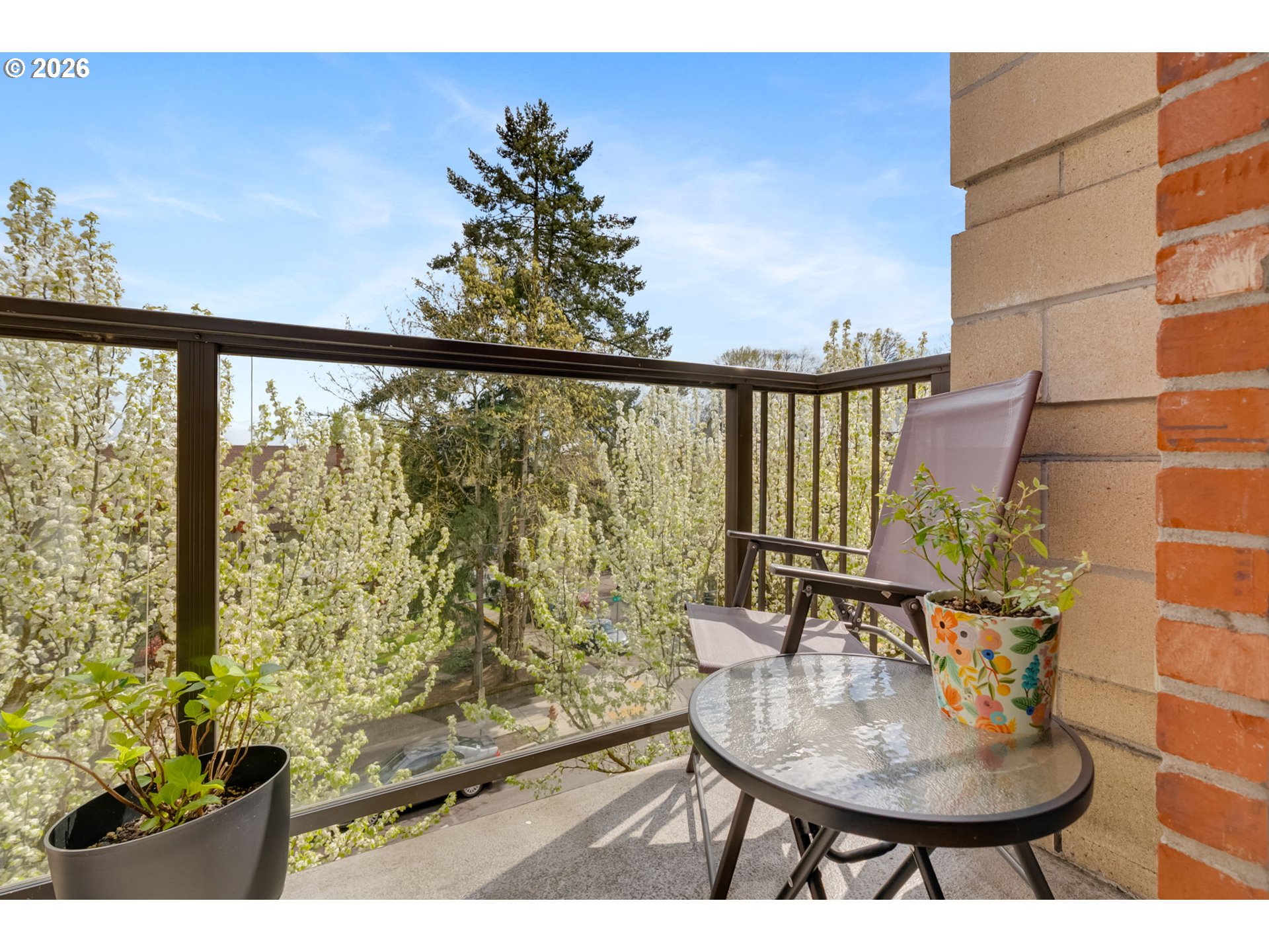 Rare 2/2 "Un-Condo”-Condo in heart of NW's Alphabet District Lives like a home, not a condo. Elegant ground-level corner unit with a view at the sought-after Cambridge, featuring a super convenient private side entrance. With no shared walls it is exceptionally peaceful. You have an open floorplan that flows effortlessly, incorporating a dining area, living room and eat-in bar, all bathed in beautiful natural light and surrounded by gorgeous trees. Hardwood floors, two full baths, and a fantastic back balcony with city skyline views and a peek of Mt. Hood -- all framed by charming Georgetown-style brick.Two parking spaces + storage. Brand new LG fridge with designer ice. Whisper-quiet dishwasher. Walk to Zupan’s, Smith Teamaker, Elephant’s Deli, and NW 23rd in minutes. Tree-lined, quiet, and endlessly charming—this is NW Portland living at its finest, with a well-run, thoughtful and inclusive HOA that covers exterior maintenance, gas, hot water, insurance, grounds, sewer and trash.