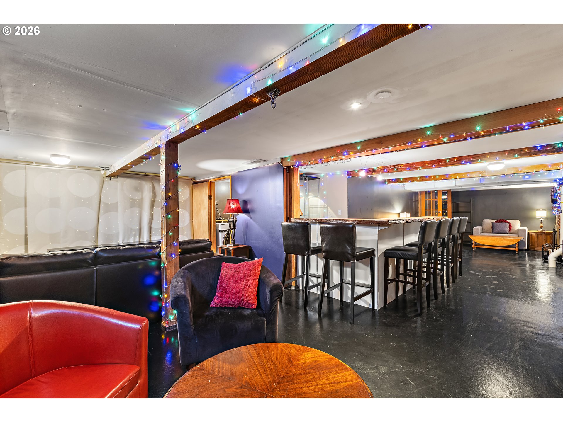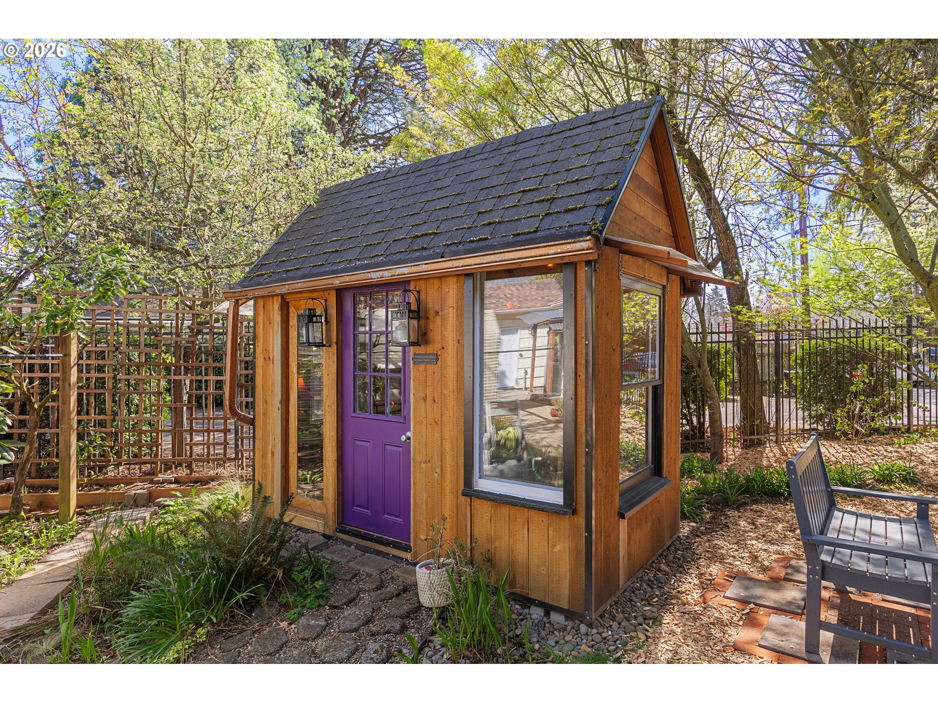 Experience a private urban oasis that has been meticulously updated for ultimate peace of mind and modern luxury. This property is anchored by a brand-new roof and professionally arbored trees, both completed in 2026, and is fully secured by a sleek ornamental fence installed in 2023. The exterior sanctuary features a greenhouse, a whiskey bar shed modeled after the iconic Red Shed at Edgefield, and a newly installed sauna for 2026. Inside, the home offers year-round comfort with central AC and a new water heater, while the dedicated aerial fiber optic line ensures lightning-fast connectivity. The main level shines with hardwood floors, two bedrooms, and a dedicated office, while the lower level serves as the ultimate chill zone with a six-seat bar, lounge, and flexible third non-conforming bedroom. Beyond the main house, the extra-deep, fully finished detached garage boasts custom double garage doors installed in 2024, making it a perfect workshop or studio. Whether you are relaxing on the covered deck in the private hot tub or enjoying the seamless blend of high-end upgrades and vintage charm, this home is a rare find.