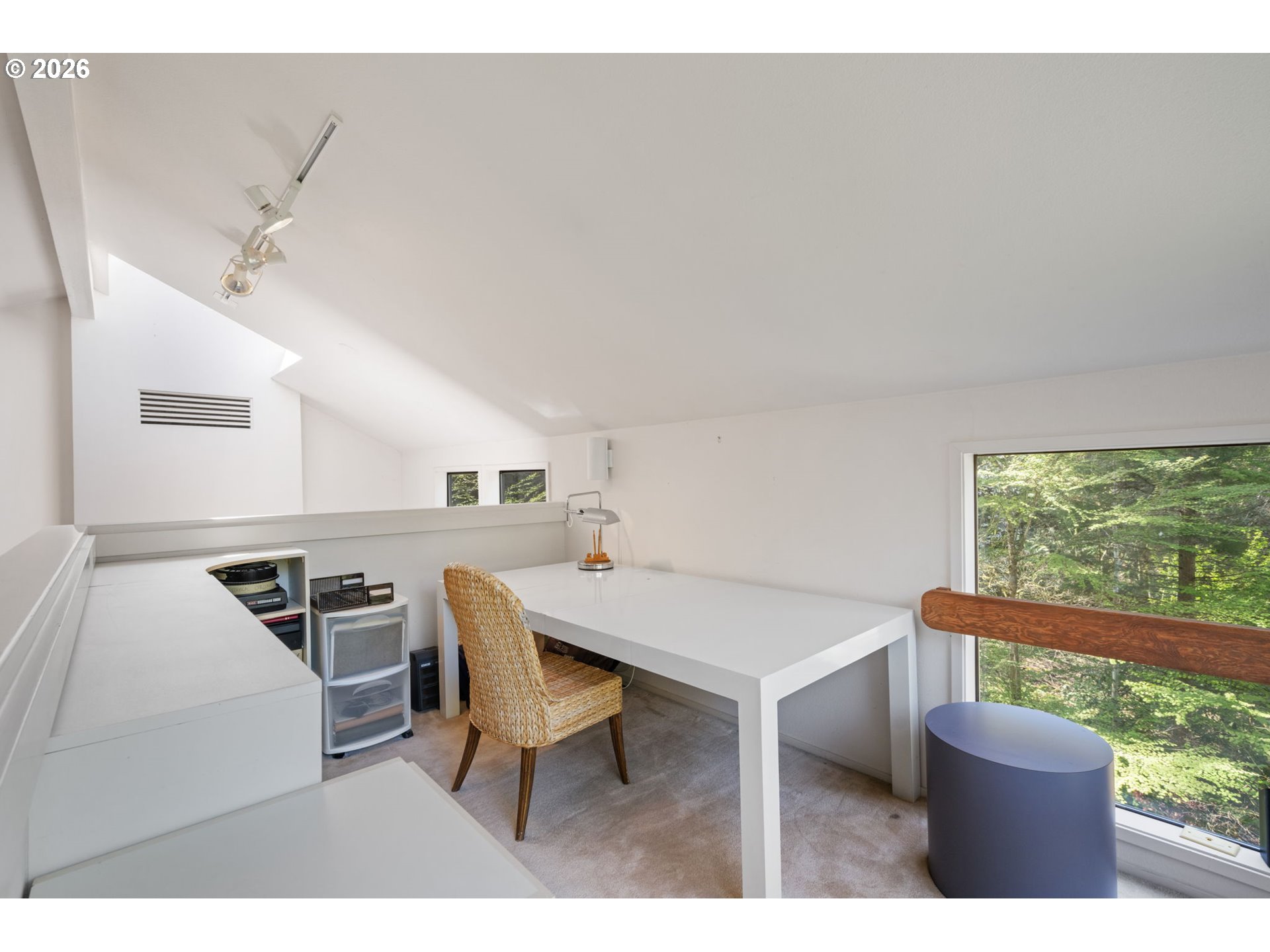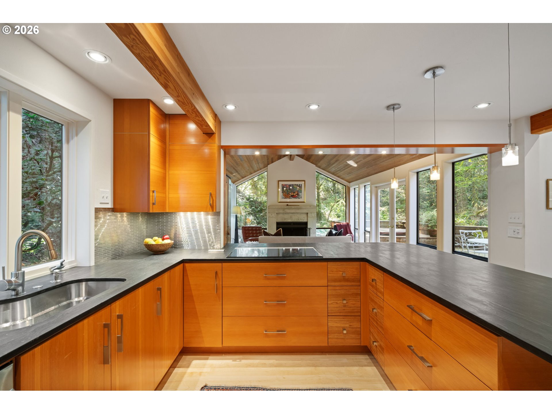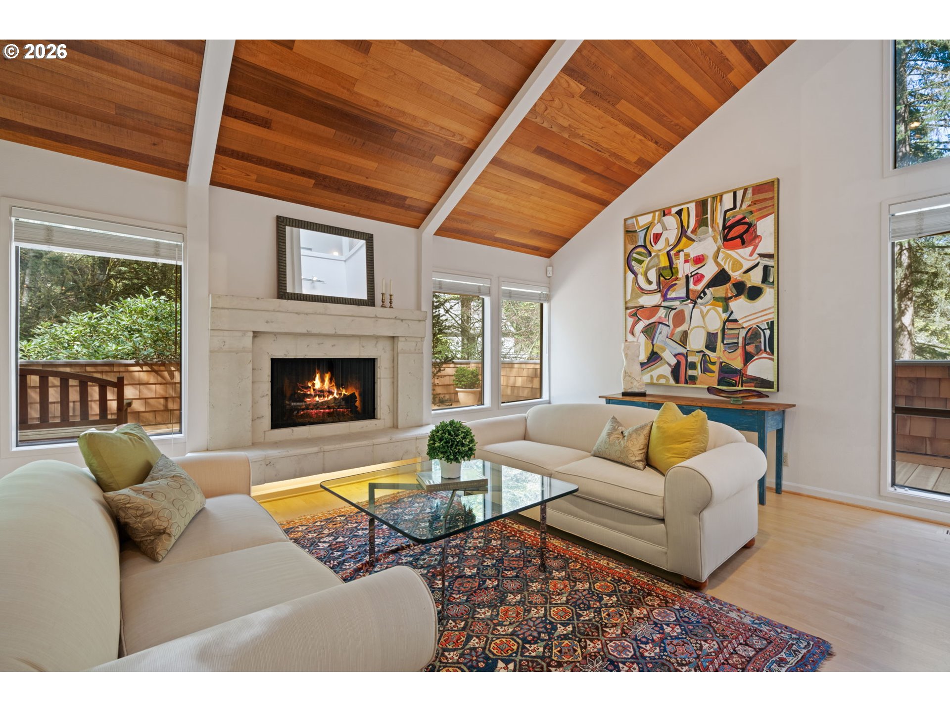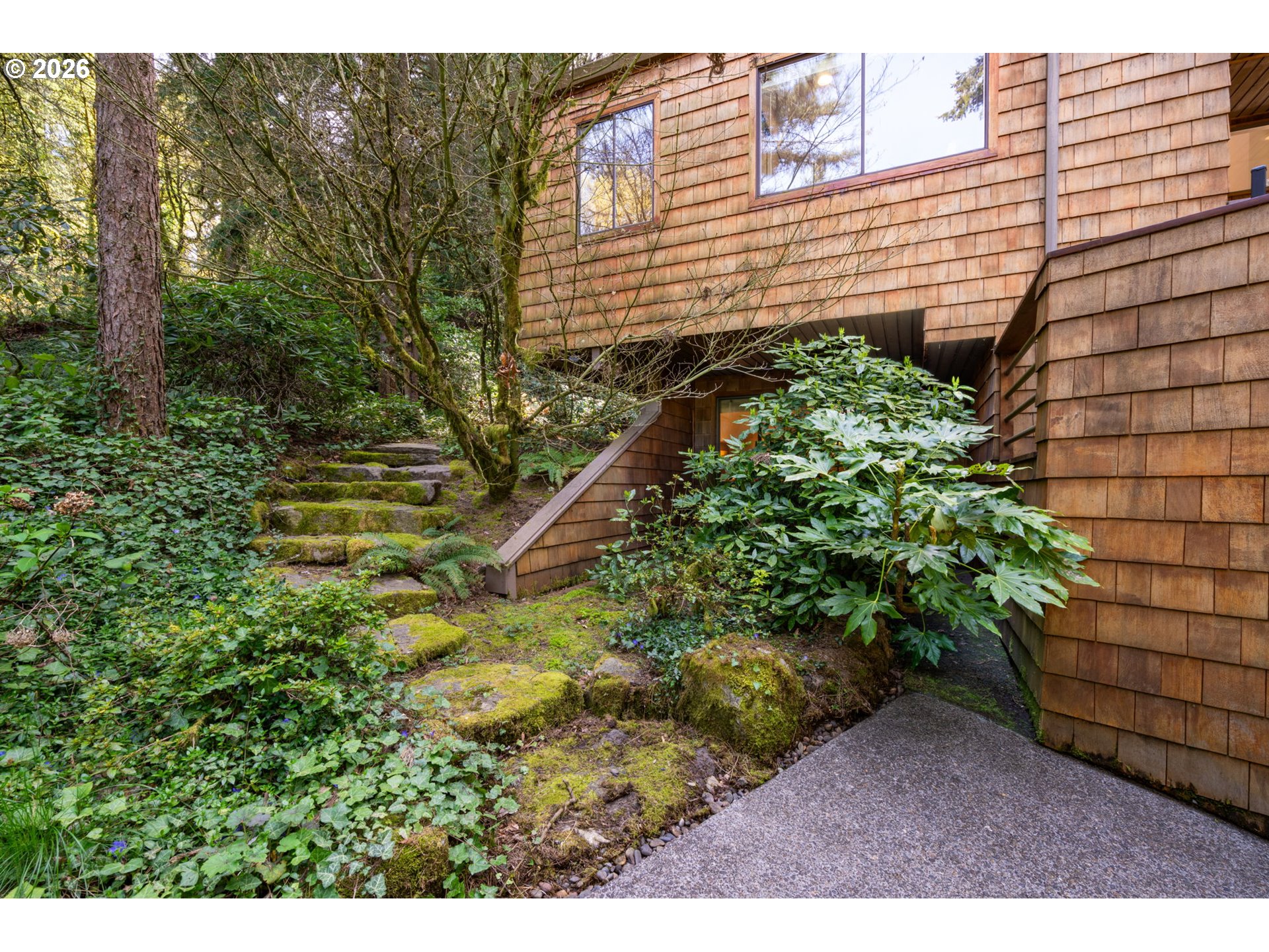 Towering PNW dream home surrounded by magical forest, stone pathways, and even a Japanese bridge. The contemporary design maximizes the location and views. Once inside, it feels like you’re floating above the trees with cedar vaulted ceilings and incredible windows overlooking greenery that creates a light-filled space. Wood-burning fireplaces in the living and family rooms. Sleek, enviable kitchen feels both modern and warm with rich wood cabinetry, island, and state-of-the-art appliances. Formal dining room connects the living spaces with more soaring ceilings. Three private bedrooms over three levels. The incredible primary suite has more vaulted ceilings, two walk-in closets, bathroom, and shares the upper level with an office featuring built-ins and views. There’s even a loft tucked away at the top of the house. Stargaze from the 1,000-square-foot deck! All this on a cul-de-sac near trails to Council Crest and OHSU. [Home Energy Score = 1. HES Report at https://rpt.greenbuildingregistry.com/hes/OR10246057]