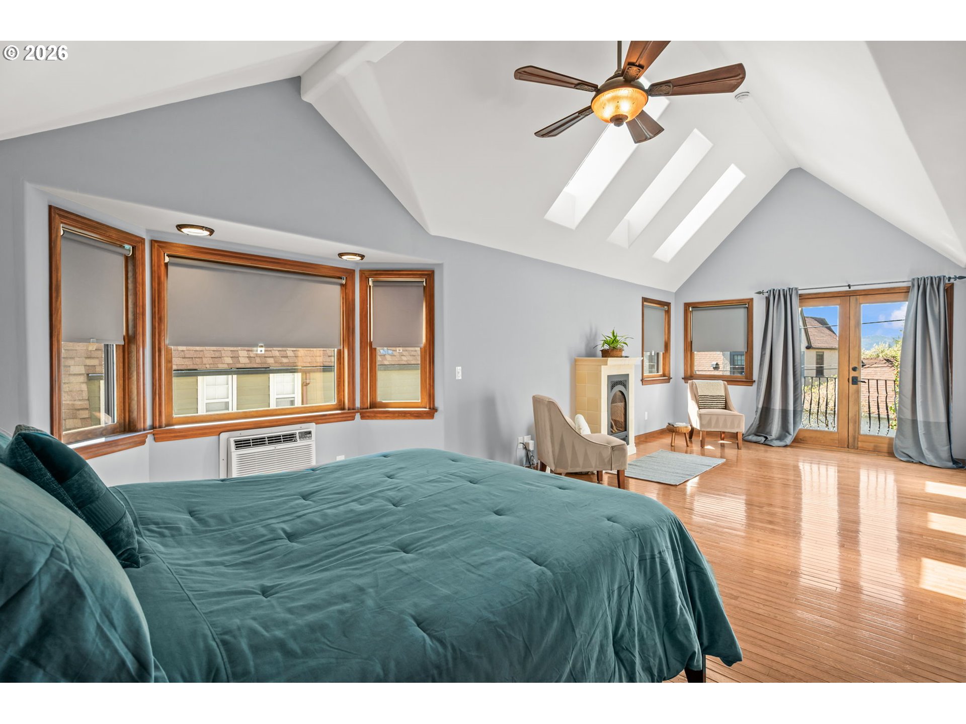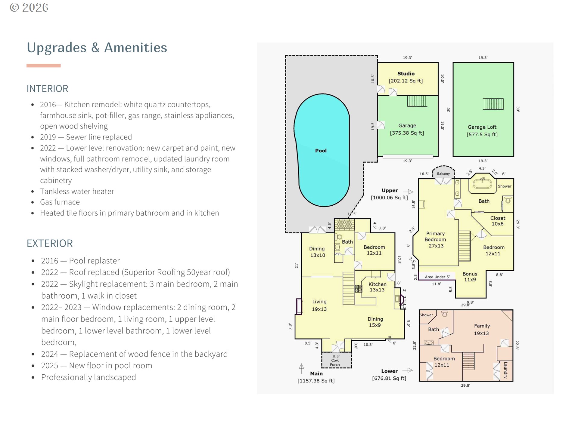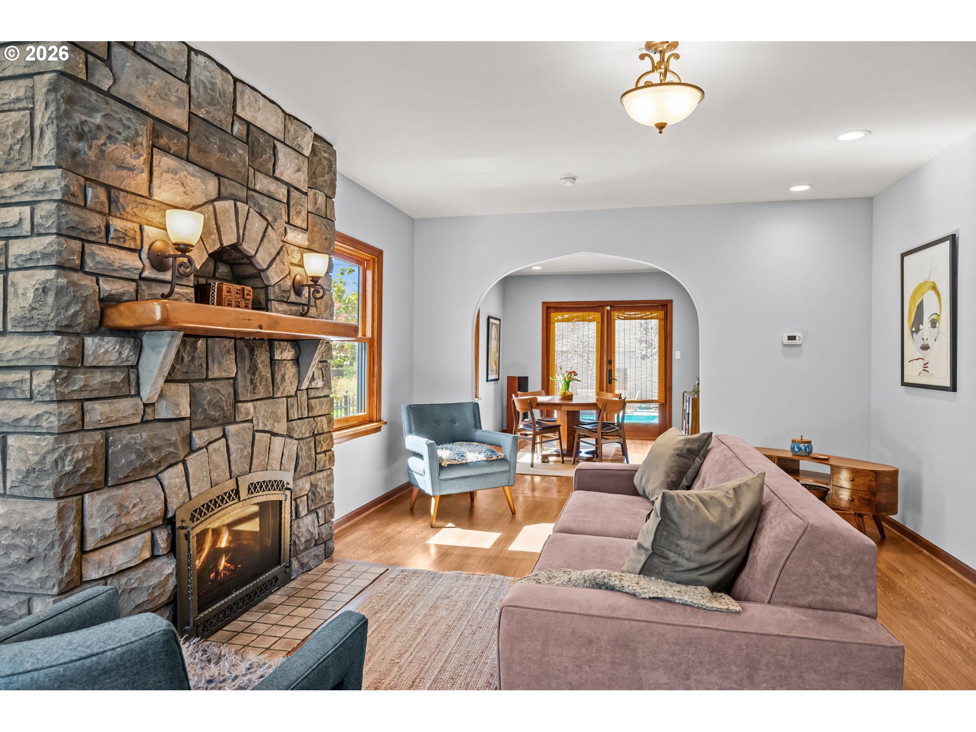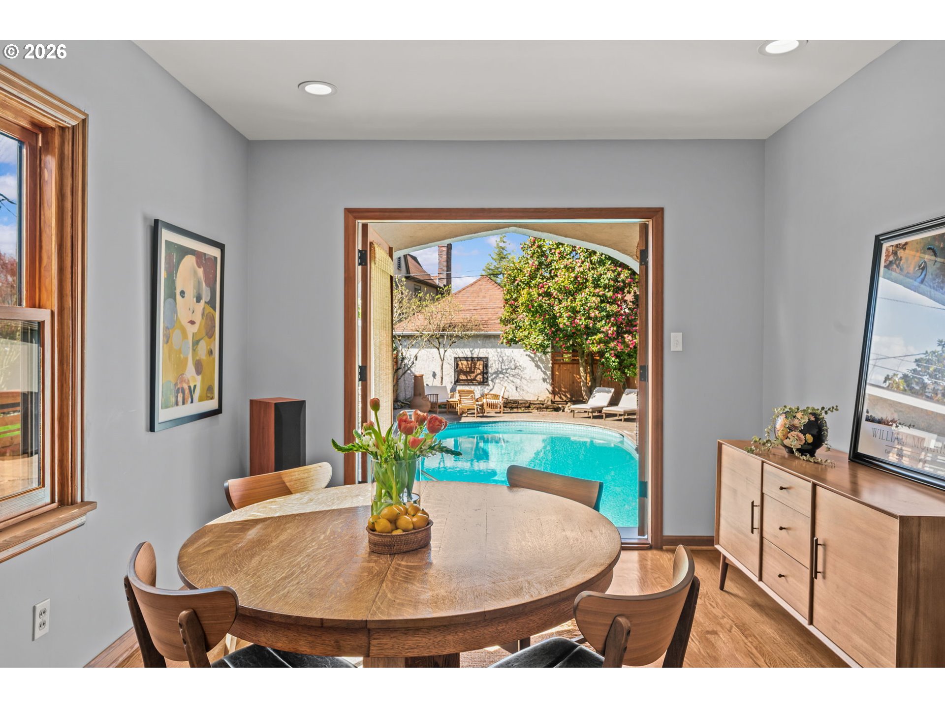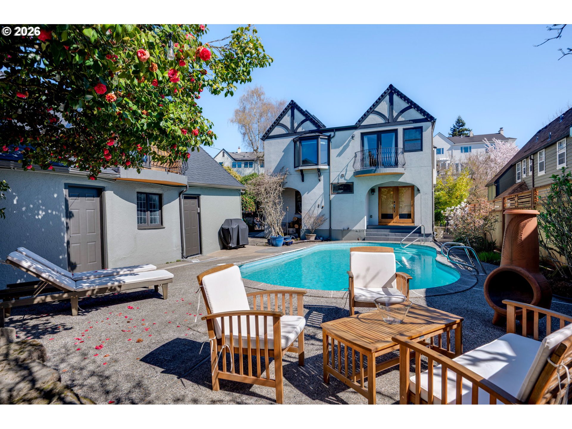 Built in 1932 on one of Alameda's most coveted streets, this classic Portland Tudor blends timeless character with thoughtful updates across three fully finished levels. With four bedrooms, a pool, and a rare two-story garage, it's a home that lives as beautifully as it looks. Original details — oak hardwood floors, arched doorways, leaded glass windows, and a striking stone fireplace — create a warm, inviting main level. The updated kitchen pairs white quartz countertops, a farmhouse sink, gas range, and open wood shelving with classic charm, while two dining areas offer flexibility for everyday living and effortless entertaining. A main level bedroom and full bath offer the kind of flexibility that lets you grow into this home for years to come. Open the French doors off the dining room and you're poolside. The backyard is private, sunny, and anchored by a gorgeous camellia in full bloom — the kind of outdoor space that makes Portland summers actually feel like summers. Upstairs, the primary suite is a true retreat with vaulted ceilings, skylights, a fireplace, and a balcony overlooking the pool. The ensuite bath features a walk-in shower, soaking tub, heated tile floors, and custom walk-in closet. The finished lower level adds versatility with a spacious bonus area, fourth bedroom or flex space, full bath, and dedicated laundry. The two-story garage rounds it all out — two-car parking, a pool room or studio on the main level, and above it a loft with old-growth timber framing, original plank floors, and arched leaded glass windows. Remarkable space with real ADU/studio potential. Located just blocks from Alameda Elementary, Beaumont Middle, and Grant High School, with easy access to neighborhood parks, cafes, and shops.