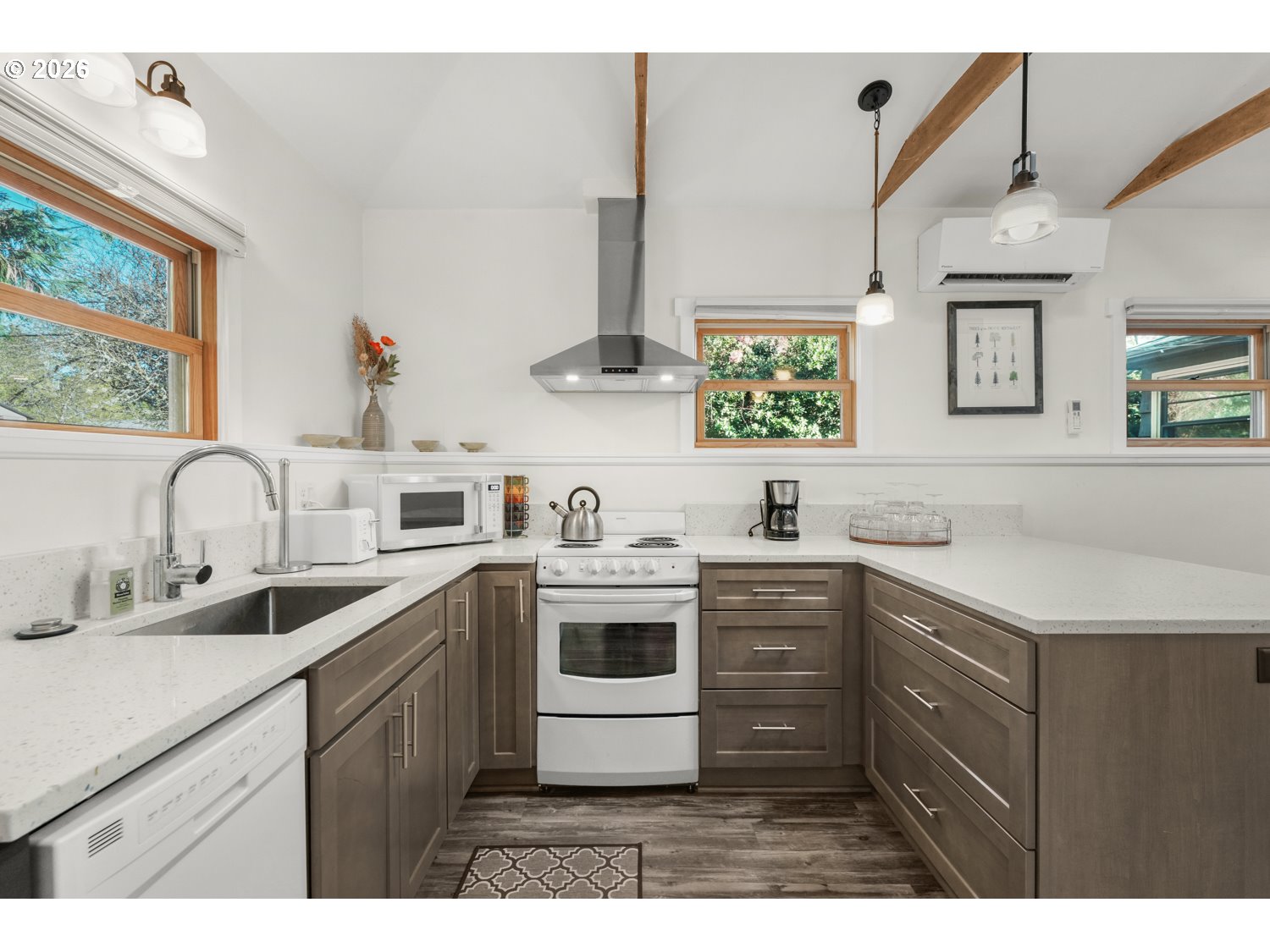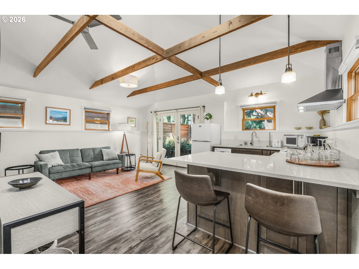 Fully updated and permitted ADU included with this home! Classic 1949 character blends seamlessly with modern upgrades in this well-maintained Concordia home. A standout feature is the custom Rain Garden installed by the “This Old House” team and showcased on the show. You’ll find thoughtful improvements throughout, including a newer roof and gutters, Marvin wood/fiberglass windows, Marmoleum kitchen flooring, and beautifully preserved hardwood floors. The bright and airy living room has a beautiful fireplace. The kitchen includes quartz countertops and a dining nook. Two bedrooms, full bathroom and laundry room complete main living space. The fully permitted ADU (built in 2016) is a bright, studio-style space with vaulted, beamed ceilings, laminate flooring, a private entrance, its own washer and dryer, and a brand-new heat pump. It has a strong track record as both a long-term rental and Airbnb, and comes fully furnished and ready to generate income from day one. Outside, the fully fenced yard feels like a private retreat. It’s an Audubon Gold Certified Native Habitat designed with permaculture principles, featuring raised garden beds, a fig tree, raspberries, sheds, and lush, intentional landscaping throughout. Located on Holman Street, a designated Greenway/Bike Corridor, this home enjoys minimal traffic (no through access on 33rd) and a peaceful neighborhood setting. You’re just a short distance to Alberta Street, New Seasons, Fernhill Park, Kennedy School, and a wide variety of local dining, shops, and parks. The University of Oregon campus is also nearby. Features include: • All appliances included (main home + ADU) • Two washers and two dryers • Tankless water heater • New AC in main home with new high efficiency furnace + new heat pump in ADU.