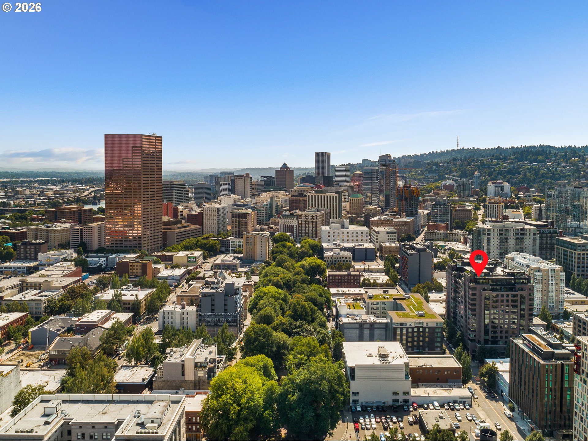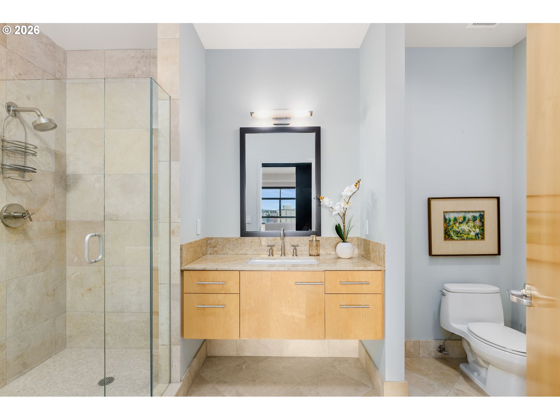 Embodying the very best of the “Pearl District lifestyle,” this high-end luxury penthouse in the coveted “Elizabeth Lofts” building checks every box. This sophisticated northeast corner unit offers 180-degree unobstructed views of three mountains, the Willamette River, and the West Hills. Floor-to-ceiling windows frame the ever-changing mood and hues of the city, while natural light abounds throughout. The sprawling 2,700-square-foot floor plan is designed for both grand-scale entertaining and intimate everyday living, with gleaming hardwood floors flowing seamlessly, complemented by soaring ceilings and designer lighting. Anchoring the main living areas, a double-sided gas fireplace serves as both a subtle architectural divider and a refined focal point. Lutron motorized shades and custom drapery are featured throughout. The gourmet kitchen showcases high-end finishes, a large island, and Sub-Zero appliances. The primary suite offers a serene sanctuary, complete with dual closets, a spa-caliber bathroom, and French doors opening to a 625-square-foot private outdoor terrace. The second bedroom was converted into a media room by a previous owner but can easily be restored to a second en-suite. Amenities include concierge service, a community room, and a large deeded storage closet adjacent to two deeded parking spaces. The Pearl District offers an exceptional lifestyle with boutique shopping, acclaimed restaurants, and vibrant cultural attractions.