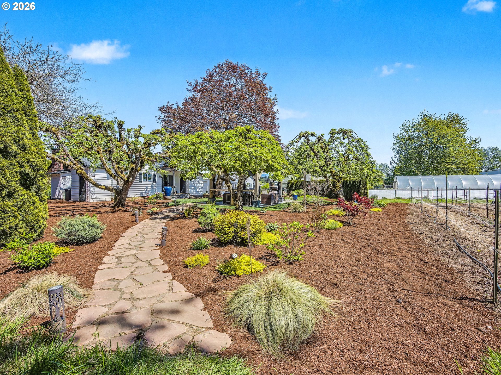 A rare opportunity to live immersed in beauty, abundance, and thoughtful design. This beautifully remodeled home blends modern comfort with timeless craftsmanship—featuring a new roof, vinyl windows, PEX plumbing, certified wood stove with new chimney, and stunning custom cabinetry with soft-close doors and dovetail joints. Save hundreds of dollars a year with the paid off solar panels. The kitchen is both functional and striking with granite counters featuring garnet accents, stainless steel appliances, double oven, built-in microwave with retractable hood, and a bespoke spice and grain wall design. The remodeled bath offers dual sinks with pull-down faucets, a walk-in shower, dual-flush toilet, and subtle automatic floor lighting. Central heat and A/C provide year-round comfort, with abundant storage including an outside pantry. Step outside and experience something truly special. Designed with intention, the grounds offer extensive artistic landscaping with native plants, heirloom peonies, herb and medicinal gardens, and expansive vegetable beds already producing. Enjoy a remarkable collection of fruit and specialty plants including Rainier cherries, espaliered fruit trees, kiwis, apples, currants, plums, elderberry, raspberries, blueberries, strawberries, rhubarb, black walnut, mature asparagus, garlic, lavender, and more—including wine grapes. A traditional greenhouse and large high tunnel support year-round growing.Additional features include a triple garage/shop with three bay doors and automatic openers (new roof and doors), separate guest quarters, fenced and cross-fenced pasture, irrigation system, multiple outdoor spigots, tool shed, paved driveway, gated entry, and privacy hedge and plenty of outdoor storage. The covered front and back porches provide practical year-round protection from the elements, while the gazebo becomes the perfect place to relax and take in the peaceful setting. A place to grow, gather, and truly live.