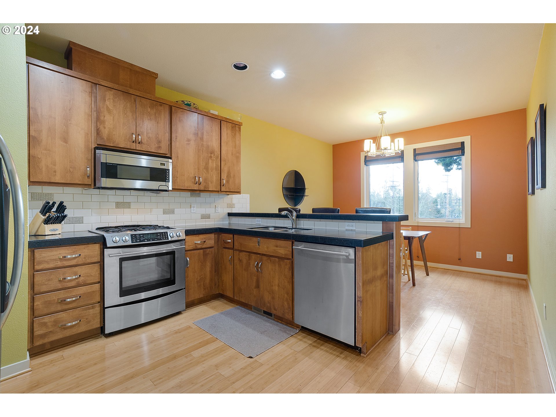 Modern Townhome in the Heart of Multnomah Village! Unbelievable access to Grand Central Bakery, John's Market, the food carts; the list goes on and on! Open main level features bamboo floors throughout. In the kitchen you will find SS appliances, an eating bar, & granite counters. Top level features primary suite w/walk-in closet, 2nd bedroom plus guest bathroom, & convenient laundry area. Lower level features great flex space with an office w/direct exterior entry or possible 3rd bedroom along with garage parking. In addition to being within steps of Multnomah Village shopping & dining, this location also provides convenient access to I-5, Gabriel Park, SW Community Center, & OHSU. Extremely low HOA dues. Come check out this rare opportunity today!
