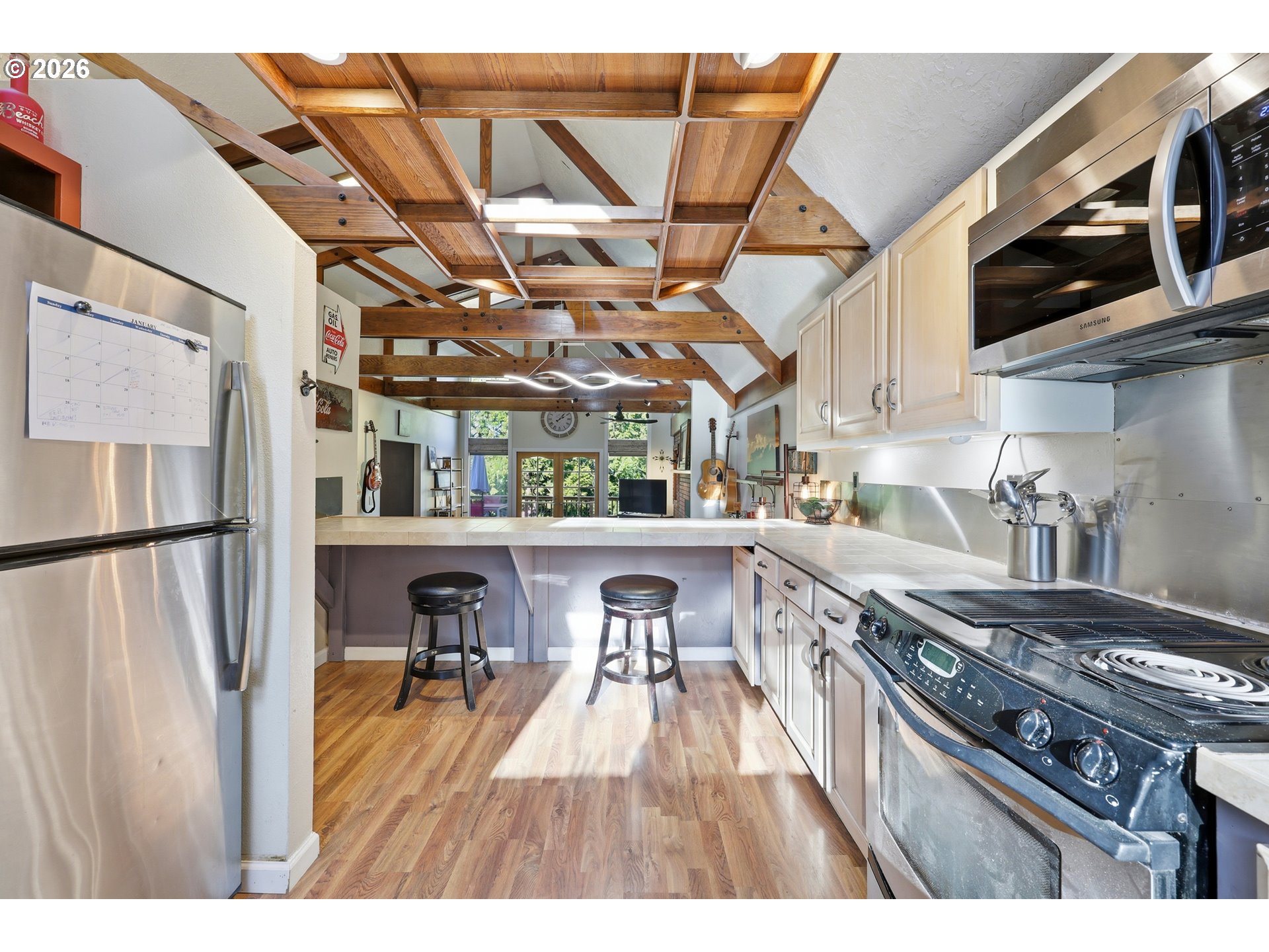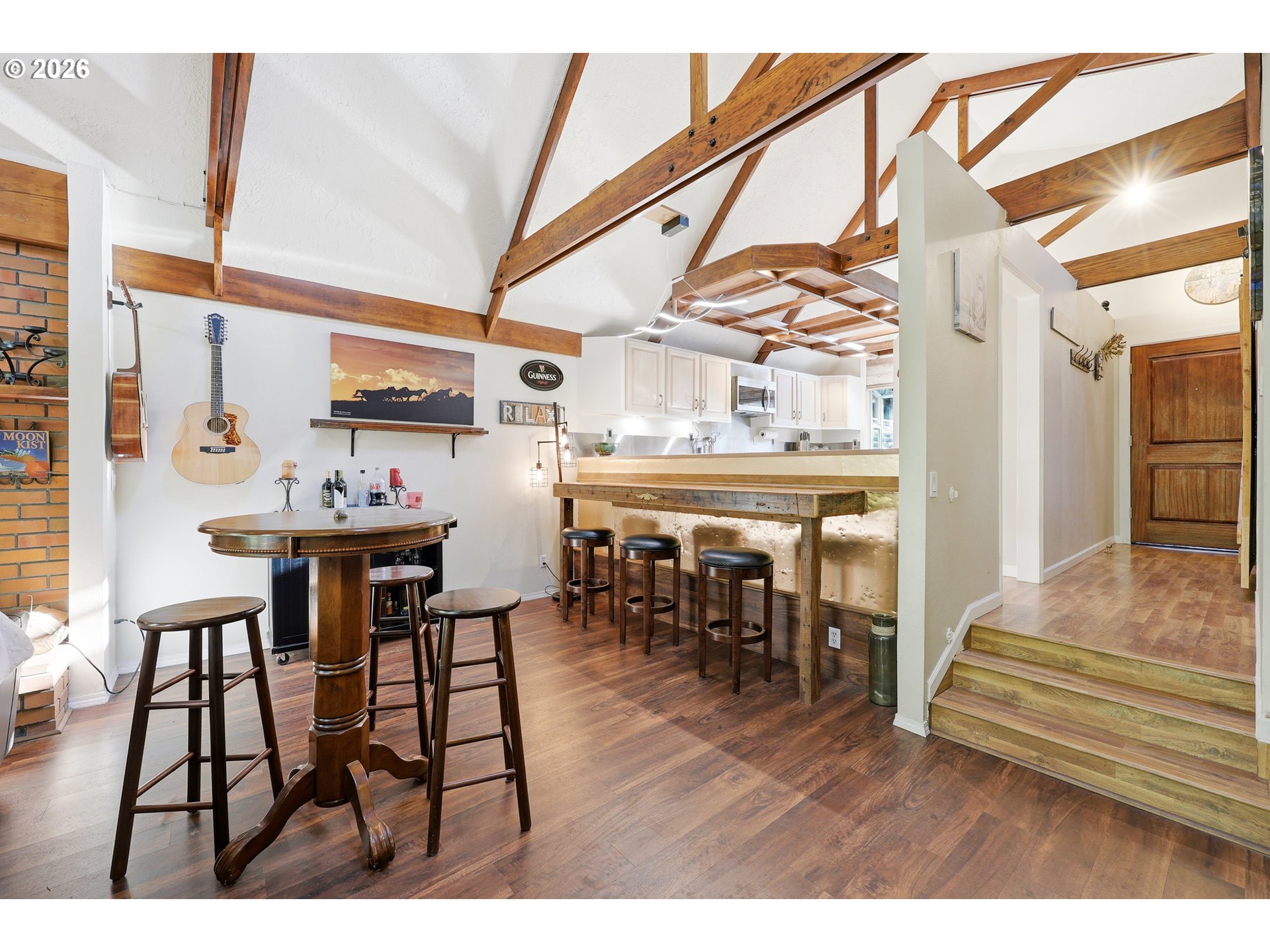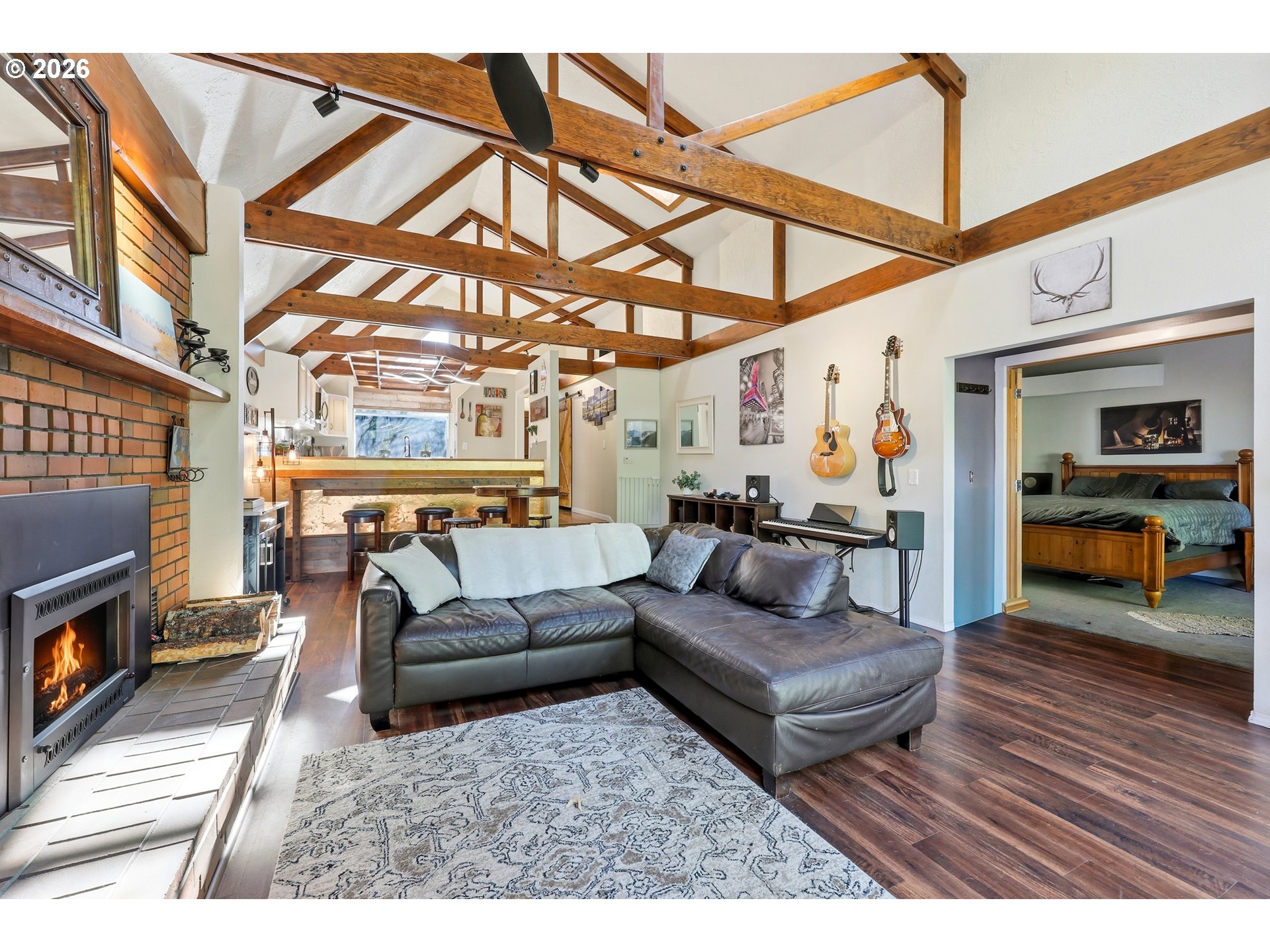 OPEN HOUSE: Saturday, January 24, 12 PM - 2 PM. This 1,694 square-foot one-level home offers a distinct Pacific Northwest lodge aesthetic featuring three bedrooms and two bathrooms within an open-concept layout.The central GREAT ROOM is breathtaking, serving as the core of the home, characterized by 17-foot vaulted cathedral ceilings and 10-inch timber cross beams. This space integrates the living and dining areas with the kitchen, creating an open environment for daily activities. Natural light emanates from a series of skylights throughout the home. The updated KITCHEN is equipped with new tile countertops and a custom stainless-steel backsplash, complemented by a custom-built bar featuring an elegant copper inlay. The versatile FLOOR PLAN includes a standout second bedroom with its own private exterior entrance and French doors leading to the private front courtyard—an ideal setup for a home office, guest suite, or multi-generational living. The home includes a third bedroom, an updated second bathroom, and a laundry/utility room. OUTSIDE: A large rear deck that spans the back of the house opening via French-doors from the living room and primary suite. The spacious back deck features a new cedar top line and has been recently resealed for durability. Follow the terraced landscaping to a secluded, wooded greenspace, all within the privacy of a fully fenced yard with natural rock accents.UPDATES: Additional interior craftsmanship includes a Sapele hardwood front door and custom reclaimed wood sliding barn door closets. New flooring and plush carpeting have been installed throughout the primary living areas and bedrooms. The roof is only 2 years old. LOCATION: Positioned within easy access to Gresham city parks and local amenities, this property provides easy access to outdoor recreation and shopping. The combination of structural timber details, custom metalwork, and significant recent updates offers a functional and stylistically consistent living space.