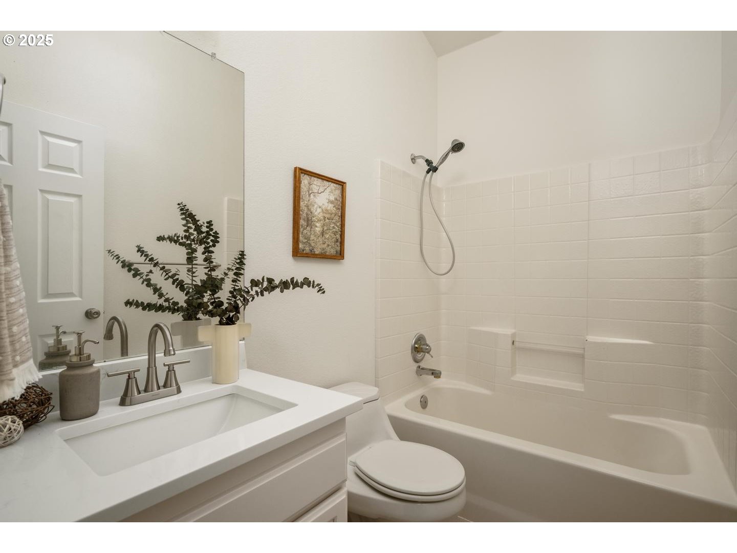 Stylish one-level living in sought-after Blue Heron Shores, just moments from Fairview Lake and Blue Lake. Bright, open layout with vaulted ceilings throughout. The living room features a large bay window and opens to the formal dining room for easy entertaining. A French-door office offers flexible space. The oversized kitchen shines with stainless steel appliances and new quartz counters, flowing into a dramatic 14-ft living area with gas fireplace, built-ins, and a slider to the covered deck. Primary suite includes dual sinks, multiple closets, tile finishes, and private deck access. All three full baths feature new quartz countertops. Home also includes new carpet, fresh interior/exterior paint, a 2024 roof, and a laundry room with storage and sink. Private backyard with large covered deck backs to a treed area—updated, inviting, and ready to enjoy.