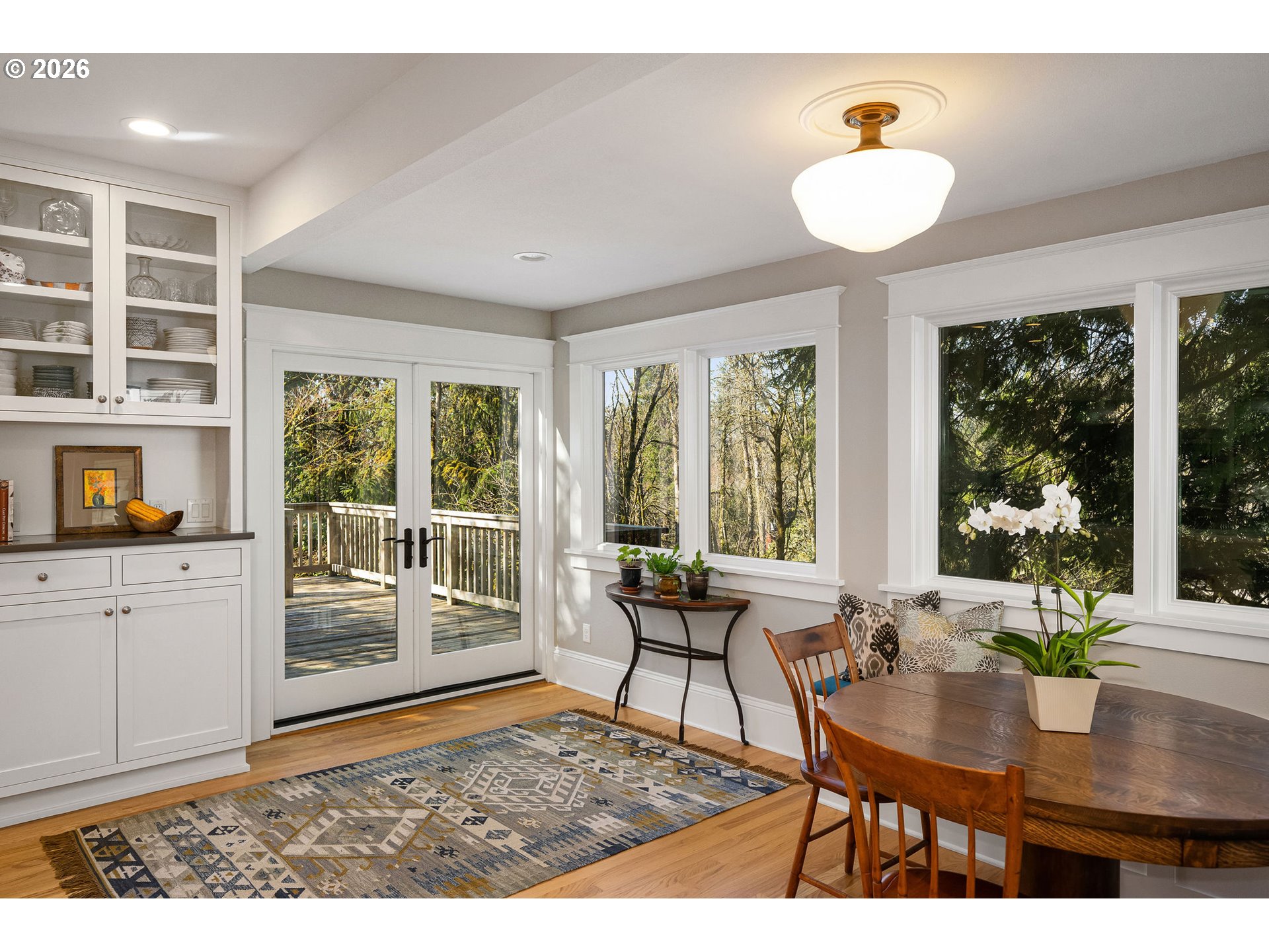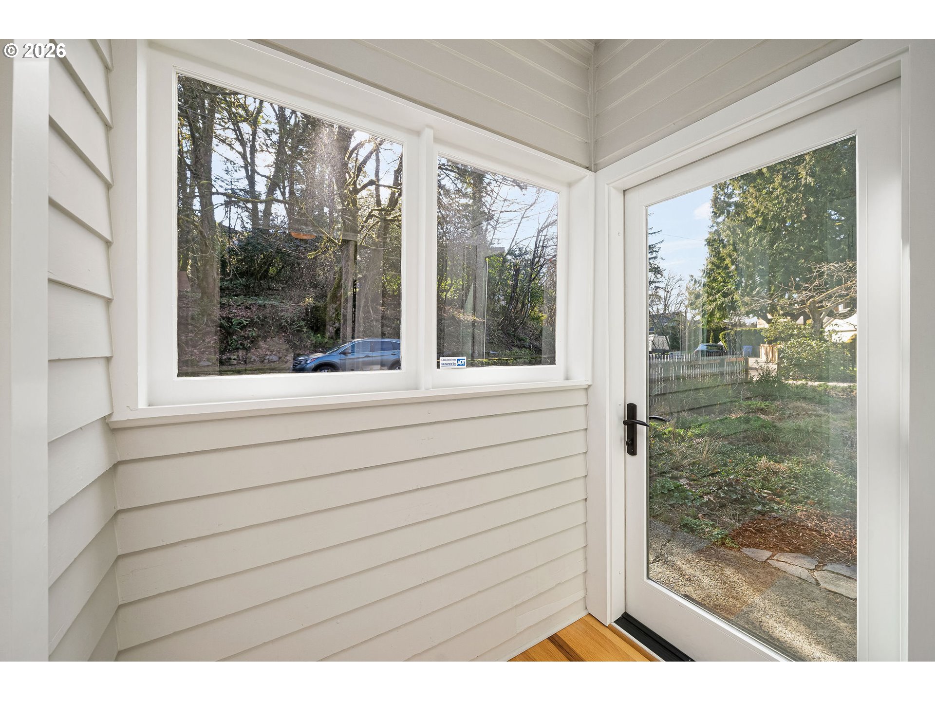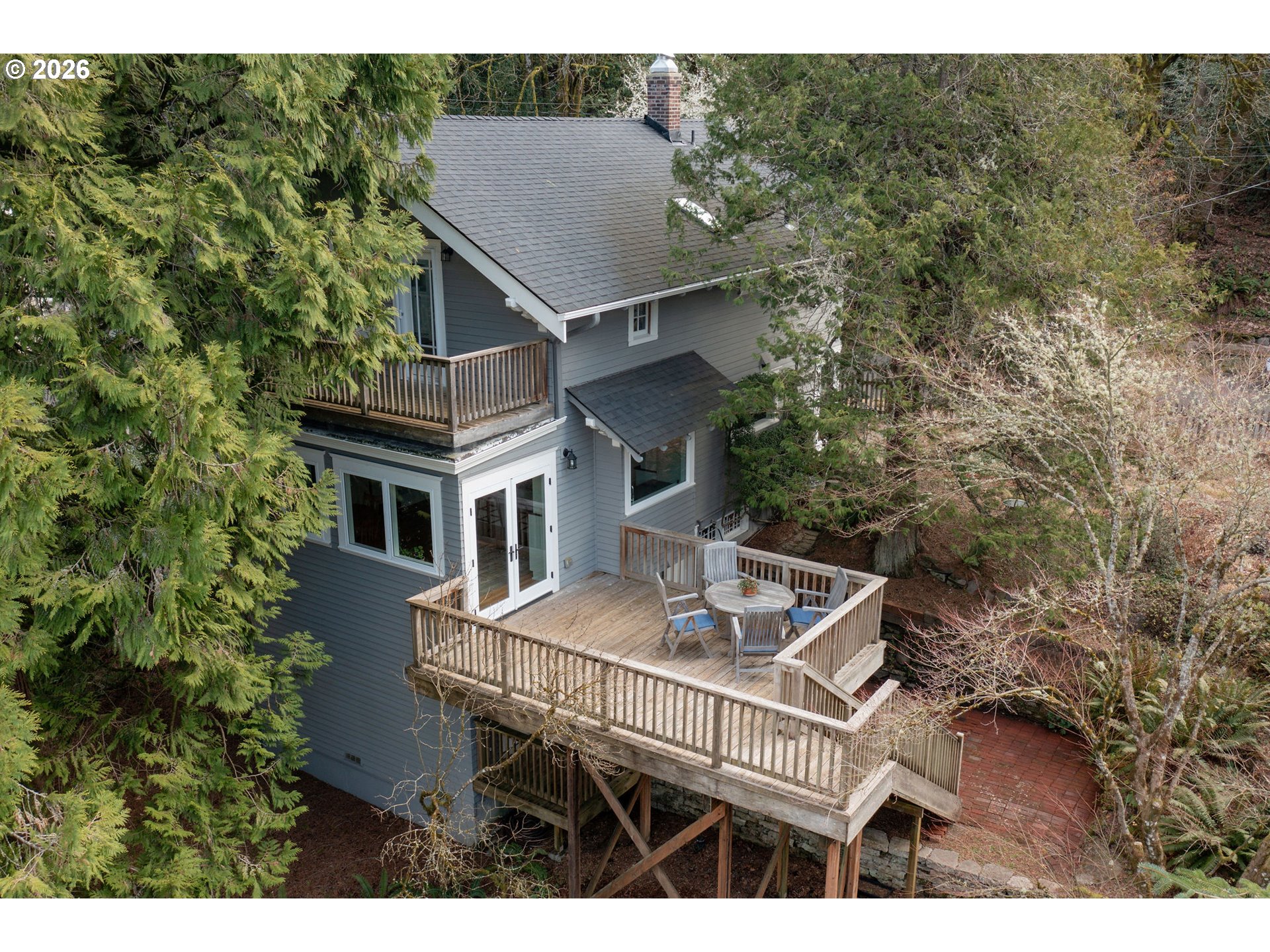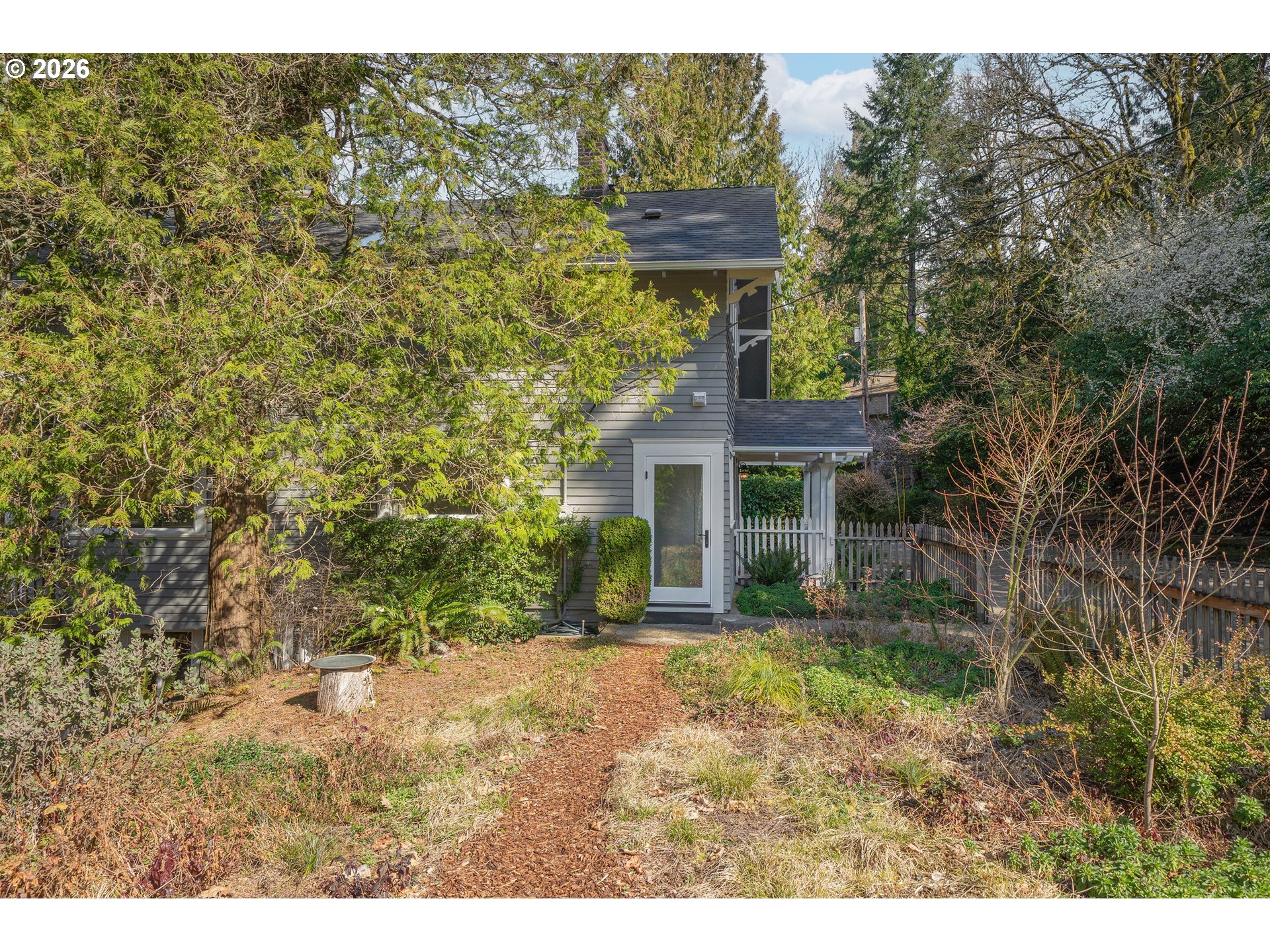 Ideally located in a tranquil neighborhood near scenic parks and trails, this charming home has been thoughtfully renovated to maintain its original character while offering modern updates! Enjoy classic details such as period molding, a cozy wood-burning fireplace, hardwood floors, and abundant large windows. A large, flat side yard provides room to garden. One of the three skylights illuminates the beautifully crafted staircase. A dedicated den/office on the main level, plus a convenient mudroom and laundry area with a 2nd sink and exterior access, offers flexibility. The open kitchen and dining room are the perfect spot to share meals, read a book, or catch up with friends while enjoying the sunny, green view of the surrounding trees—perfectly framed by large southwest-facing windows and French doors. Features include a spacious cooktop island with seating, quartz and marble countertops, stainless steel JennAir and Sub-Zero appliances, tons of storage including a generous pantry, and a large deck. All three bedrooms are upstairs, including a spacious primary suite with dual closets, a private deck, double vanity, and a large, luxurious shower with a skylight. The daylight basement has a cozy bonus room with big windows, built-in cabinets, an exterior entrance, a patio, and a huge unfinished storage area. An additional storage room, perfect for garden tools, is accessed from the patio. Extensive updates completed in 2015 include a new kitchen and bathrooms, detached garage, 95% efficient gas furnace, water heater, roof, multiple decks, and updated electrical and plumbing. 2025 updates include new central A/C and a new cooktop downdraft. The decks, front porch, and patio overlook a lovingly nurtured, water-wise, Backyard Habitat platinum-certified native plant garden. All of this is just minutes from parks and trails, OHSU, downtown, the shops and eateries of Hillsdale and NW 23rd, Nike, and Intel. [Home Energy Score = 2. HES Report at https://rpt.greenbuildingregistry.com/hes/OR10241723]