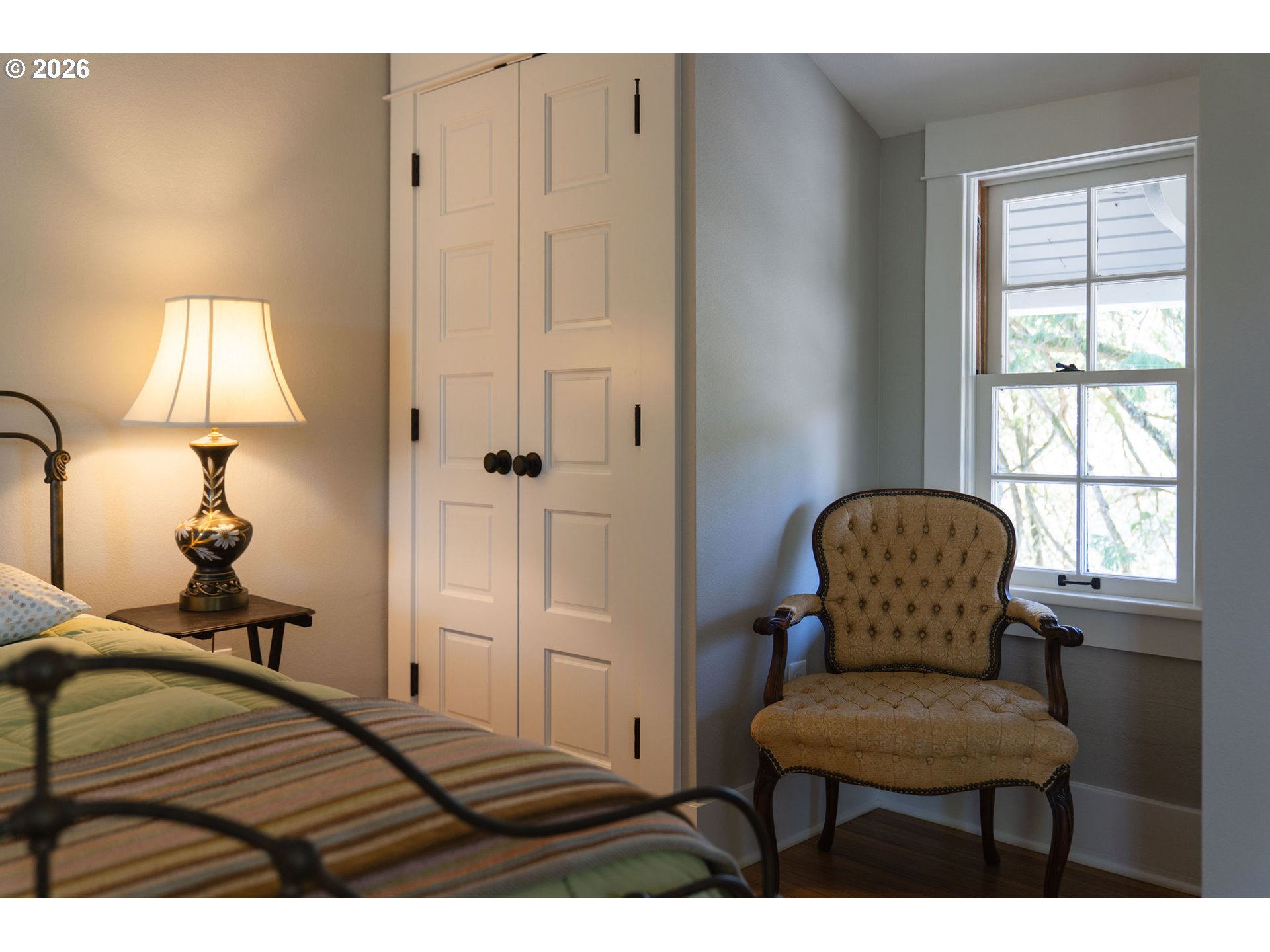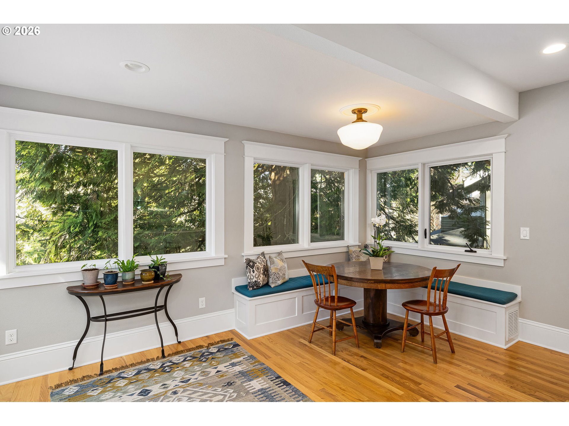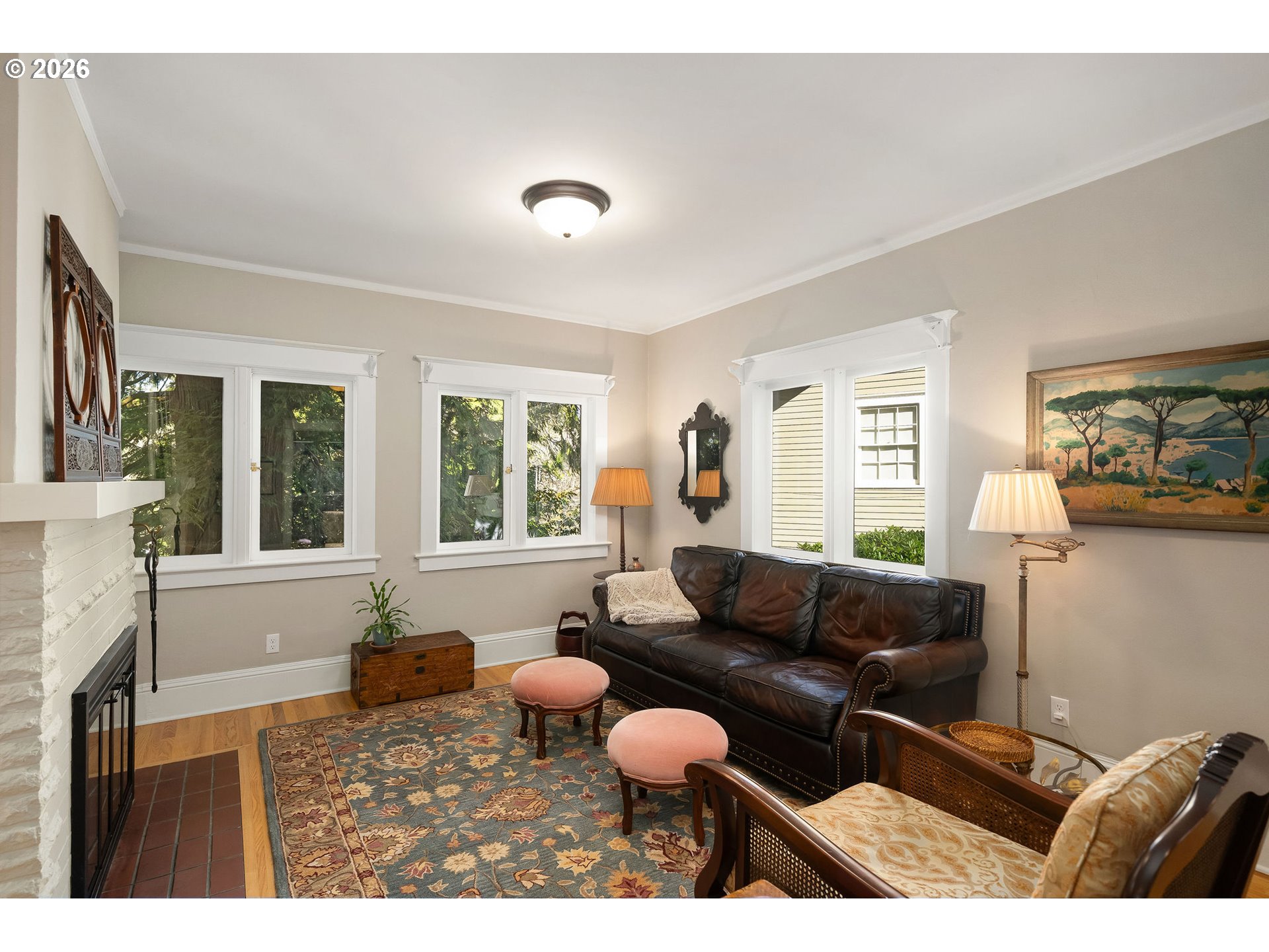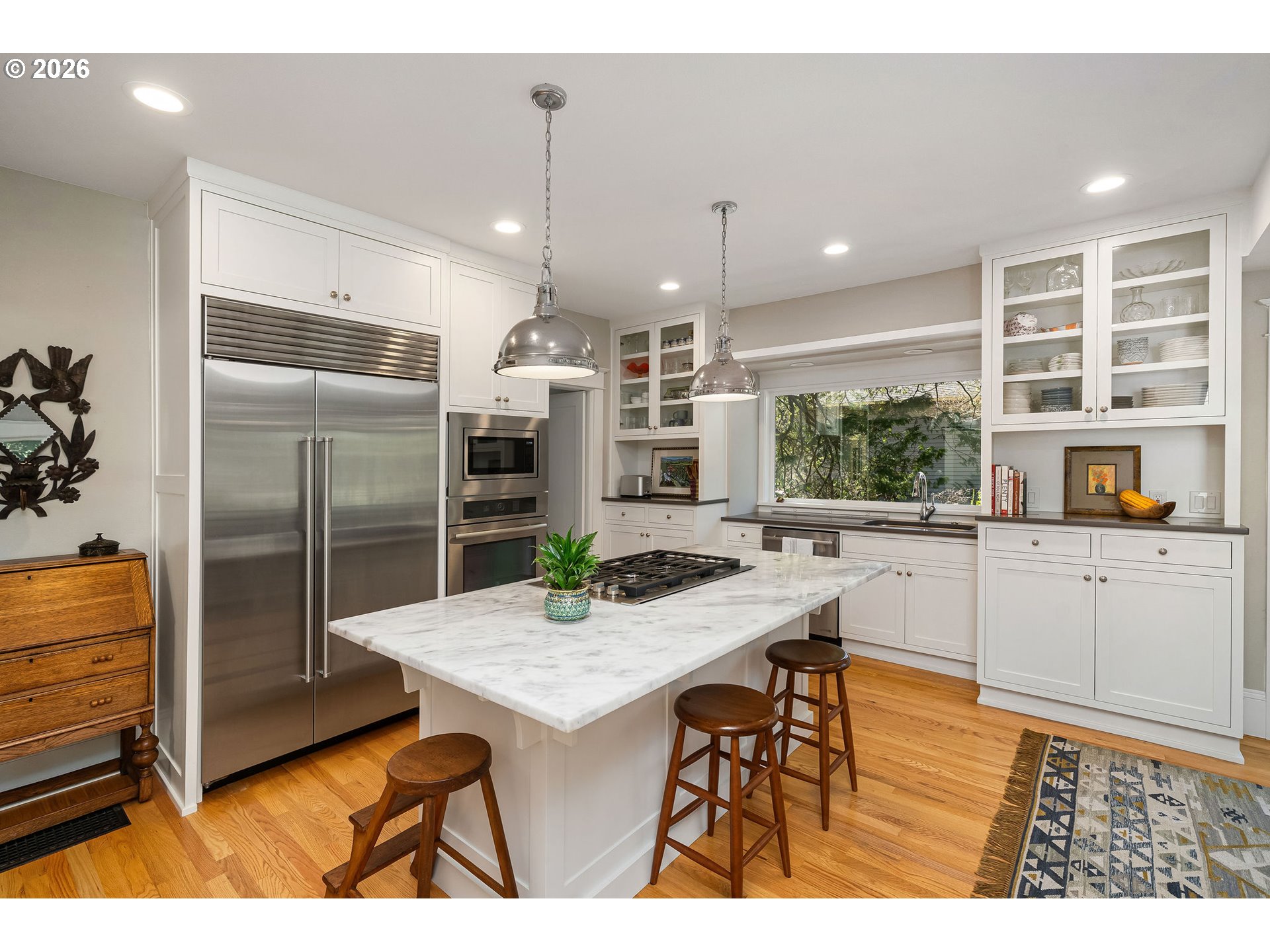 Ideally located in a tranquil neighborhood near scenic parks and trails, this charming home has been thoughtfully renovated to maintain its original character while offering modern updates! Enjoy classic details such as period molding, a cozy wood-burning fireplace, hardwood floors, and abundant large windows. A large, flat side yard provides room to garden. One of the three skylights illuminates the beautifully crafted staircase. A dedicated den/office on the main level, plus a convenient mudroom and laundry area with a 2nd sink and exterior access, offers flexibility. The open kitchen and dining room are the perfect spot to share meals, read a book, or catch up with friends while enjoying the sunny, green view of the surrounding trees—perfectly framed by large southwest-facing windows and French doors. Features include a spacious cooktop island with seating, quartz and marble countertops, stainless steel JennAir and Sub-Zero appliances, tons of storage including a generous pantry, and a large deck. All three bedrooms are upstairs, including a spacious primary suite with dual closets, a private deck, double vanity, and a large, luxurious shower with a skylight. The daylight basement has a cozy bonus room with big windows, built-in cabinets, an exterior entrance, a patio, and a huge unfinished storage area. An additional storage room, perfect for garden tools, is accessed from the patio. Extensive updates completed in 2015 include a new kitchen and bathrooms, detached garage, 95% efficient gas furnace, water heater, roof, multiple decks, and updated electrical and plumbing. 2025 updates include new central A/C and a new cooktop downdraft. The decks, front porch, and patio overlook a lovingly nurtured, water-wise, Backyard Habitat platinum-certified native plant garden. All of this is just minutes from parks and trails, OHSU, downtown, the shops and eateries of Hillsdale and NW 23rd, Nike, and Intel. [Home Energy Score = 2. HES Report at https://rpt.greenbuildingregistry.com/hes/OR10241723]