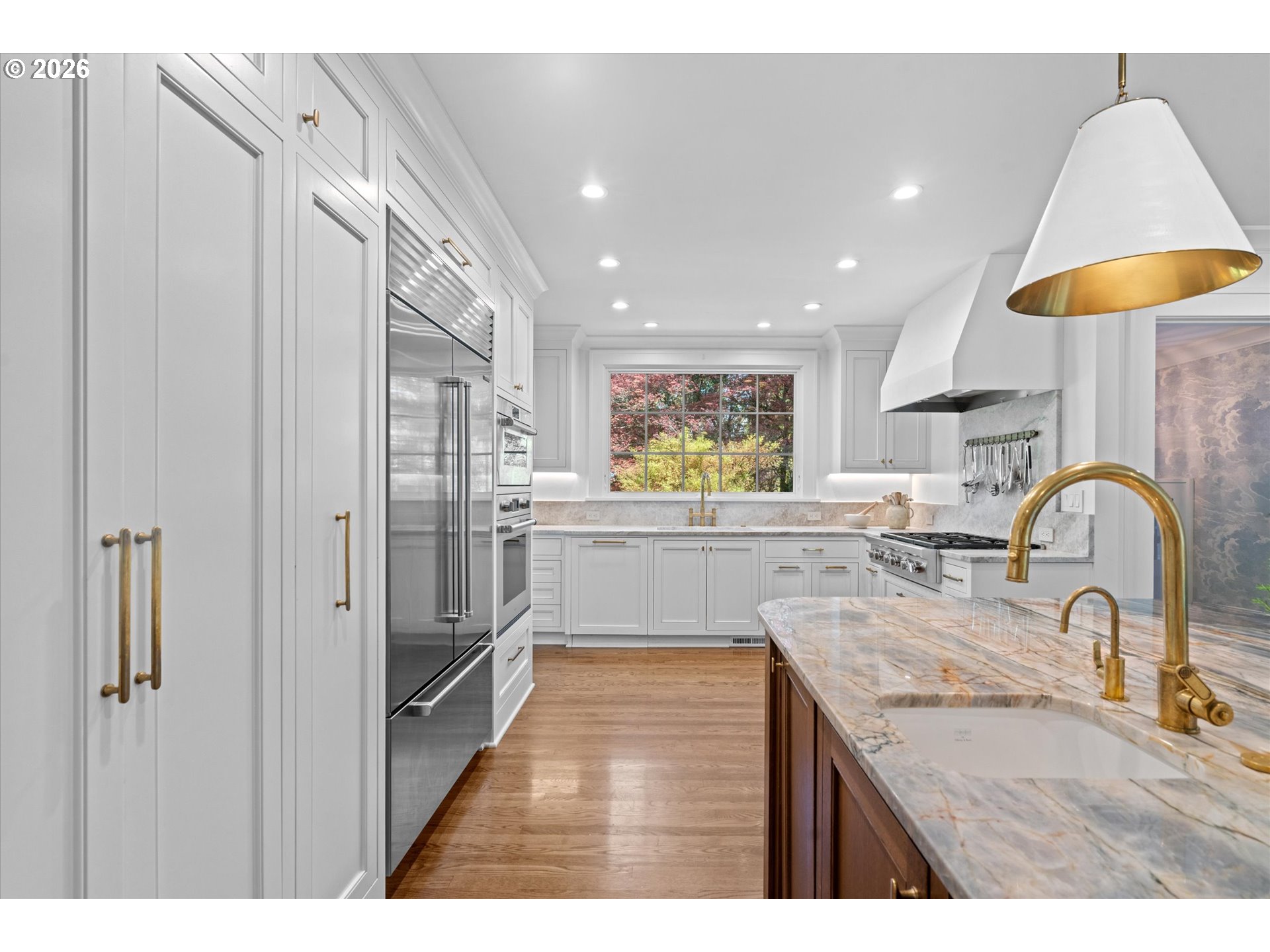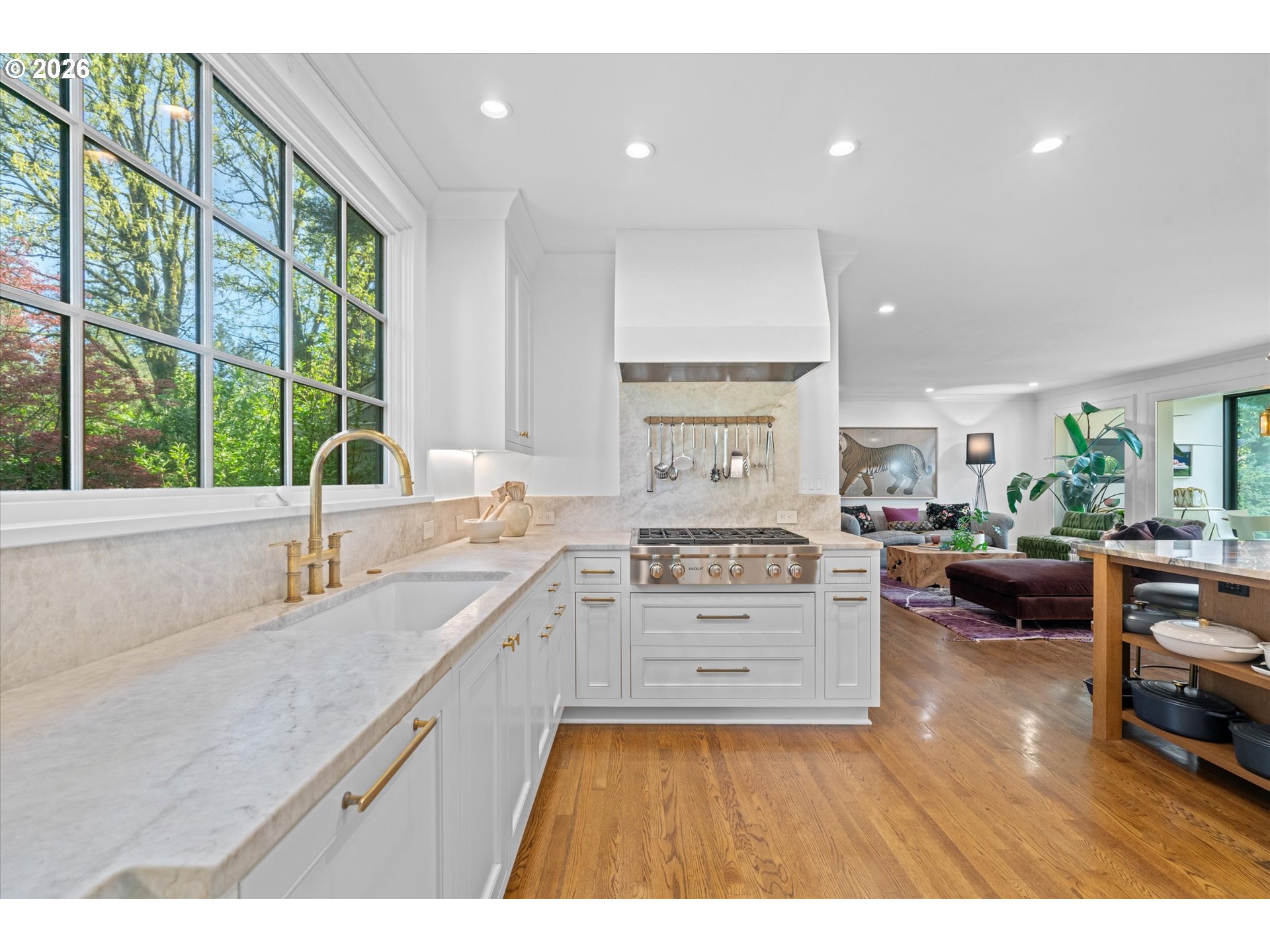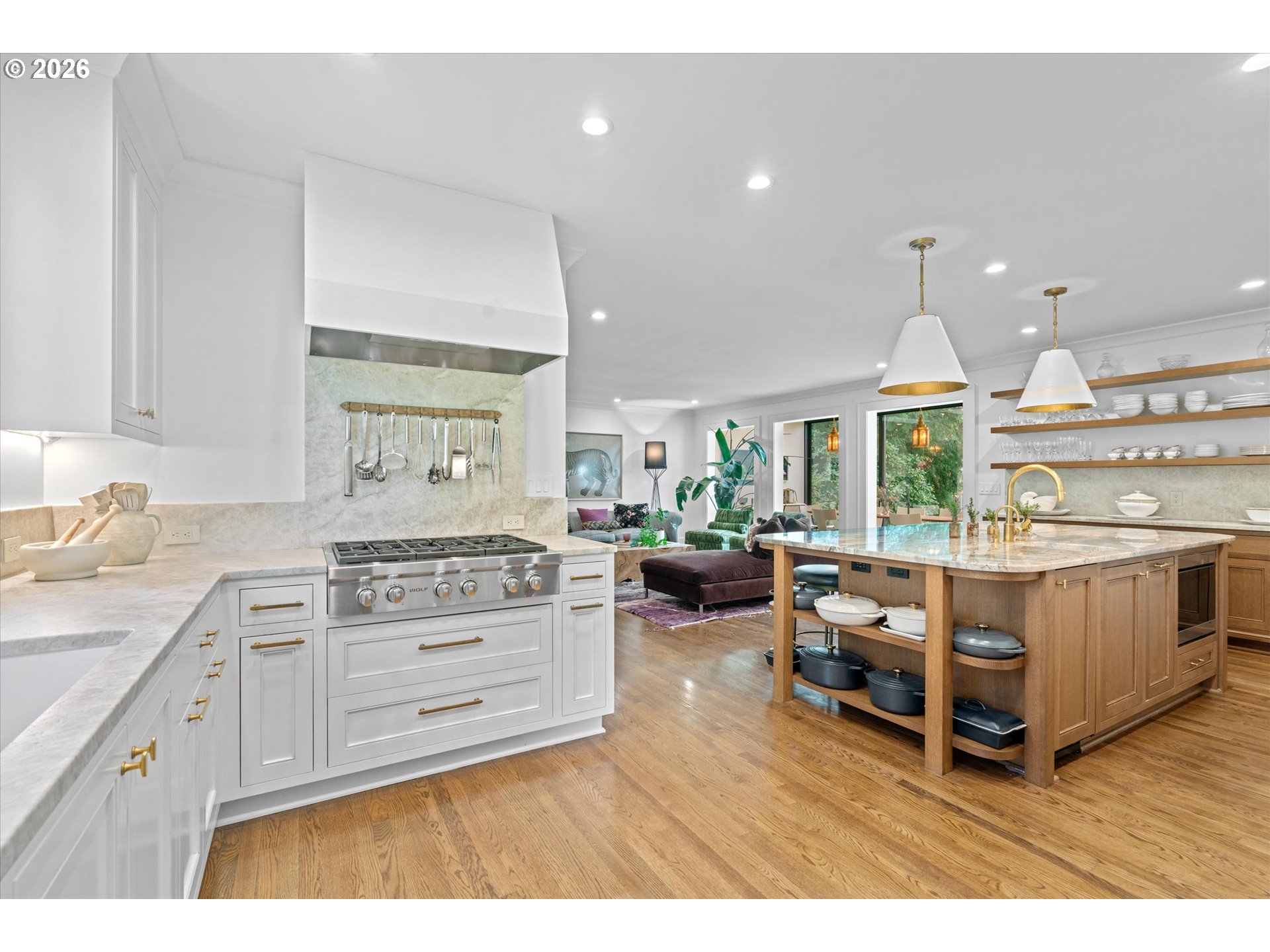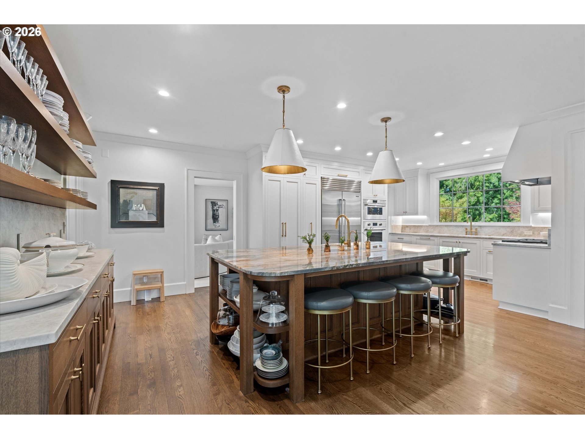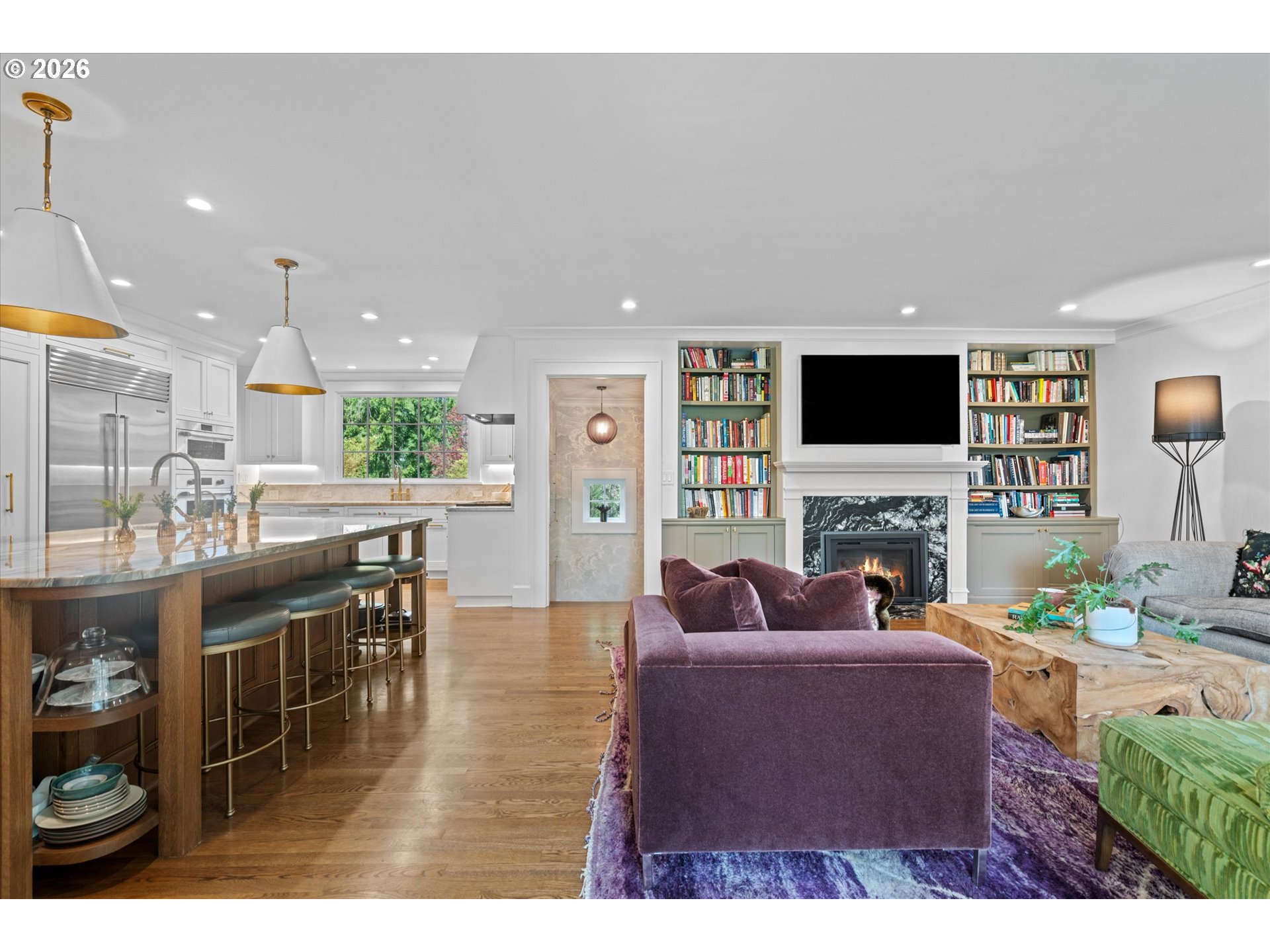 A design forward estate in Portland defined by proportion, scale, and natural light, reimagined by renowned design firm Maison to enhance flow and livability. Interiors are layered with character, thoughtful materials, and a sense of ease that’s difficult to replicate, with a considered sensibility that feels sophisticated and livable, balancing warmth with a refined and cohesive design. Collected and considered, inviting from the moment you enter. At the heart of the home, the kitchen is defined by presence and material contrast, anchored by a Michelangelo quartzite island, with Perla Venata surfaces layered throughout. Sub Zero, Wolf, and Miele appliances integrate seamlessly into custom cabinetry, complemented by brass fixtures opening to surrounding living areas, designed for both daily living and effortless entertaining. Living spaces unfold with intention, offering a balance of openness, scale, and definition, with distinct areas for both gathering and retreat. A formal living room, family room, and built in bar create distinct yet connected moments, with four fireplaces adding warmth and architectural presence. The sunroom, framed by skylights and a full height sliding glass wall, becomes a defining space within the home, where natural light pours in and the landscape feels integrated into daily life. Four bedrooms plus a guest quarters include a spacious primary suite with fireplace, a dedicated dressing room and custom built ins, offering a refined and private retreat. The grounds are defined by mature, vibrant landscaping and a sense of privacy, offering distinct areas for gathering, entertaining, and everyday use. The backyard features an in ground pool behind mature hedging, a pool house, and a circular driveway reinforcing arrival and scale. Designed for those who refuse to compromise. A rare opportunity to own a home of this scale, finish, and presence on one of Portland’s most coveted streets.