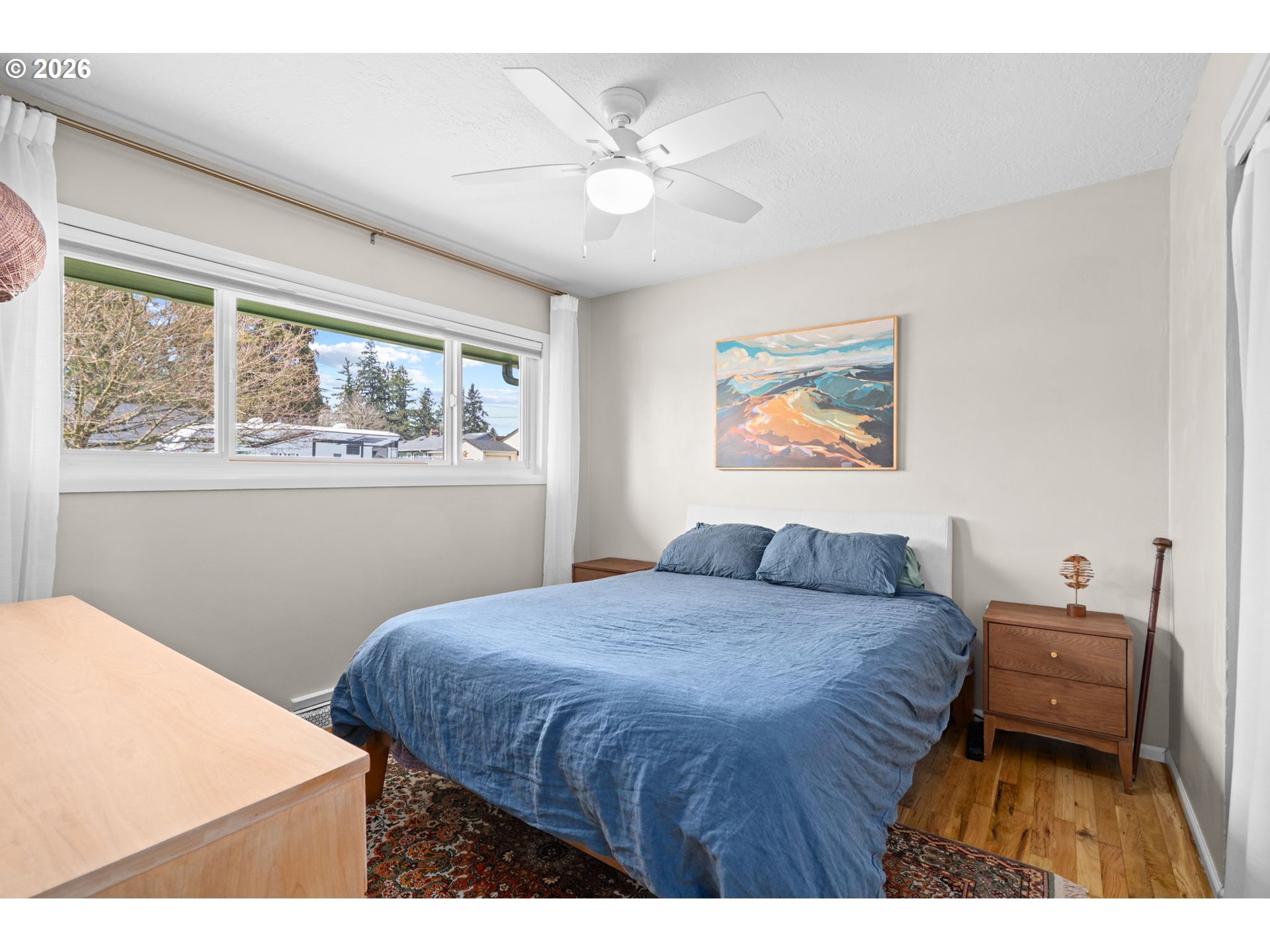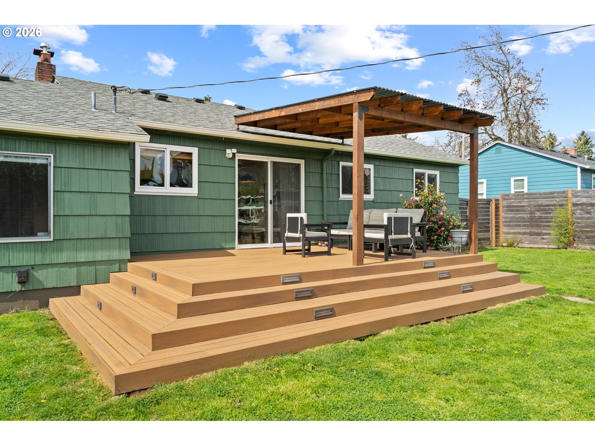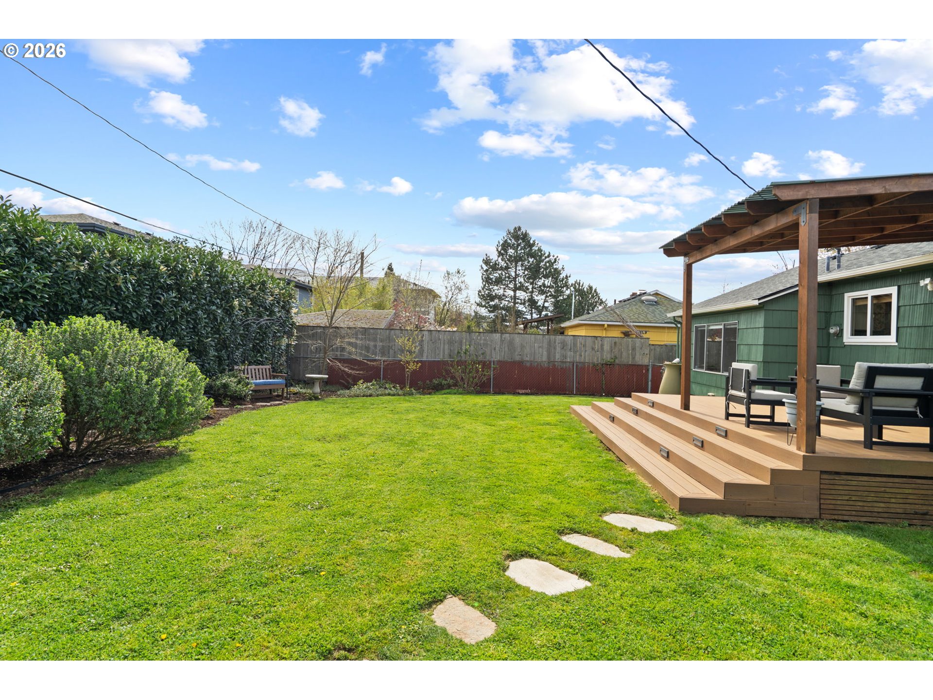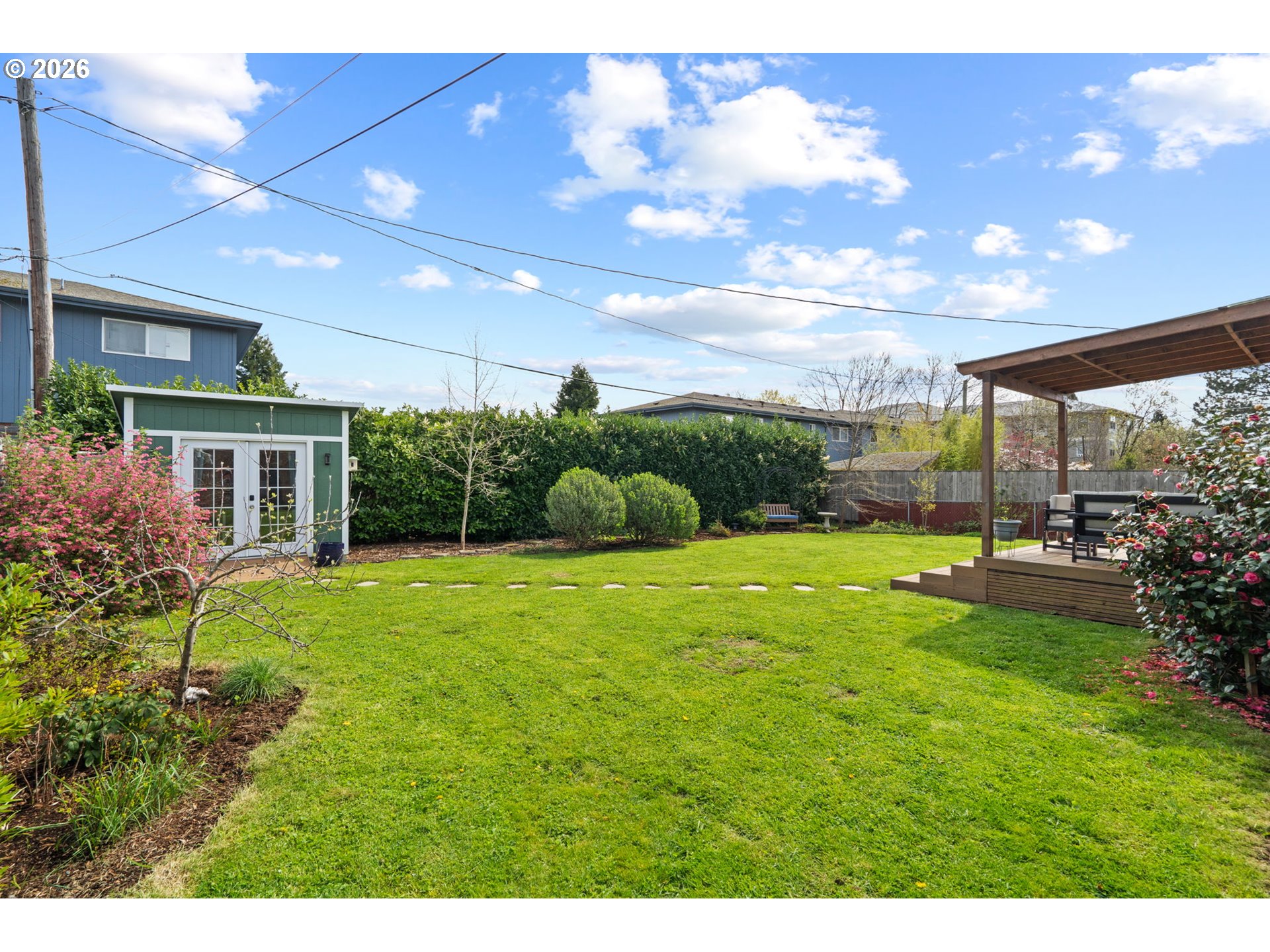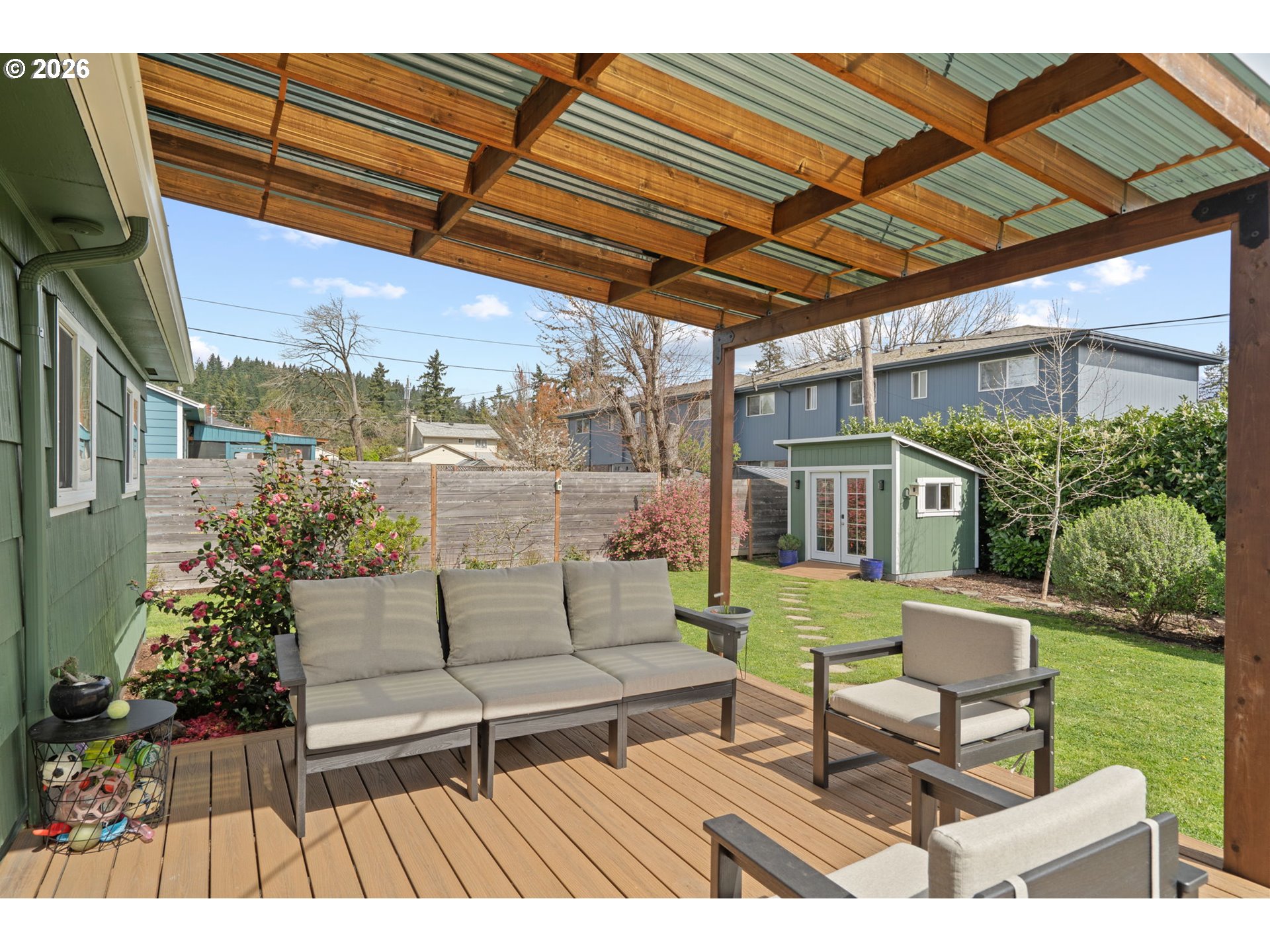 OPEN HOUSE Saturday, April 4th 12-2PM. This remodeled midcentury modern bungalow hits the rare balance of character and care. From the beautifully maintained front yard, enter into a light-filled living room with a large front window and anchored by a classic wood-burning fireplace. Adjacent to the living room is a dining area and kitchen remodeled in 2024. It features butcher block countertops, beautiful tile work and wallpaper, updated cabinetry, stainless steel appliances with induction cooktop, and recessed lighting. Hardwood floors are found throughout most of the home and major interior updates continue with a full bathroom remodel in 2022. 3 bedrooms are at one end of the house and a dedicated den is at the other end. It functions as a perfect flex space, complete with built-in bookshelves and soundproofed back wall. This could be a quiet home office, media room, or craft room. A laundry room and half bath are situated off the flex space, so it could also be used as a 4th bedroom! For those needing even more separation, the detached backyard shed has been utilized as a private office but offers flexibility for other needs. The "big-ticket" items are already done, including a 2019 roof with a transferable 10-year warranty, a new furnace and A/C in 2020, a new electrical panel in 2020, a 2018 water heater, and fresh exterior paint just completed in 2025. The outdoor living space is a standout feature, centered around a 2020 Trex deck and pergola overlooking a Certified Native Backyard Habitat. This low-maintenance landscape is also a functional urban orchard, producing blueberries, raspberries, huckleberries, serviceberries, and a 5-variety apple tree. The large backyard is fully fenced (partial newer fencing from 2019). The washer, dryer, and refrigerator are all included, with other personal property negotiable. This is a well maintained, move-in-ready home where the heavy lifting has already been handled! [Home Energy Score = 5. HES Report at https://rpt.greenbuildingregistry.com/hes/OR10030129]