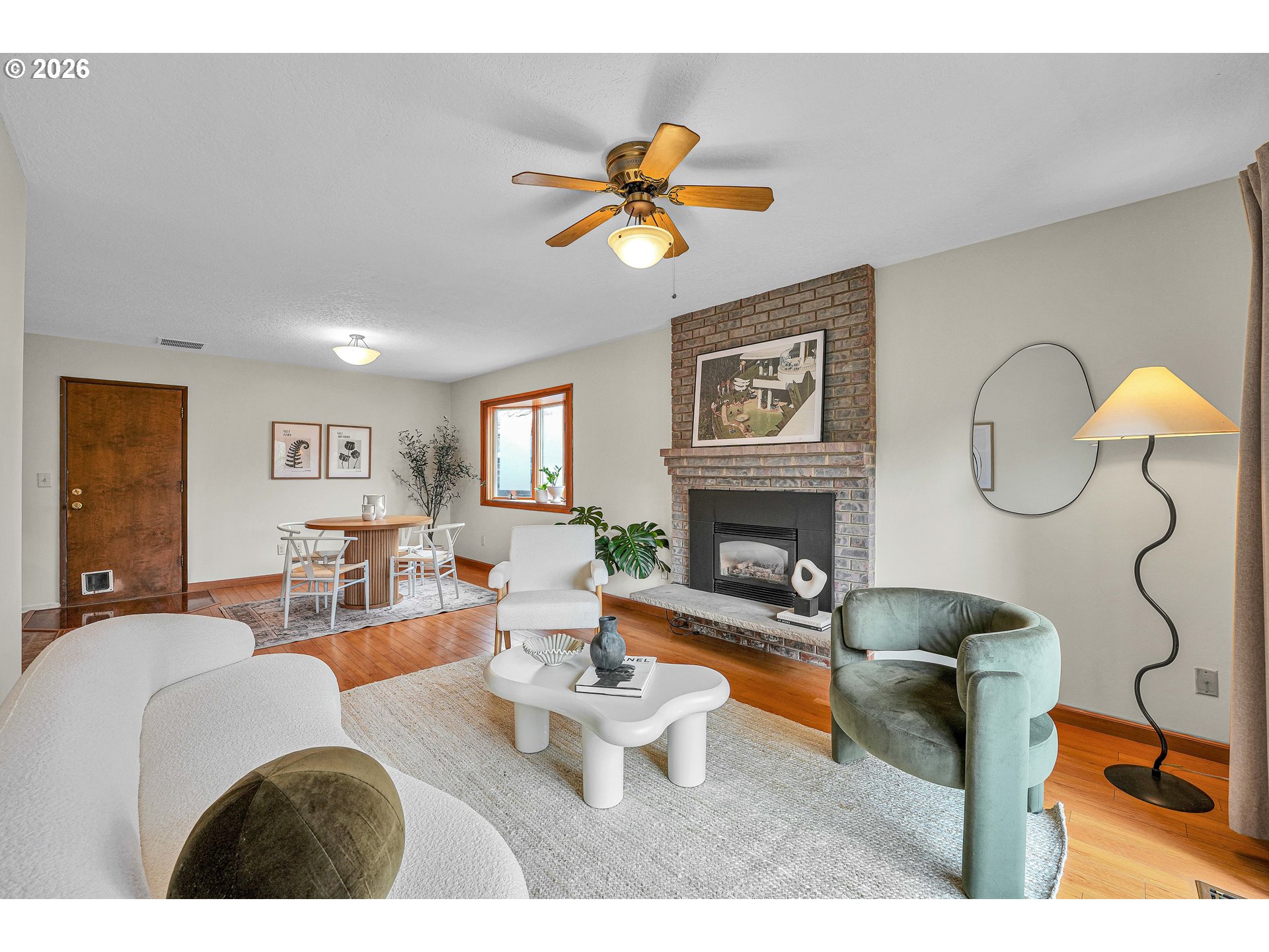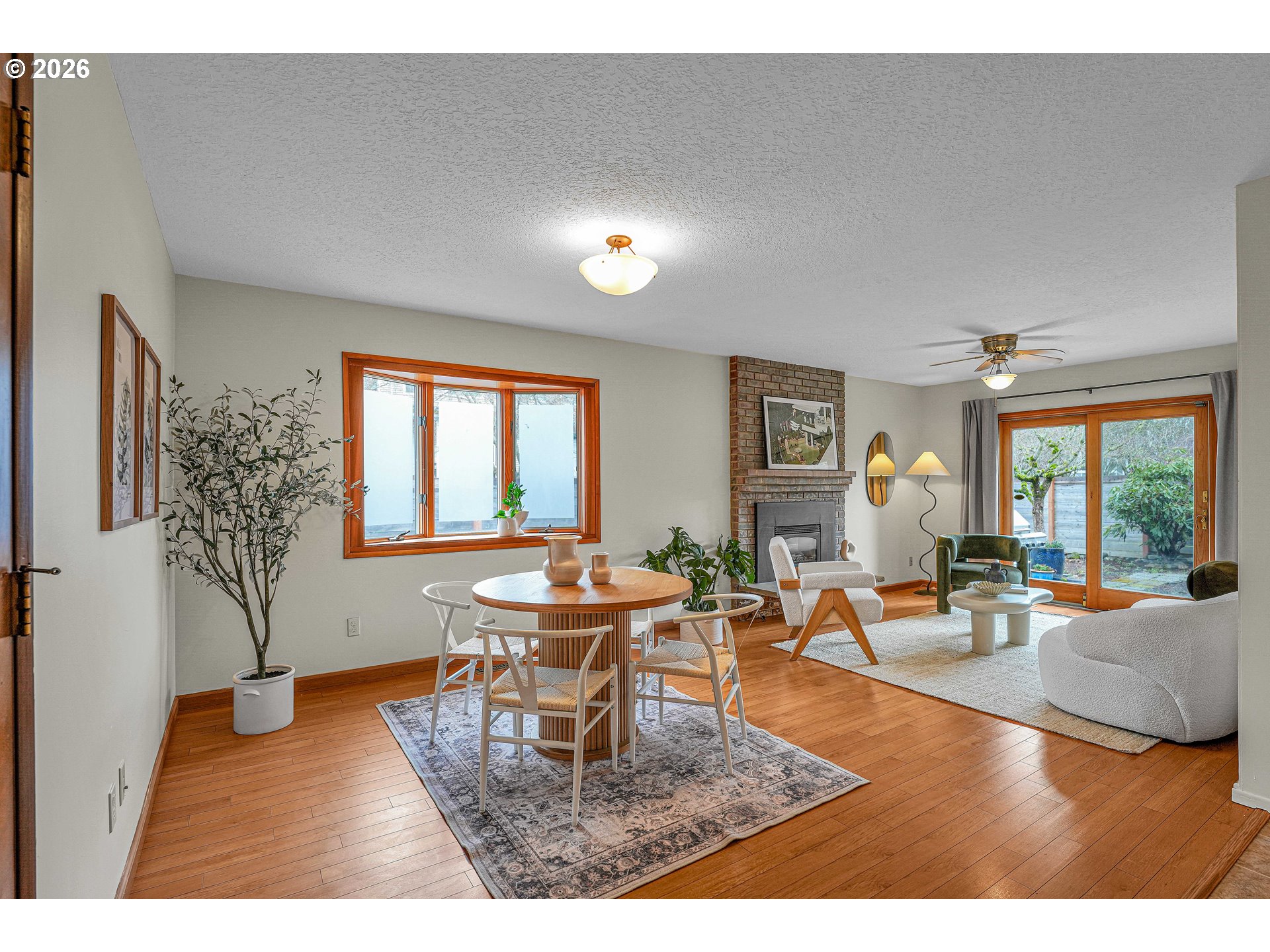 Welcome home to this classic mid-century ranch where easy one-level living meets warmth, charm, and timeless style. With 3 bedrooms, 2 full bathrooms, and two spacious living areas, the thoughtful floor plan offers flexibility for both everyday living and effortless entertaining. Step inside and you’re greeted by a light-filled main living room featuring a tall wood-beamed vaulted ceiling with a cozy fireplace that anchors the space and sets the tone for the home’s inviting character. Beautiful oak floors, original custom double door at the entry, and wood framed doors and windows are just a few examples of the time period charm that makes this home so special. The second living room offers a more relaxed retreat overlooking the backyard—a calm place to unwind, read a book, play games, or simply enjoy a quiet evening by the fireplace while taking in the view of the garden. The large sliding glass door opens to a private, fully fenced backyard—perfect for morning coffee, summer barbecues, or simply enjoying the peaceful outdoor setting. Established landscaping and mature gardens create a welcoming space to unwind, grow your tomatoes, or entertain. Fresh interior paint gives the home a bright, refreshed feel while honoring its mid-century roots. Don't forget the 2 car garage that provides ample space for your cars, hobbies, or additional storage. This classic rambler blends character and comfort with simple, functional living all on one level. Conveniently located with quick access to I-84 and I-205, making commuting simple and putting Portland International Airport, the Columbia River Gorge, and the city of Portland all within easy reach. A home that feels both welcoming and timeless—full of light, character, and space to live comfortably. [Home Energy Score = 1. HES Report at https://rpt.greenbuildingregistry.com/hes/OR10188546]