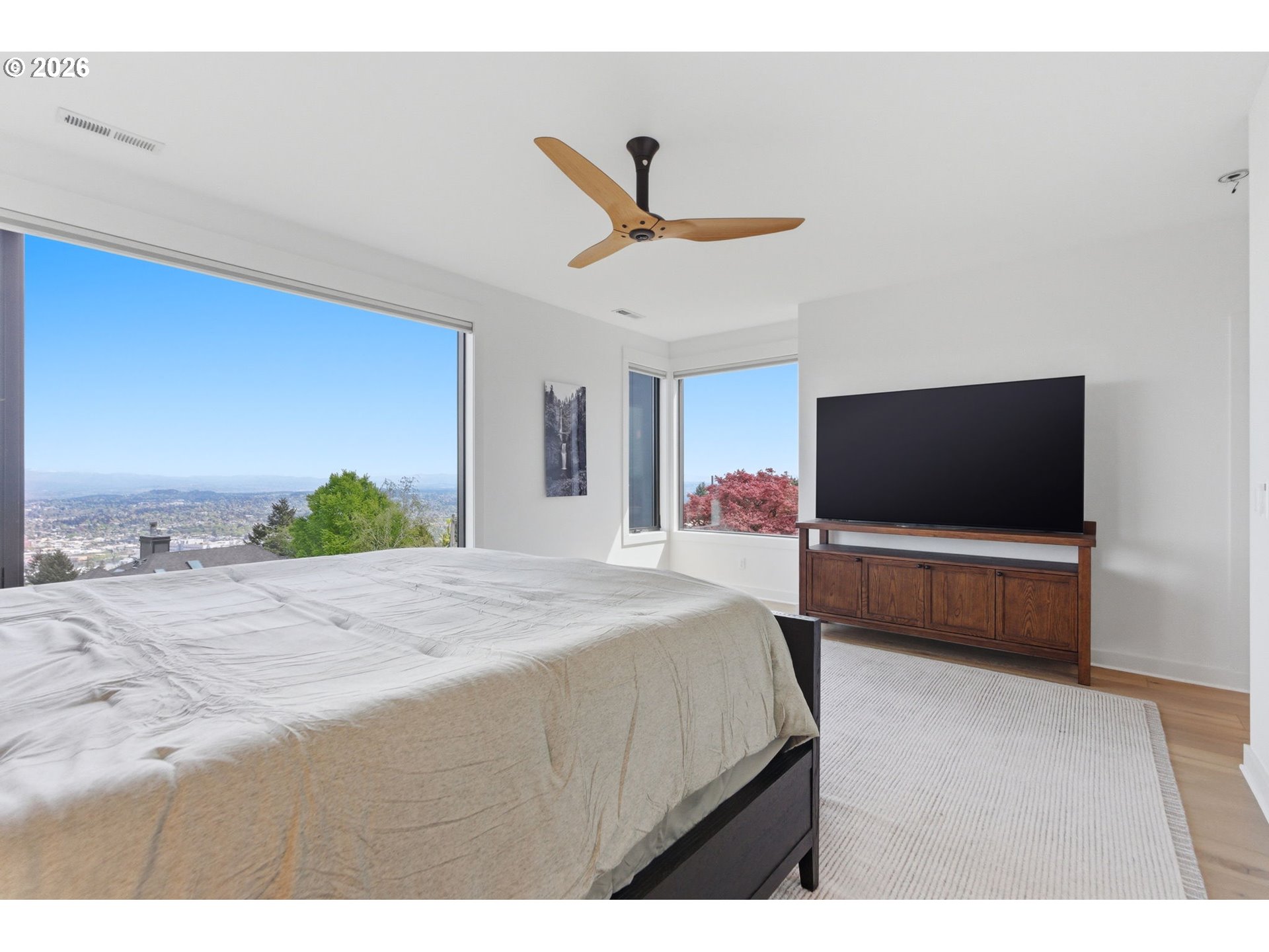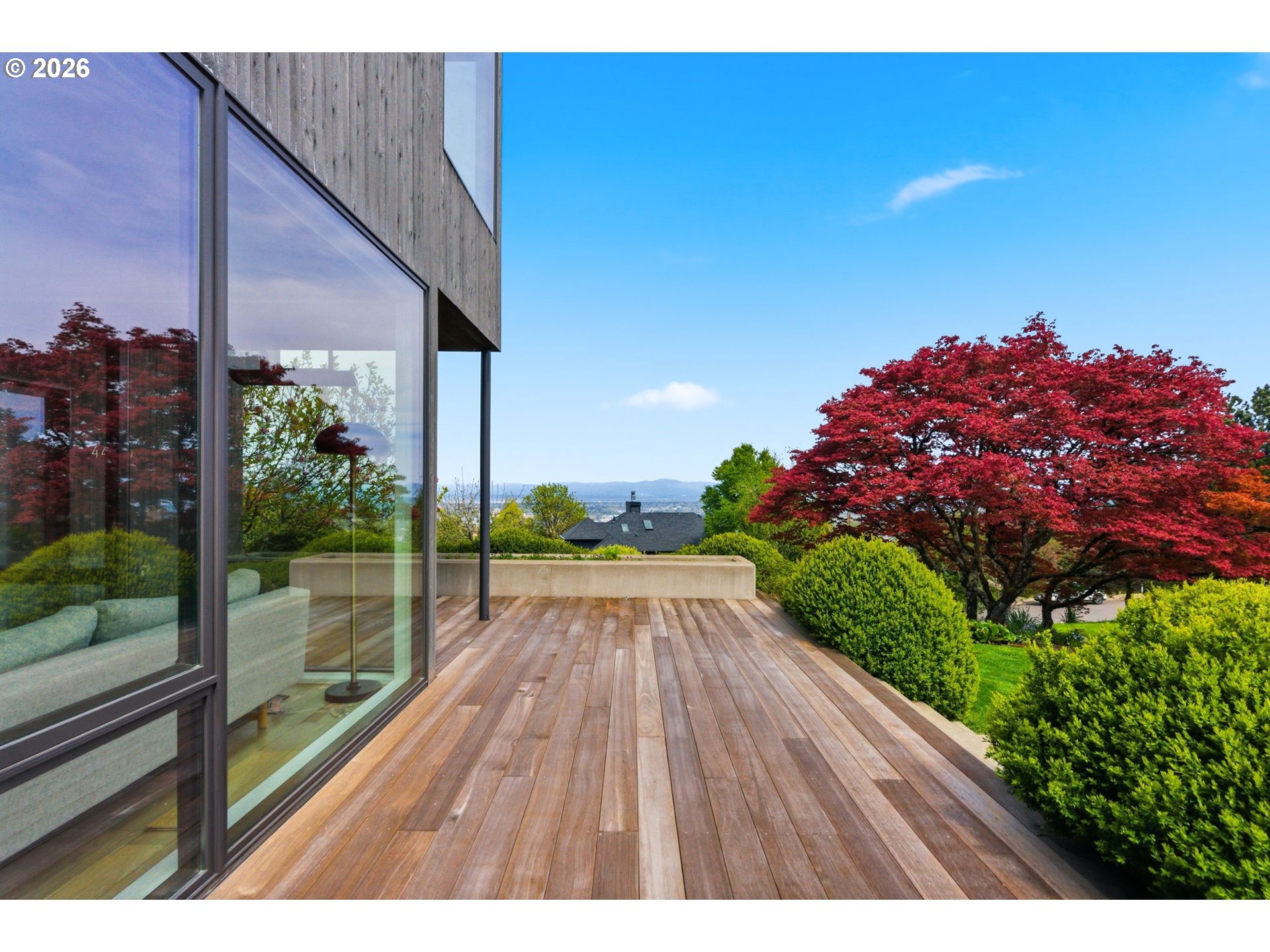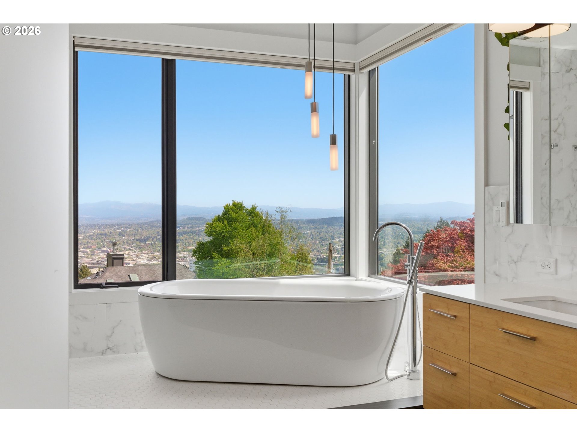 Experience refined NW modern living at the top of coveted Healy Heights where sweeping multi-mountain & city views provide a remarkable everyday backdrop. Easy access to the OHSU campus, this property offers a rare combination of stunning views, functional yard & outdoor spaces, coupled with a true "neighborhhood" culture. The thoughtful designer updates blend modern comfort with timeless livability in a setting that feels both elevated & grounded. Bathed in natural light, the residence showcases beautifully curated interiors & offers a clean, minimalistic aesthetic. With 4 bedrooms plus a dedicated den/office, bonus room and 4 full bathrooms, the layout is designed for flexibility, function, and comfort. The primary suite boasts views from all angles and an expansive spa-like bathroom with a soaking tub overlooking the city & mountains. Well equipped kitchen is the heart of the home featuring a large pantry, island seating and wine refrigerator. Designer-updated bathrooms, new hardwood flooring on upper & lower levels, and newer interior paint enhance the home’s fresh, contemporary feel. A well-executed open floor plan connects dual living spaces with ease, creating a natural flow that supports both entertaining and relaxed daily living. Step outside to enjoy multiple outdoor living spaces, including a front deck with stunning skyline views—an ideal setting for morning coffee or evening sunsets. A private backyard retreat adds additional space for relaxation and enjoyment with a deck, spacious patio and flat yard space. Added peace of mind comes with a whole-house generator, providing comfort and reliability year-round. Conveniently located on a corner lot in coveted Council Crest near parks, and handy to the OHSU campus, Portland’s vibrant dining scene and renowned coffee culture, major commuter routes and feeds into top-rated schools. This home offers an exceptional blend of lifestyle, location, and livability in one of Portland’s most desirable neighborhoods! [Home Energy Score = 1. HES Report at https://rpt.greenbuildingregistry.com/hes/OR10198213]