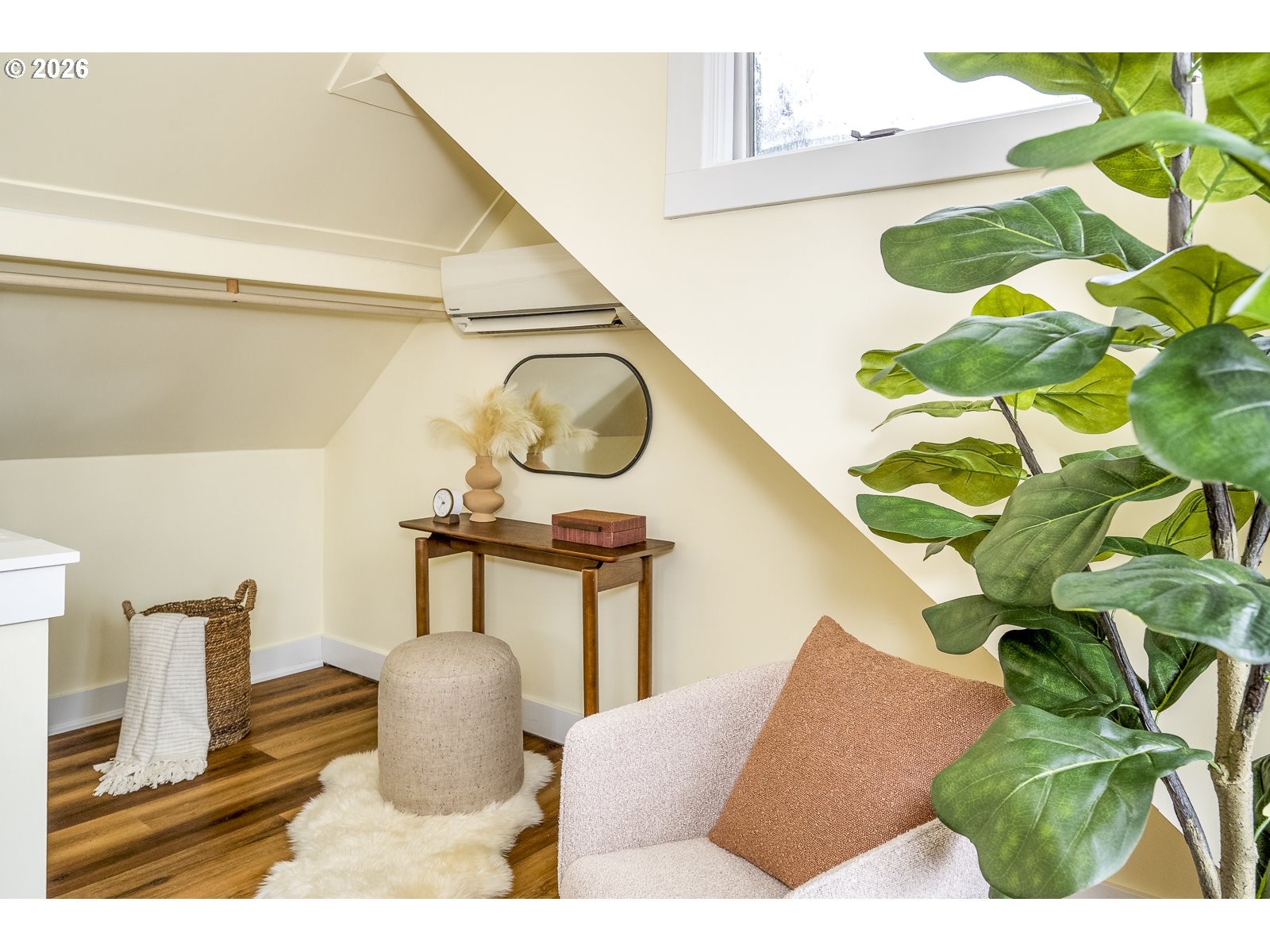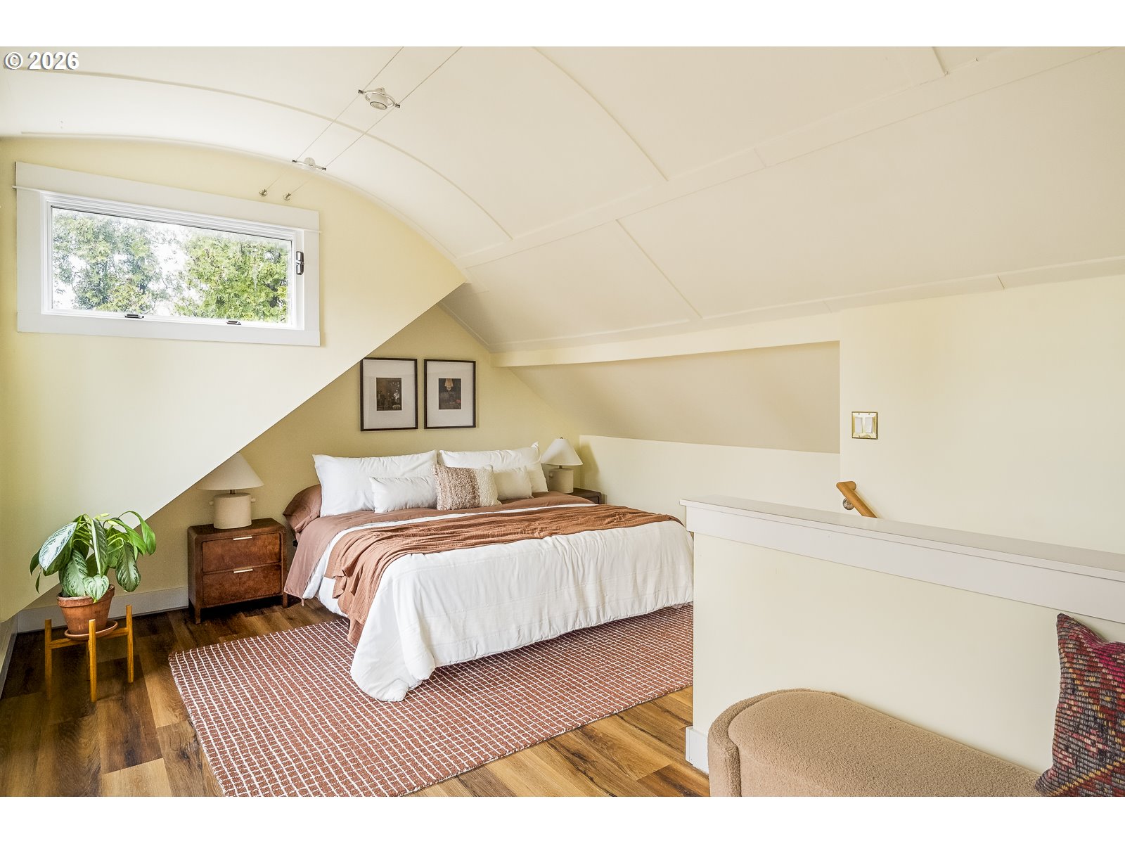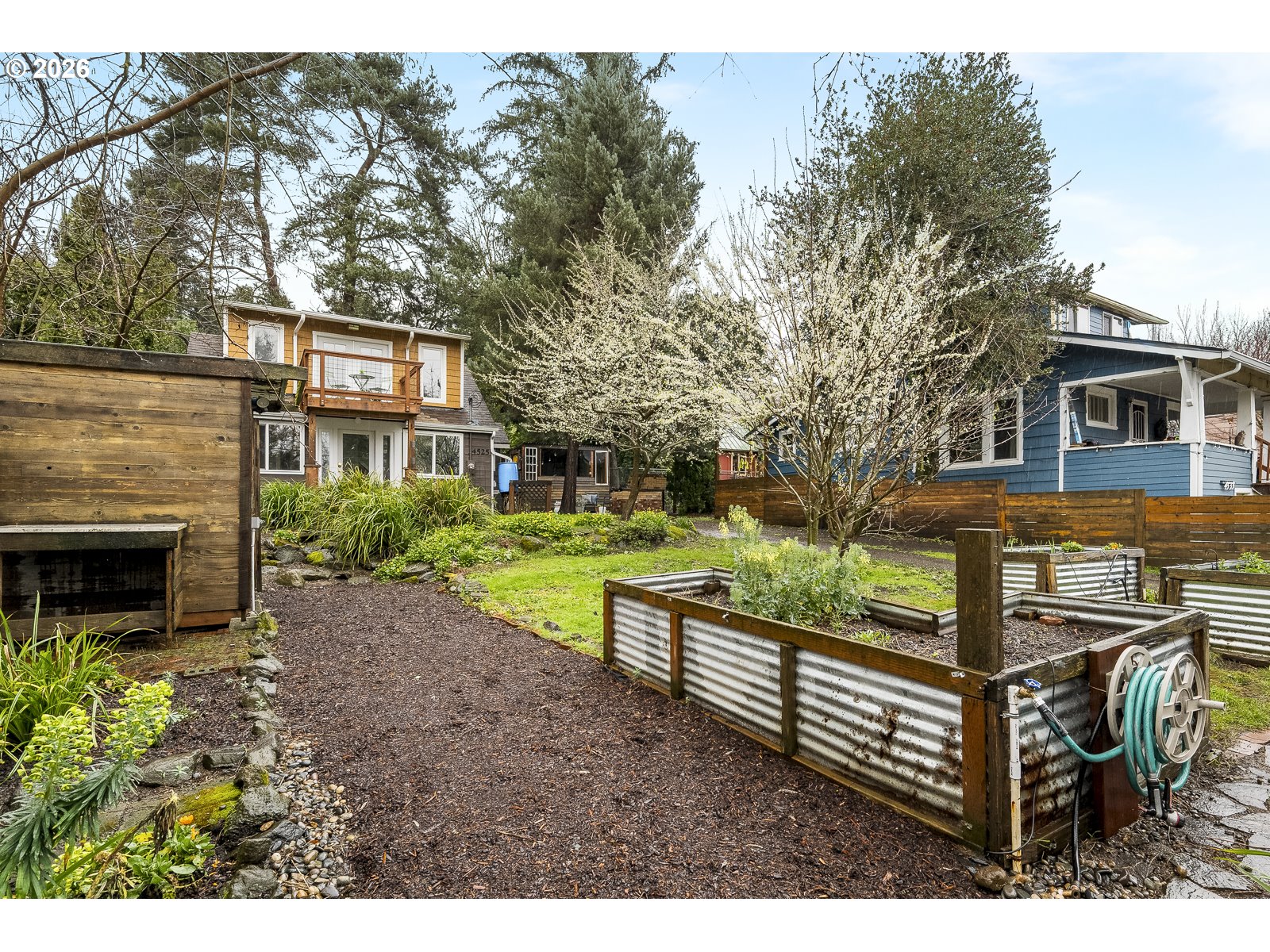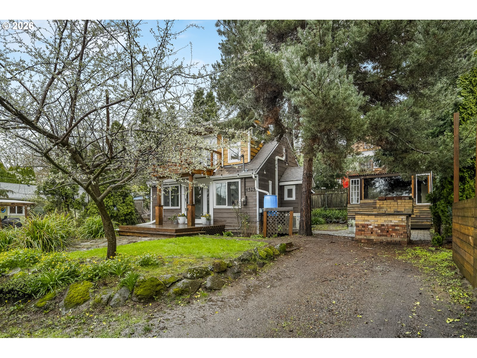 Looking for a private retreat with expansive outdoor spaces located close-in Southeast Portland? Welcome to this charming 1947 cottage set at the back of this long lot where Eastmoreland meets Errol Heights. From the spacious front porch, step into a sweet sitting room and beautiful dining room full of large windows. Newly updated kitchen features new stainless appliances, gas range, maple cabinets, and new granite countertops. Main level bedroom has hardwood floors & walk-in closet and the bathroom features tongue & groove ceiling with skylight. Upstairs primary bedroom has tons of storage, curved ceilings, and gorgeous natural light. Step out onto a newly rebuilt balcony that overlooks the tiered gardens and front yard. Mini splits keep the home cozy and cool as needed, with an energy score of 9! This sanctuary boasts mature trees, raised planter beds, a garden shed, plum & fig trees, a great paver patio with outdoor pizza oven, perfect for entertaining, and a very cool potting cabin. Add a hammock to the large front porch, bask in the sunshine on the flagstone pavers, host outdoor parties throughout the seasons, all within a yard safe for pets and play. Extra-long driveway allows for large vehicle or boat storage. Find the amenities of the newly developed Errol Heights Park and Woodstock’s local shops, New Seasons, and more just a few blocks away. Come discover the charm and comforts of this inspiring property at one of our open houses on Saturday and Sunday! [Home Energy Score = 9. HES Report at https://rpt.greenbuildingregistry.com/hes/OR10034357]