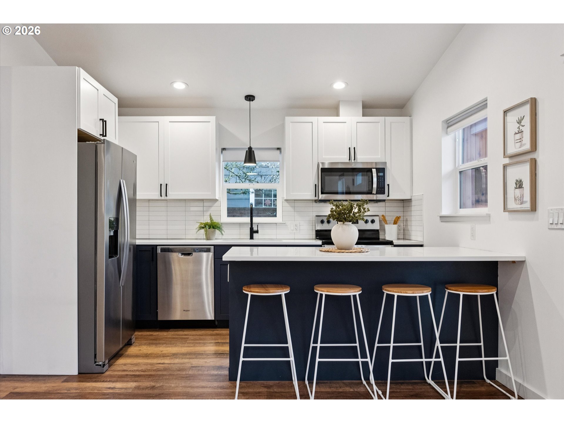 This 2022 built NW modern designed 2 bed 1 bath lives larger than the sqft. Vaulted ceiling, light and open spaces, quartz counters, heat pump splits for both heat and A/C. Contemporary great-room kitchen with all the amenities and finishes of a newer build, eat-in counter, stainless appliances all included. Covered front porch is perfect for a sit and sip, or head out back to the spacious fenced yard. Just a few blocks to the trendy eats, treats, and boutiques of NE 42nd Business District, or head south to enjoy the fun of Fremont St. Home Energy Score = 10! Don't miss out on this one!