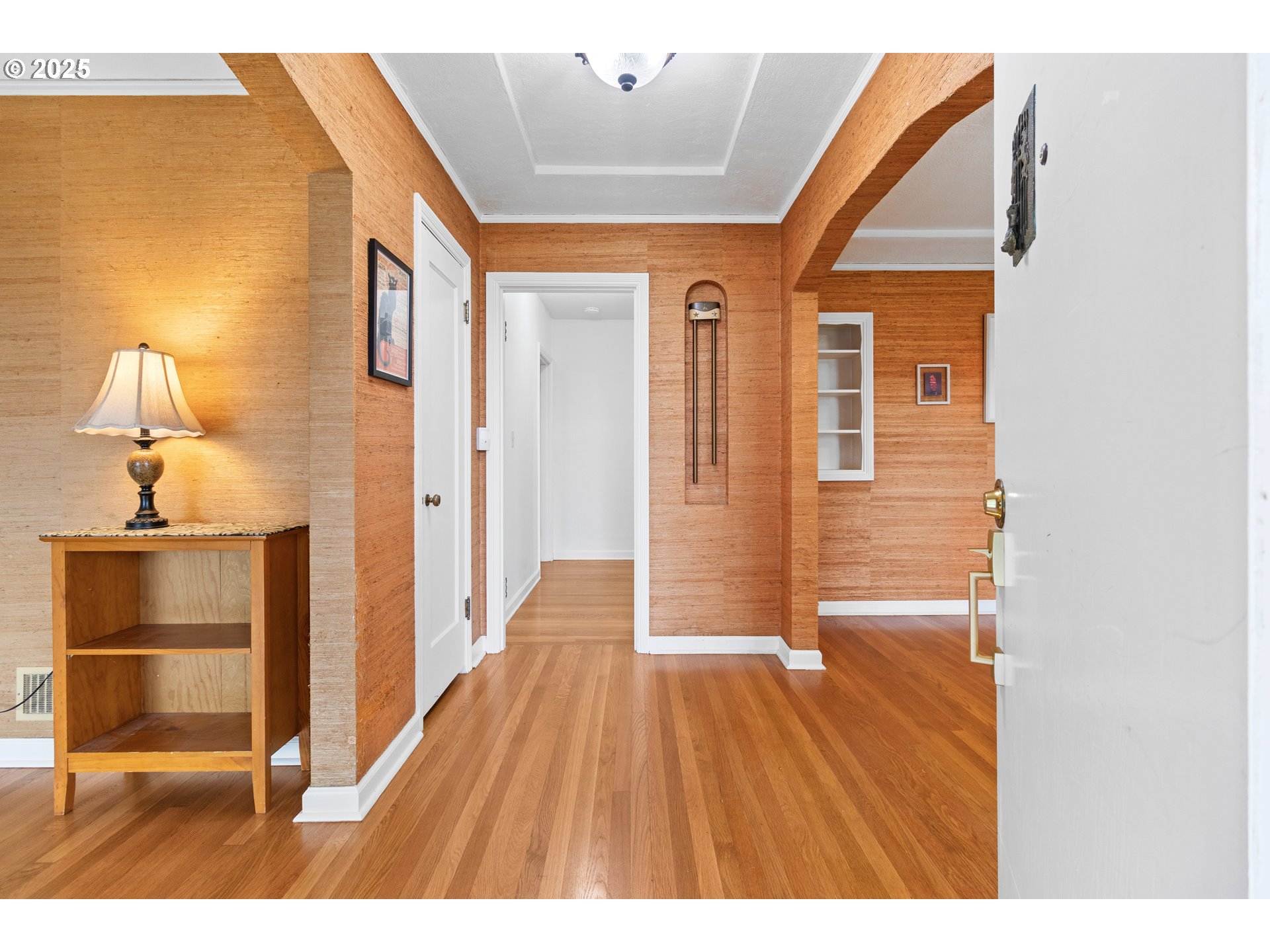 Stellar bluff-top home in University Park with sweeping views of Forest Park and Downtown Portland. Set back from the road, this beautifully maintained residence blends historic charm with thoughtful updates across 2,500+ sqft. Refinished hardwood floors, updated high-end windows, and elegant tray coved ceilings enhance the spacious living and dining rooms. A gas log fireplace anchors the living room, framed by a stunning picture window. The formal dining room leads to a vintage kitchen featuring original cabinetry and tilework in pristine condition, complemented by newer appliances and a cozy breakfast nook. Two generous main-level bedrooms flank a classic tiled bath. Downstairs, the full basement offers a large bonus room, den, built-in cabinetry, and a spacious third bedroom with a gas fireplace—ideal for a theater or party room—plus a second full bath. The attic holds exciting potential for future expansion. Outside, enjoy a lush backyard with mature landscaping, garden beds, patio, detached 2-car garage, and a fenced dog run. Just one block to Columbia Park and 1.2 miles to New Seasons and the vibrant Lombard dining scene. A rare opportunity to own a view home with timeless character and room to grow. See our virtual tour links for more information [Home Energy Score = 3. HES Report at https://rpt.greenbuildingregistry.com/hes/OR10242820]