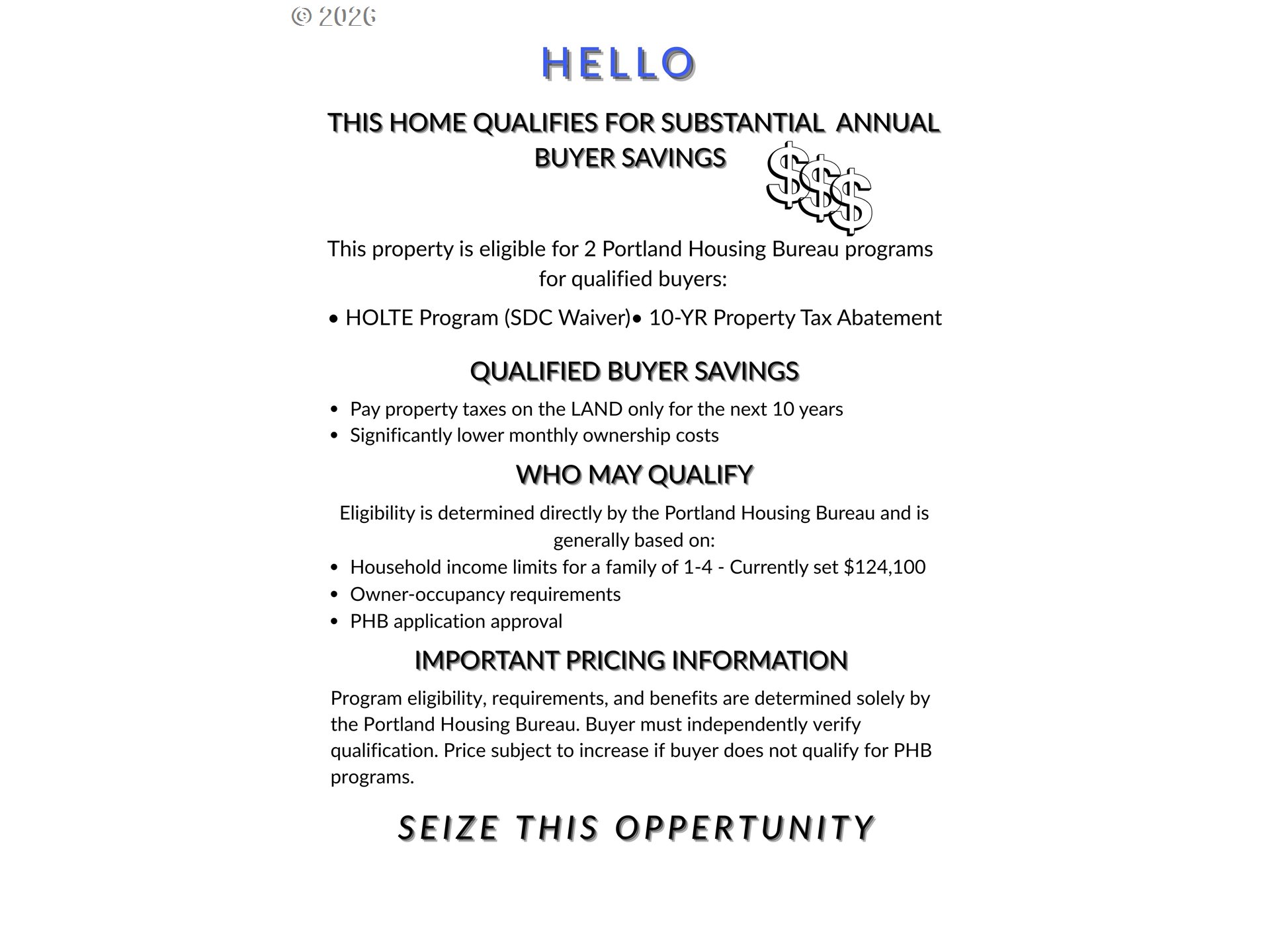 This detached new construction doesn’t just check boxes — it rewrites your monthly budget. Qualified buyers can take advantage of a 10-year Tax Abatement and SDC Waiver through the Portland Housing Bureau, meaning you’ll pay property taxes on the land only— not the home — for the next decade. The result? Real, measurable monthly savings that most homes simply can’t compete with. Inside, the home delivers just as much as the numbers. The open-concept living and kitchen space is bright, functional, and designed for how people actually live. Quartz slab countertops, custom soft-close cabinetry, stainless steel appliances, and a pantry bring both style and practicality together effortlessly. Upstairs, vaulted ceilings elevate the already spacious bedrooms, creating a calm, airy feel. Bathrooms feature clean, modern tile finishes, and yes, laundry is exactly where you want it: upstairs.Outside, you’ll find a generous private fenced patio plus secured exterior storage — a rare combo that adds real livability.Smart layout. Modern finishes. Private outdoor space. And a financial advantage that’s hard to ignore. This one earns its spot on the must-see list. Price subject to buyer qualification for PHB SDC waiver program.