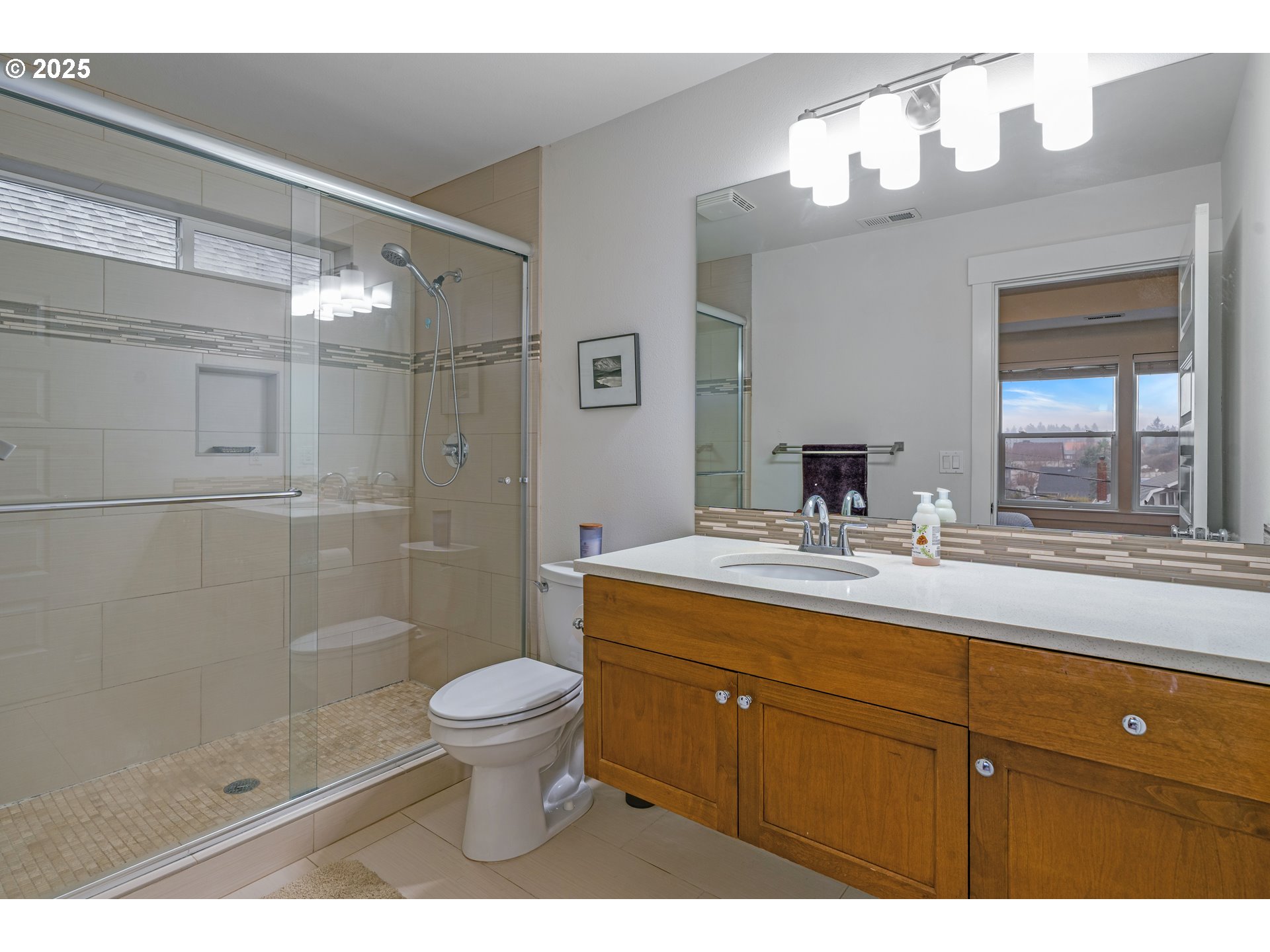 Experience urban living at its finest in this modern 3 bed, 2.5 bath home perfectly positioned between Laurelhurst and Mt. Tabor. Thoughtfully designed with high-end finishes, the open floor plan features 9-foot ceilings on the main level, hardwood floors, a stylish living room with gas fireplace and built-ins, and a formal dining area. The gorgeous chef’s kitchen offers quartz countertops, stainless steel appliances, an electric convection oven and stovetop, and an island ideal for cooking and gathering. The primary suite includes a walk-in closet and a beautifully updated primary bathroom featuring an oversized step-in shower. The solar system installed in June 2025 is fully paid off and will save you thousands on electricity for years to come. Additional highlights include plentiful closet space, tile bathroom flooring, Hunter-Douglas blinds, A/C, and an oversized one-car garage. Enjoy a fully fenced, private backyard with terraced garden beds—perfect for relaxing or gardening. With unbeatable access to parks, cafés, pubs, award-winning eateries, Max Light Rail, and I-84, this home places the best of Portland’s Northeast neighborhoods right at your fingertips.
