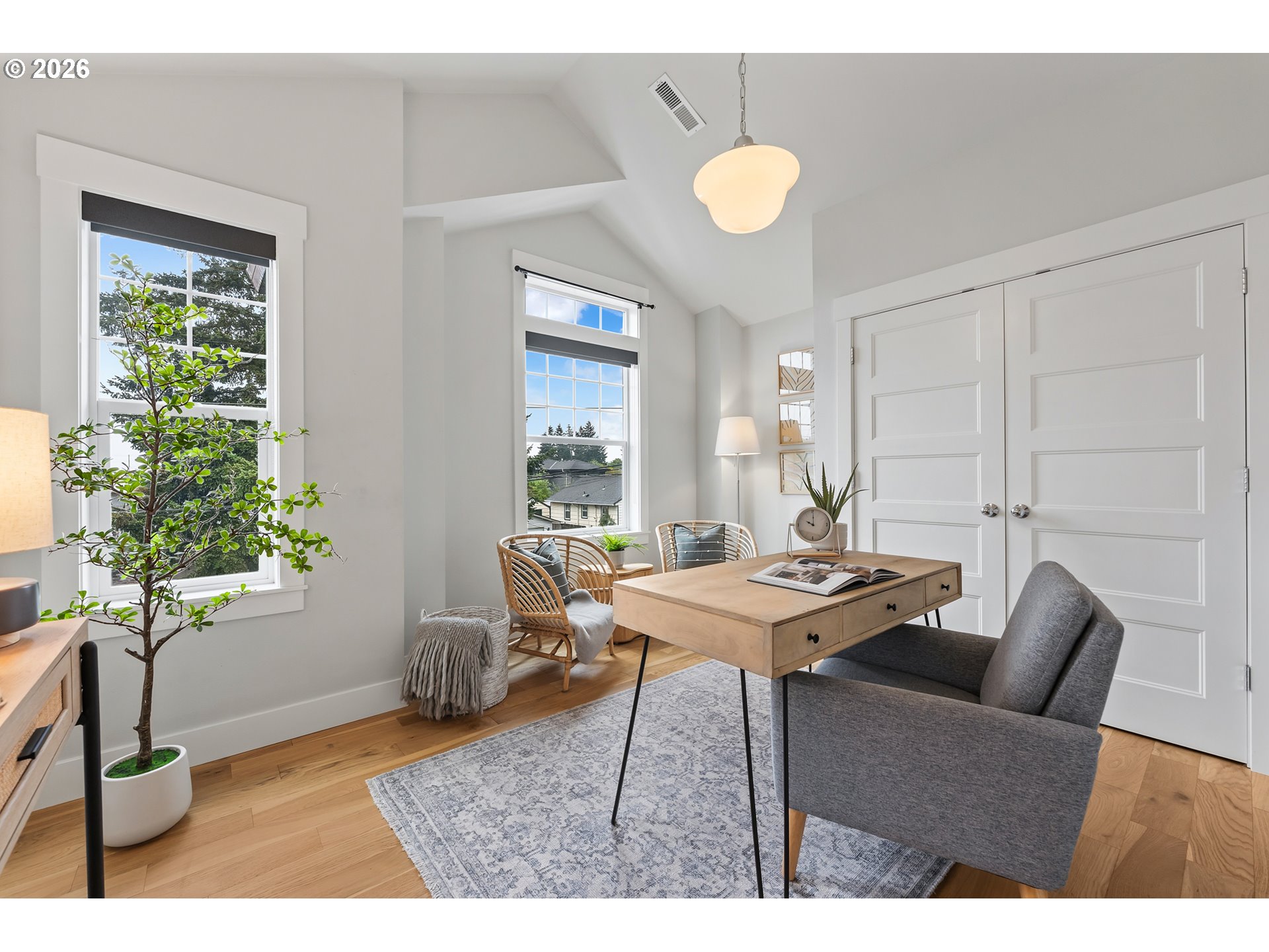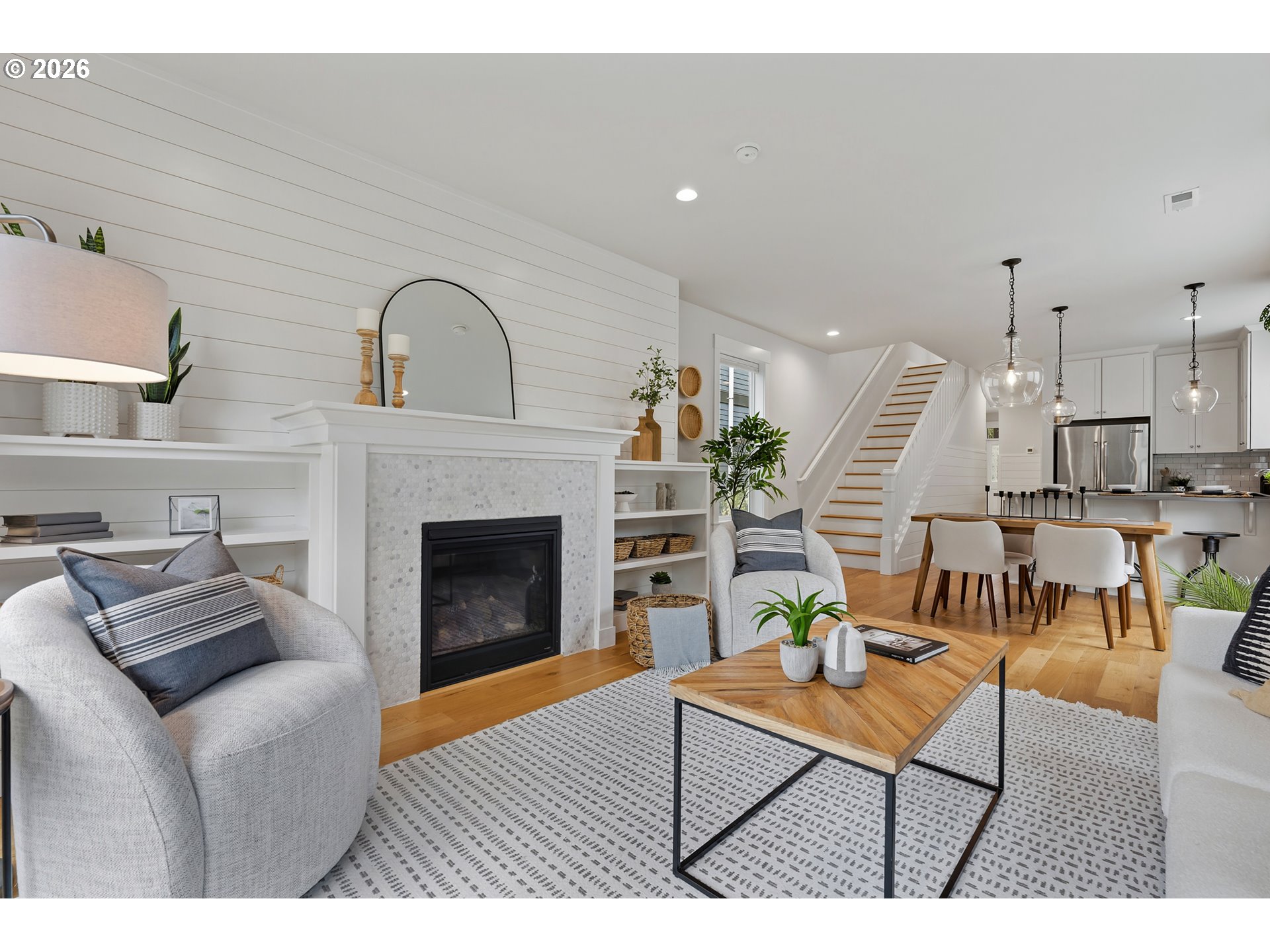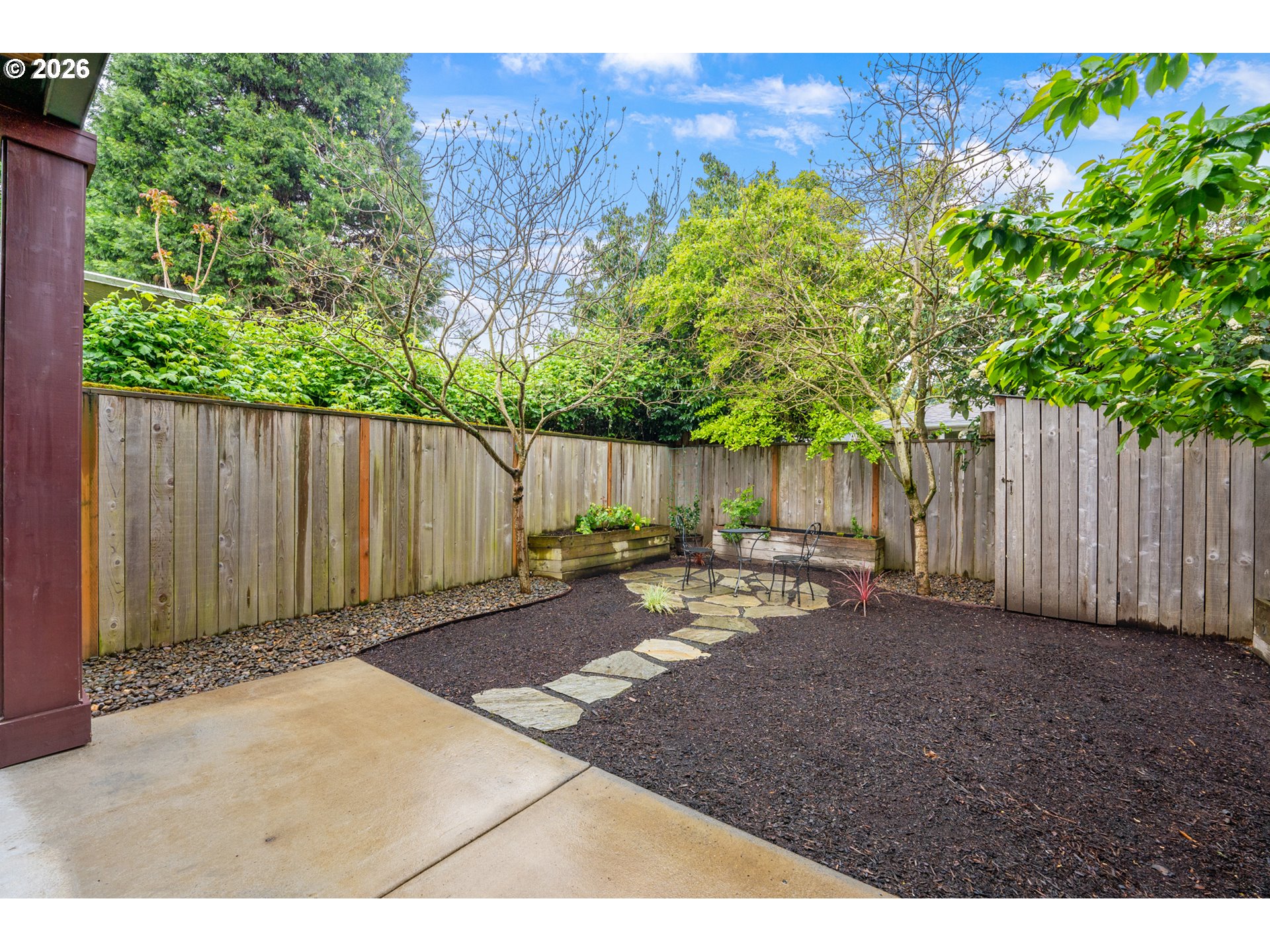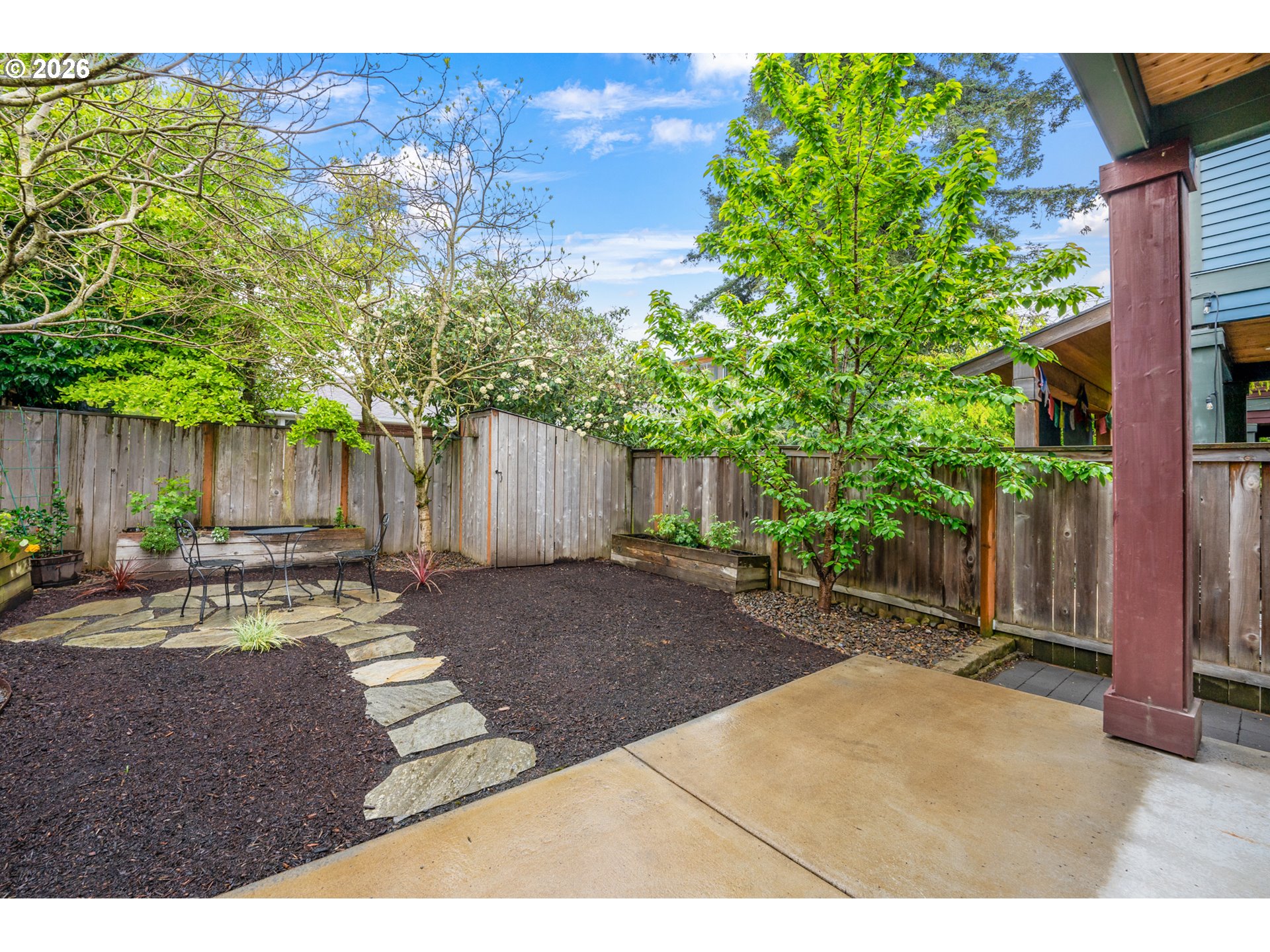 Well maintained and cared for newer construction in a prime Concordia location just blocks from New Seasons, Kennedy School, Fernhill Park and many other local cafes, restaurants and pubs. Thoughtfully designed with handsome Craftsman-style detailing on the outside and a warm, inviting feel inside featuring high ceilings and expansive windows that fill the space with natural light year-round. Quality materials and detailing throughout, including oak flooring on both levels, ship-lap accents, vaulted ceilings upstairs, built-ins, gas fireplace, nicely detailed, open staircase and high-quality fixtures, hardware and window coverings.The oversized slider to the fenced backyard creates an easy flow for both everyday living and entertaining. The stylish, modern kitchen features quartz countertops, stainless steel Jenn-Air appliances (all included), and Rejuvenation light fixtures and hardware.The beautifully landscaped, private back yard is fully fenced with a lovely flagstone patio, raised beds and a spacious concrete patio — ideal for gardening, summer evenings, and letting pets roam freely. Spacious bedrooms offer ample closets and separation, making them perfect for remote work or hosting guests. The primary suite is a true retreat, featuring a large bathroom, walk-in shower, and roomy closet.Enjoy the convenience of upstairs laundry room with added storage, plus a washer and dryer included. Built with energy efficiency and low-maintenance materials, including a 95% efficient furnace and tankless water heater.An attached garage, driveway parking, and central air conditioning add to the comfort. Walk Score of 86 and Bike Score of 98! [Home Energy Score = 8. HES Report at https://rpt.greenbuildingregistry.com/hes/OR10227894]