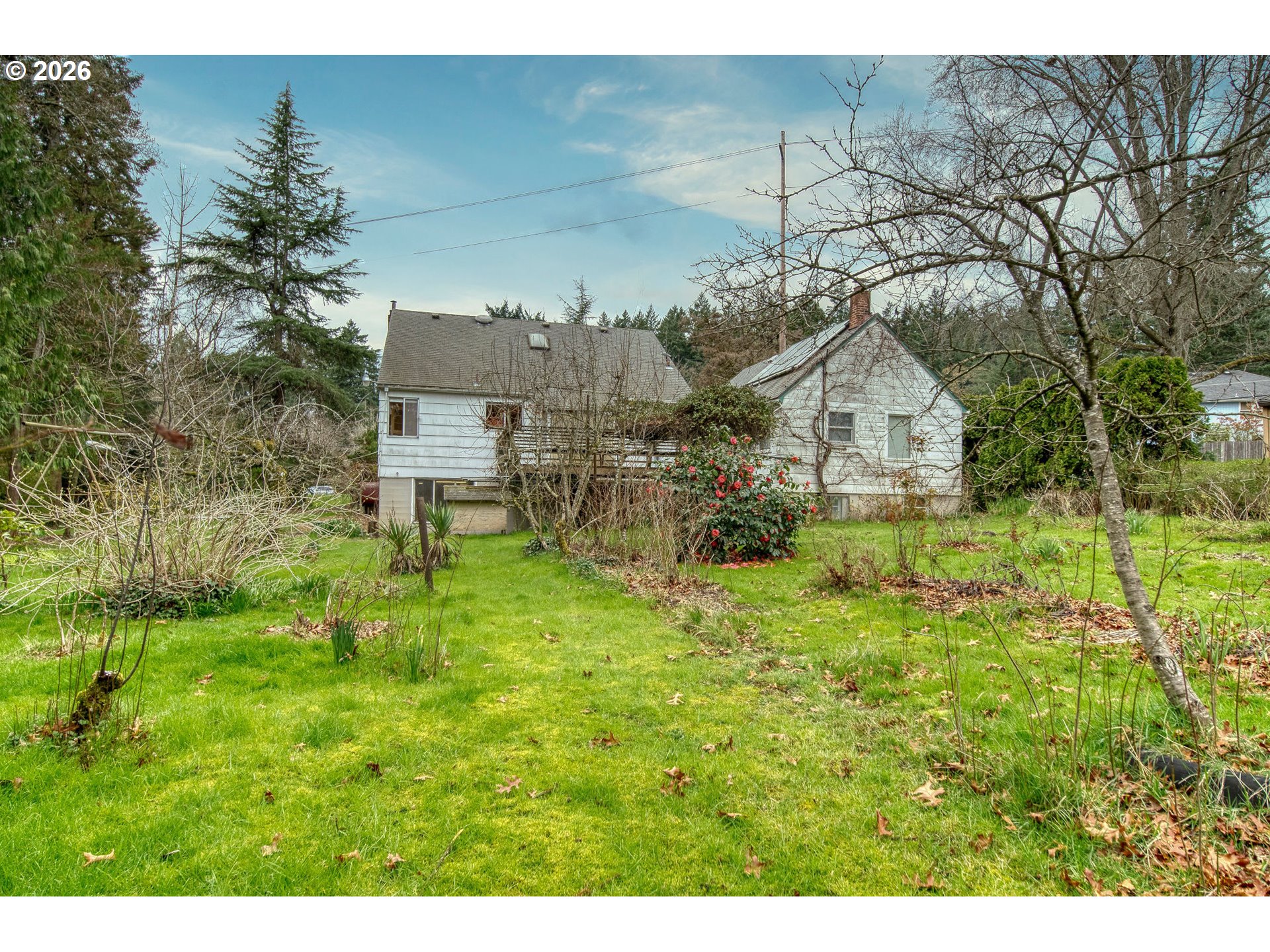 Welcome to your own urban oasis of over a half-acre. Featuring natural, tranquil scenery enhanced by a creek. The large, private yard is your own playground in the city! Living/dining, kitchen and two bedrooms and bath on main level, all with hardwood floors. Daylight basement: offers outdoor access and has great possibilities for more potential, along with the utility room, and pantry. Bonus level: Unfinished attic offers endless opportunities for expansion!Don't miss the cozy, additional living space in the back portion of the garage with separate entrance, with attic space above the garage and extra apartment with about 6 ft. ceiling for more creativity. Many fruit trees, blueberries, grapes, flowers and shrubs to enjoy spring through fall. Plan your gatherings for this summer in this "park like setting"! Buyers to do due diligence on possible ADU and schools, neither are guaranteed!