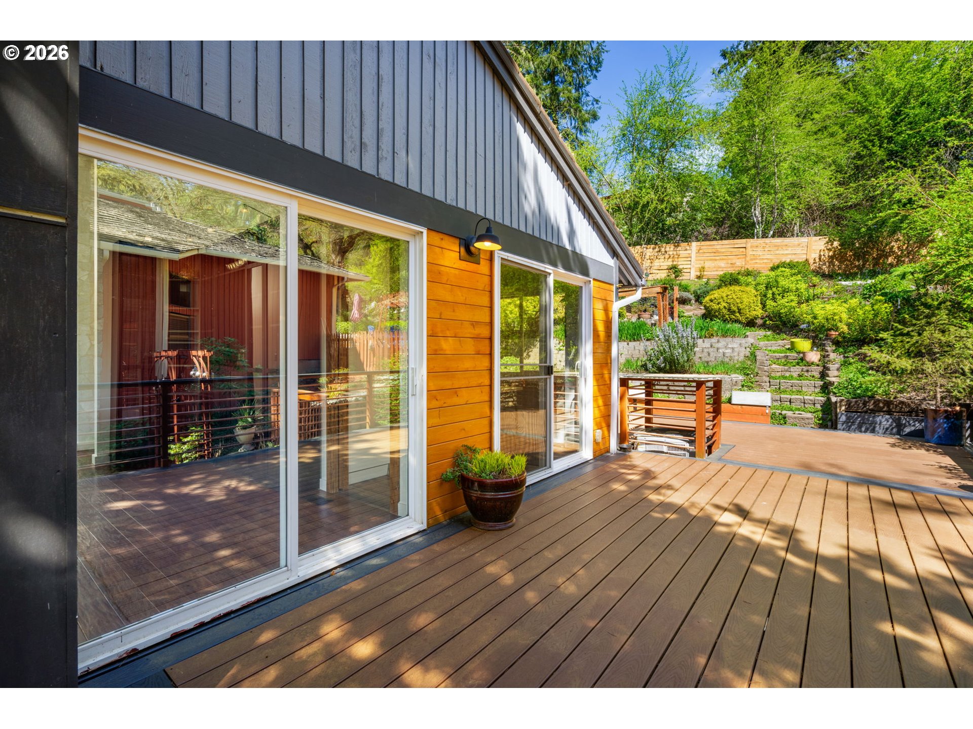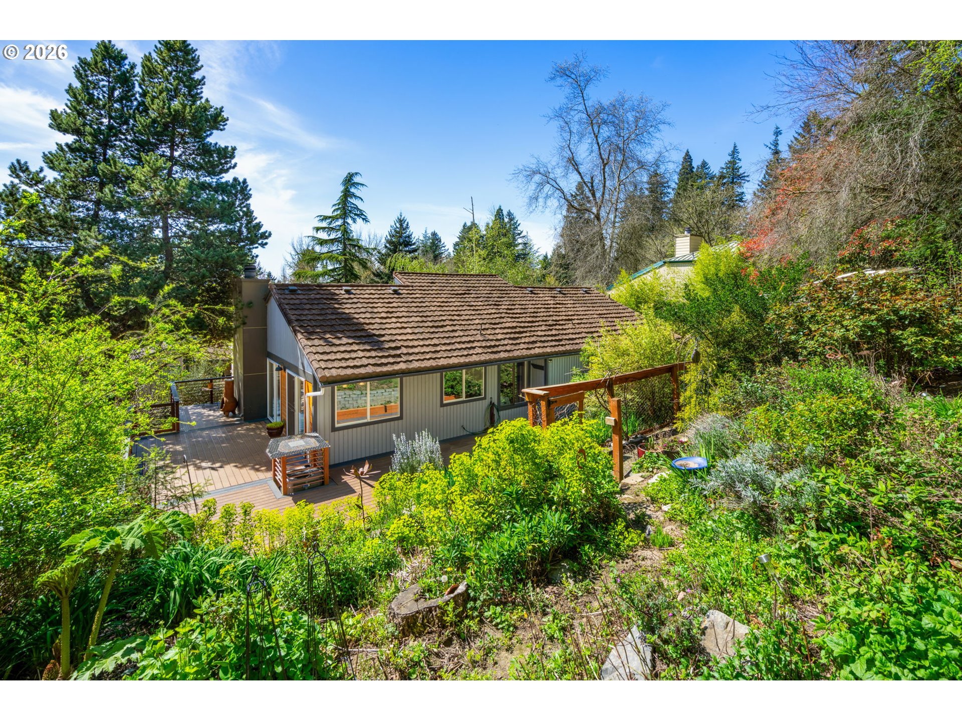This spacious four bedroom home offers a nice mix of striking original character and tasteful updates. The impressive main level living room has vaulted ceilings, a dramatic floor-to-ceiling stone fireplace, huge windows, and slider out to the newer 1,000-square-foot deck! Beautiful updated eat-in kitchen with built-in bench in the breakfast nook, modern appliances, stylish cabinetry, countertops, and another slider out to the deck. Fully fenced backyard has a majestic garden in the process of bird habitat certification. Gardening shed for tools and supplies. Huge primary suite with floor-to-ceiling views of the treetops, a large bathroom with double sinks and walk-in closet. Two more bedrooms on the upper floor, both with closet organizers. 2nd upstairs bathroom with beautiful mosaic tile. Downstairs, the versatile bonus room could be a family room, spacious office, guest area, and more. Laundry room with utility sinks and built-ins off the two-car garage. Just up the hill from Dickinson Park with a great walking path and playground, and only minutes to Downtown. Ask for the Features/Upgrades list, too many to list here! [Home Energy Score = 4. HES Report at https://rpt.greenbuildingregistry.com/hes/OR10246100]