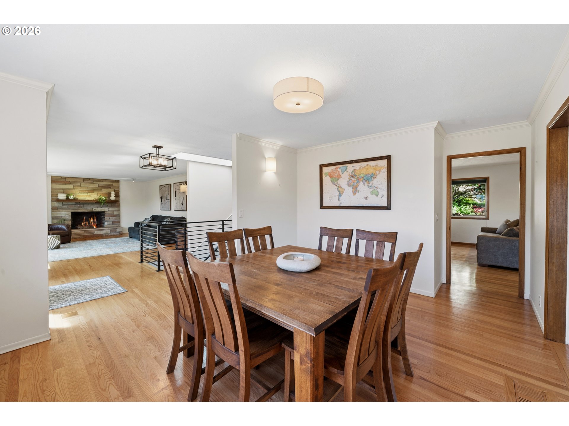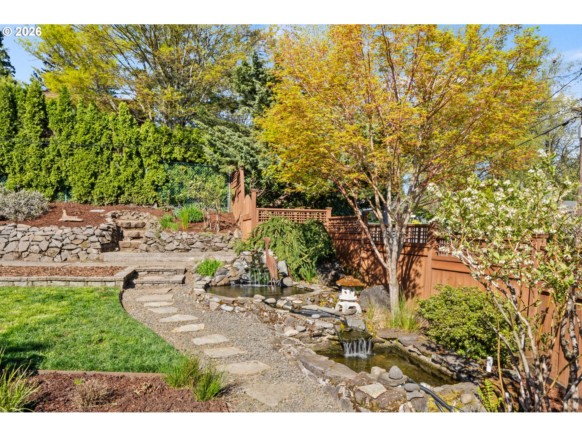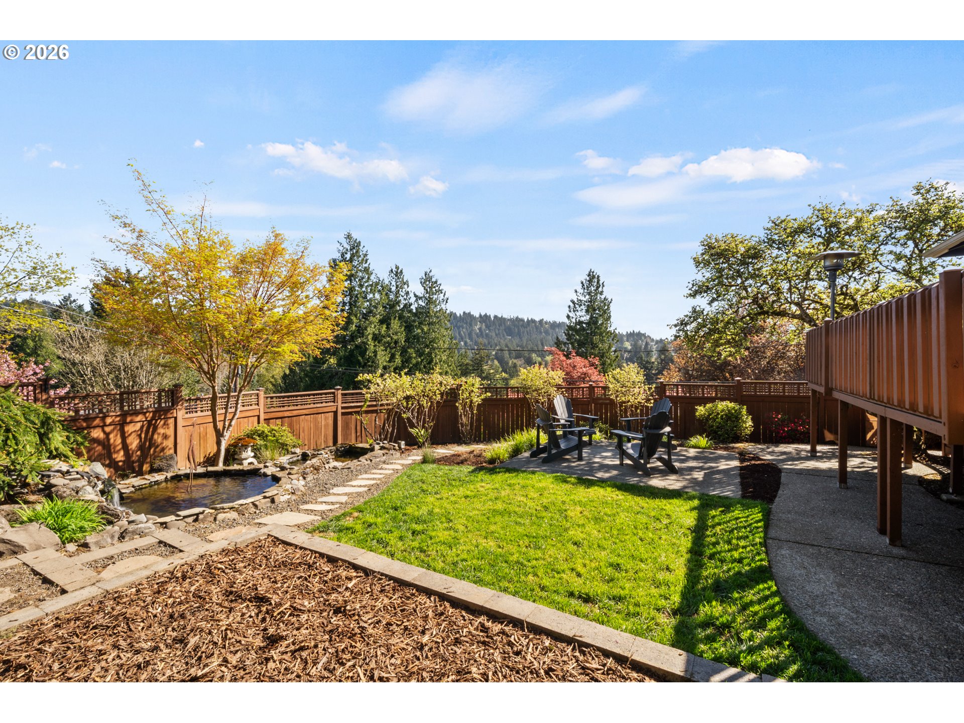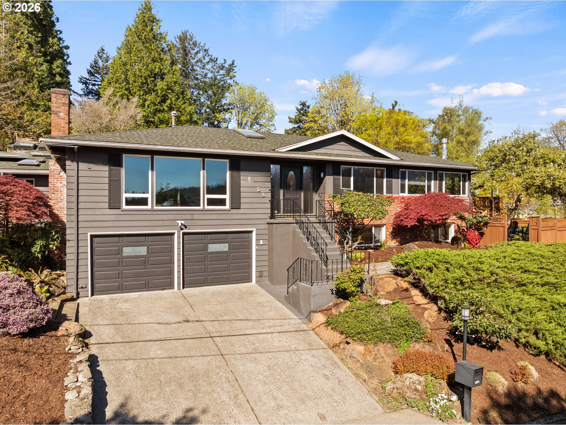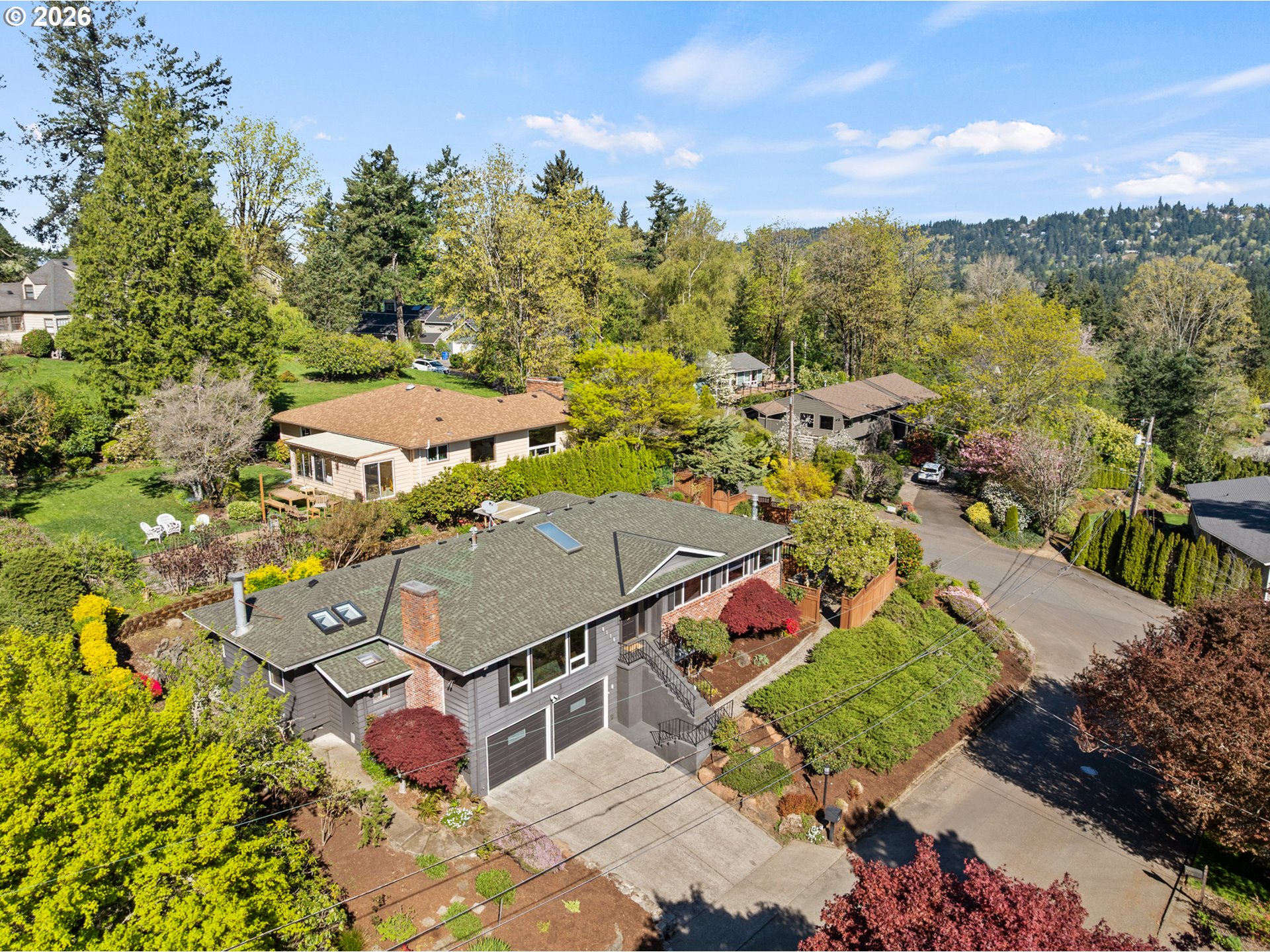 Perched on a prominent corner lot with sweeping views, this classic mid-century home is airy, inviting, and filled with natural light. The true showstopper is the fully fenced backyard, complete with a terraced pond, blueberries, strawberries, raspberries, plum trees, and ample sunny space for raised beds. Inside, the lower level provides exceptional flexibility with a full kitchen, living and dining areas, two bedrooms, a full bathroom, and a gas fireplace, perfect for guests, rental income, or multi-generational living. Upstairs the living room, anchored by a wood-burning fireplace, connects to the dining room, sunroom, kitchen, and den, creating an ideal layout for both everyday living and entertaining. The primary suite offers a peaceful retreat, complete with a gas fireplace, smart-control shades, and an updated walk-in closet. The recently renovated ensuite bathroom features new tile flooring, a large walk-in shower, and his-and-hers sinks. The sunroom opens to a wooden deck and is ideal as a den, office, or studio. Additional highlights include a large laundry room, abundant storage throughout, and a two-car garage equipped with an EV charger. Located in SW Portland’s Hayhurst neighborhood, just moments from Gabriel Park and close to popular dining and everyday conveniences, this is a home designed for comfort, flexibility, and lasting enjoyment.