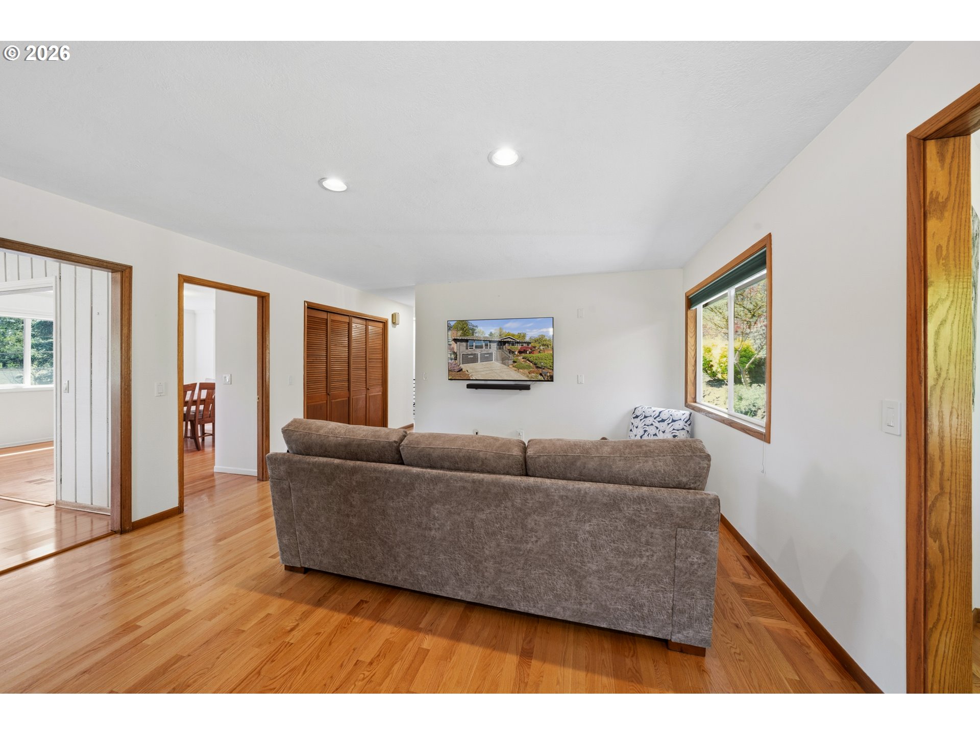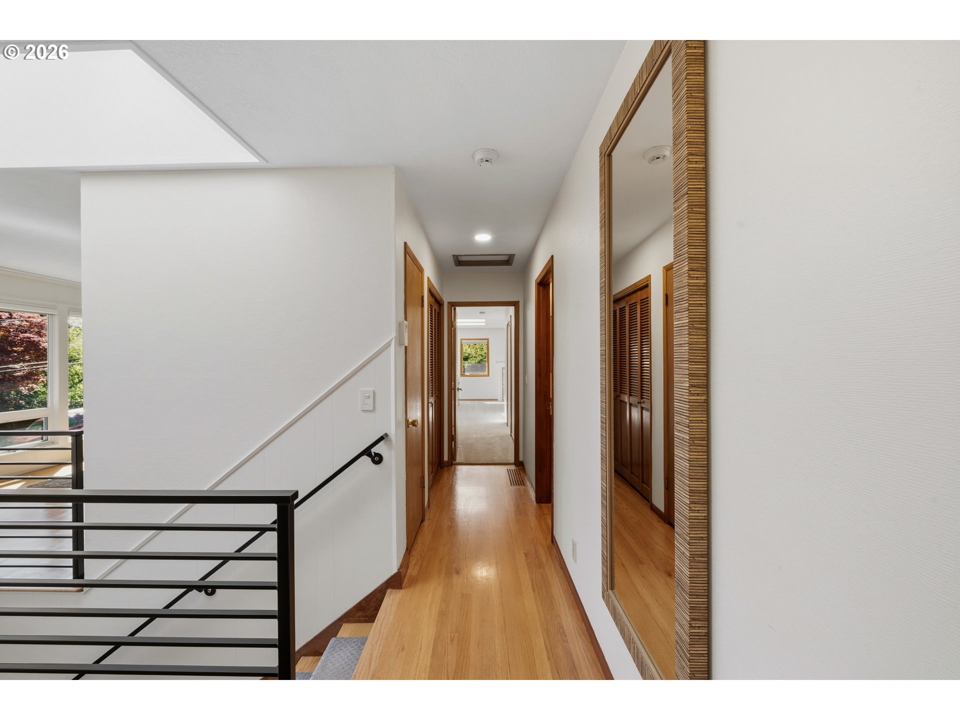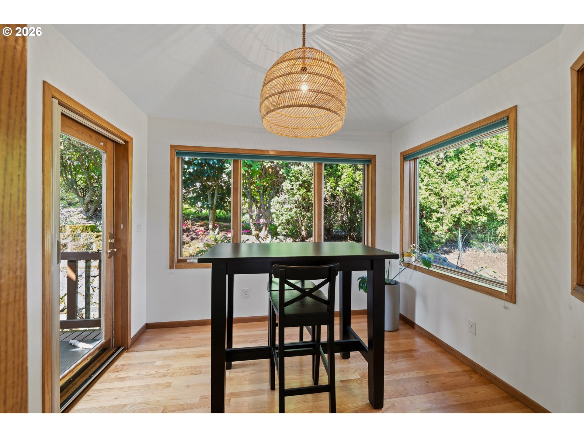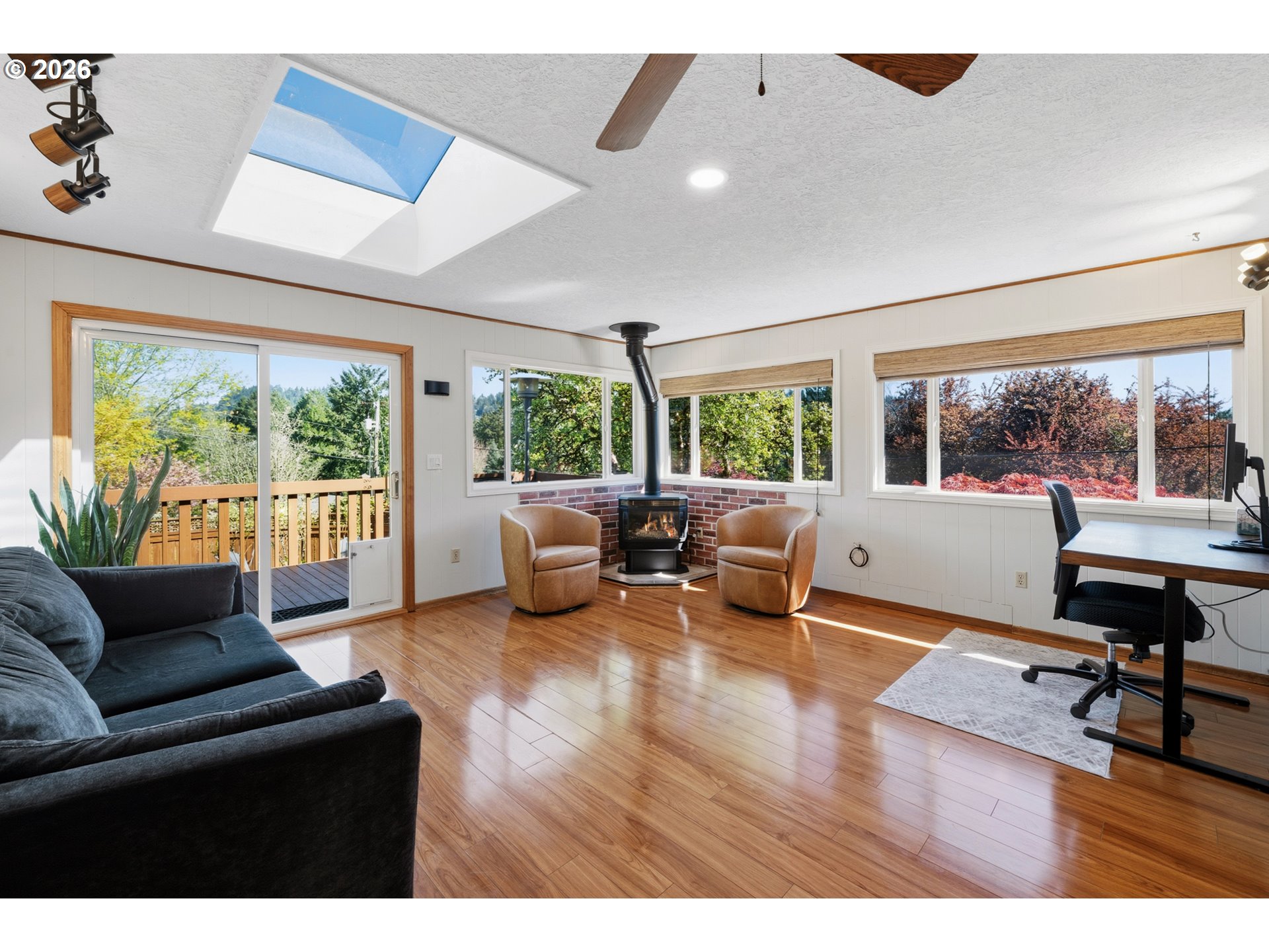 Perched on a prominent corner lot with sweeping views, this classic mid-century home is airy, inviting, and filled with natural light. The true showstopper is the fully fenced backyard, complete with a terraced pond, blueberries, strawberries, raspberries, plum trees, and ample sunny space for raised beds. Inside, the lower level provides exceptional flexibility with a full kitchen, living and dining areas, two bedrooms, a full bathroom, and a gas fireplace, perfect for guests, rental income, or multi-generational living. Upstairs the living room, anchored by a wood-burning fireplace, connects to the dining room, sunroom, kitchen, and den, creating an ideal layout for both everyday living and entertaining. The primary suite offers a peaceful retreat, complete with a gas fireplace, smart-control shades, and an updated walk-in closet. The recently renovated ensuite bathroom features new tile flooring, a large walk-in shower, and his-and-hers sinks. The sunroom opens to a wooden deck and is ideal as a den, office, or studio. Additional highlights include a large laundry room, abundant storage throughout, and a two-car garage equipped with an EV charger. Located in SW Portland’s Hayhurst neighborhood, just moments from Gabriel Park and close to popular dining and everyday conveniences, this is a home designed for comfort, flexibility, and lasting enjoyment.