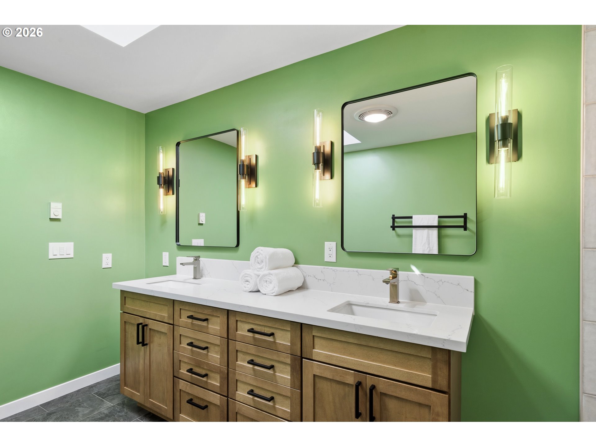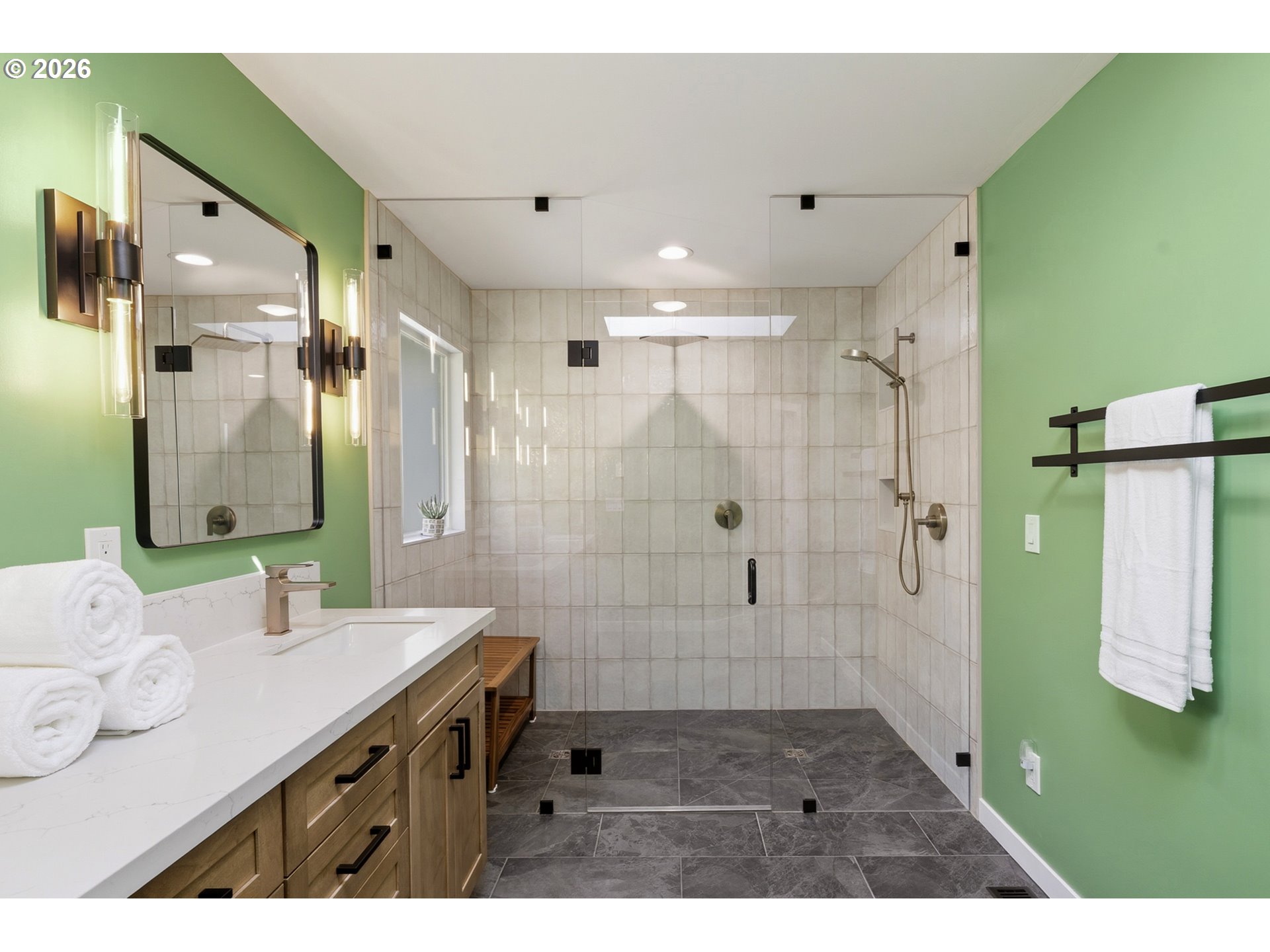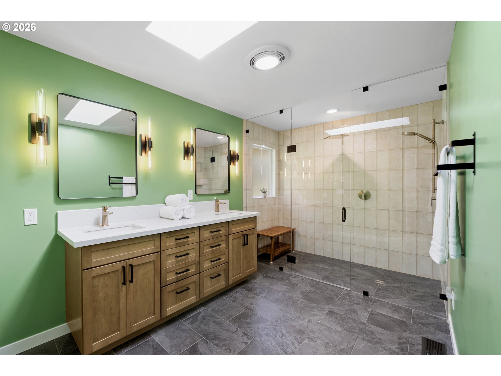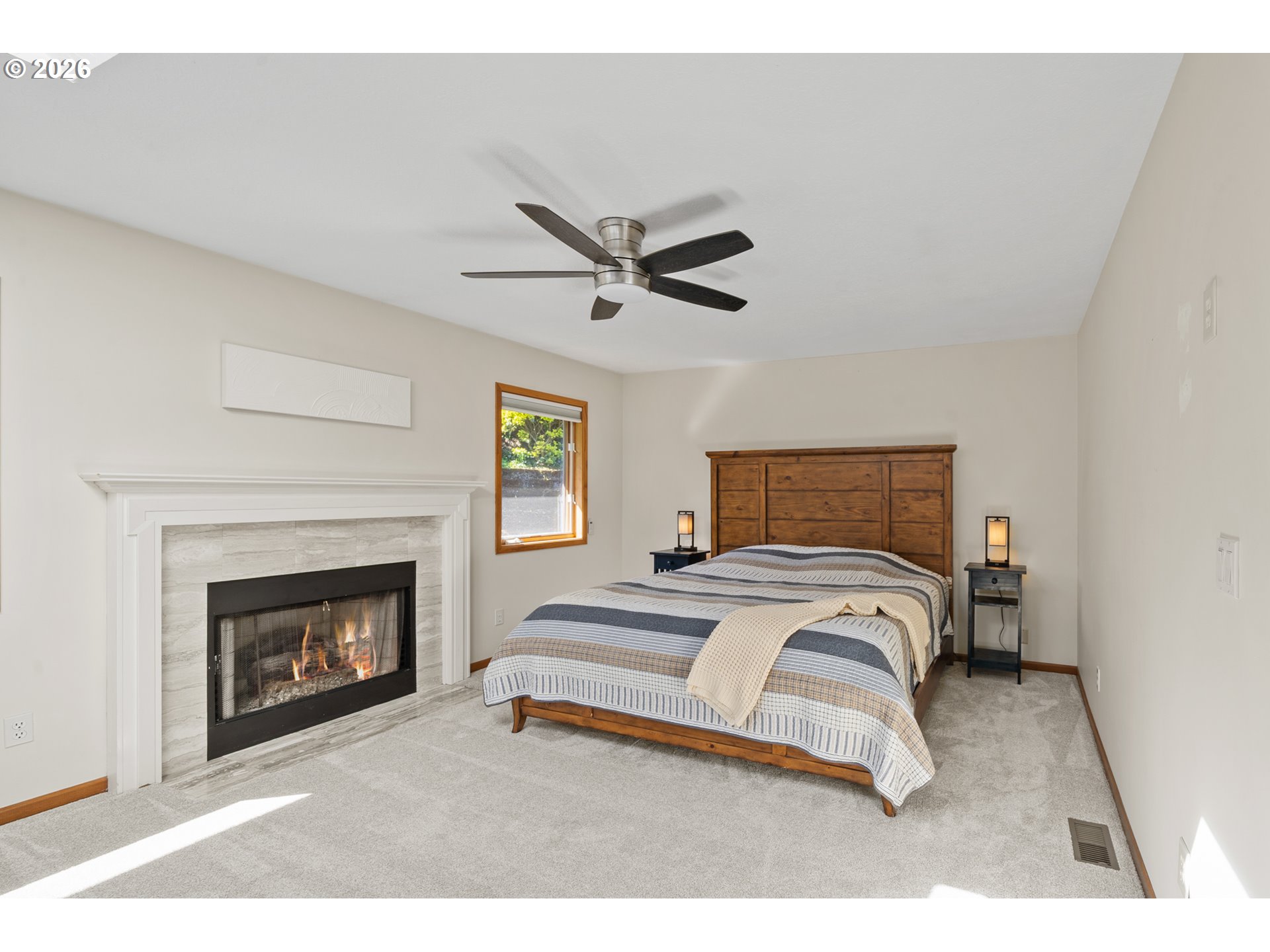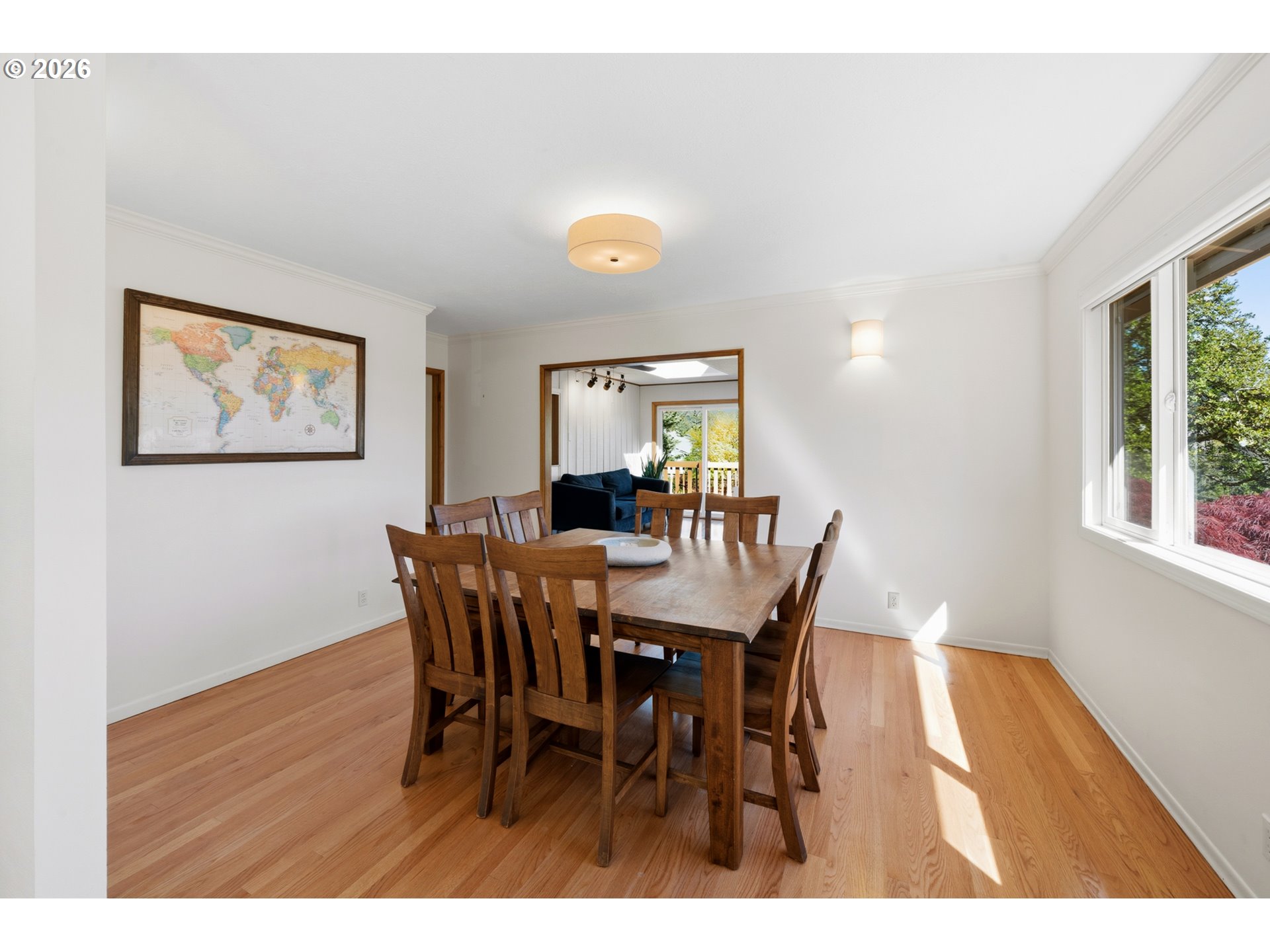 Perched on a prominent corner lot with sweeping views, this classic mid-century home is airy, inviting, and filled with natural light. The true showstopper is the fully fenced backyard, complete with a terraced pond, blueberries, strawberries, raspberries, plum trees, and ample sunny space for raised beds. Inside, the lower level provides exceptional flexibility with a full kitchen, living and dining areas, two bedrooms, a full bathroom, and a gas fireplace, perfect for guests, rental income, or multi-generational living. Upstairs the living room, anchored by a wood-burning fireplace, connects to the dining room, sunroom, kitchen, and den, creating an ideal layout for both everyday living and entertaining. The primary suite offers a peaceful retreat, complete with a gas fireplace, smart-control shades, and an updated walk-in closet. The recently renovated ensuite bathroom features new tile flooring, a large walk-in shower, and his-and-hers sinks. The sunroom opens to a wooden deck and is ideal as a den, office, or studio. Additional highlights include a large laundry room, abundant storage throughout, and a two-car garage equipped with an EV charger. Located in SW Portland’s Hayhurst neighborhood, just moments from Gabriel Park and close to popular dining and everyday conveniences, this is a home designed for comfort, flexibility, and lasting enjoyment.