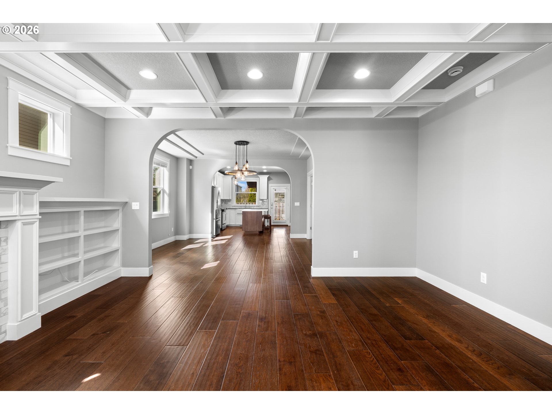 BeamedCeilings, Bookcases, BuiltinFeatures, Fireplace, HardwoodFloors, LivingRoomDiningRoomCombo