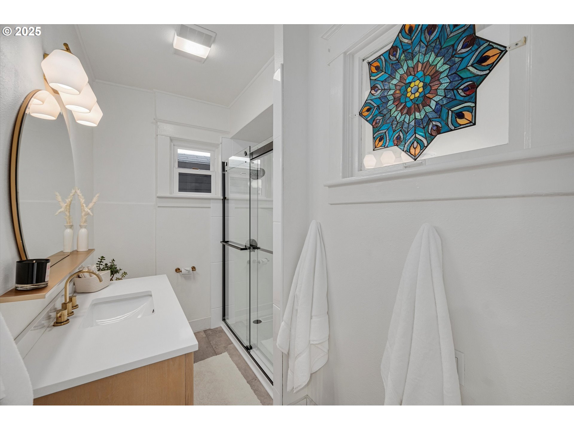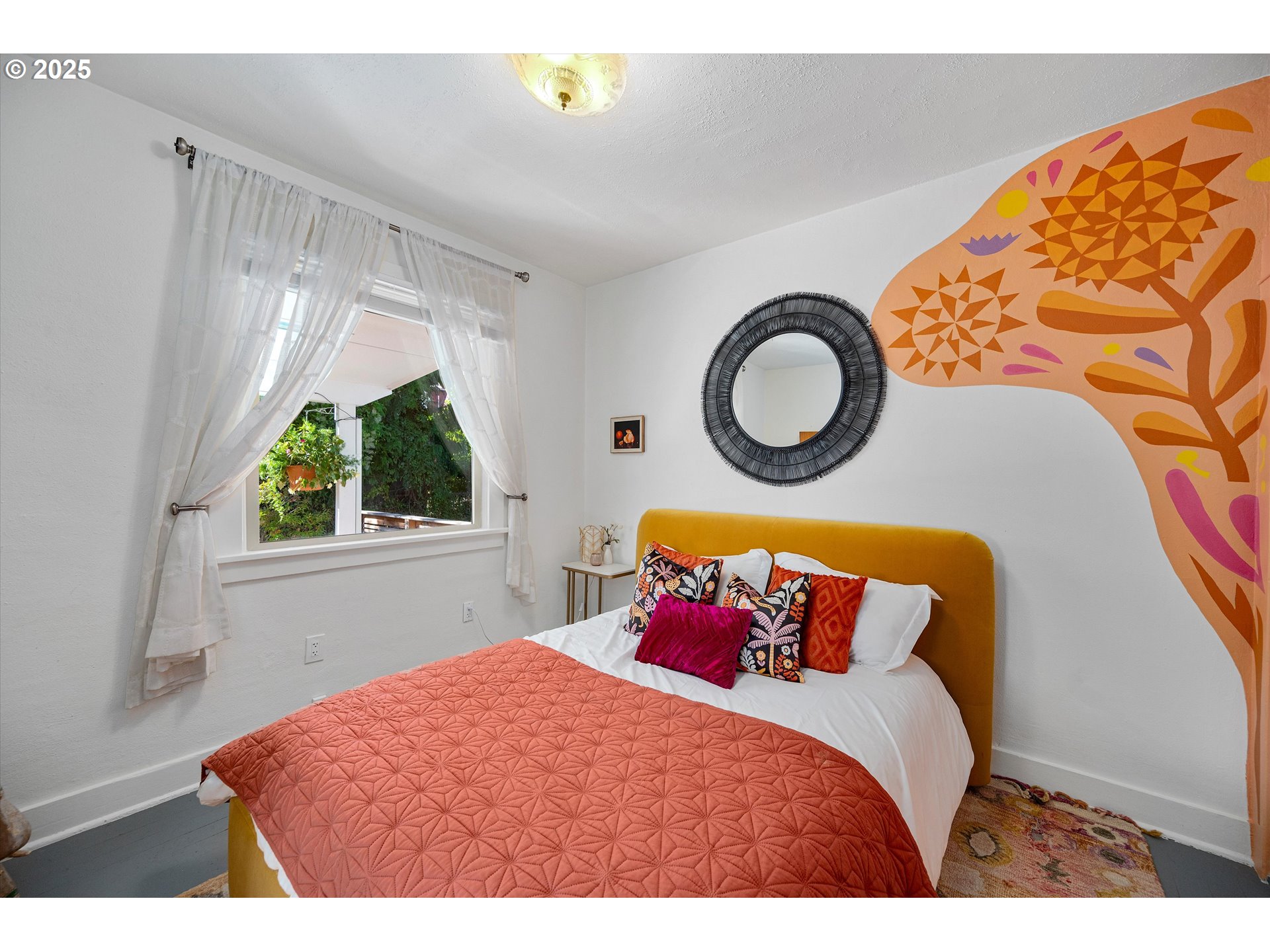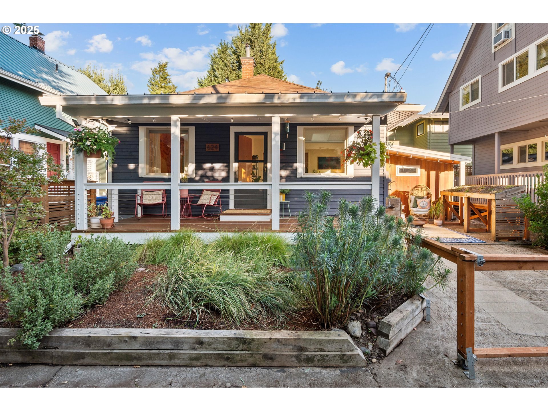 Hidden away on a quiet side street, this storybook Sunnyside cottage is a rare Portland find — just blocks to Belmont Street and Laurelhurst Park. Every detail of this home has been thoughtfully reimagined for modern living, with convenience, comfort, and an eye for design. Step inside to a light-filled living room with 8ft. ceilings, custom finishes, and open floorplan. The updated kitchen shines with quartz countertops, designer tile, and stainless appliances. Enjoy single-level living with three spacious bedrooms, two updated baths, and a large primary suite with a skylight illuminating a hand painted mural by Portland's own Lettie Jane Rennekamp. Custom mudroom adds style and storage, while a partially finished basement with 7ft ceiling offers additional living space, or an easy path to an ADU conversion. Sip your morning matcha or evening negroni on the covered all-season porch, surrounded by native drought tolerant landscaping. When its time to explore, you can head out to Por que' No, Kens Artisan Pizza or Stumptown Coffee within blocks. Updates include modernized kitchen and baths, newer composition roof, gutters, furnace & A/C, 200 Amp panel, and so much more. [Home Energy Score = 5. HES Report at https://rpt.greenbuildingregistry.com/hes/OR10108117]