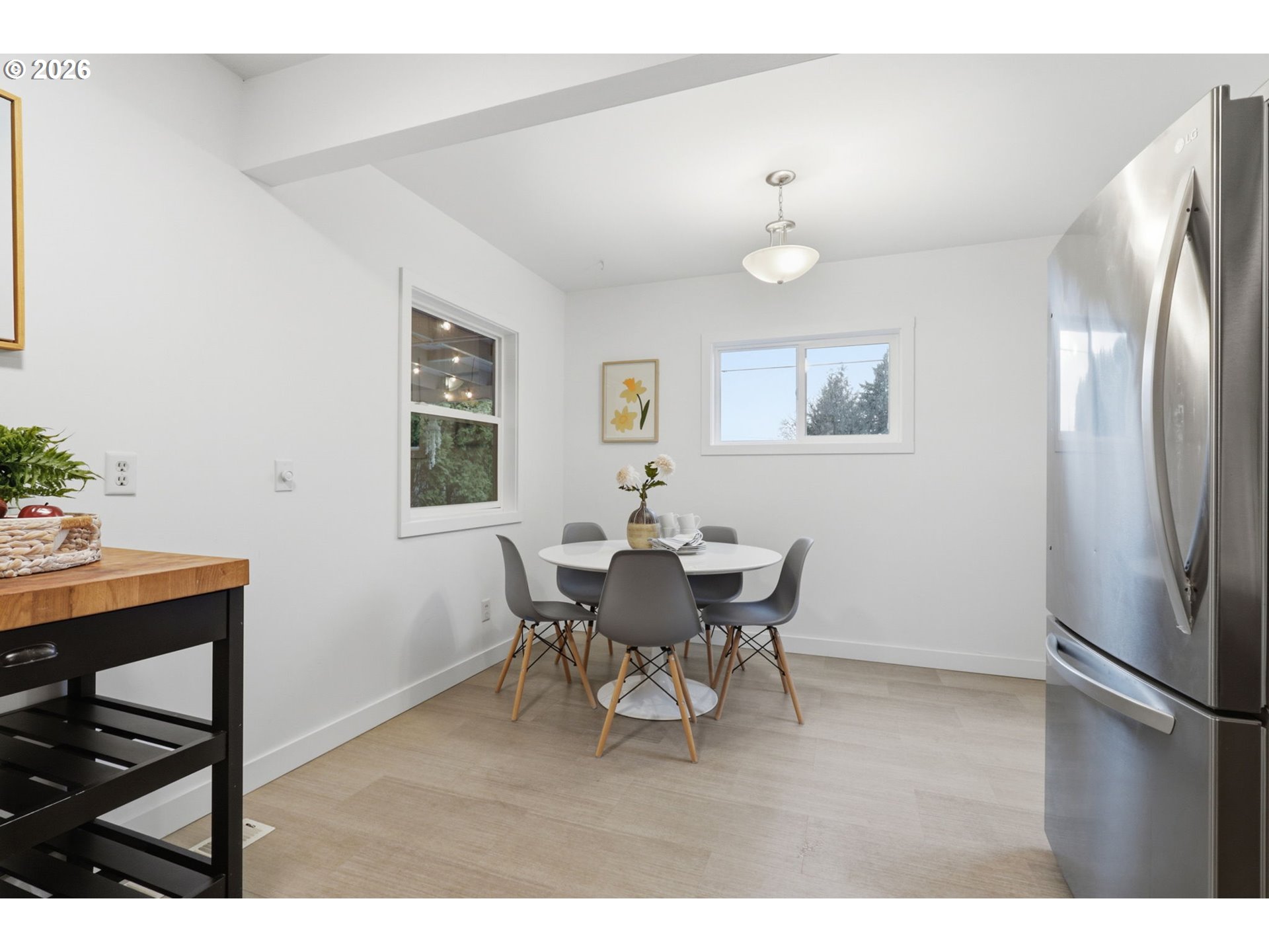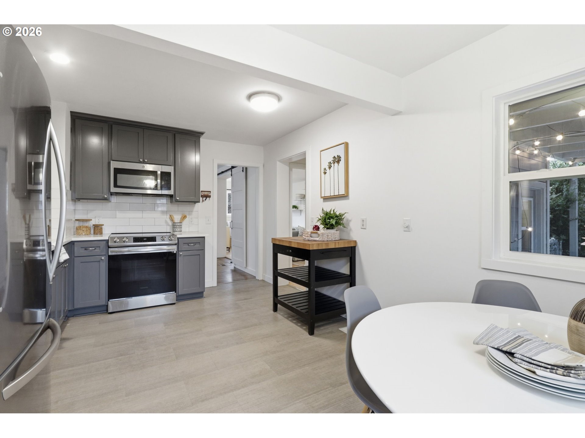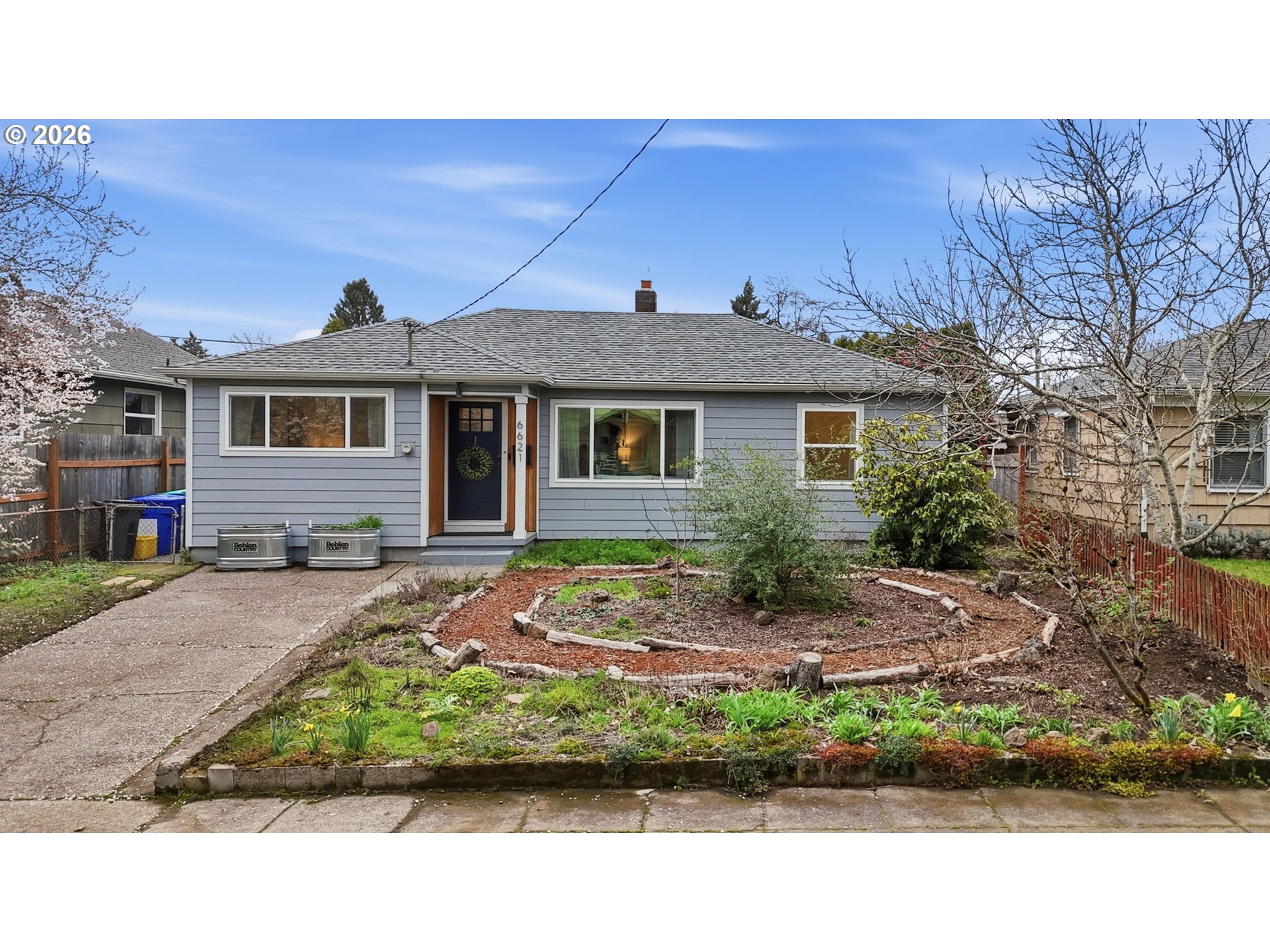 Beautifully updated four-bedroom, two-bath home just moments from the vibrant Woodstock District, one of Southeast Portland’s most beloved neighborhood hubs. Enjoy convenient access to local favorites including New Seasons Market, Grand Central Bakery, Otto’s Sausage Kitchen, Delta Café, Pizza Roma, Safeway, and a wide variety of restaurants, shops, and everyday amenities.Inside, the main level offers a warm and functional layout featuring hardwood floors, an updated kitchen with newer high-end appliances, and three bedrooms. One of the bedrooms opens to the living area and works beautifully as a flex space, home office, or additional living area. The main bathroom features a tile surround and bathtub/shower combination.The lower level includes a separate exterior entrance with keypad access, offering flexible living possibilities. This level features a bedroom with an en-suite bathroom, living area, and a kitchenette-style wet bar with sink and refrigerator. Laundry is located on this level and is shared with the main floor.A standout feature of the property is the large detached garage with heating and cooling via mini-split system, providing excellent potential for workshop, studio, creative space, or future possibilities. The garage is accessed from a private rear alley, offering convenience and privacy.This 6,000+ sq ft lot showcases a thoughtfully designed garden retreat, complete with raised planting beds and an efficient irrigation system that simplifies seasonal watering. A covered patio creates a wonderful outdoor space for relaxing or entertaining.Additional upgrades include newer siding, updated HVAC system with advanced air filtration, tankless on-demand hot water heater, and newer appliances.With flexible living spaces, major system updates, and an unbeatable location near the heart of Woodstock, this property offers exceptional versatility and access to everything Southeast Portland has to offer.
