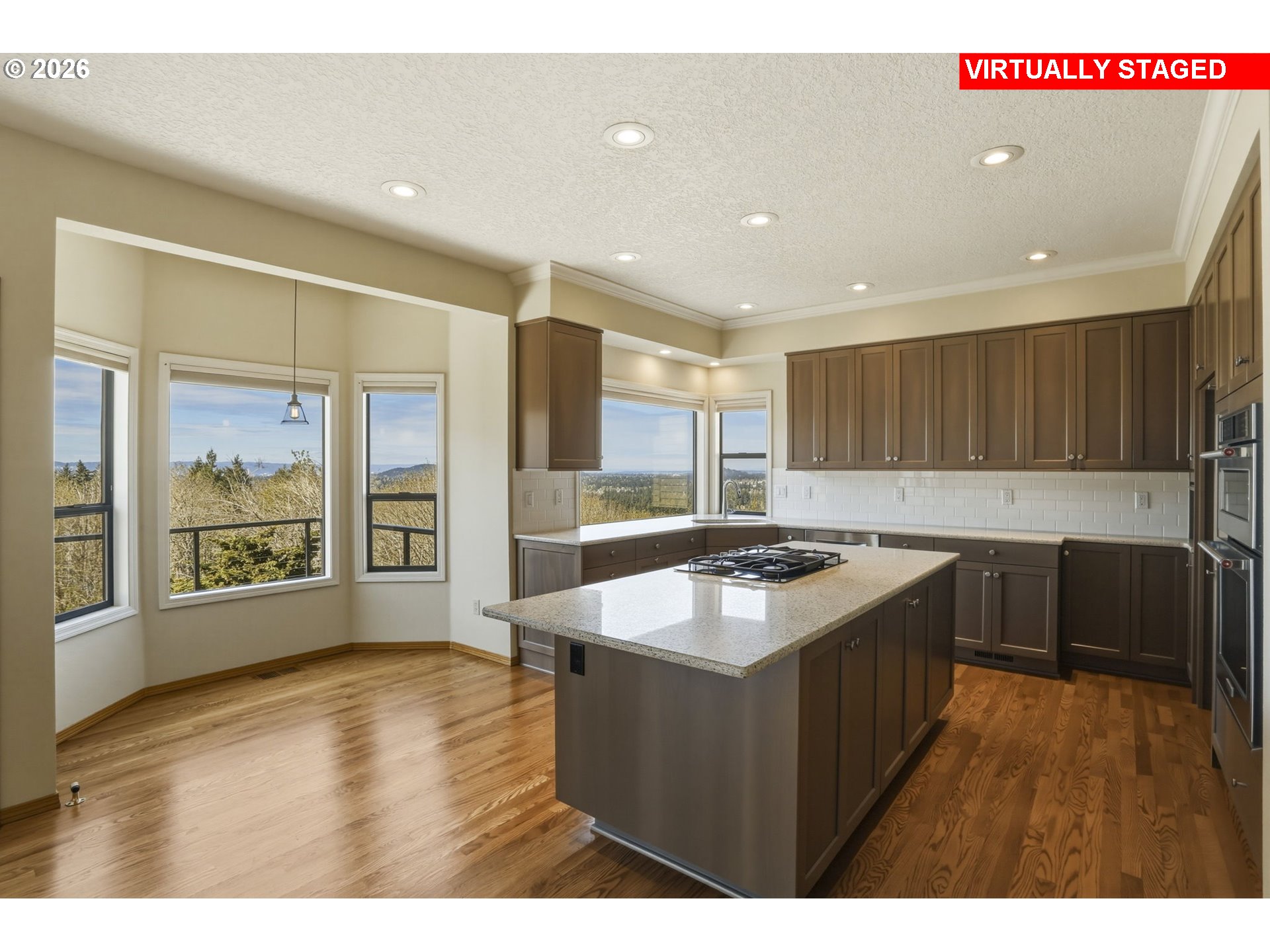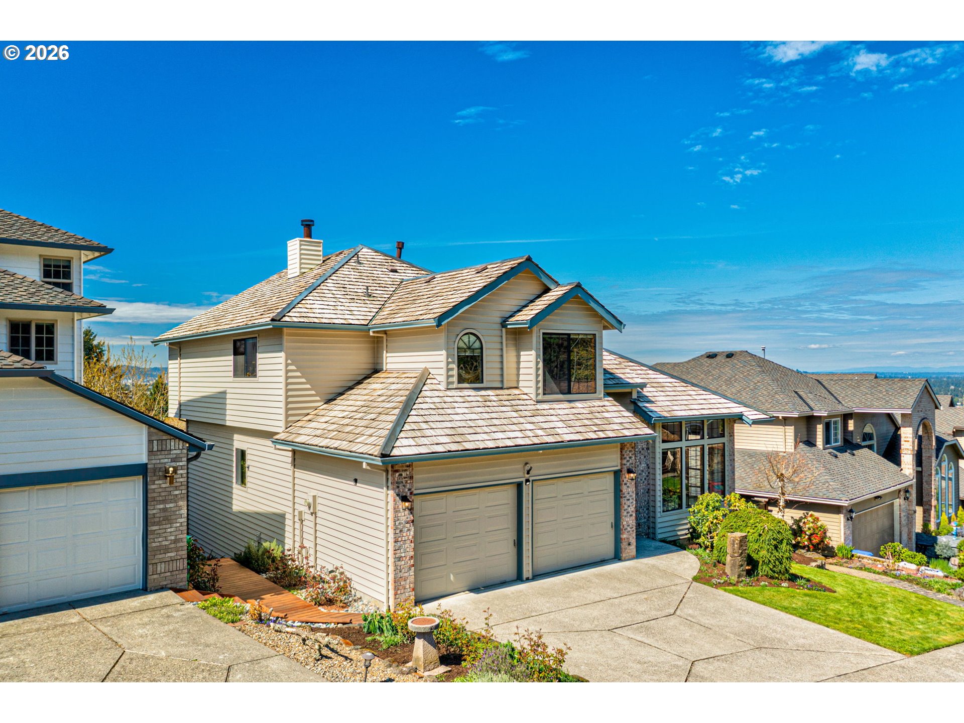 Step into a fresh-forward, three-level residence that feels as current as the skyline it overlooks. Built in 1990 and meticulously cared for, this contemporary home offers a main level that showcases rich red-oak flooring that runs through the open-concept kitchen, family room and hallways, creating a seamless flow of warm, natural texture. From the kitchen’s expansive windows, the city’s silhouette stretches out, offering a daily backdrop of twinkling lights that also frames the family room and the primary suite, where the master bedroom and its luxurious bathroom share those coveted urban vistas.Four generous bedrooms provide flexible space for a growing family, guests, or a dedicated studio, while three and a half thoughtfully designed bathrooms ensure comfort and privacy for all.The bright, daylight-filled basement has its own private entrance—perfect for multi-Gen families,a home office, or a quiet retreat. The home’s exterior tells its own story of quality craftsmanship: six-inch finger-jointed clear cedar siding wraps the structure, paired with a cedar-shake roof capped by hefty copper ridge caps that gleam in the sun and age gracefully over time. A separate living area on the lower level offers a self-contained space for entertaining, a hobby room, or a multigenerational setup without compromising the main living zones.Beyond the walls, the property continues to impress with abundant storage nooks for keep tools, seasonal items and everything in between neatly tucked away. Modern utilities run through the house with a PEX main water line and copper plumbing Step outside onto a newer cedar deck that looks over the backyard framed by cobblestones and basalt stepping stones, leading you to a striking fire-pit ringed with European-style Portland cobblestones—an ideal spot for evening gatherings.Backing to protected green space, you'll have ongoing privacy. And Sunsets that feel like a private performance.