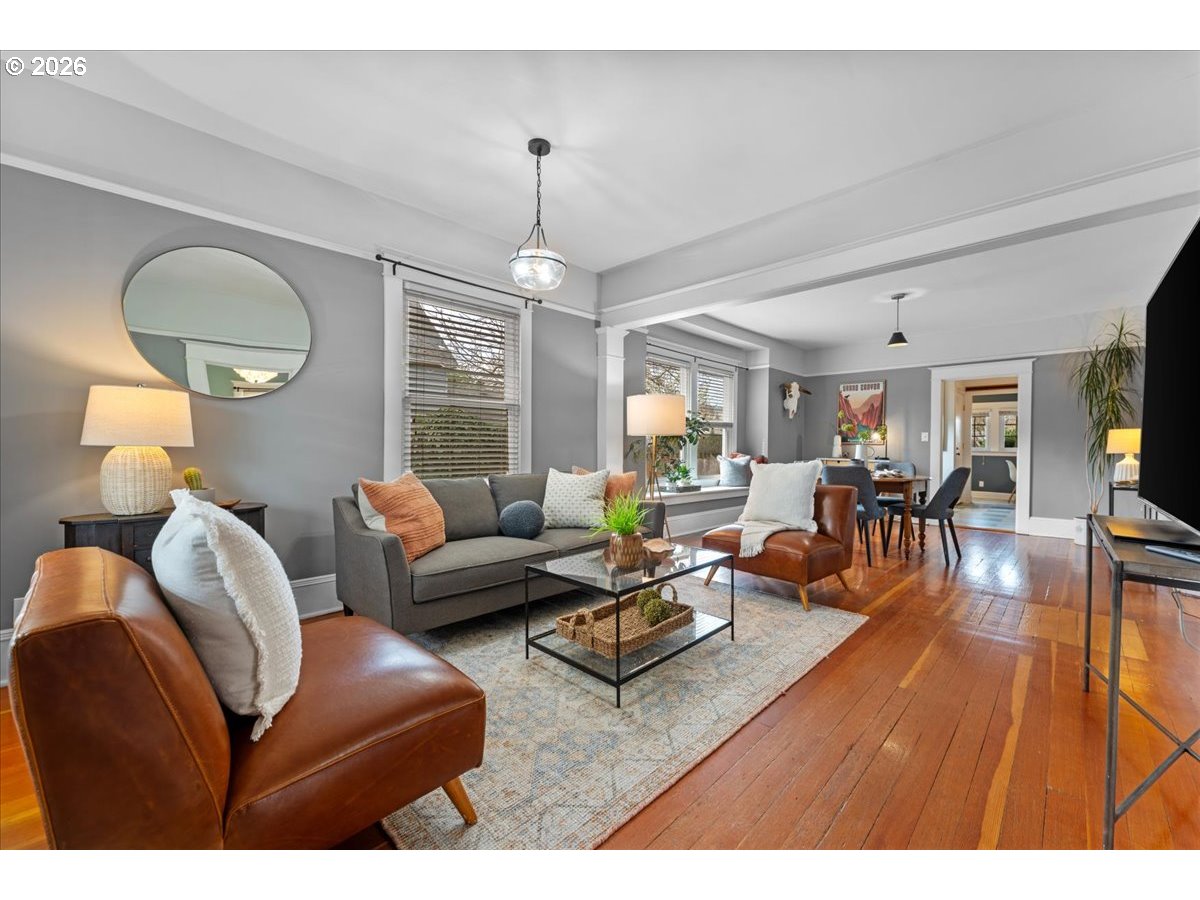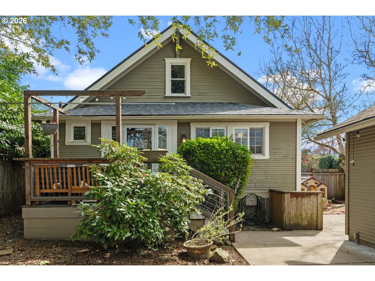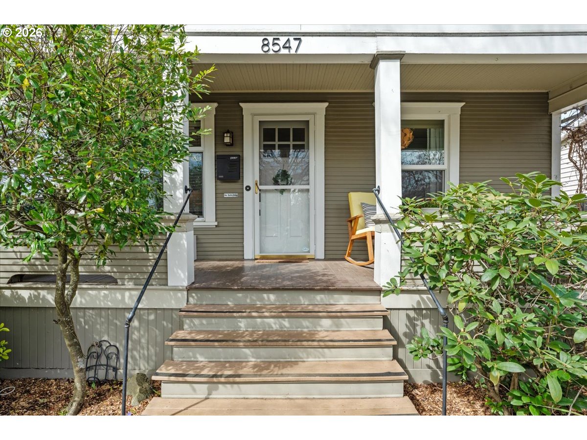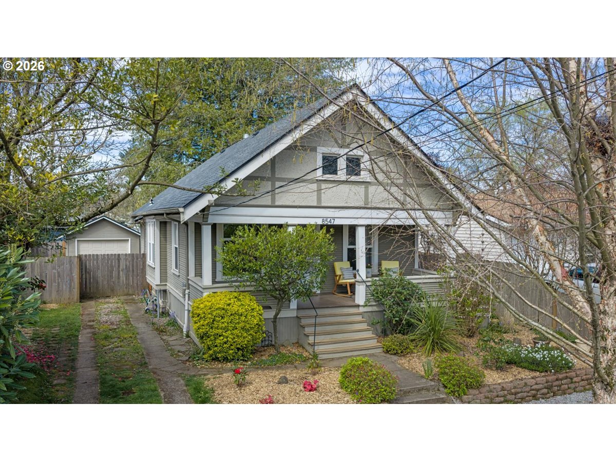 Storybook Craftsman with a welcoming front porch, a backyard designed for entertaining, and light-filled spaces that feel larger than expected. This 1911 bungalow blends timeless character with thoughtful updates in the heart of St. John's. A covered front porch sets the tone, leading into a bright, open living and dining space featuring original hardwood floors, classic millwork, and large windows that fill the home with natural light. The updated kitchen offers butcher block and solid surface counters, tile backsplash, gas range, and generous storage, along with an adjacent flex space ideal for a home office or additional prep area. Two well-sized bedrooms and an updated bathroom provide comfortable main-level living. Step outside to a private backyard designed for both relaxation and entertaining, with a spacious patio, deck, and low-maintenance landscaping. Detached garage and long driveway offer ample off-street parking. Large unfinished basement provides excellent storage, workshop space, or future potential. Located near St. John's Park, schools, and neighborhood shops and dining, with convenient access to major routes. Key features include: brand new roof, central air, private fenced backyard, updated kitchen/bath, detached garage with long driveway, tons of storage space in basement