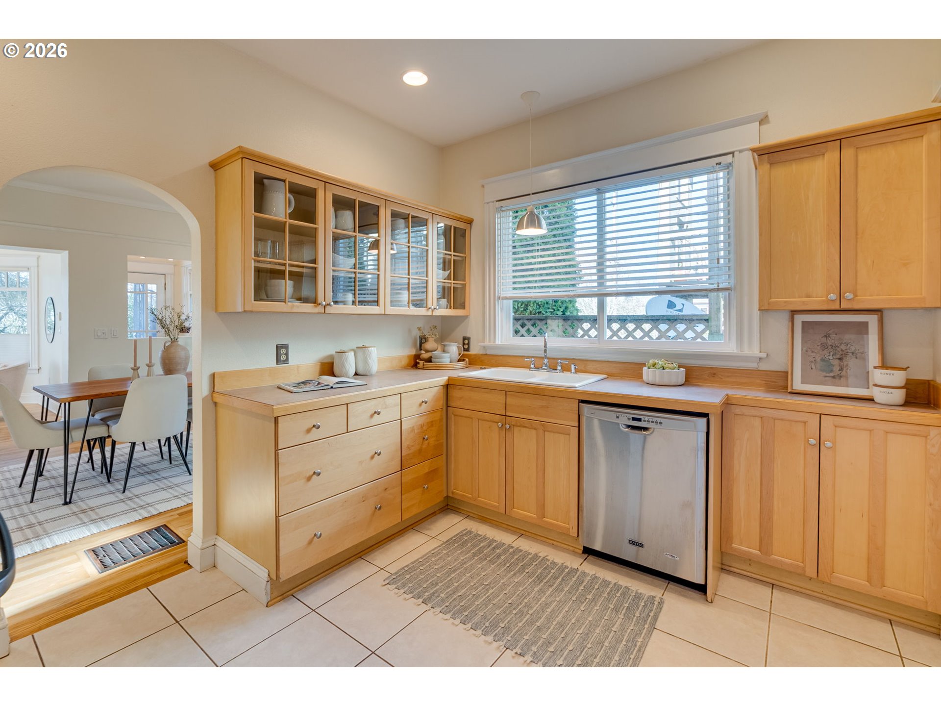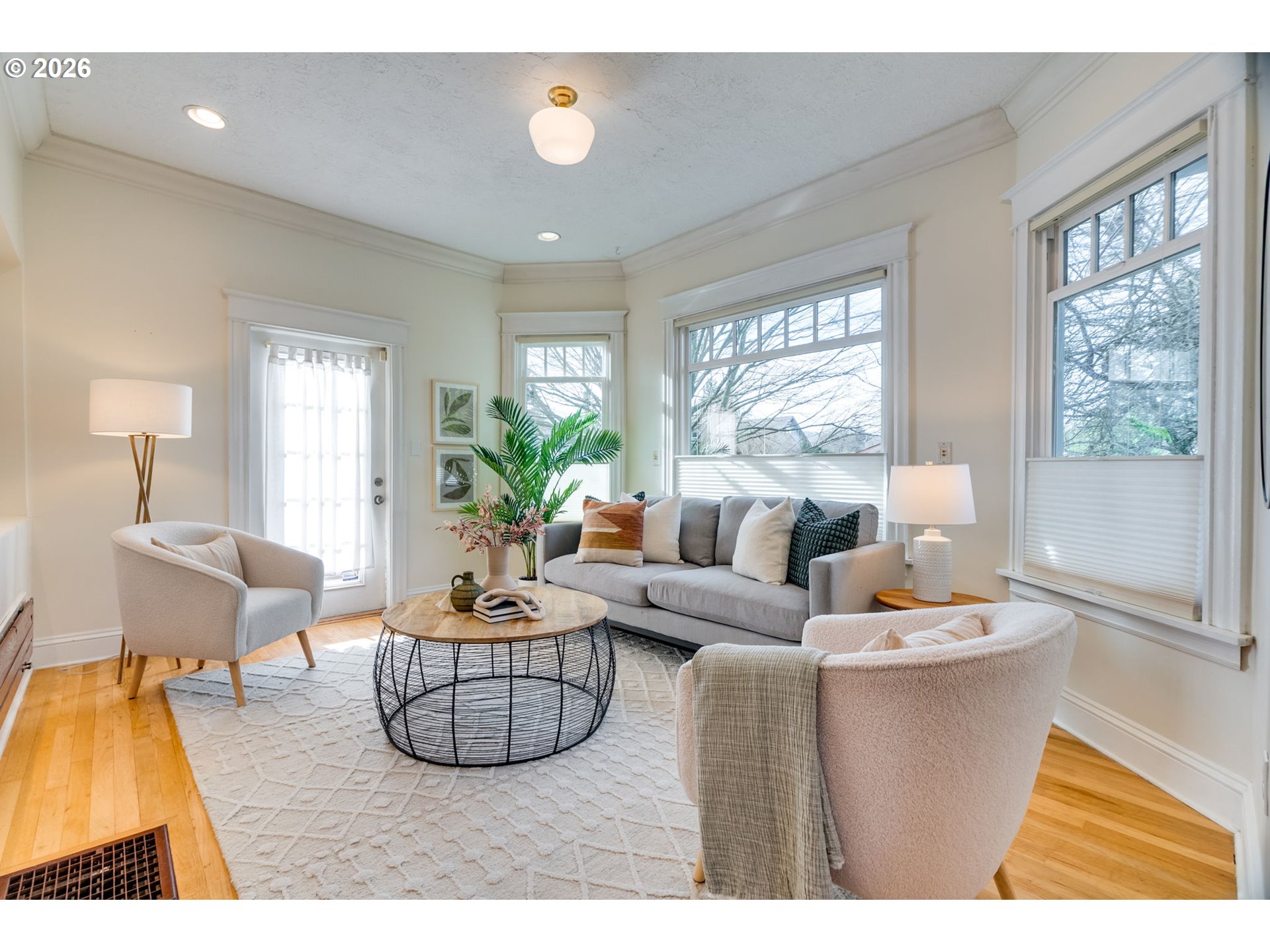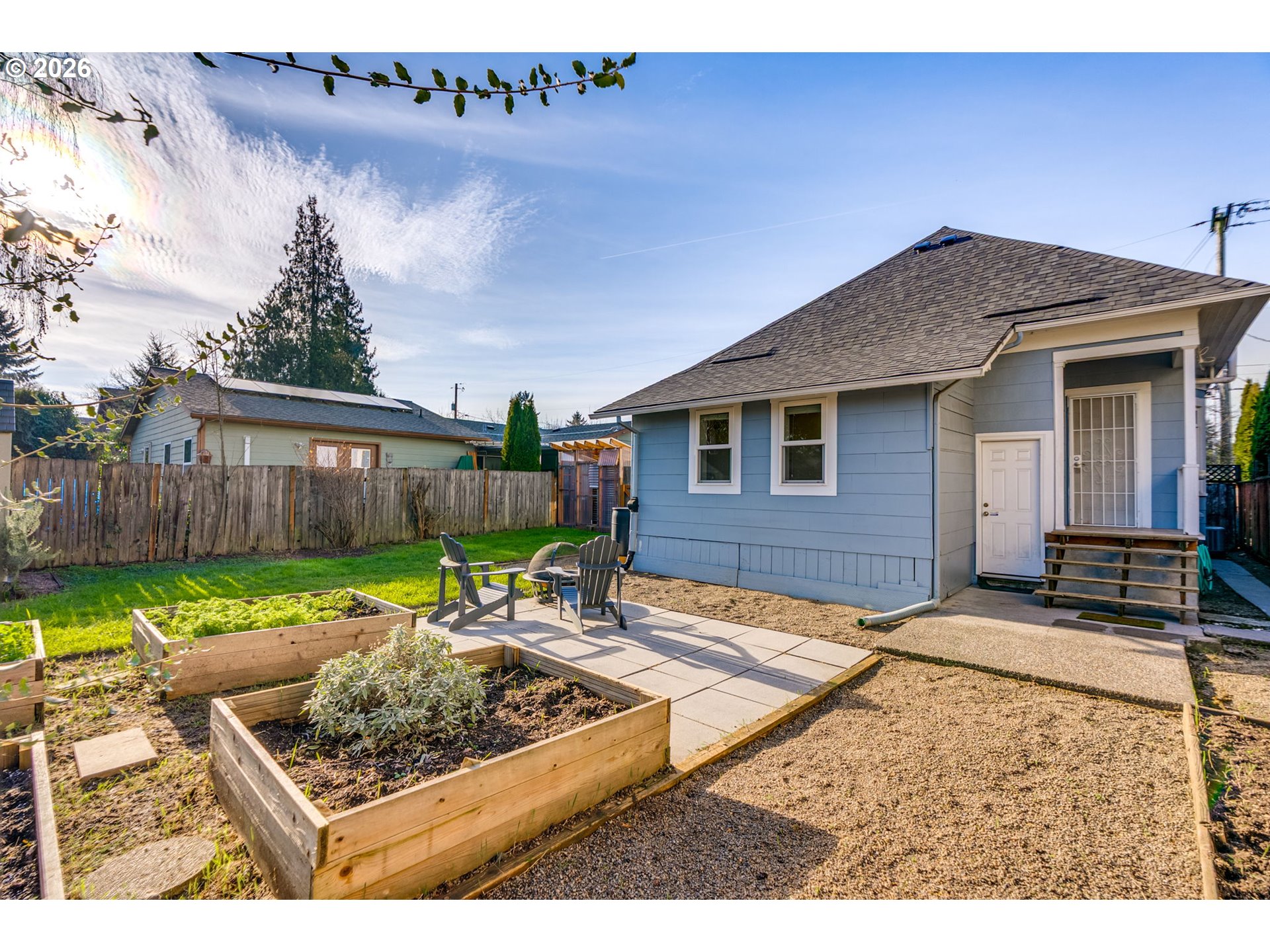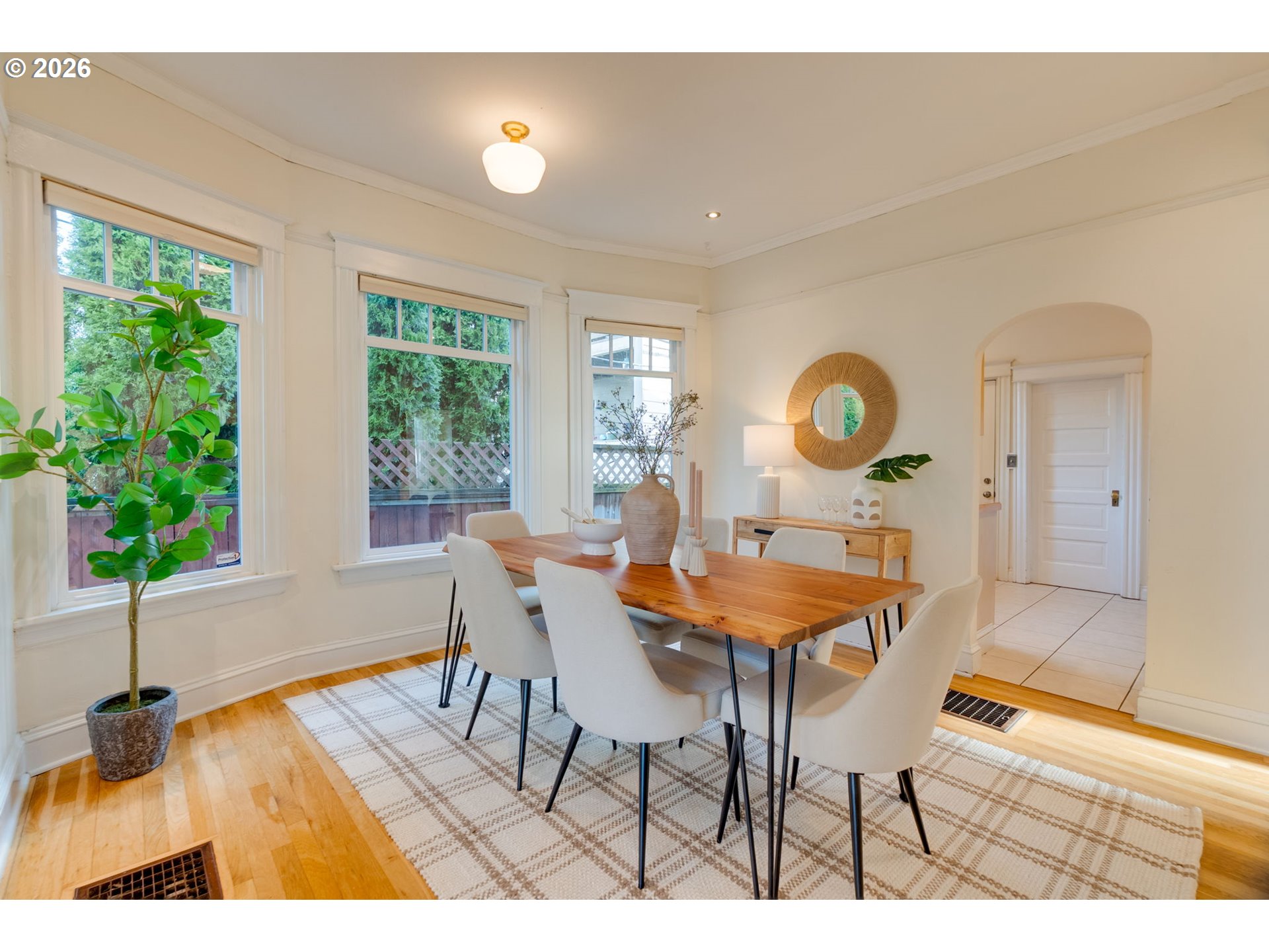 Welcome to this charming, updated, and cozy 1903 St. Johns home. A brick path framed by mature plantings guides you to the front porch, and a formal tiled entry invites you to hang your coat and stay a while. Warm wood floors, high ceilings, an exposed brick reveal, and a subtle architectural bay projection wall bring character to the living room, which also opens to a sunny south-facing deck that extends the living space. Filtered light through the mature maple tree out front is a delight through three seasons. Wood floors and original moulding continue throughout, with a large dining room featuring another bay projection wall. The connected floor plan balances openness with definition and allows for a lovely flow of natural light. The modernized kitchen offers ample counter space, glass cabinets, great storage, a double sink, and stainless steel appliances. The spacious primary bedroom includes a walk-in closet and direct access to the south-facing deck, and the updated bathroom is generous in size. The basement provides abundant storage and space for hobbies, while a roomy unfinished attic presents additional potential. Outside, enjoy a newer patio designed for summer dining, cozy fires, gardening, or simply lounging on sunny days, along with a recently tiled back porch. The raised beds are ready for your urban garden. Notable improvements include a brand new 2025 roof with transferable warranty, newer water heater, modern double-pane windows, and high-efficiency gas furnace with central AC for year-round comfort. Conveniently close to Pier Park, Forest Park access, St. Johns Farmers Market, downtown St. Johns, and multiple grocery options, this is an exceptionally walkable and nature-connected location.