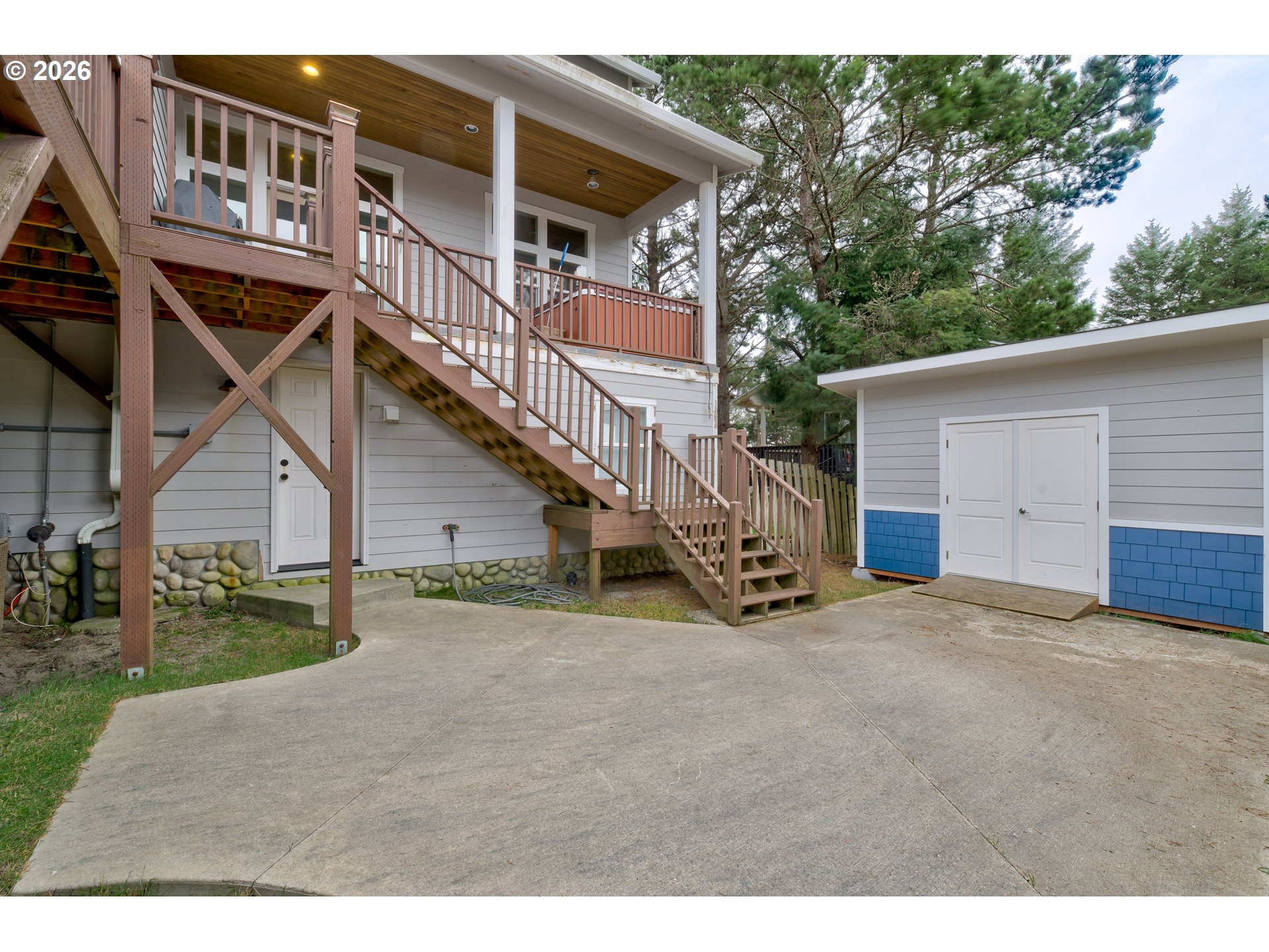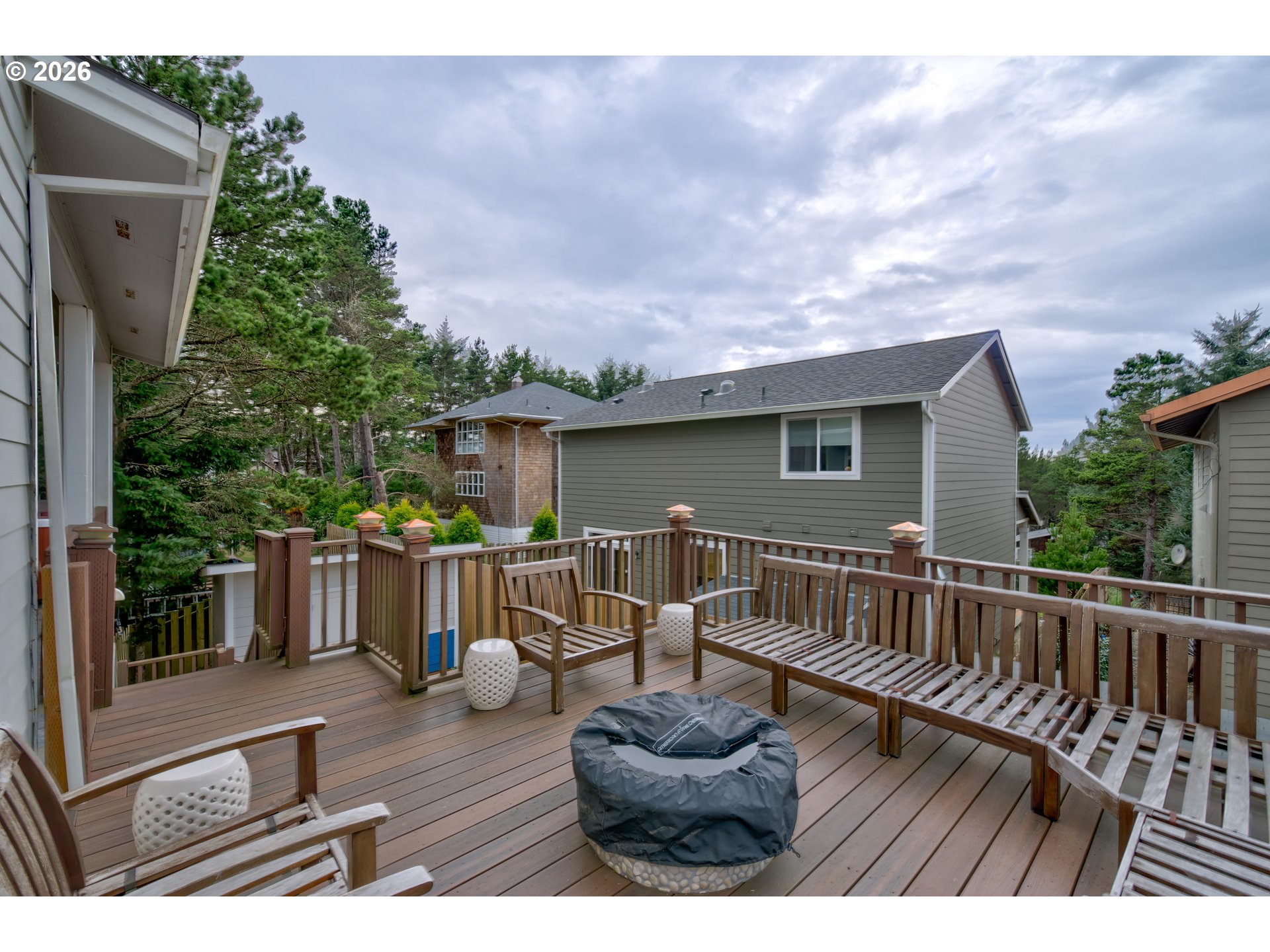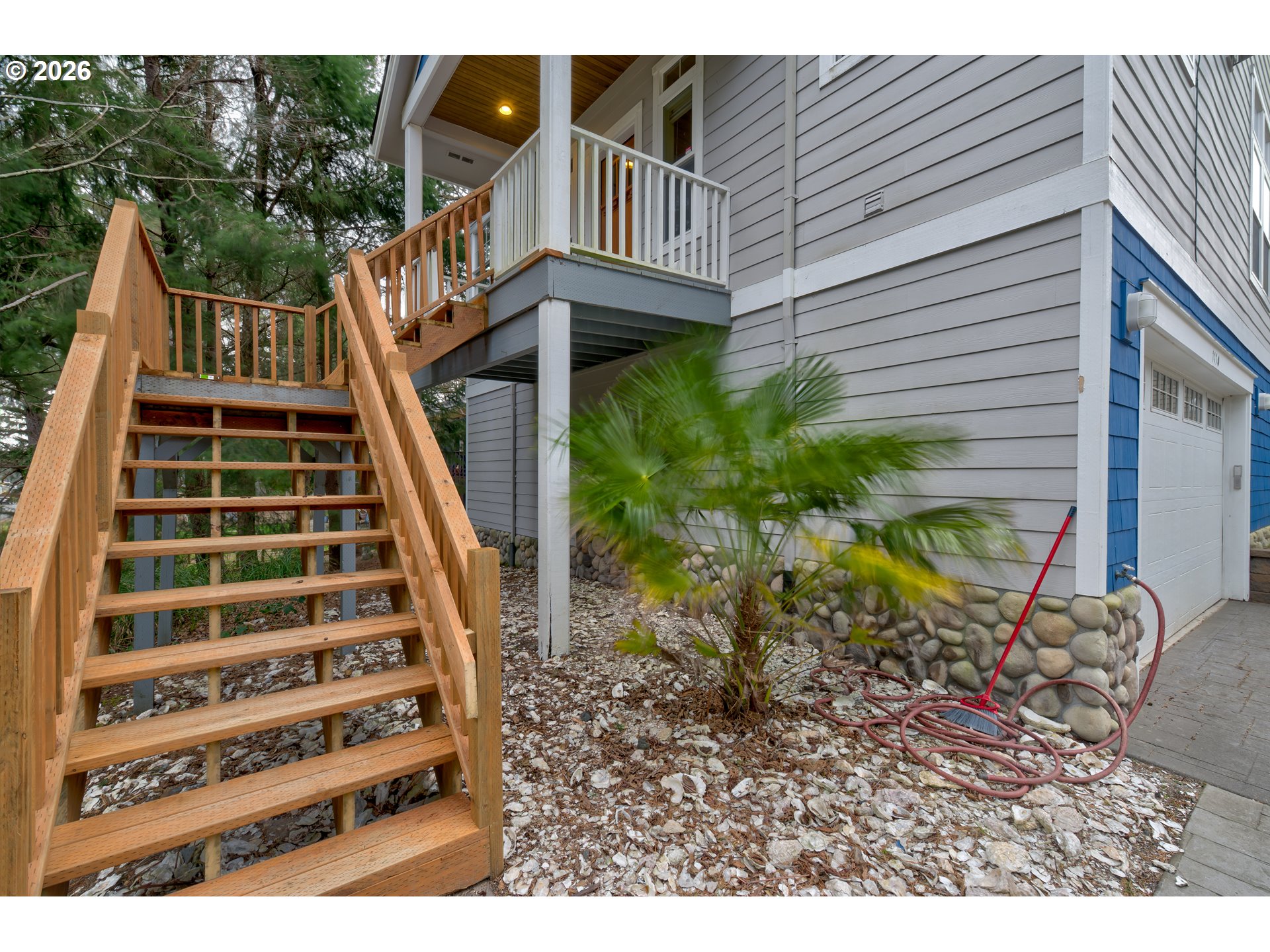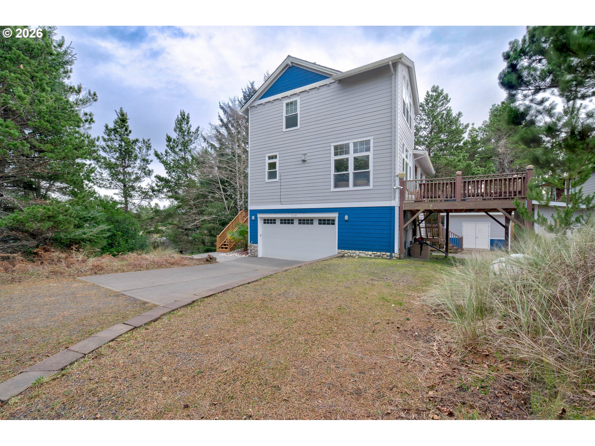Coastal tri-level home with peekaboo ocean views located just moments from the beach and close to town amenities. High ceilings and large windows with wood casing create a bright, open feel throughout the home, while multiple living areas provide flexibility across all three levels. The kitchen features granite tile countertops, stainless steel appliances, a gas range, built-in microwave, and an island with prep sink, along with direct access to a covered porch—ideal for enjoying the coastal setting. The living room offers warm character with wood built-ins, a natural stone–surround fireplace, ceiling fan, and comfortable carpeting. Upstairs, the primary suite features vaulted ceilings, ocean views, a ceiling fan, and an ensuite with walk-in shower. Two additional bedrooms and a full bathroom complete the upper level. The lower level includes an additional suite with coved ceiling, closet storage, carpet, and a private ensuite with walk-in shower—offering flexible living options. The spacious 24x25 garage features luxury vinyl plank flooring for added durability and usability. Outdoor spaces include a covered patio with freestanding hot tub and a large wood deck, creating multiple areas for relaxation and entertaining. Conveniently located near the shoreline and just minutes from local shops, dining, and everyday amenities, this coastal home offers a comfortable layout with ocean-view charm.