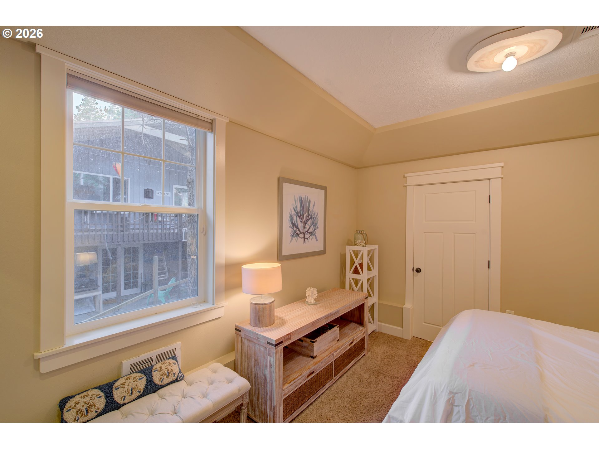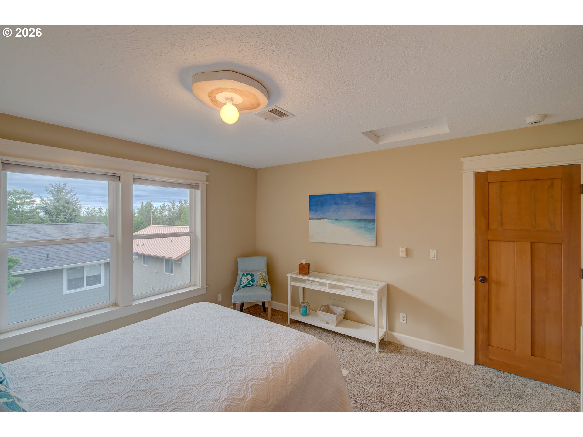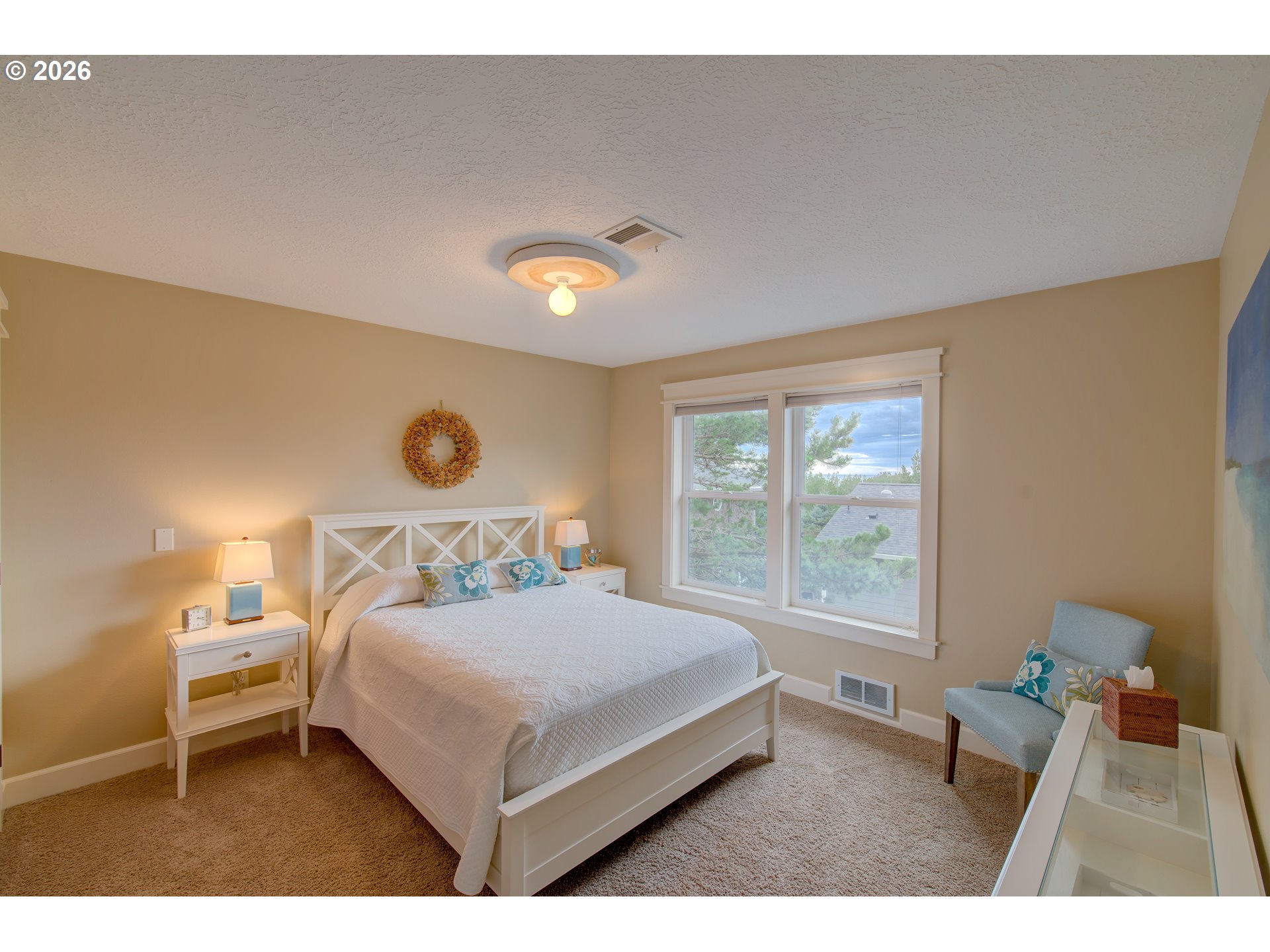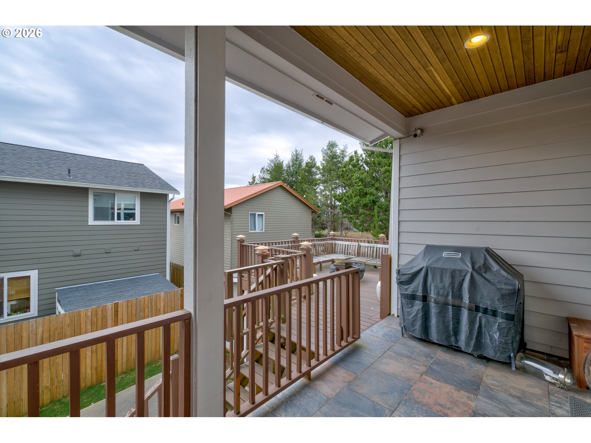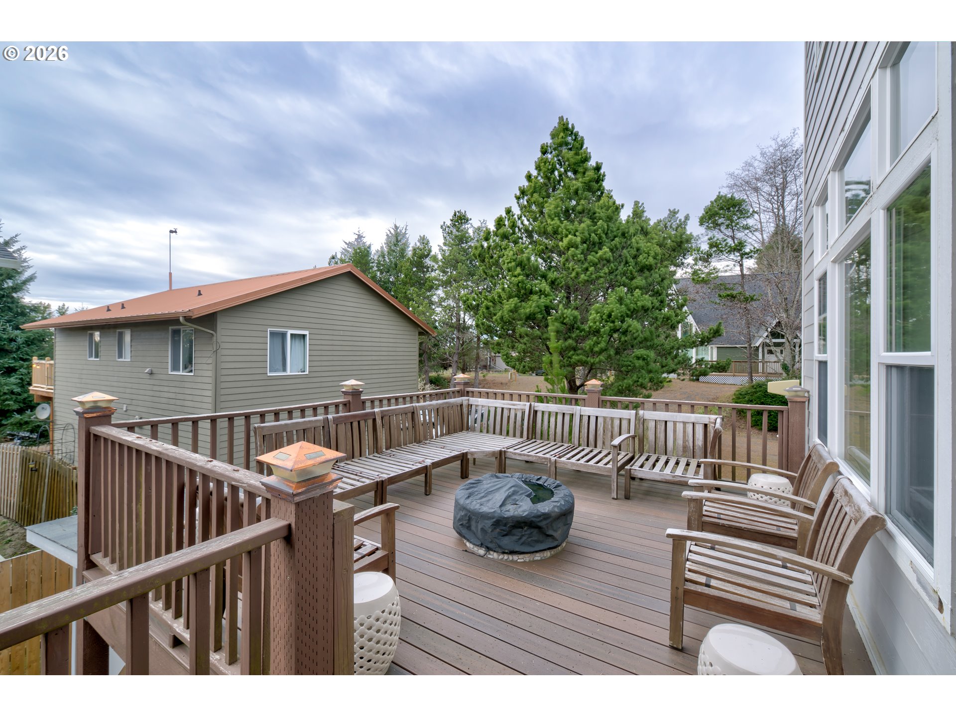 Coastal tri-level home with peekaboo ocean views located just moments from the beach and close to town amenities. High ceilings and large windows with wood casing create a bright, open feel throughout the home, while multiple living areas provide flexibility across all three levels. The kitchen features granite tile countertops, stainless steel appliances, a gas range, built-in microwave, and an island with prep sink, along with direct access to a covered porch—ideal for enjoying the coastal setting. The living room offers warm character with wood built-ins, a natural stone–surround fireplace, ceiling fan, and comfortable carpeting. Upstairs, the primary suite features vaulted ceilings, ocean views, a ceiling fan, and an ensuite with walk-in shower. Two additional bedrooms and a full bathroom complete the upper level. The lower level includes an additional suite with coved ceiling, closet storage, carpet, and a private ensuite with walk-in shower—offering flexible living options. The spacious 24x25 garage features luxury vinyl plank flooring for added durability and usability. Outdoor spaces include a covered patio with freestanding hot tub and a large wood deck, creating multiple areas for relaxation and entertaining. Conveniently located near the shoreline and just minutes from local shops, dining, and everyday amenities, this coastal home offers a comfortable layout with ocean-view charm.