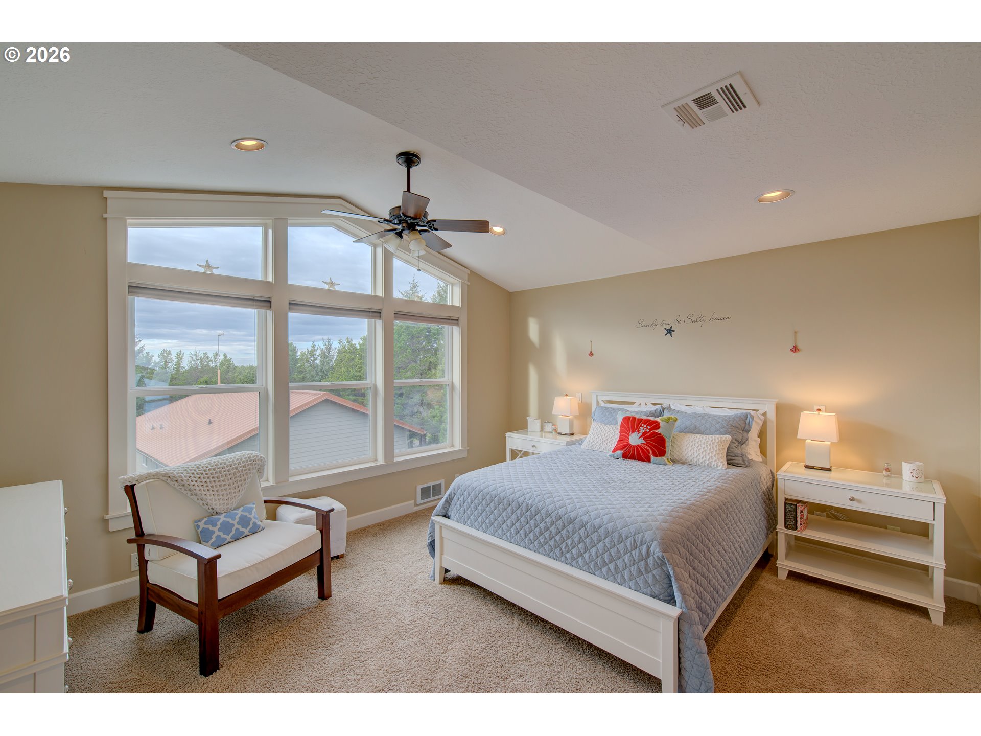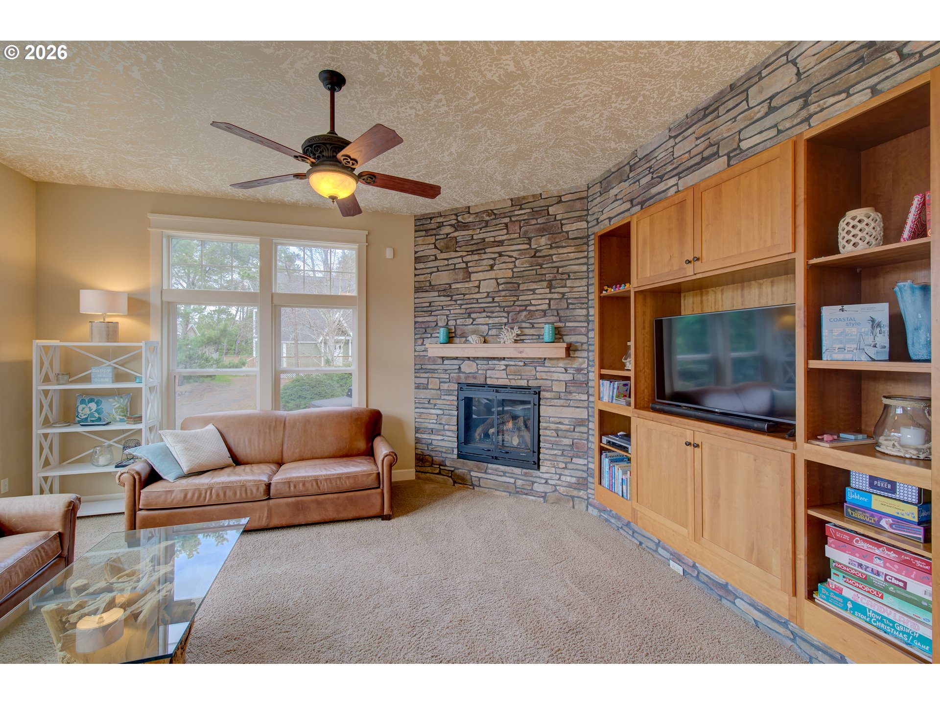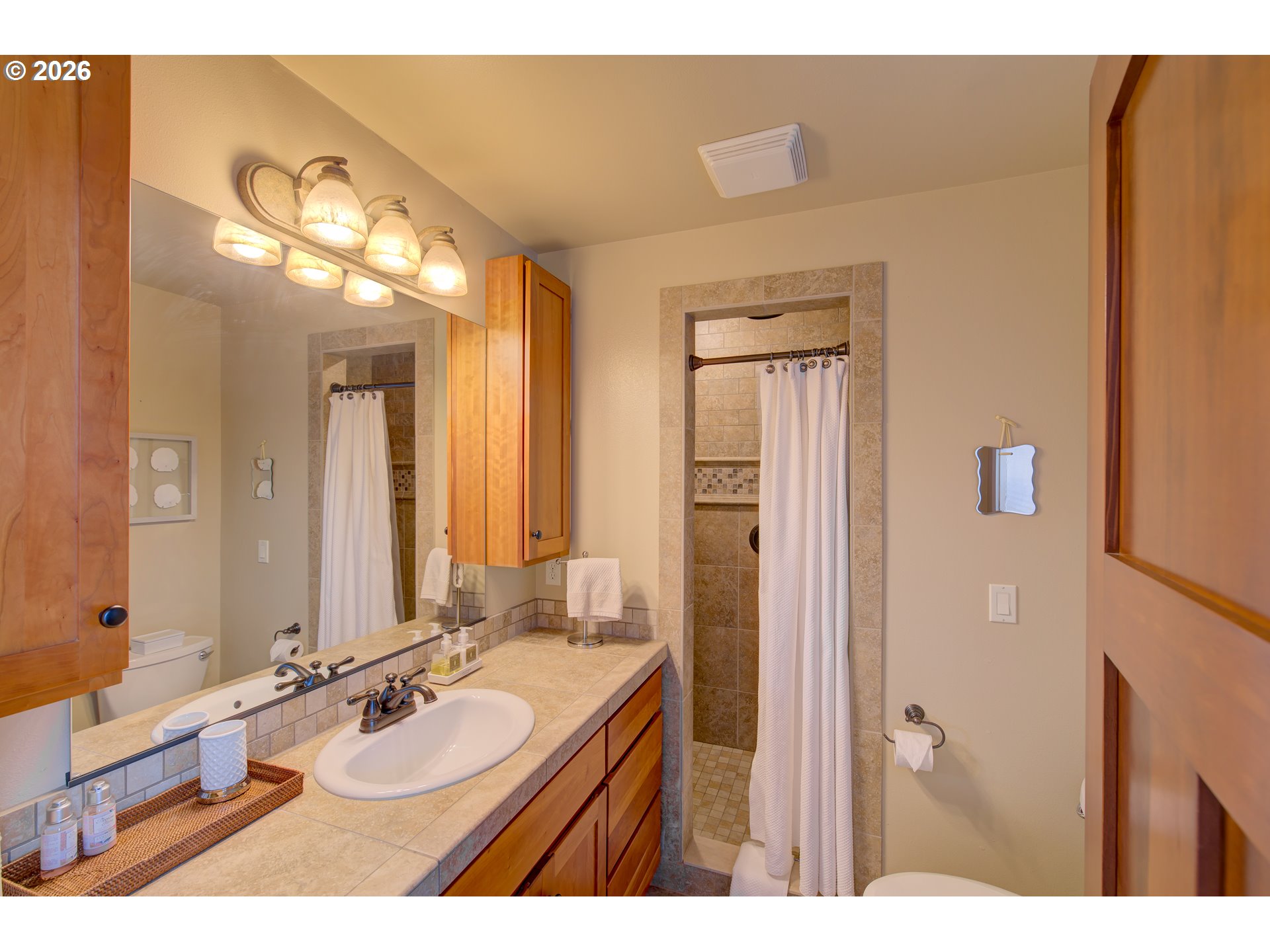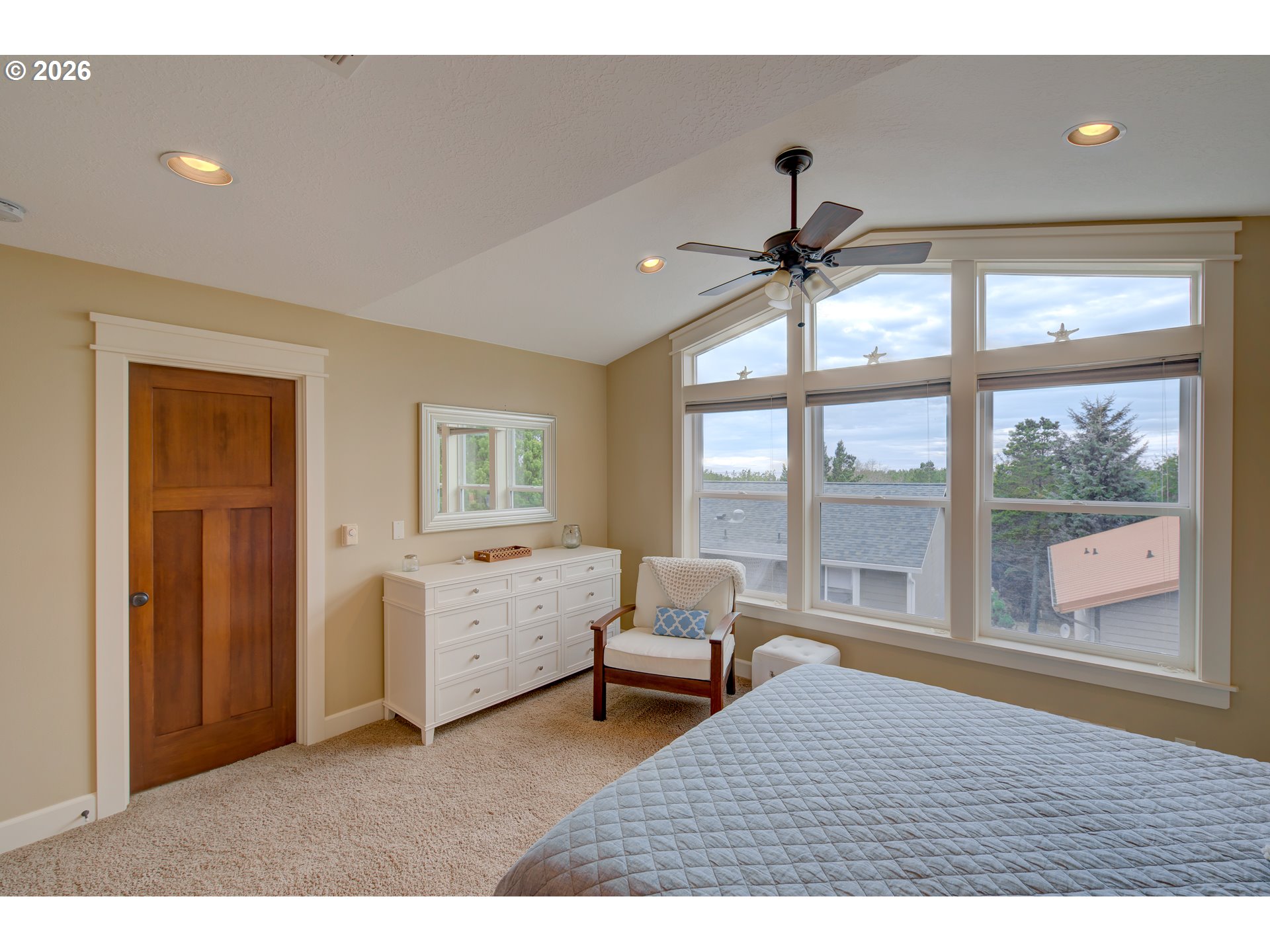 Coastal tri-level home with peekaboo ocean views located just moments from the beach and close to town amenities. High ceilings and large windows with wood casing create a bright, open feel throughout the home, while multiple living areas provide flexibility across all three levels. The kitchen features granite tile countertops, stainless steel appliances, a gas range, built-in microwave, and an island with prep sink, along with direct access to a covered porch—ideal for enjoying the coastal setting. The living room offers warm character with wood built-ins, a natural stone–surround fireplace, ceiling fan, and comfortable carpeting. Upstairs, the primary suite features vaulted ceilings, ocean views, a ceiling fan, and an ensuite with walk-in shower. Two additional bedrooms and a full bathroom complete the upper level. The lower level includes an additional suite with coved ceiling, closet storage, carpet, and a private ensuite with walk-in shower—offering flexible living options. The spacious 24x25 garage features luxury vinyl plank flooring for added durability and usability. Outdoor spaces include a covered patio with freestanding hot tub and a large wood deck, creating multiple areas for relaxation and entertaining. Conveniently located near the shoreline and just minutes from local shops, dining, and everyday amenities, this coastal home offers a comfortable layout with ocean-view charm.