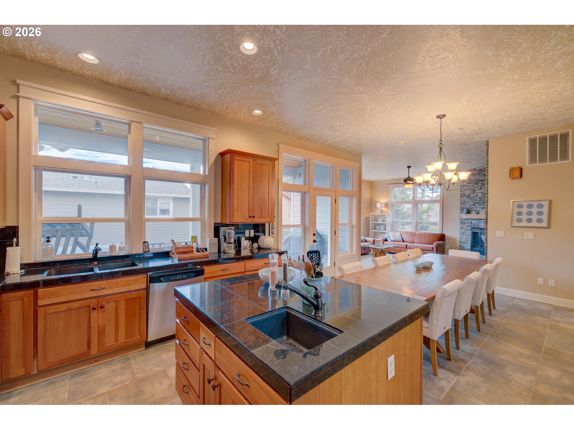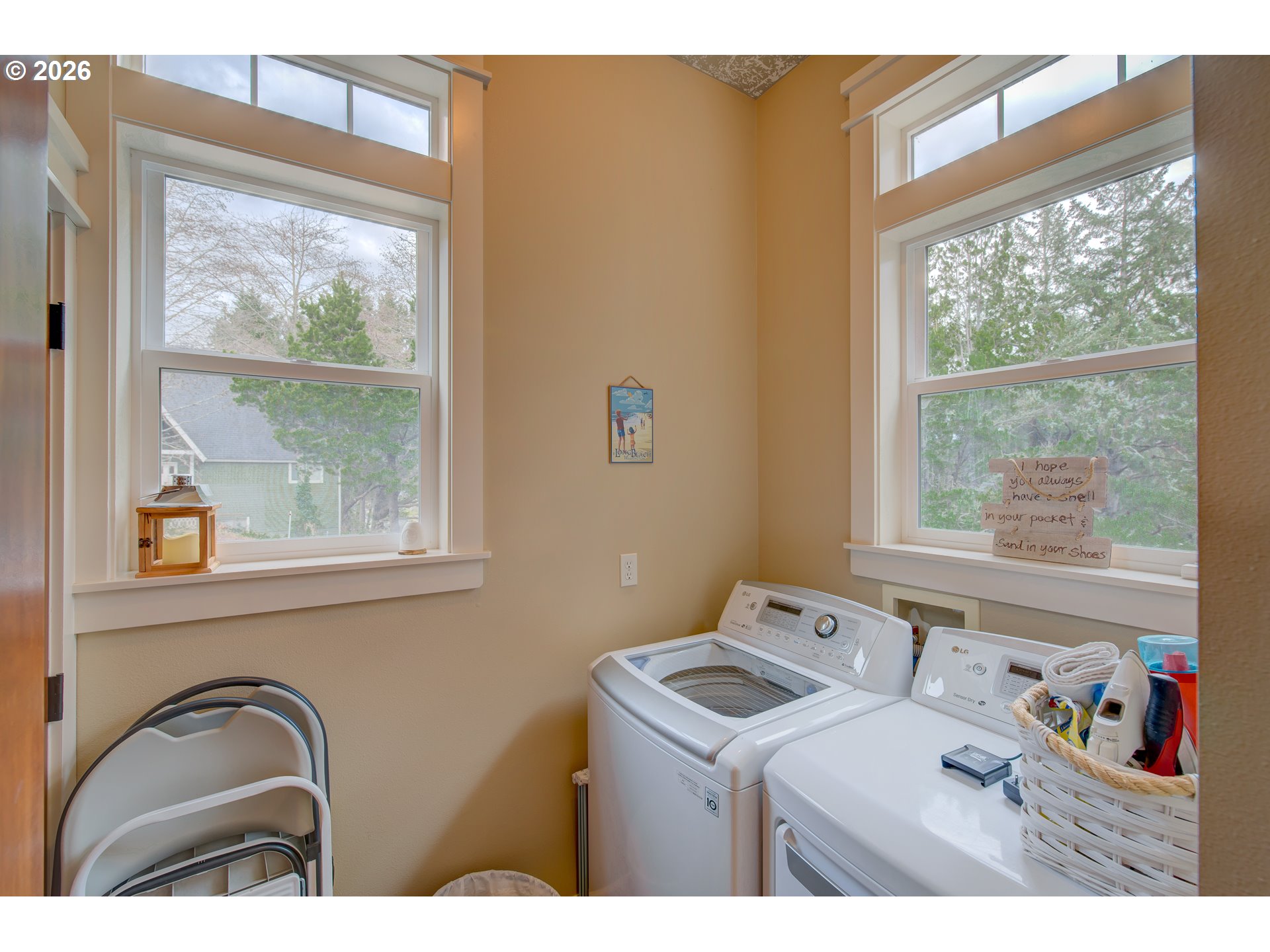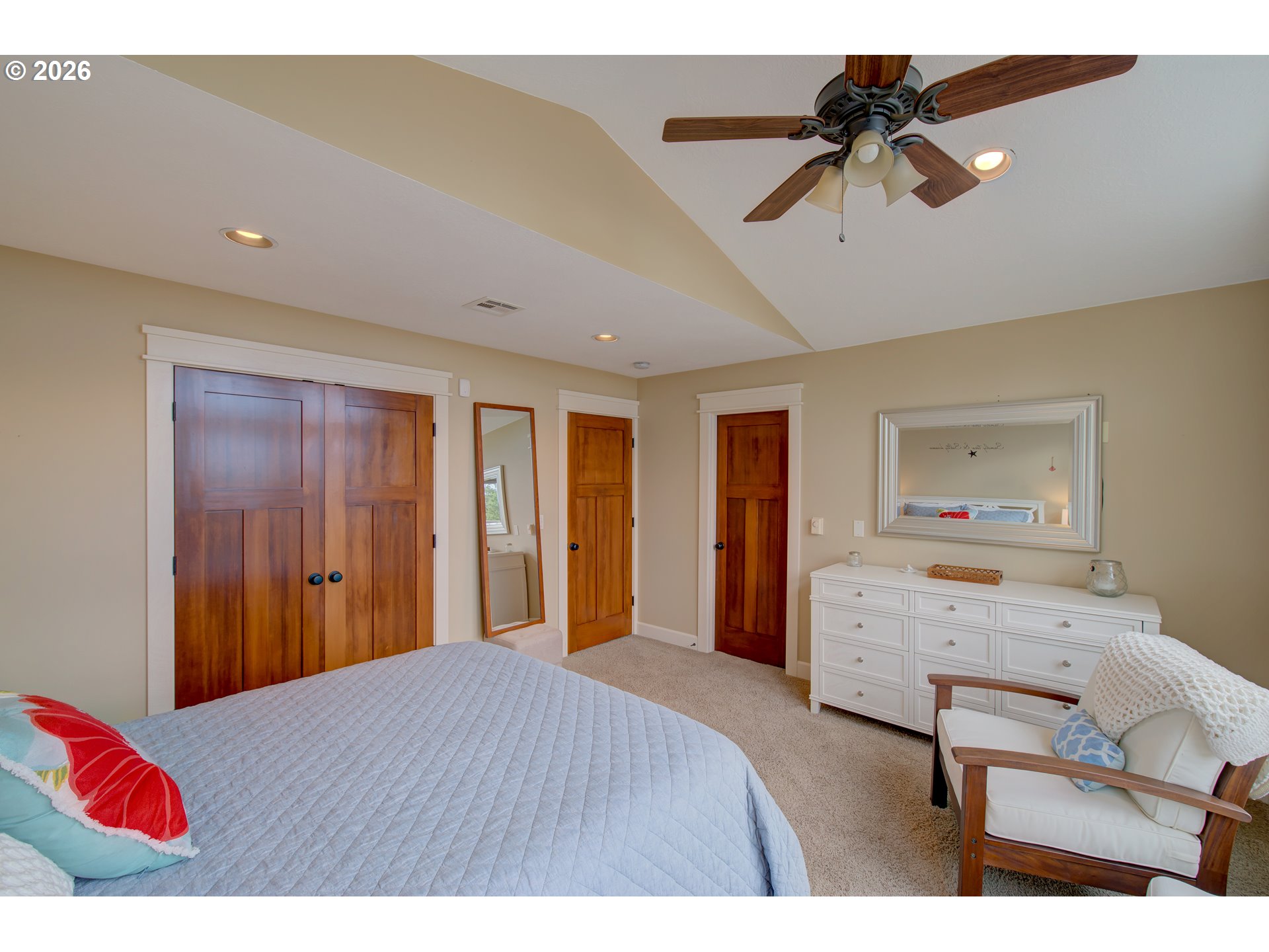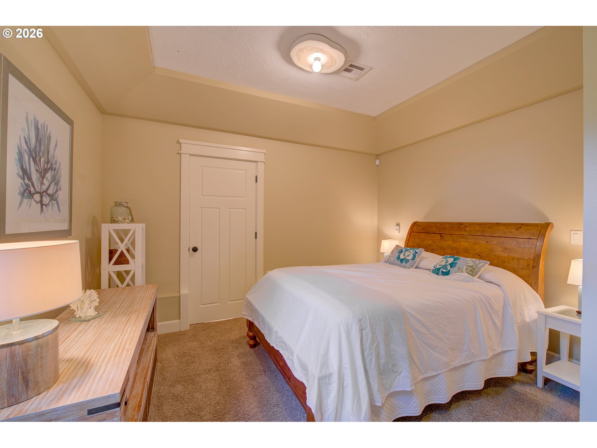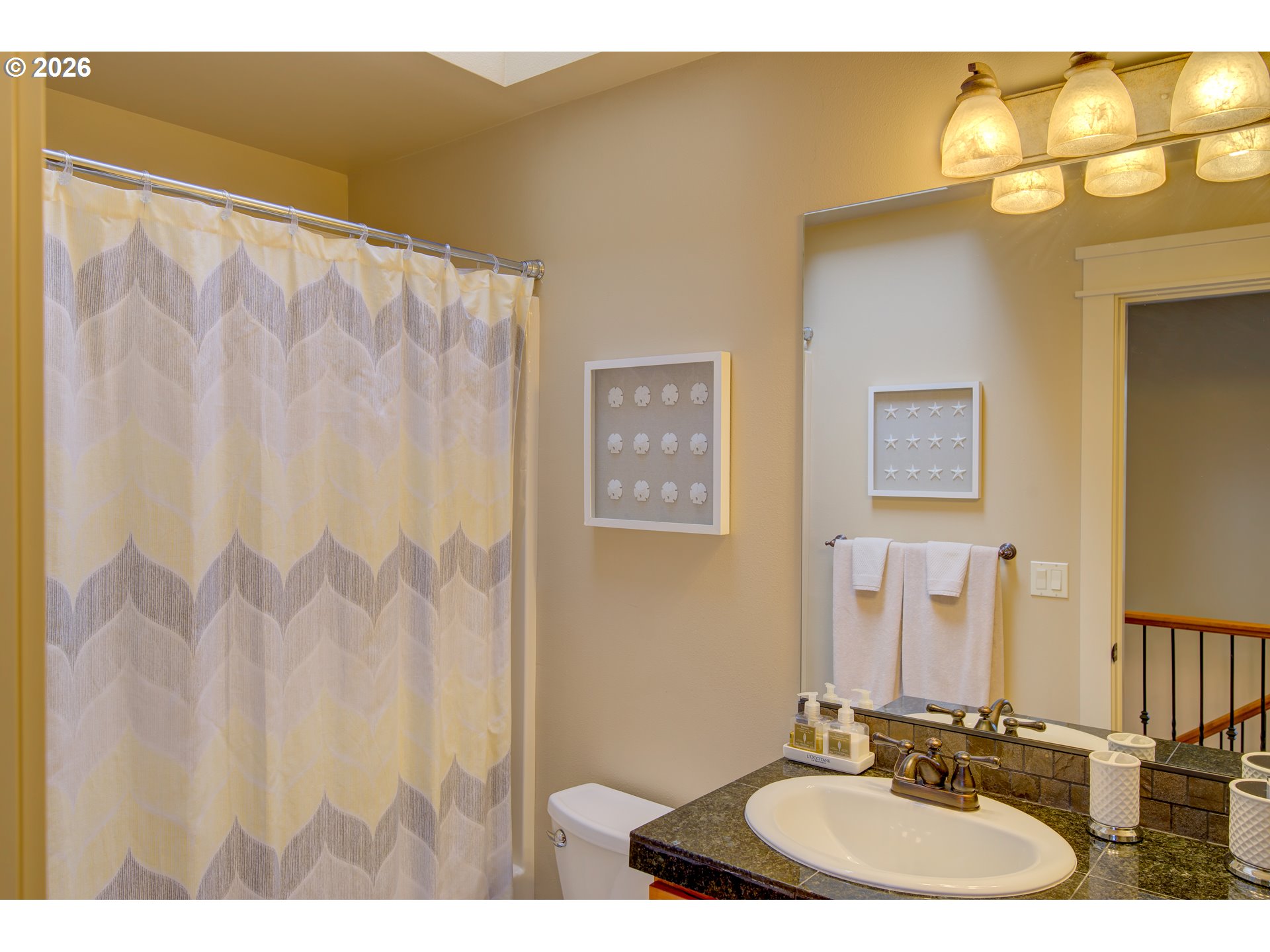 Coastal tri-level home with peekaboo ocean views located just moments from the beach and close to town amenities. High ceilings and large windows with wood casing create a bright, open feel throughout the home, while multiple living areas provide flexibility across all three levels. The kitchen features granite tile countertops, stainless steel appliances, a gas range, built-in microwave, and an island with prep sink, along with direct access to a covered porch—ideal for enjoying the coastal setting. The living room offers warm character with wood built-ins, a natural stone–surround fireplace, ceiling fan, and comfortable carpeting. Upstairs, the primary suite features vaulted ceilings, ocean views, a ceiling fan, and an ensuite with walk-in shower. Two additional bedrooms and a full bathroom complete the upper level. The lower level includes an additional suite with coved ceiling, closet storage, carpet, and a private ensuite with walk-in shower—offering flexible living options. The spacious 24x25 garage features luxury vinyl plank flooring for added durability and usability. Outdoor spaces include a covered patio with freestanding hot tub and a large wood deck, creating multiple areas for relaxation and entertaining. Conveniently located near the shoreline and just minutes from local shops, dining, and everyday amenities, this coastal home offers a comfortable layout with ocean-view charm.