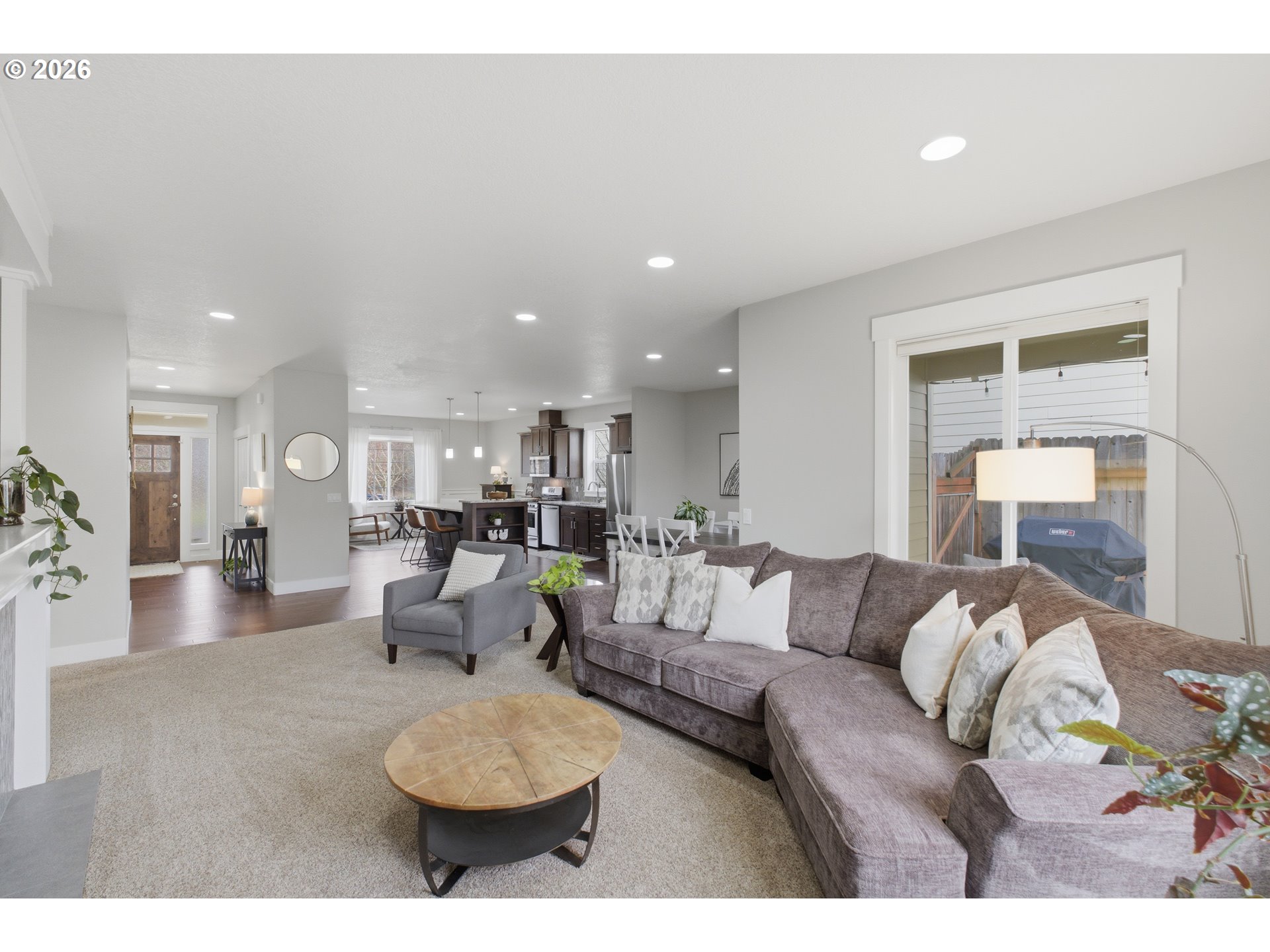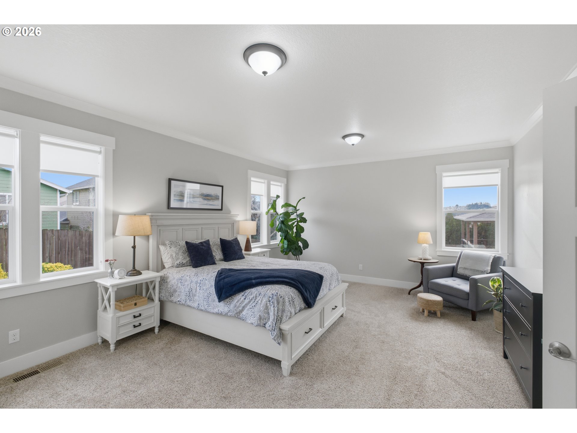Single-level living with an upstairs bonus room in a highly sought-after neighborhood. This home offers 10-foot ceilings, large windows, and a bright living room with a gas fireplace. The dining area features engineered hardwood floors and a sliding door to the backyard, making it functional for everyday living.The kitchen includes granite countertops, wood cabinetry, stainless steel appliances, a gas range, island seating, pantry, coffee bar, and breakfast nook. A versatile playroom or library with built-in cabinets provides flexible space for work or hobbies.The primary suite features crown molding, a walk-in closet, and an ensuite bath with dual vanities, soaking tub and a walk-in shower. The upstairs bonus room could function as a 4th bedroom or office and includes access to a private covered deck. A fully fenced landscaped backyard, three-car garage with large driveway makes this the perfect move in ready home.