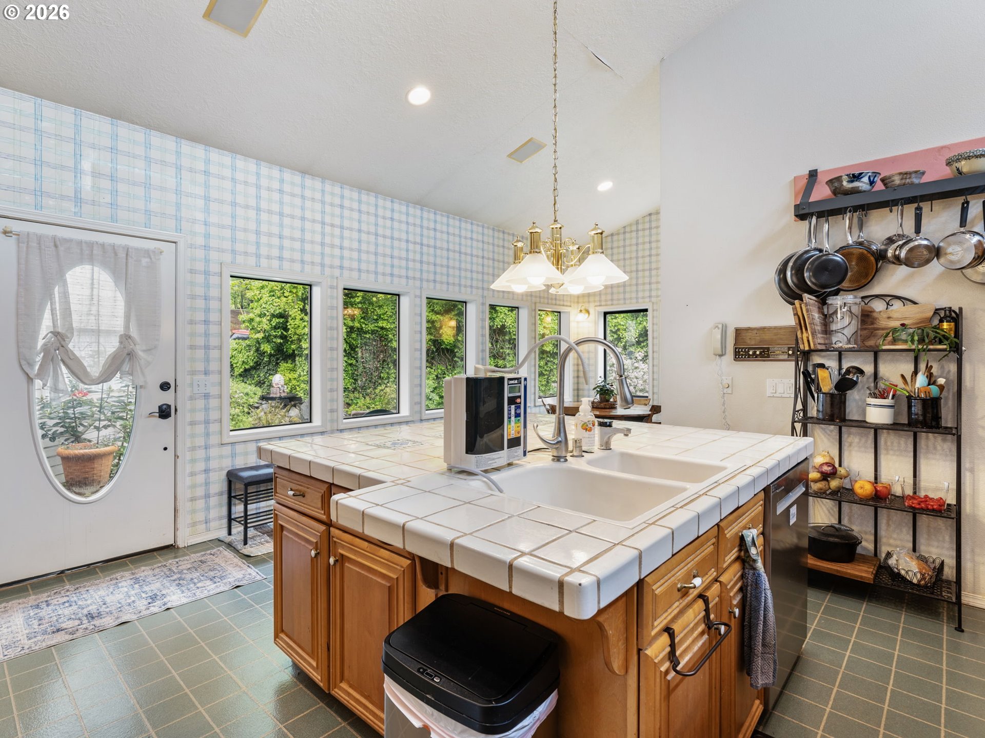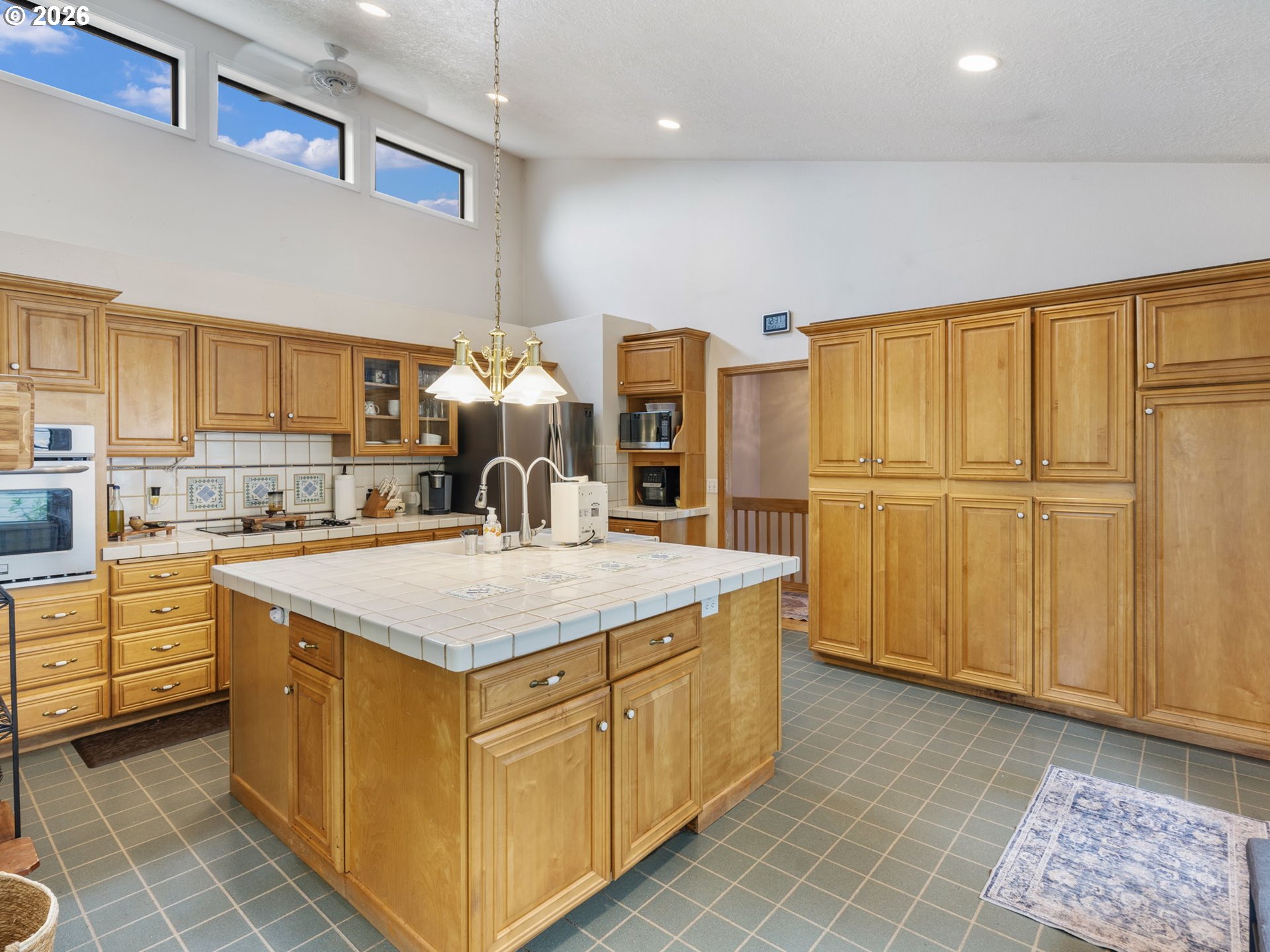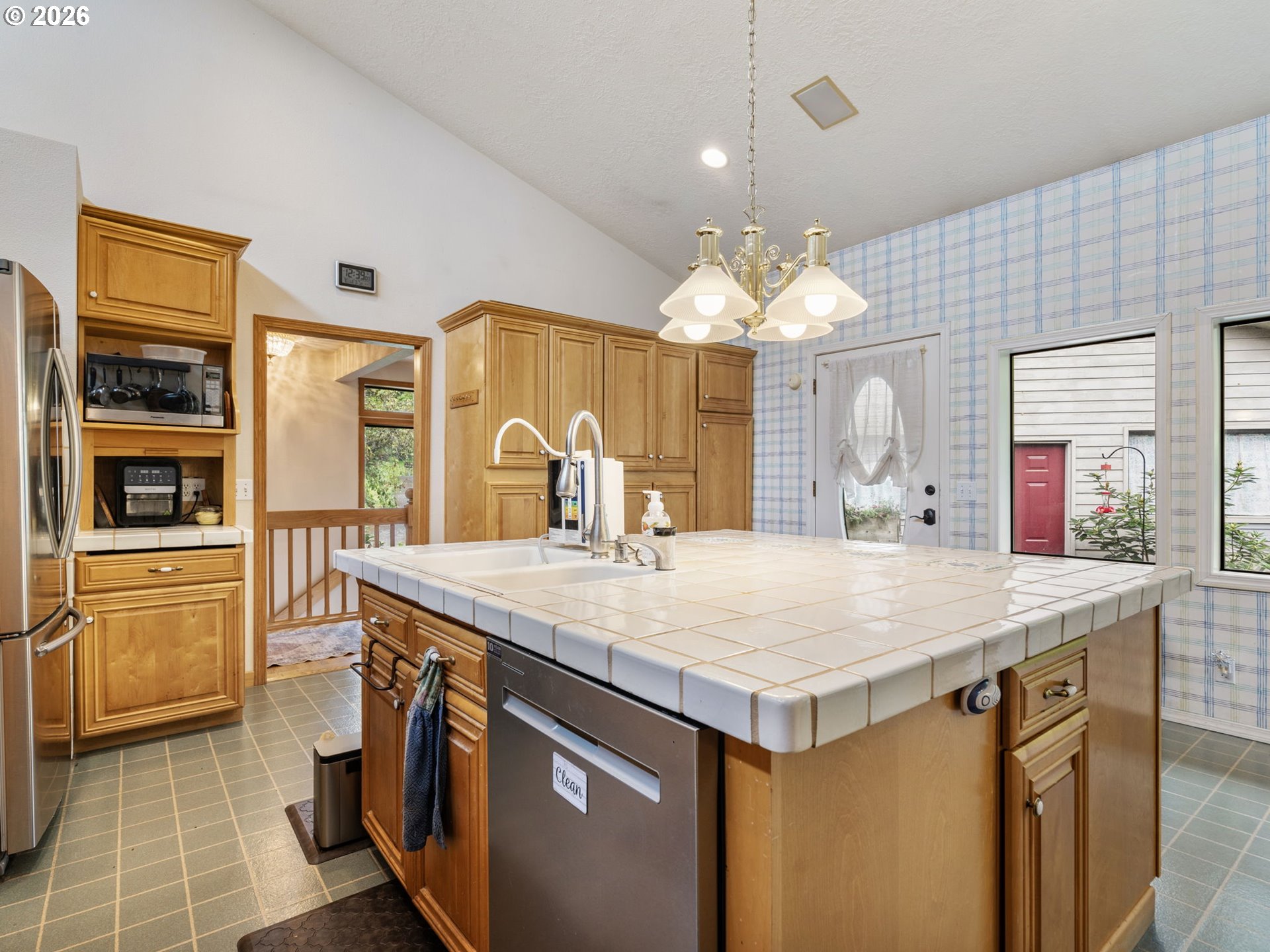 BuiltinOven, BuiltinRange, Dishwasher, FreeStandingRefrigerator, Island, StainlessSteelAppliance, Tile