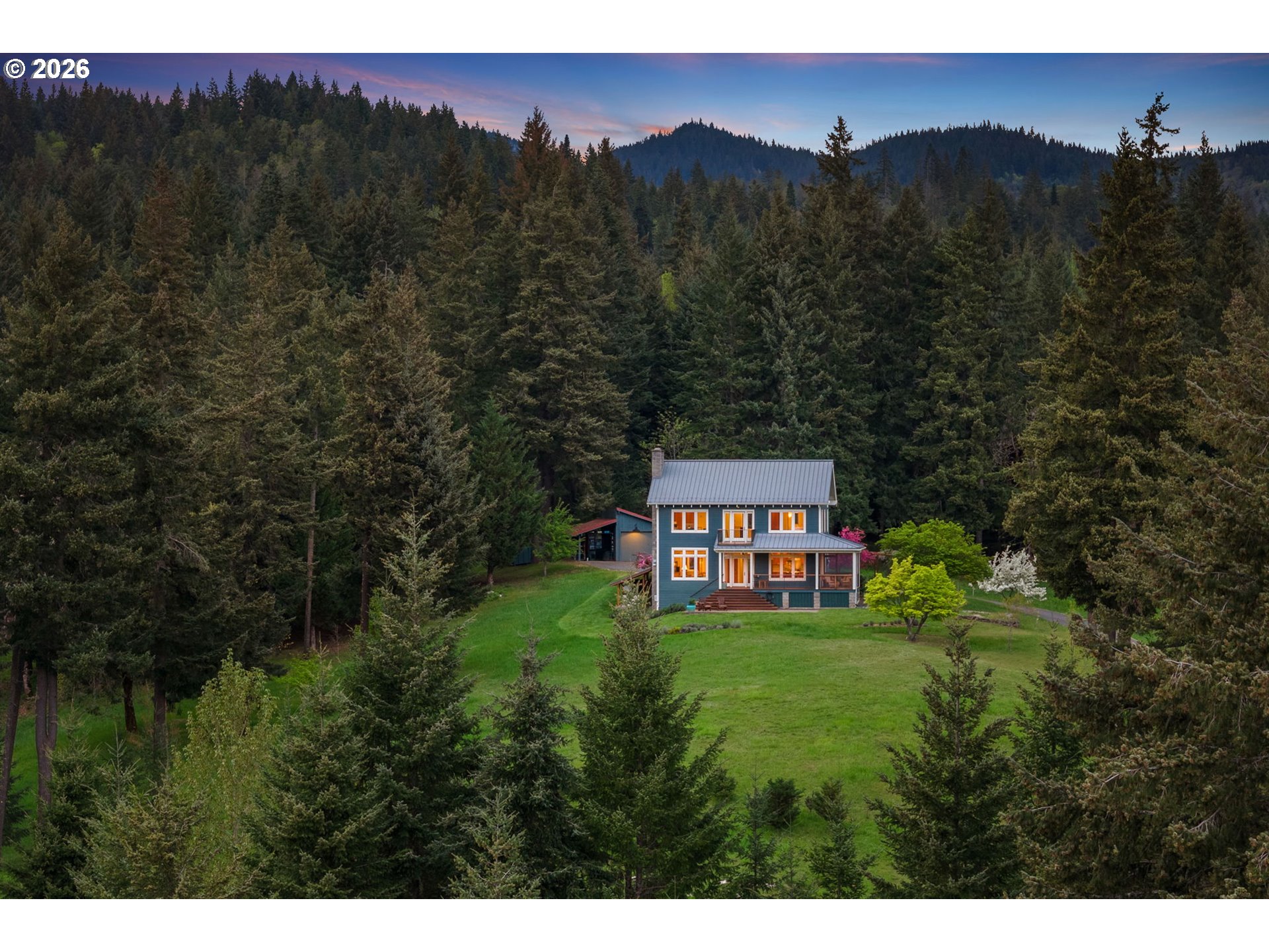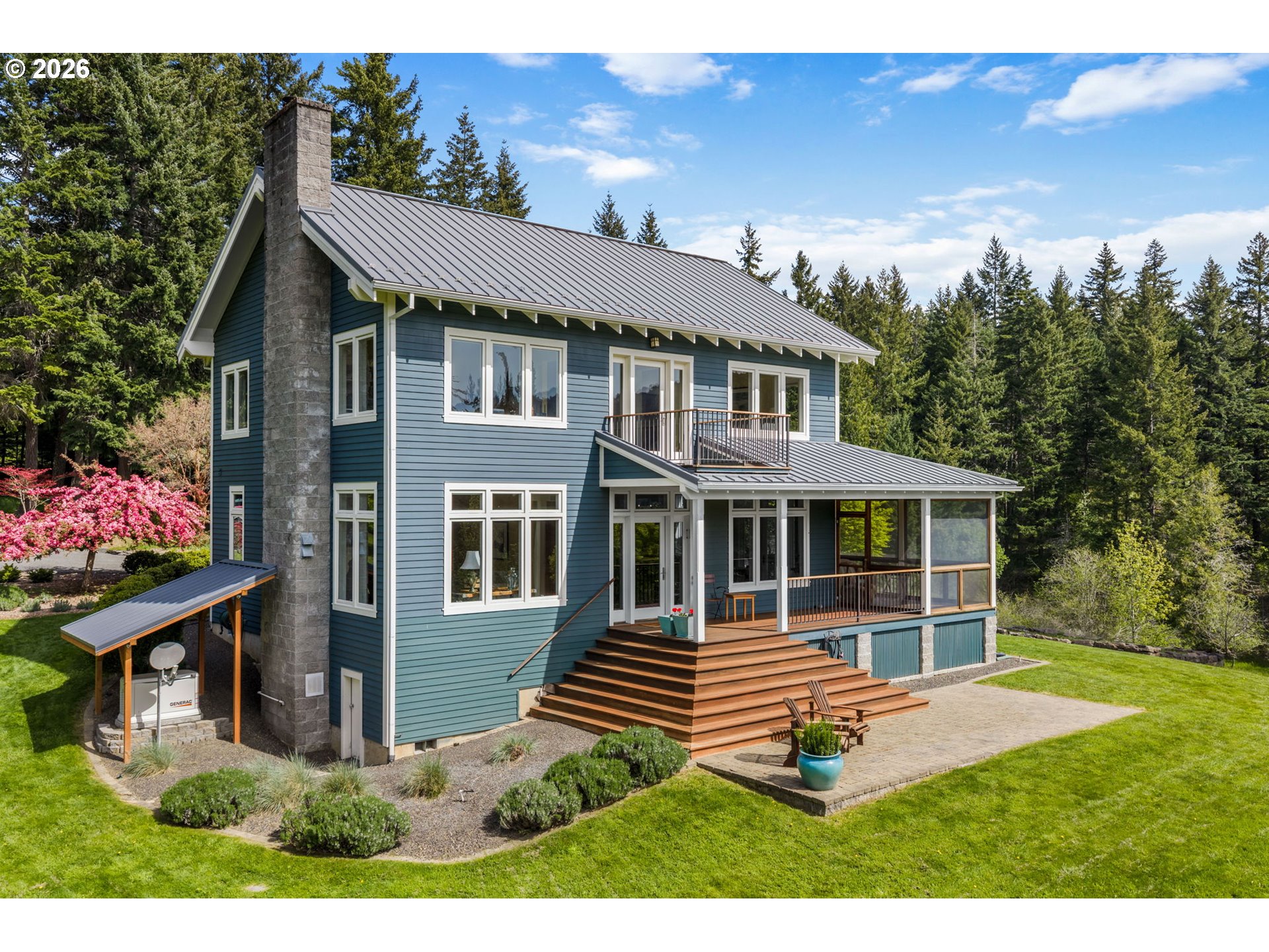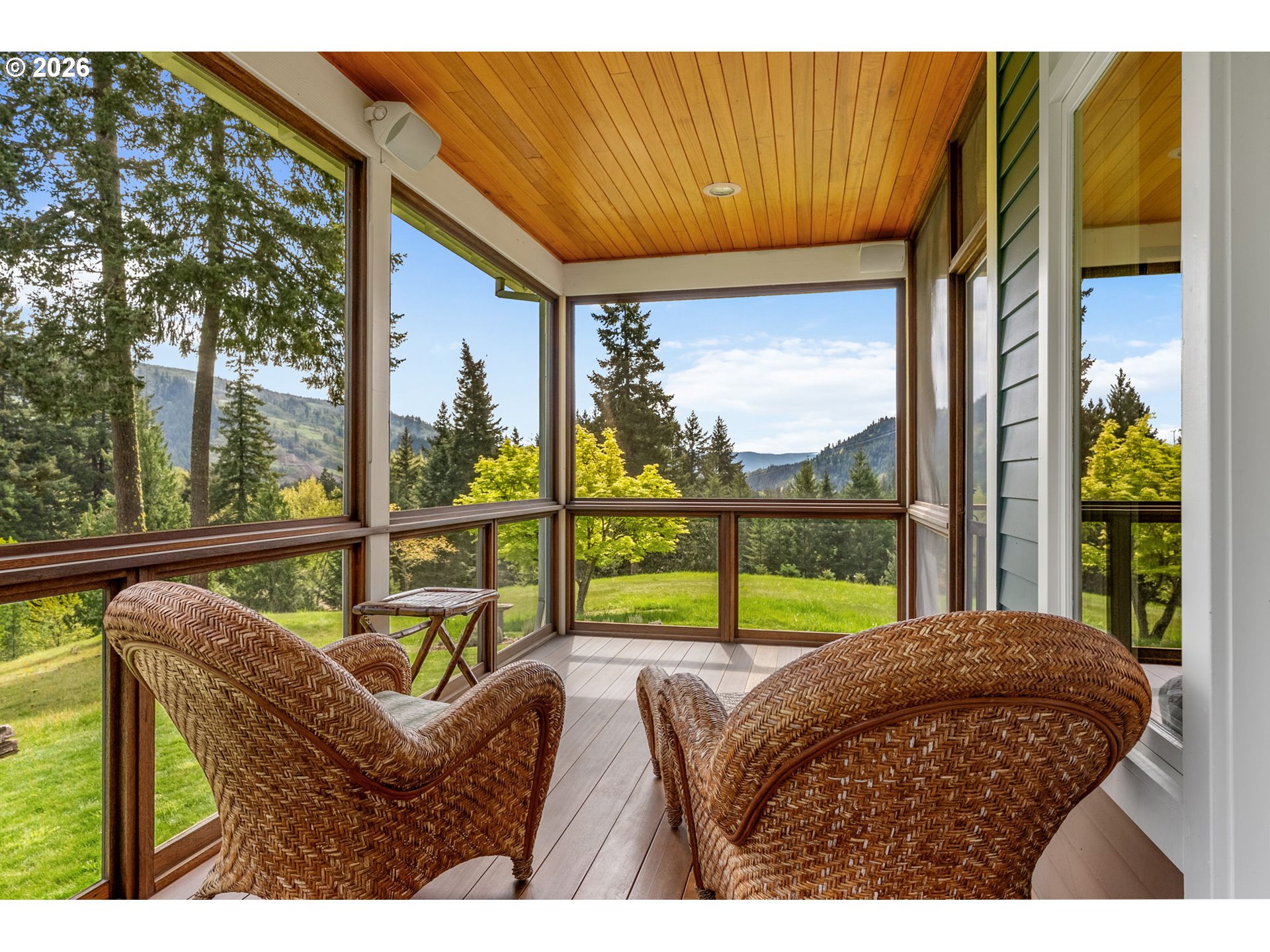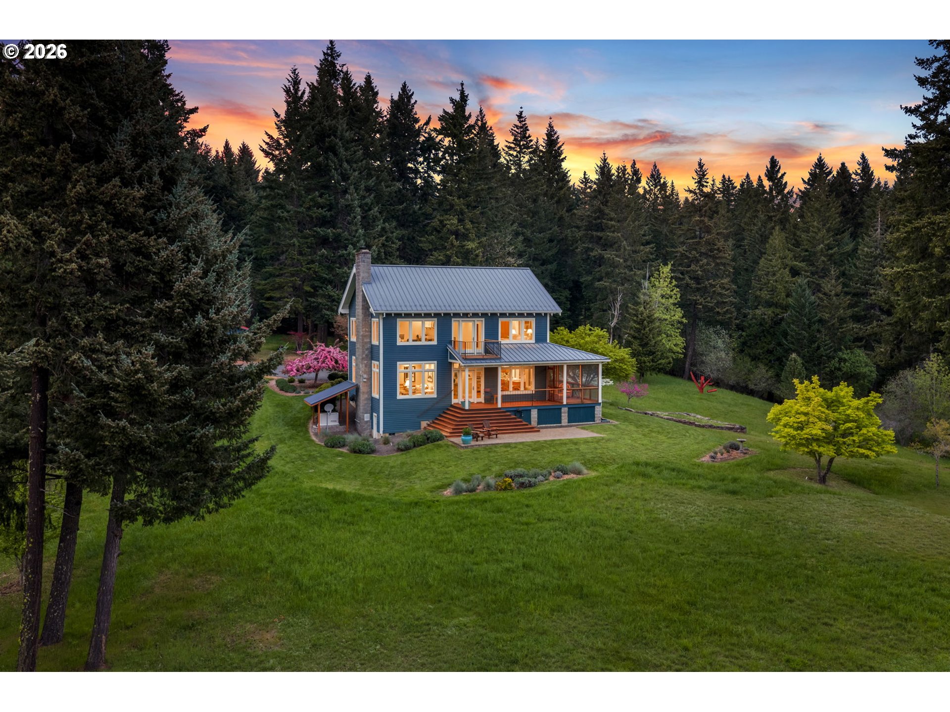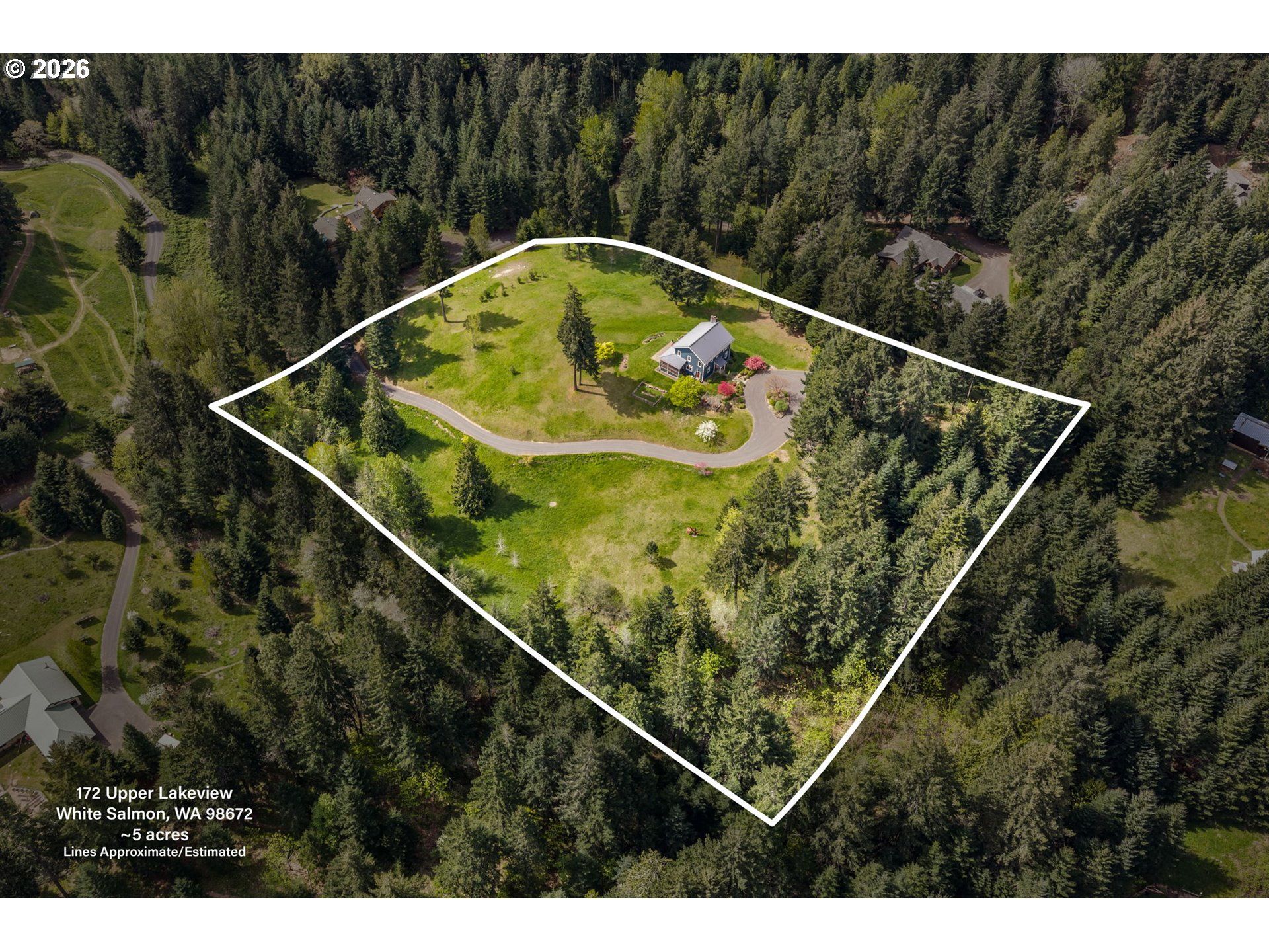 Set on a gently elevated knoll in Upper White Salmon, this architect-designed home offers quality craftsmanship in a private, tranquil Gorge setting. Situated on nearly five landscaped acres of open meadow and mature trees, the property provides a peaceful, park-like environment with seasonal color and full irrigation for ease of maintenance. The one-owner, 3 bedroom + den, 3 bath home reflects thoughtful design and meticulous care throughout. The light-filled interior features 9-foot ceilings, Merbau tropical hardwood floors, and Pella wood casement windows that capture natural light and surrounding views. The main level includes a gourmet kitchen with Viking range and hood, an open living area with fireplace, and an office or den with Simpson fir and glass pocket doors. A mudroom with laundry, utility sink, exterior access, and a full bath completes the main level. Upstairs, the primary suite includes a cast iron soaking tub and walk-in shower, along with two additional bedrooms, all finished with wool carpeting. Bathrooms feature Ann Sacks tile, Porcher fixtures, and radiant towel warmers. An upstairs balcony offers an elevated vantage point to take in the surrounding landscape and beauty. Outdoor living is well integrated with a covered deck and a fully screened east-facing porch for year-round enjoyment. A detached two-car garage/barn provides additional storage and workspace. Built for energy efficiency with solid insulation and passive solar design. The home is equipped with a whole-house Generac standby generator with automatic transfer switch and WiFi capability. 172 Upper Lakeview Rd is a place to settle in, stretch out, and take in the quiet rhythm of the Gorge.