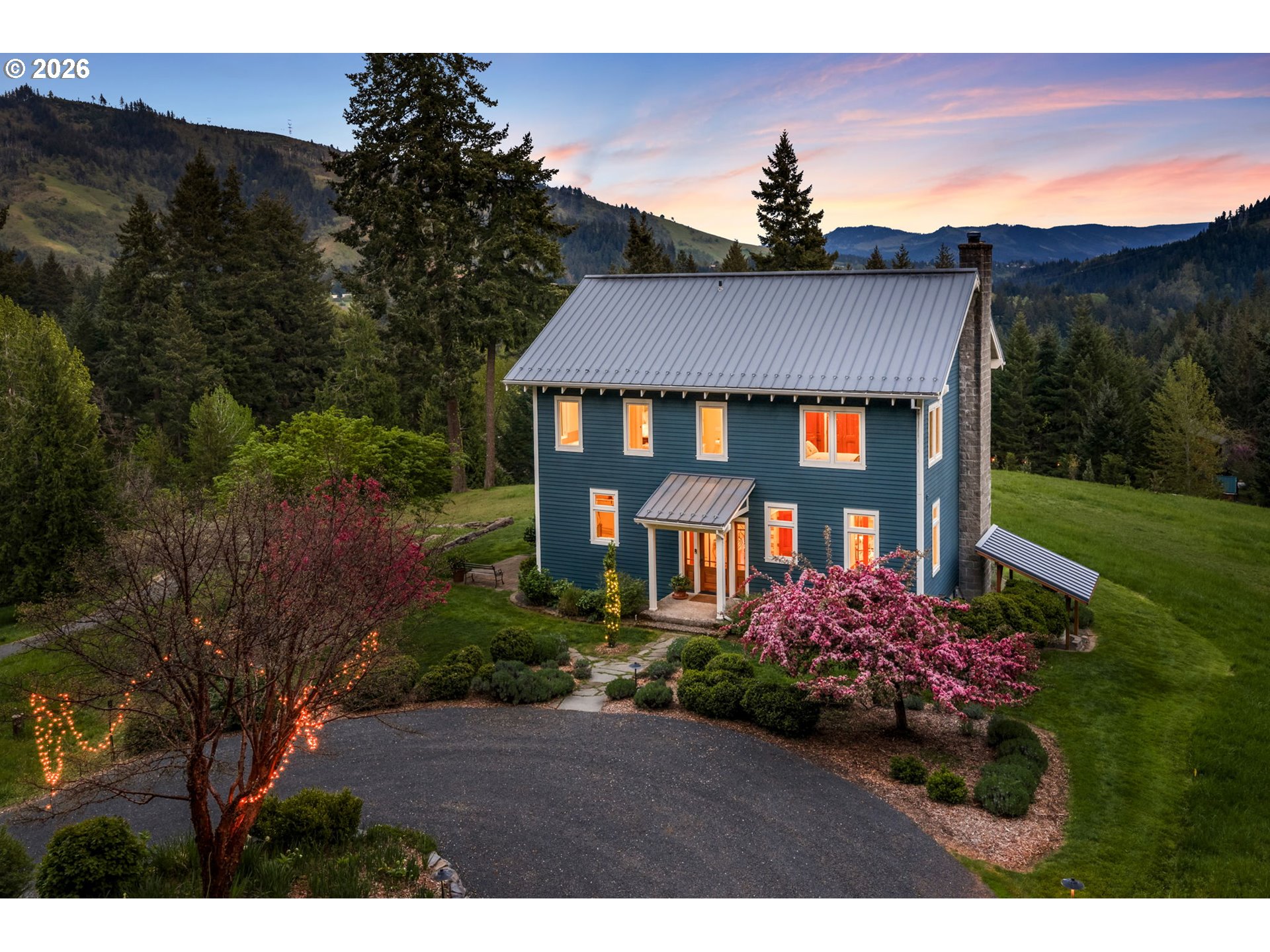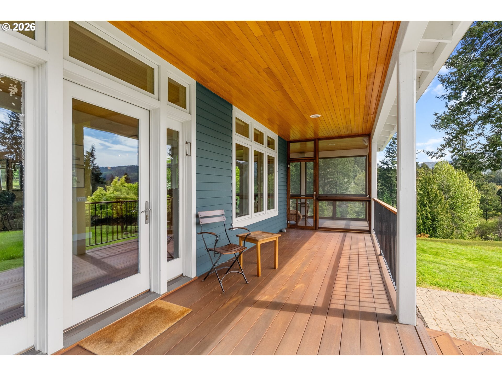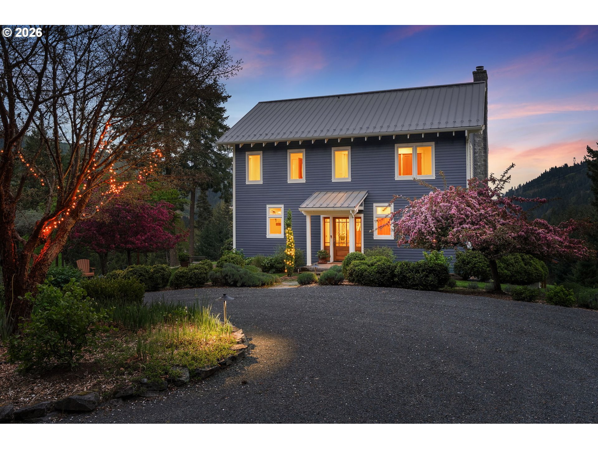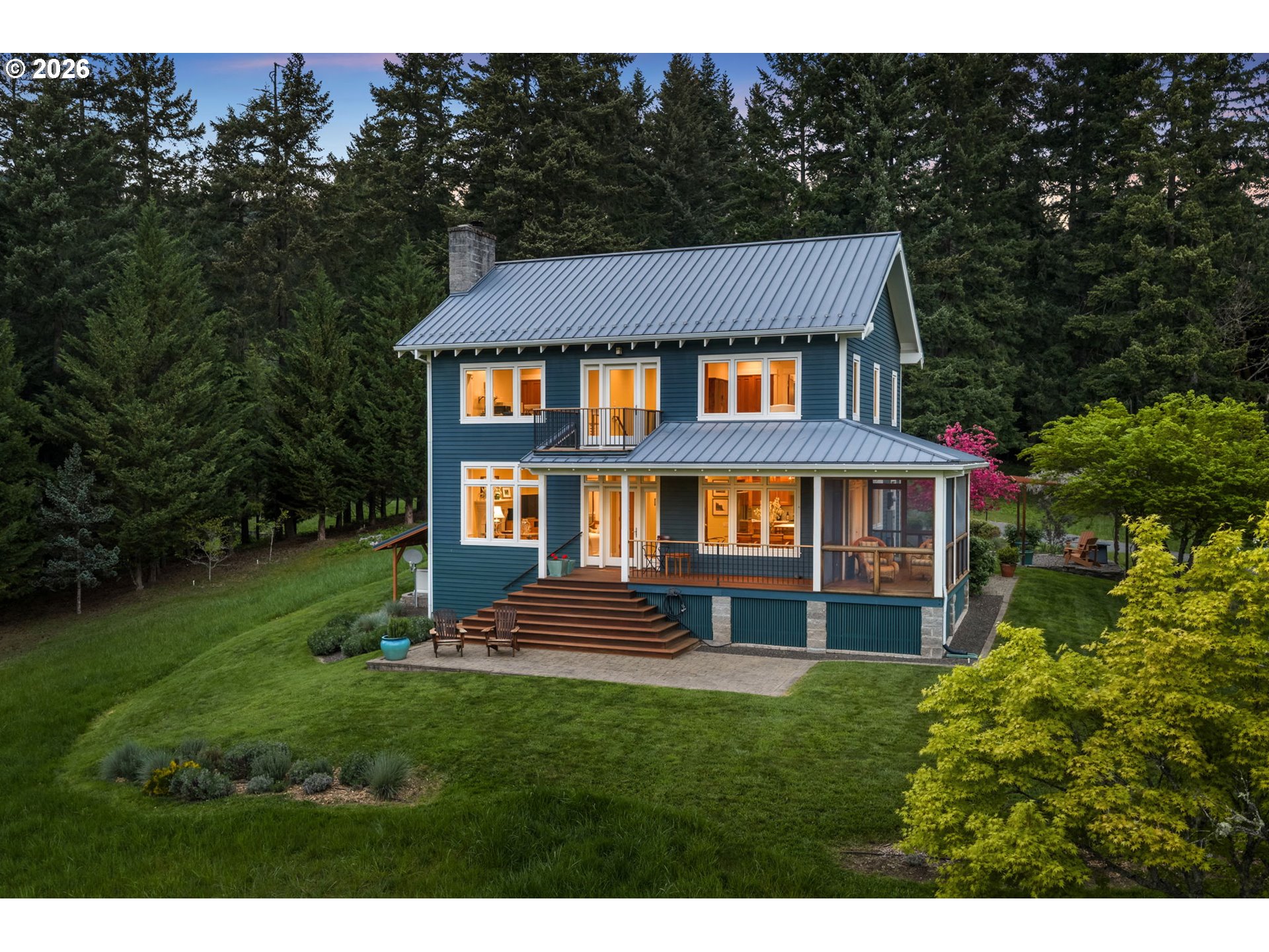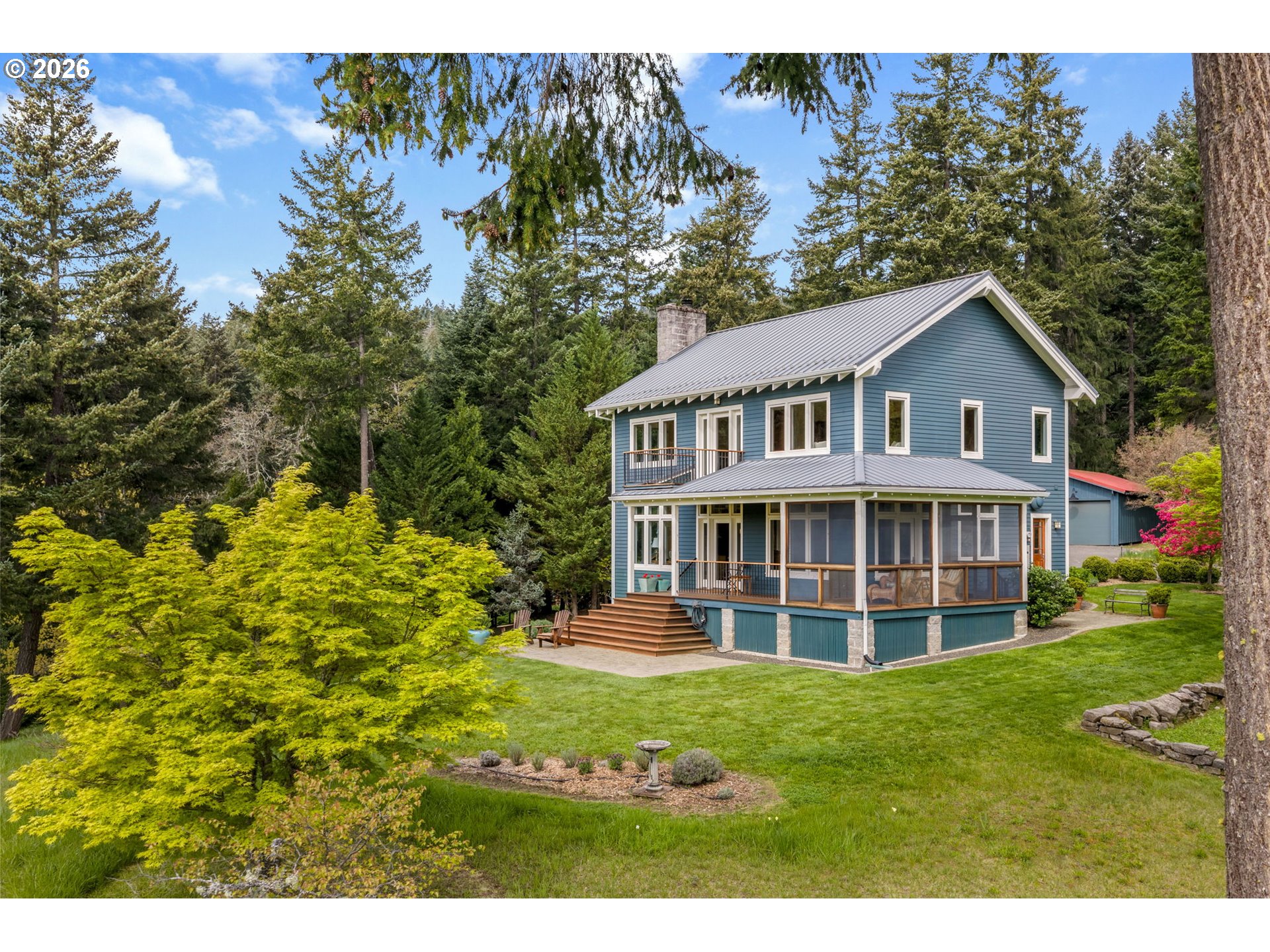 Set on a gently elevated knoll in Upper White Salmon, this architect-designed home offers quality craftsmanship in a private, tranquil Gorge setting. Situated on nearly five landscaped acres of open meadow and mature trees, the property provides a peaceful, park-like environment with seasonal color and full irrigation for ease of maintenance. The one-owner, 3 bedroom + den, 3 bath home reflects thoughtful design and meticulous care throughout. The light-filled interior features 9-foot ceilings, Merbau tropical hardwood floors, and Pella wood casement windows that capture natural light and surrounding views. The main level includes a gourmet kitchen with Viking range and hood, an open living area with fireplace, and an office or den with Simpson fir and glass pocket doors. A mudroom with laundry, utility sink, exterior access, and a full bath completes the main level. Upstairs, the primary suite includes a cast iron soaking tub and walk-in shower, along with two additional bedrooms, all finished with wool carpeting. Bathrooms feature Ann Sacks tile, Porcher fixtures, and radiant towel warmers. An upstairs balcony offers an elevated vantage point to take in the surrounding landscape and beauty. Outdoor living is well integrated with a covered deck and a fully screened east-facing porch for year-round enjoyment. A detached two-car garage/barn provides additional storage and workspace. Built for energy efficiency with solid insulation and passive solar design. The home is equipped with a whole-house Generac standby generator with automatic transfer switch and WiFi capability. 172 Upper Lakeview Rd is a place to settle in, stretch out, and take in the quiet rhythm of the Gorge.