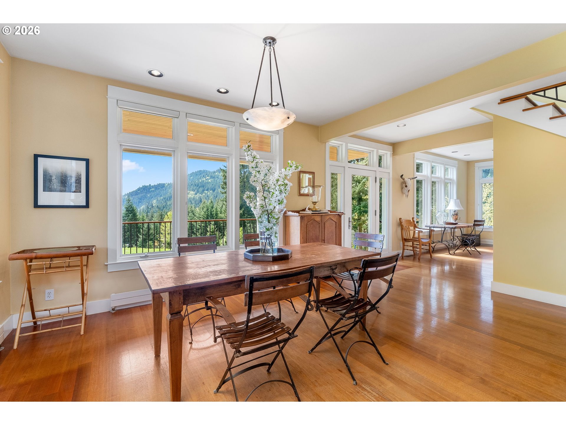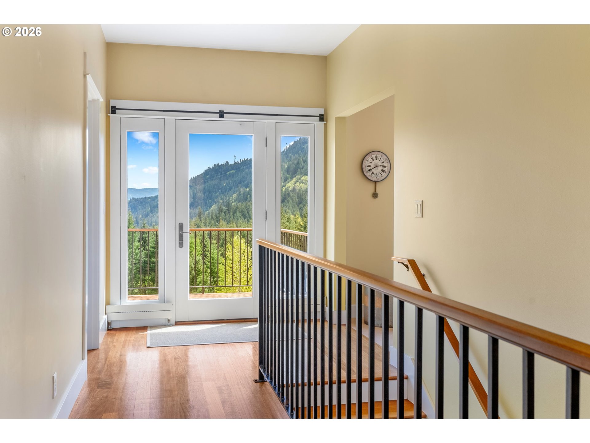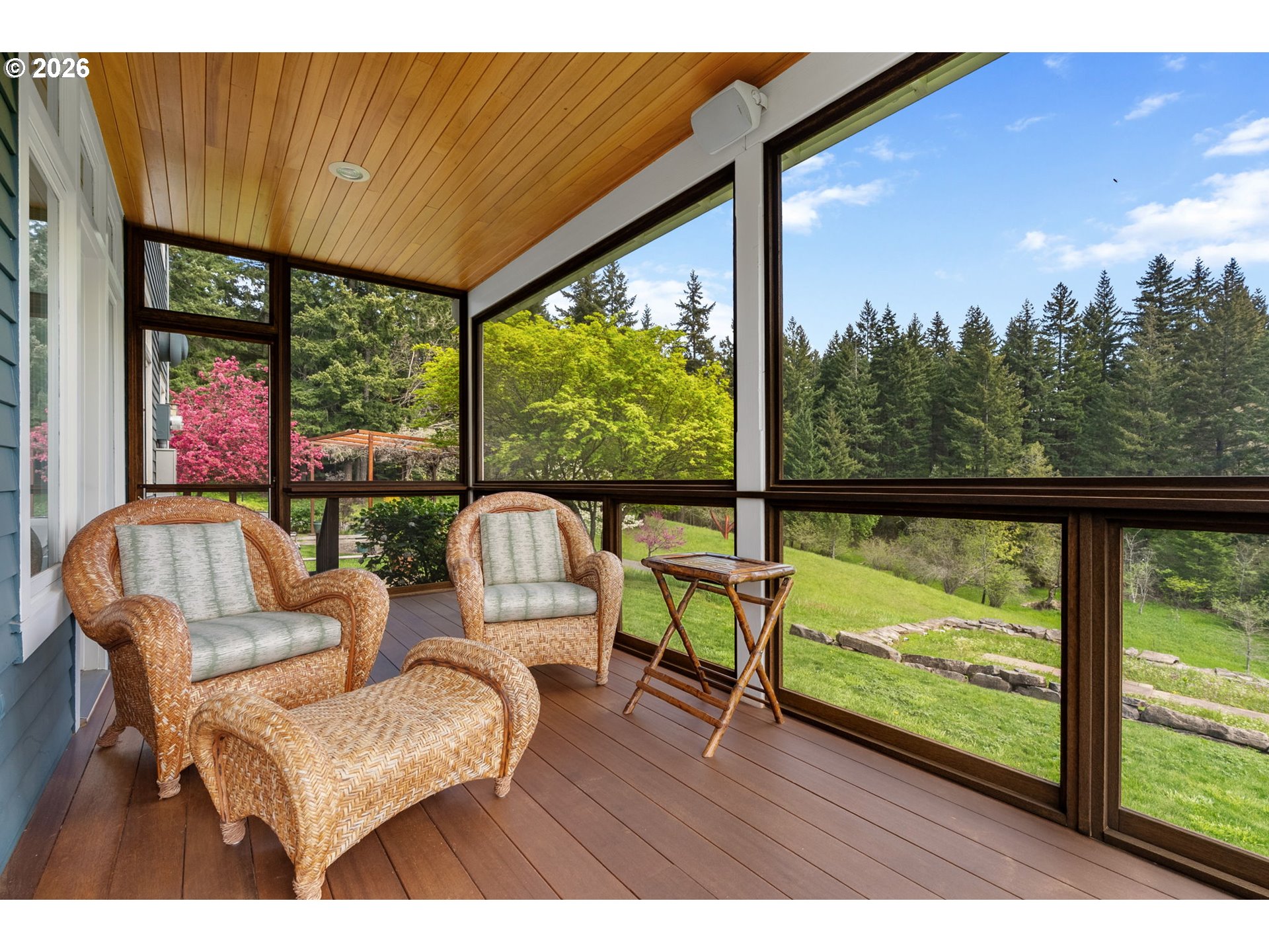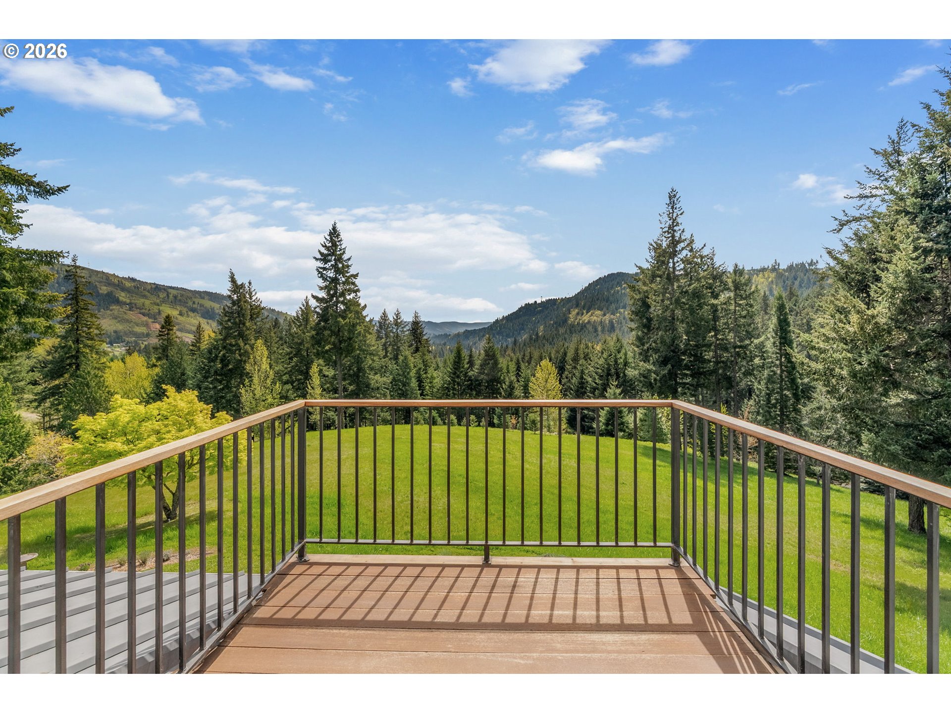 Set on a gently elevated knoll in Upper White Salmon, this architect-designed home offers quality craftsmanship in a private, tranquil Gorge setting. Situated on nearly five landscaped acres of open meadow and mature trees, the property provides a peaceful, park-like environment with seasonal color and full irrigation for ease of maintenance. The one-owner, 3 bedroom + den, 3 bath home reflects thoughtful design and meticulous care throughout. The light-filled interior features 9-foot ceilings, Merbau tropical hardwood floors, and Pella wood casement windows that capture natural light and surrounding views. The main level includes a gourmet kitchen with Viking range and hood, an open living area with fireplace, and an office or den with Simpson fir and glass pocket doors. A mudroom with laundry, utility sink, exterior access, and a full bath completes the main level. Upstairs, the primary suite includes a cast iron soaking tub and walk-in shower, along with two additional bedrooms, all finished with wool carpeting. Bathrooms feature Ann Sacks tile, Porcher fixtures, and radiant towel warmers. An upstairs balcony offers an elevated vantage point to take in the surrounding landscape and beauty. Outdoor living is well integrated with a covered deck and a fully screened east-facing porch for year-round enjoyment. A detached two-car garage/barn provides additional storage and workspace. Built for energy efficiency with solid insulation and passive solar design. The home is equipped with a whole-house Generac standby generator with automatic transfer switch and WiFi capability. 172 Upper Lakeview Rd is a place to settle in, stretch out, and take in the quiet rhythm of the Gorge.