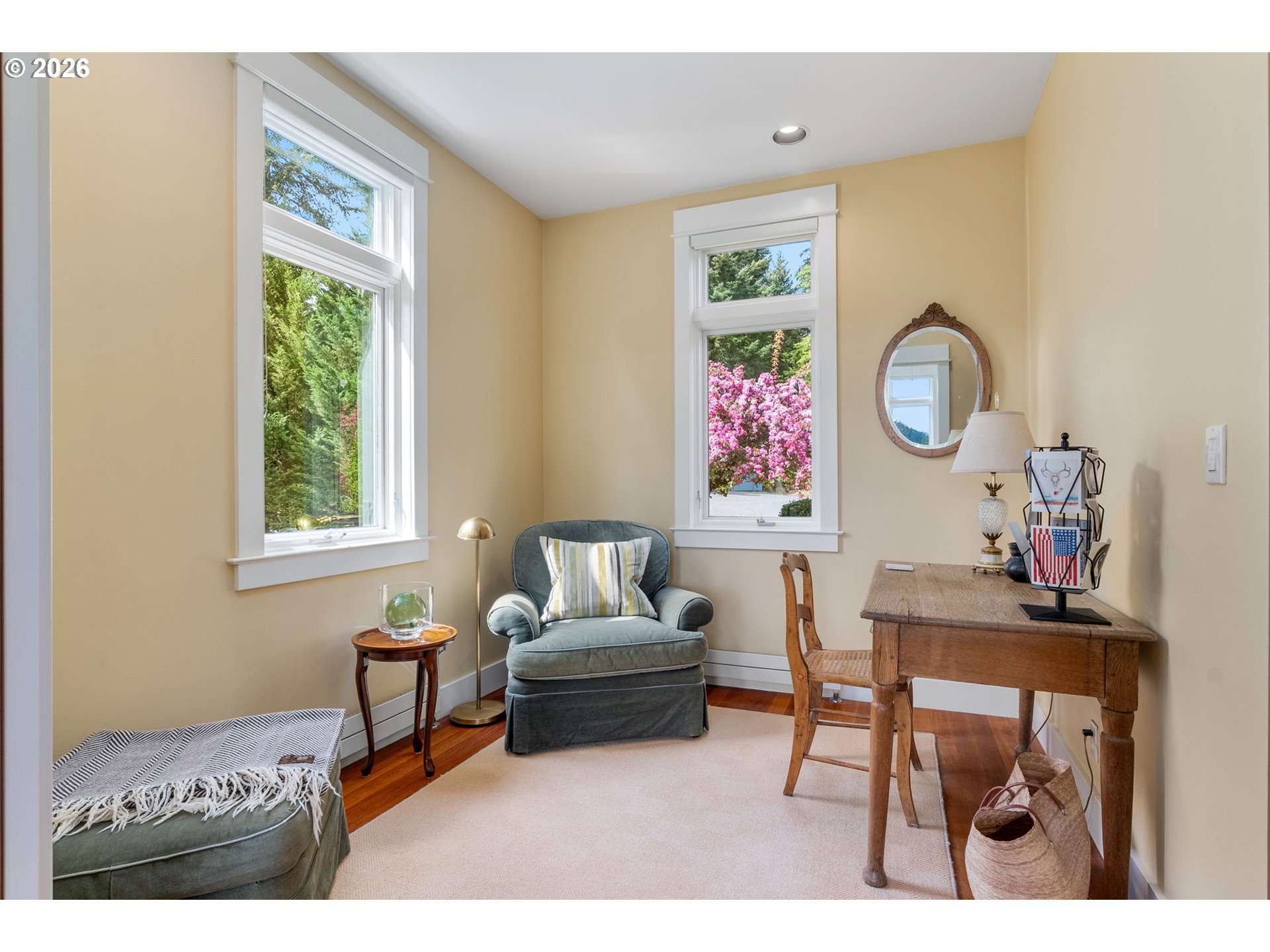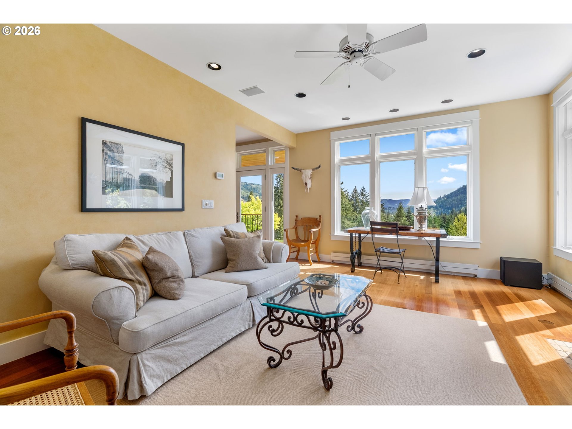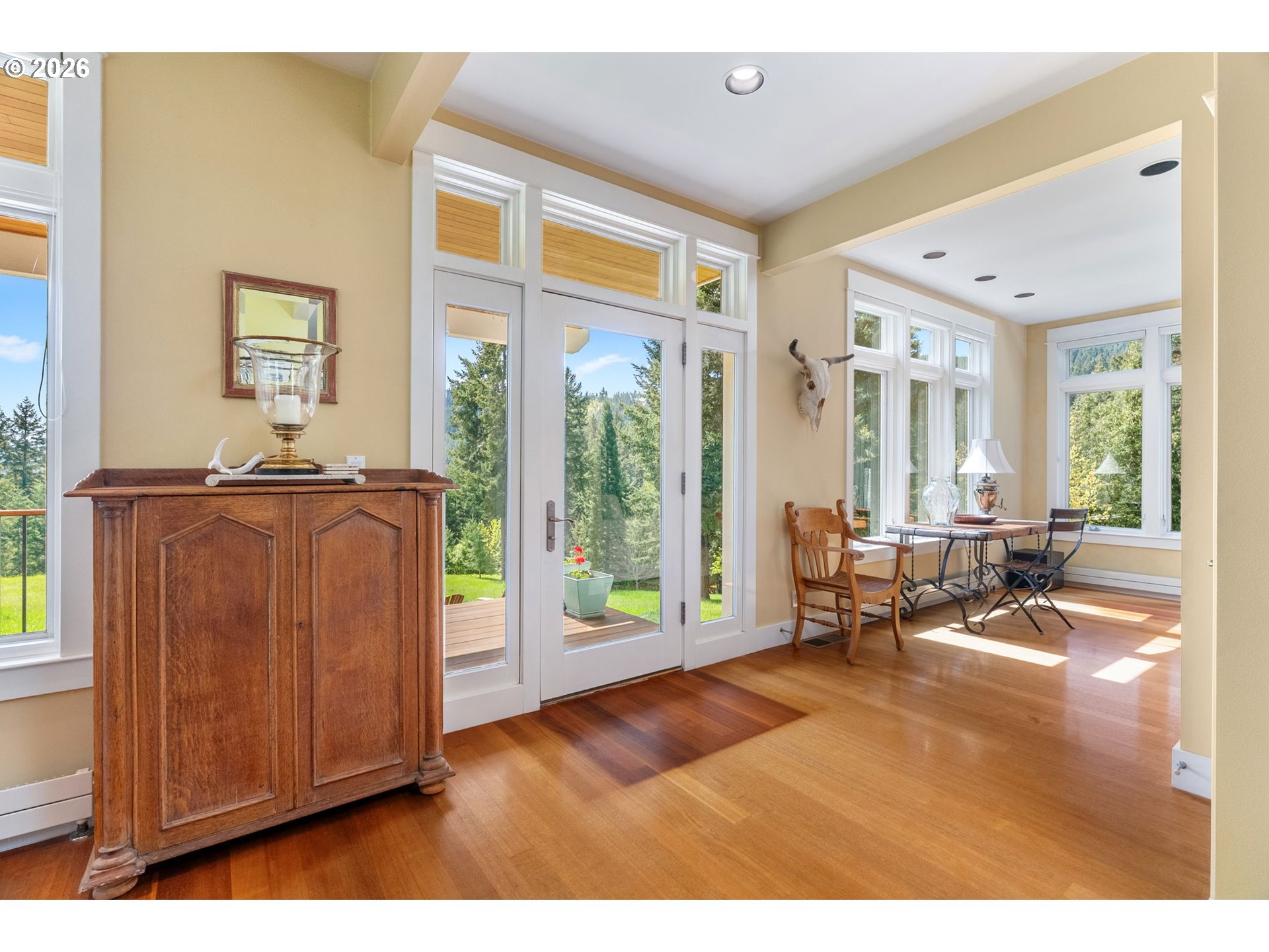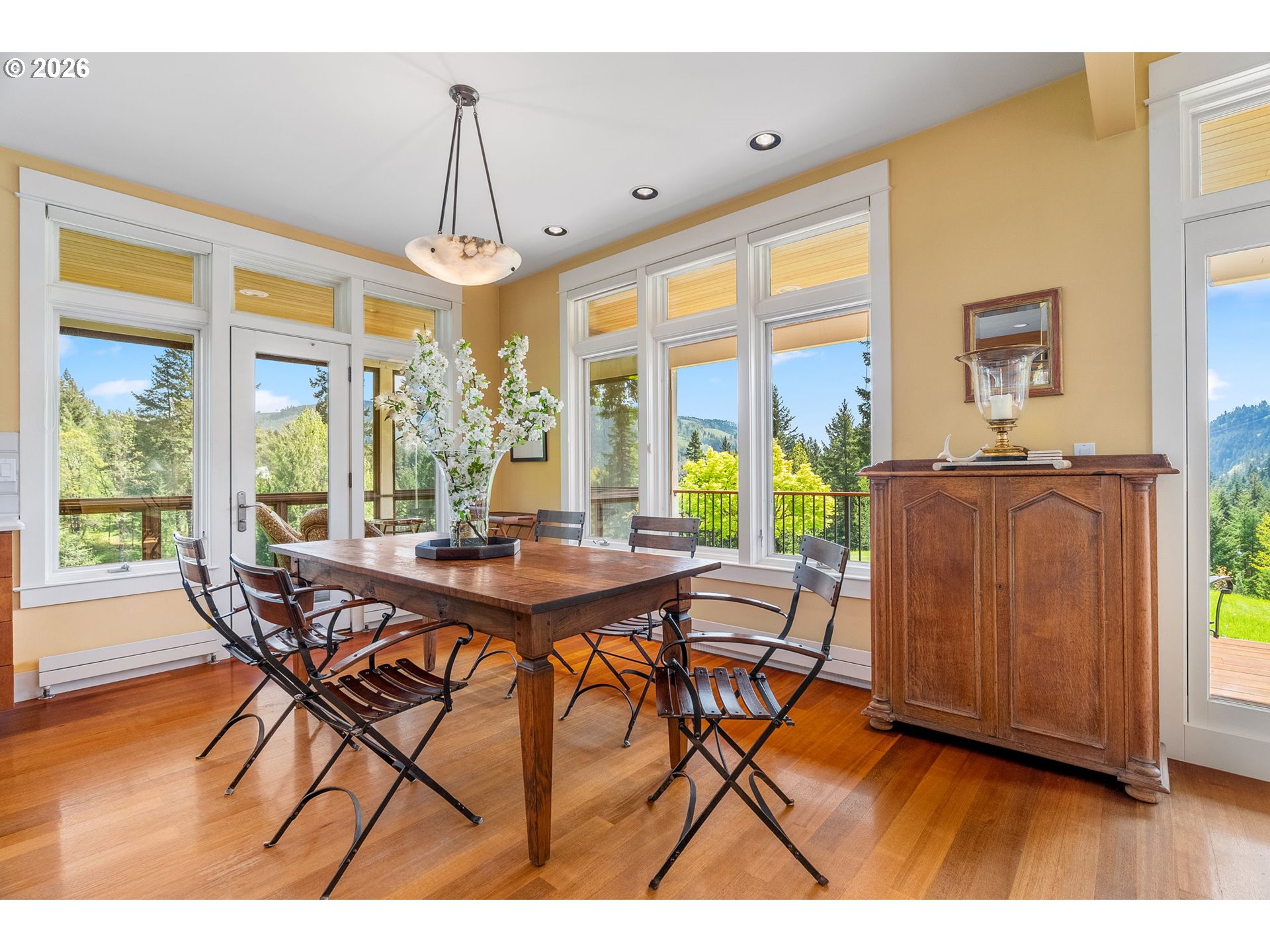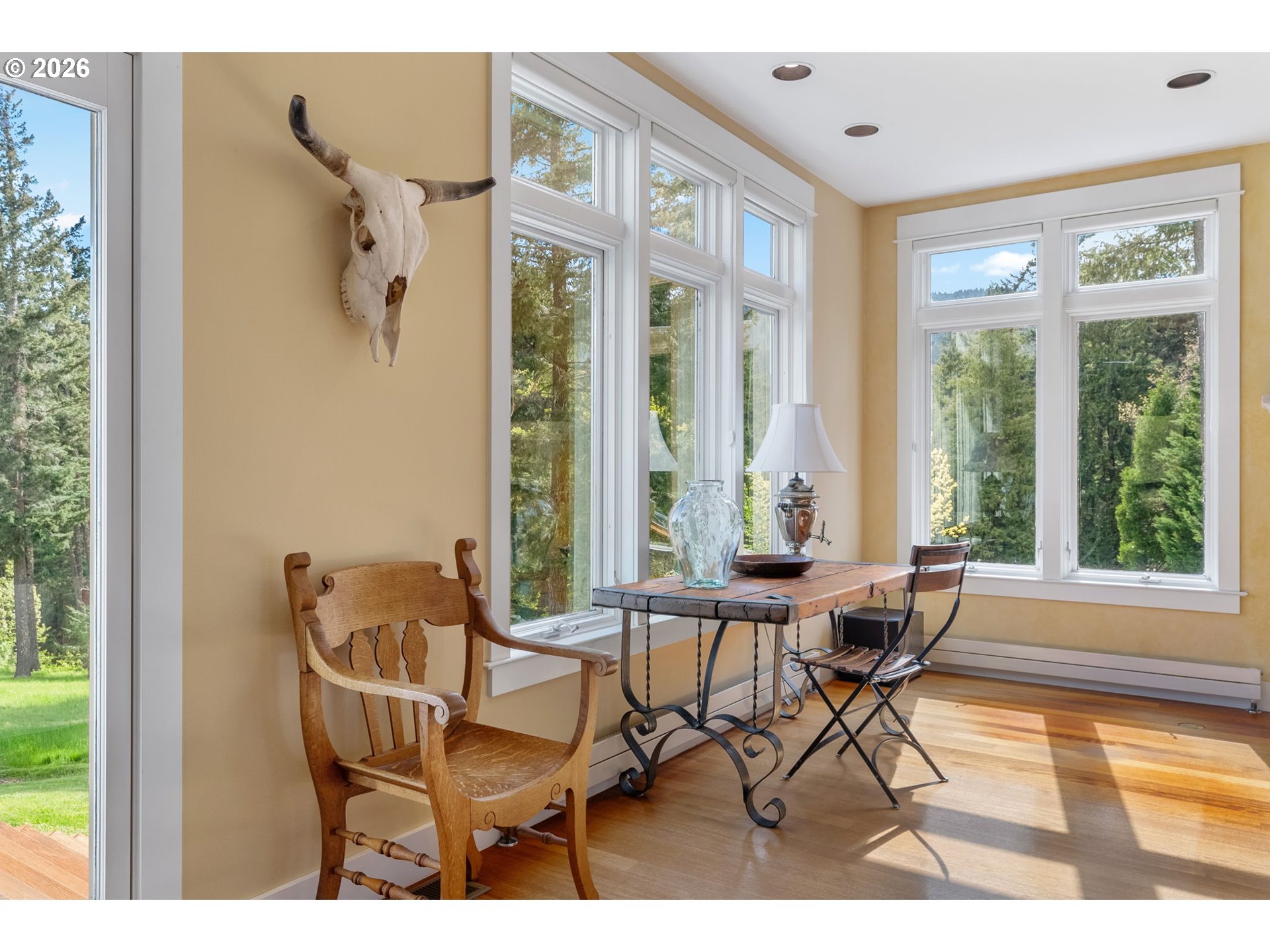 Set on a gently elevated knoll in Upper White Salmon, this architect-designed home offers quality craftsmanship in a private, tranquil Gorge setting. Situated on nearly five landscaped acres of open meadow and mature trees, the property provides a peaceful, park-like environment with seasonal color and full irrigation for ease of maintenance. The one-owner, 3 bedroom + den, 3 bath home reflects thoughtful design and meticulous care throughout. The light-filled interior features 9-foot ceilings, Merbau tropical hardwood floors, and Pella wood casement windows that capture natural light and surrounding views. The main level includes a gourmet kitchen with Viking range and hood, an open living area with fireplace, and an office or den with Simpson fir and glass pocket doors. A mudroom with laundry, utility sink, exterior access, and a full bath completes the main level. Upstairs, the primary suite includes a cast iron soaking tub and walk-in shower, along with two additional bedrooms, all finished with wool carpeting. Bathrooms feature Ann Sacks tile, Porcher fixtures, and radiant towel warmers. An upstairs balcony offers an elevated vantage point to take in the surrounding landscape and beauty. Outdoor living is well integrated with a covered deck and a fully screened east-facing porch for year-round enjoyment. A detached two-car garage/barn provides additional storage and workspace. Built for energy efficiency with solid insulation and passive solar design. The home is equipped with a whole-house Generac standby generator with automatic transfer switch and WiFi capability. 172 Upper Lakeview Rd is a place to settle in, stretch out, and take in the quiet rhythm of the Gorge.