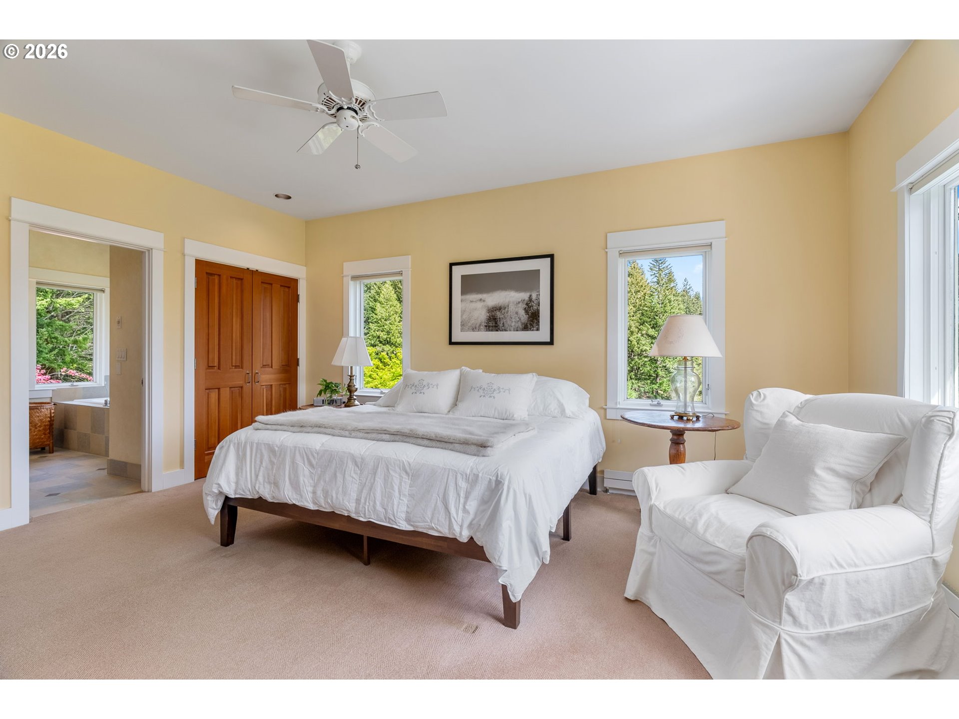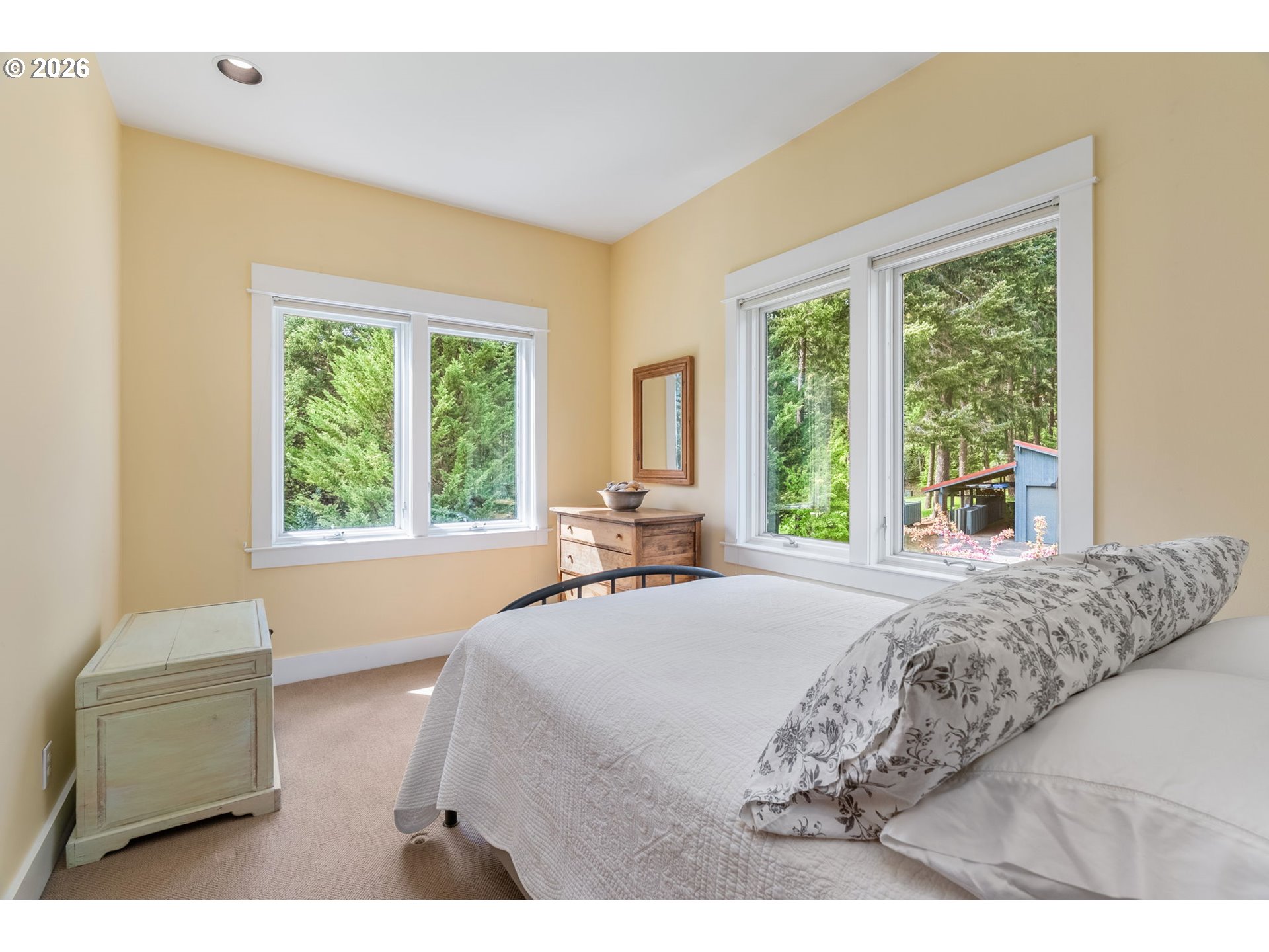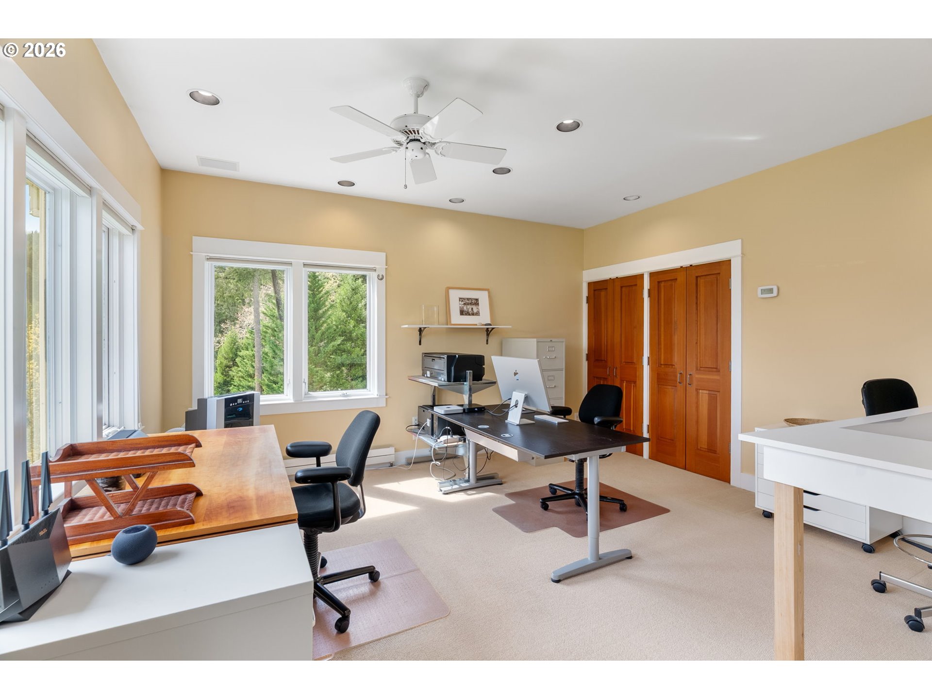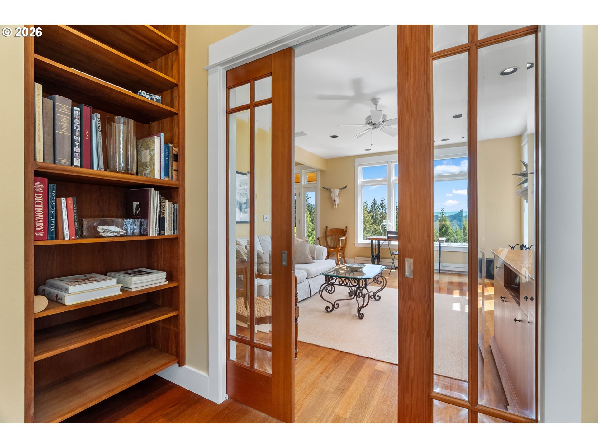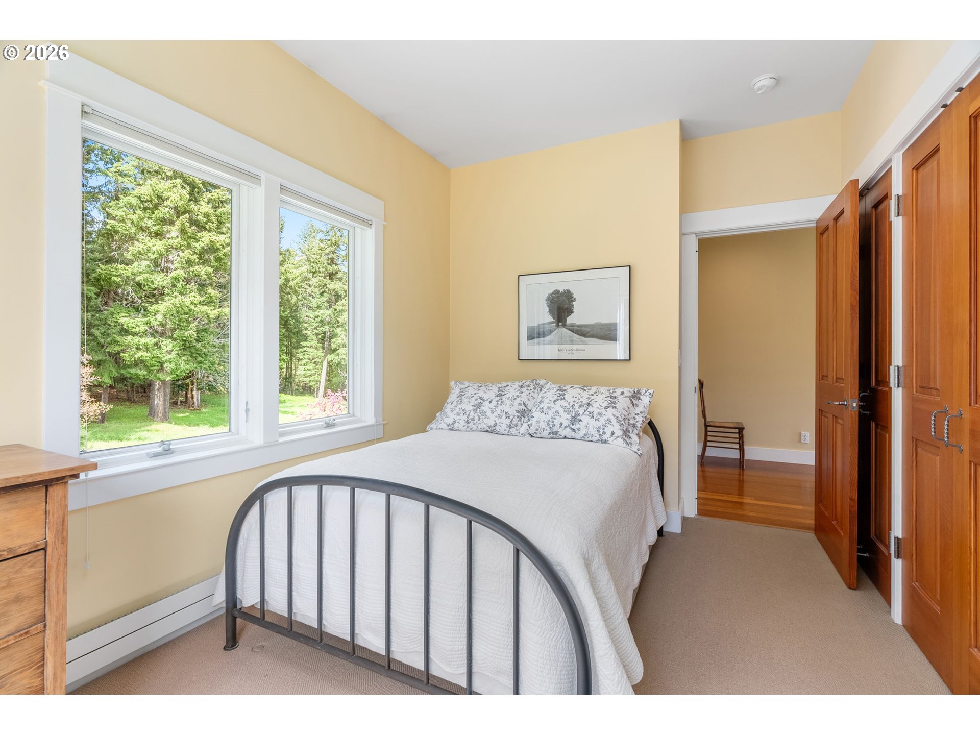 Set on a gently elevated knoll in Upper White Salmon, this architect-designed home offers quality craftsmanship in a private, tranquil Gorge setting. Situated on nearly five landscaped acres of open meadow and mature trees, the property provides a peaceful, park-like environment with seasonal color and full irrigation for ease of maintenance. The one-owner, 3 bedroom + den, 3 bath home reflects thoughtful design and meticulous care throughout. The light-filled interior features 9-foot ceilings, Merbau tropical hardwood floors, and Pella wood casement windows that capture natural light and surrounding views. The main level includes a gourmet kitchen with Viking range and hood, an open living area with fireplace, and an office or den with Simpson fir and glass pocket doors. A mudroom with laundry, utility sink, exterior access, and a full bath completes the main level. Upstairs, the primary suite includes a cast iron soaking tub and walk-in shower, along with two additional bedrooms, all finished with wool carpeting. Bathrooms feature Ann Sacks tile, Porcher fixtures, and radiant towel warmers. An upstairs balcony offers an elevated vantage point to take in the surrounding landscape and beauty. Outdoor living is well integrated with a covered deck and a fully screened east-facing porch for year-round enjoyment. A detached two-car garage/barn provides additional storage and workspace. Built for energy efficiency with solid insulation and passive solar design. The home is equipped with a whole-house Generac standby generator with automatic transfer switch and WiFi capability. 172 Upper Lakeview Rd is a place to settle in, stretch out, and take in the quiet rhythm of the Gorge.