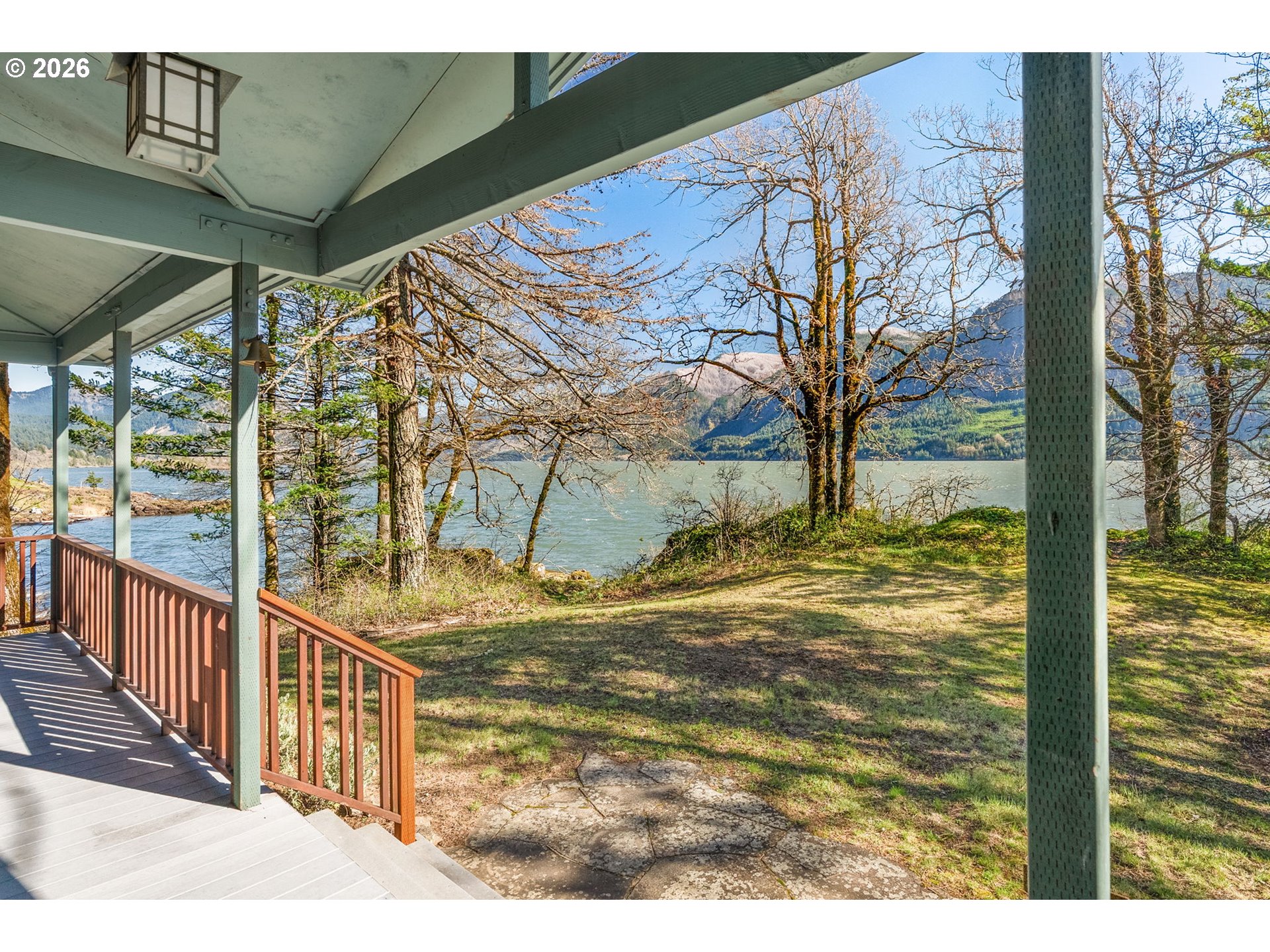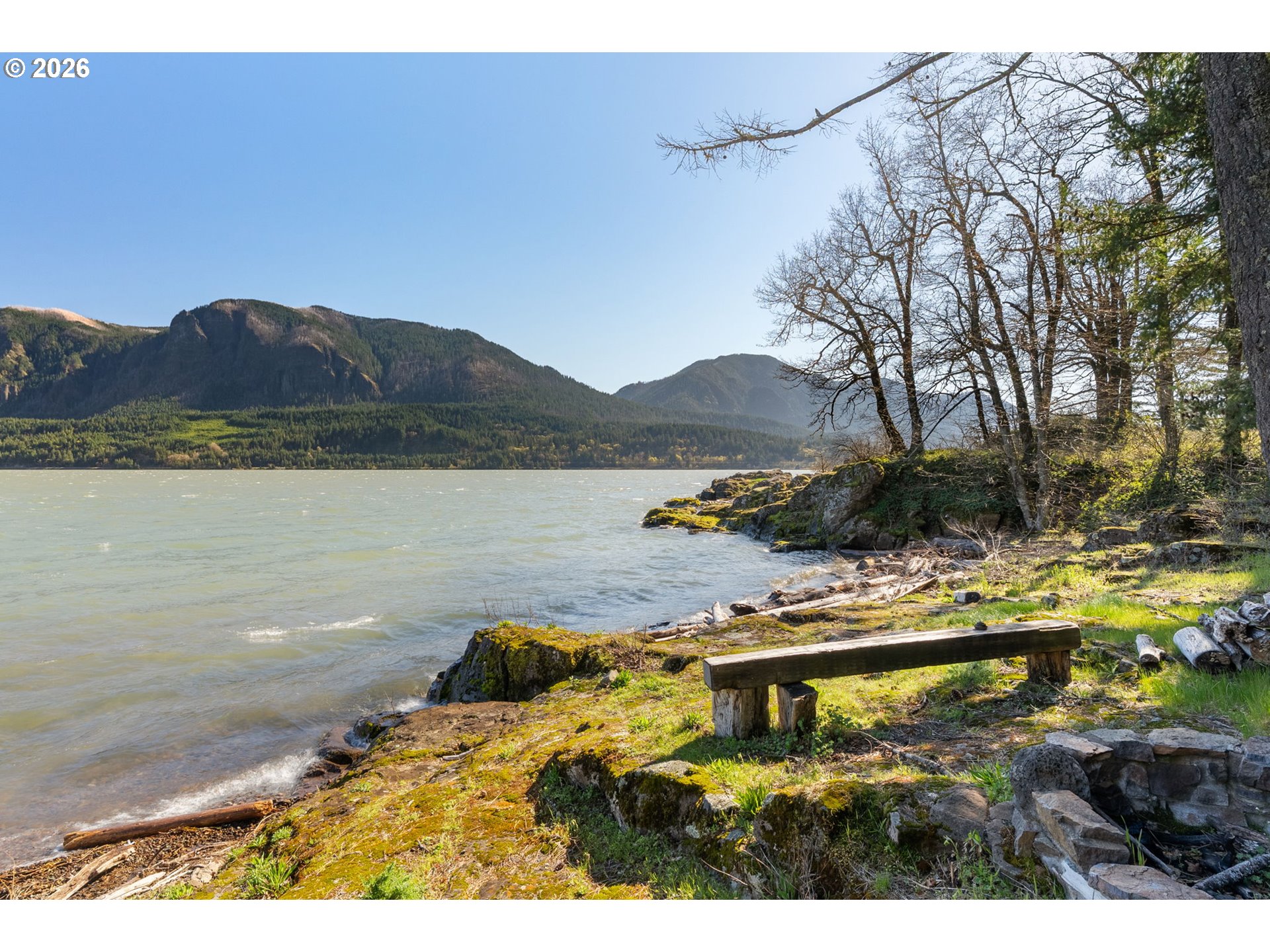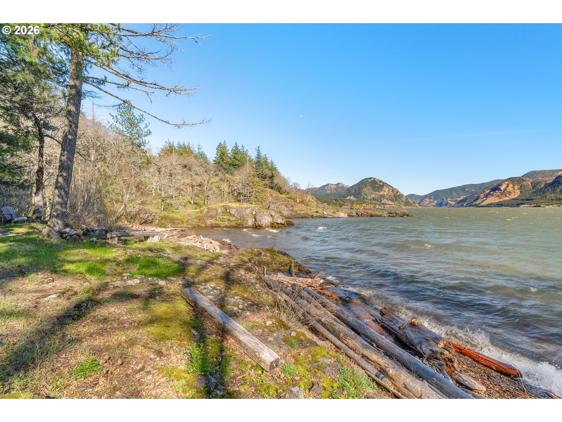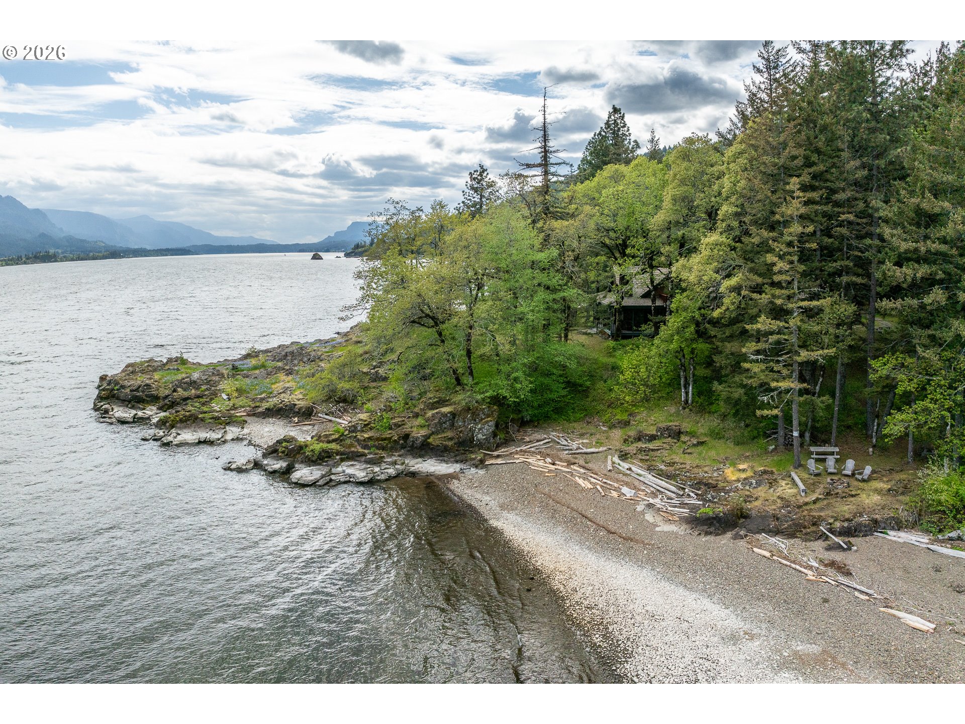 One-of-a-kind waterfront property in the heart of the Columbia River Gorge. Welcome to your own private paradise! Bordered to the south by the Columbia River, this property boasts an expansive beach, multiple inlets, and a bluff along 750+ feet of private waterfront. The beautiful year-round Carson Creek flows through the lush, forested acreage, providing a habitat for abundant wildlife. Just steps from the water lies a custom-built home offering stunning sunrise-to-sunset views. The home features stone siding quarried on-site and a covered wrap-around porch, inviting you to relax and enjoy the serene surroundings. Main Level Features: beamed ceilings, Australian Cypress floors, open-concept living area with a custom fireplace, primary suite, and laundry nook. Upper Level Features: large picture windows, family room, spacious office/bonus room, 2nd bedroom with private balcony, 2nd bathroom with walk-in shower and soaking tub. A custom-built detached guest studio provides privacy for your visitors, complete with a walk-in closet, bathroom, loft, and fireplace. Enjoy the abundant wildlife and breathtaking views from your private beach, explore the creek bed, or take advantage of river access as a watersports launch site! This property offers something for everyone. Located in the Columbia Gorge National Scenic Area. Buyer due diligence is recommended for any improvements or changes.