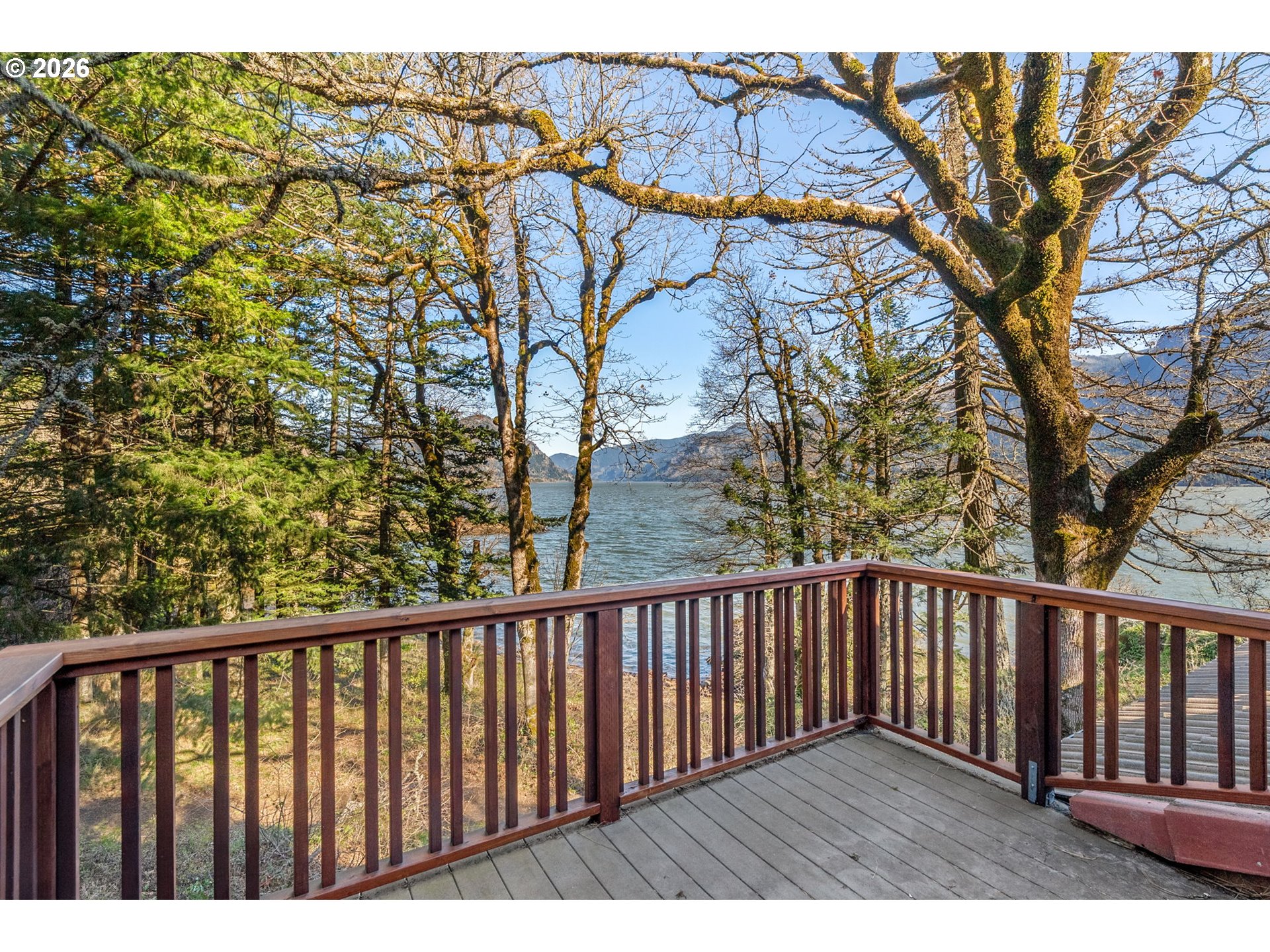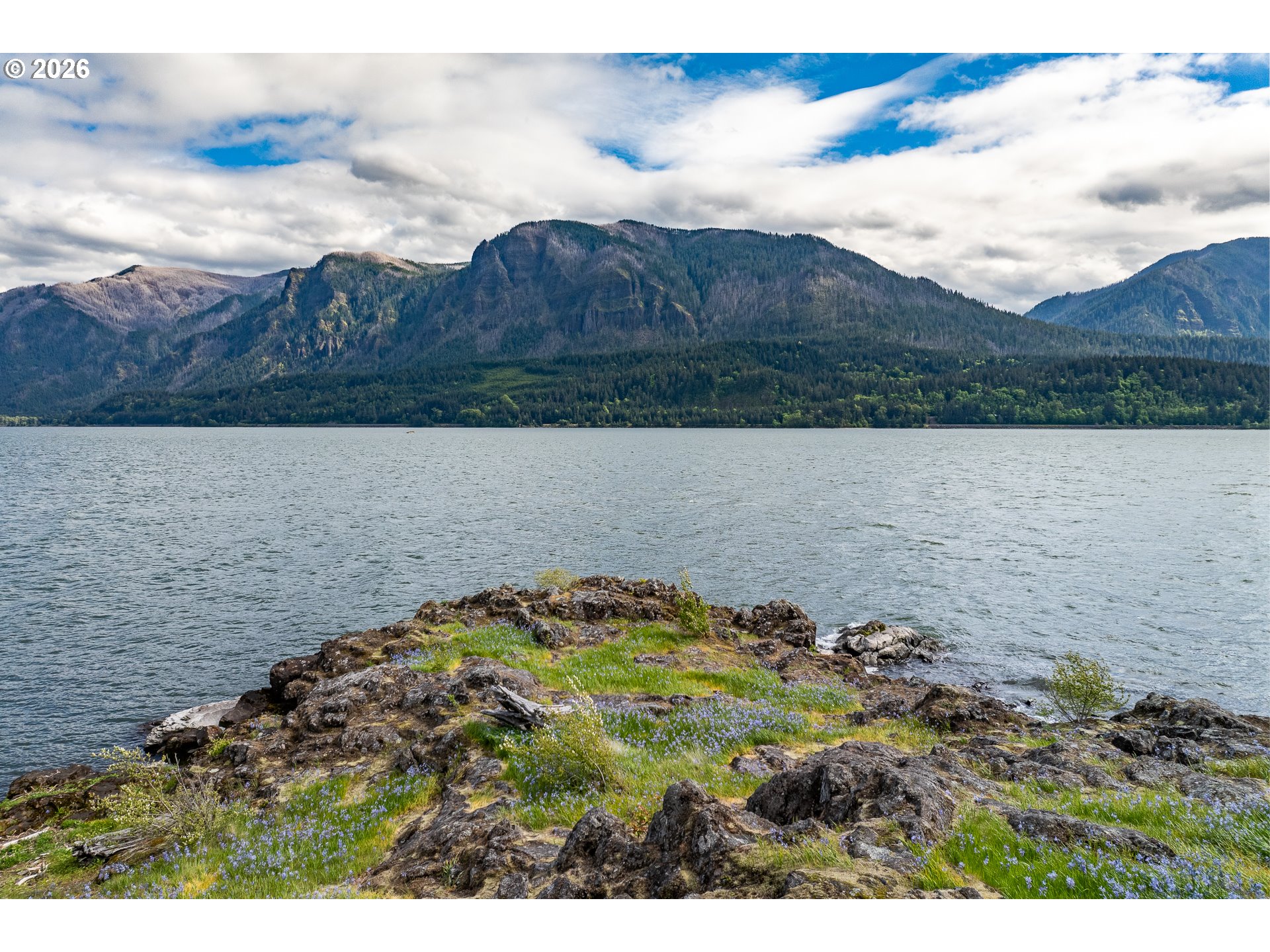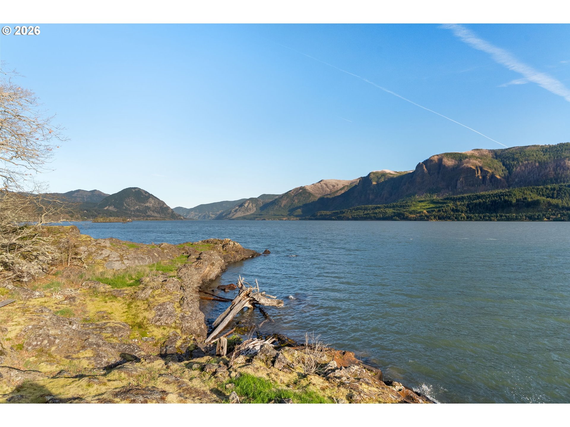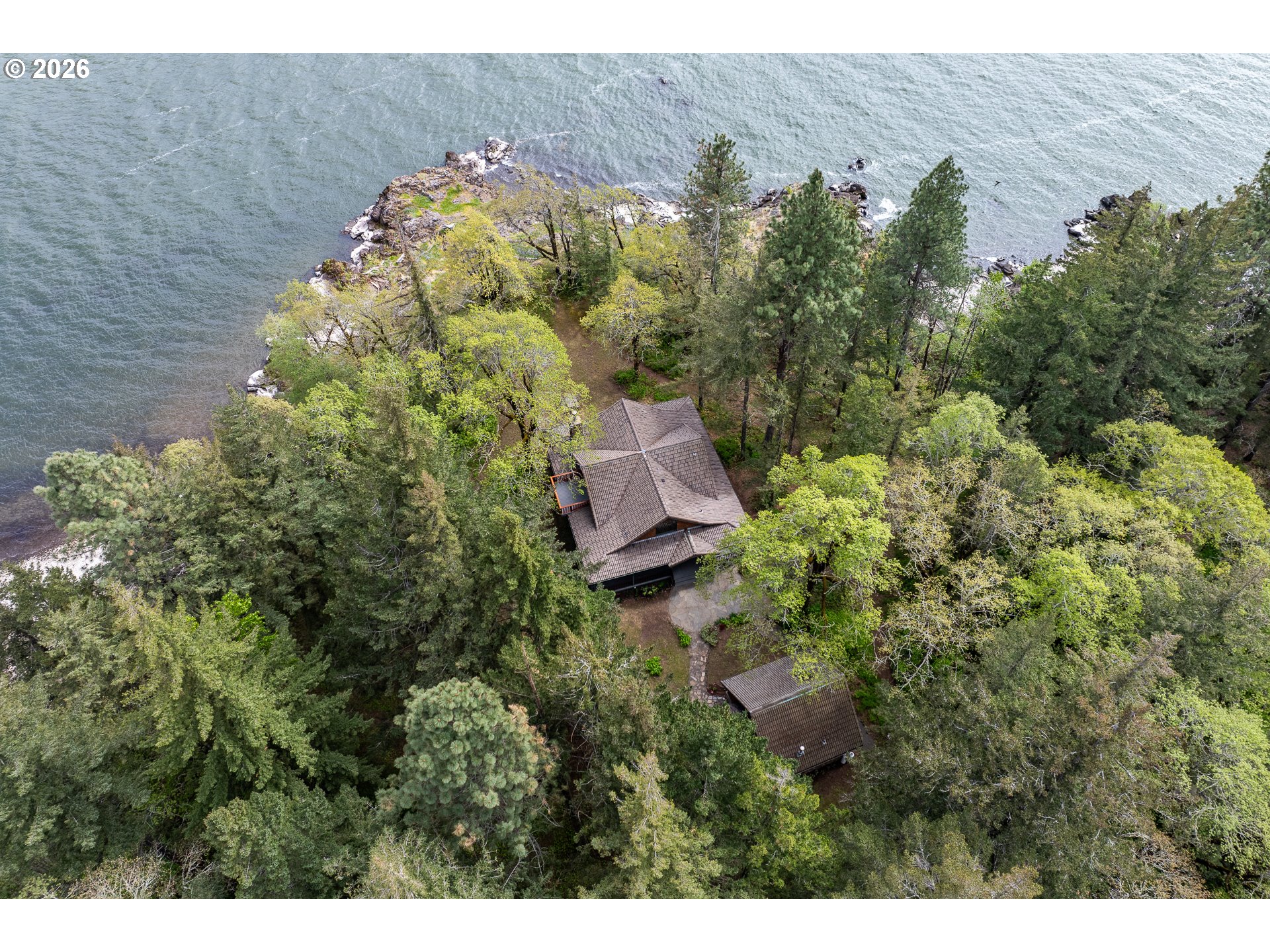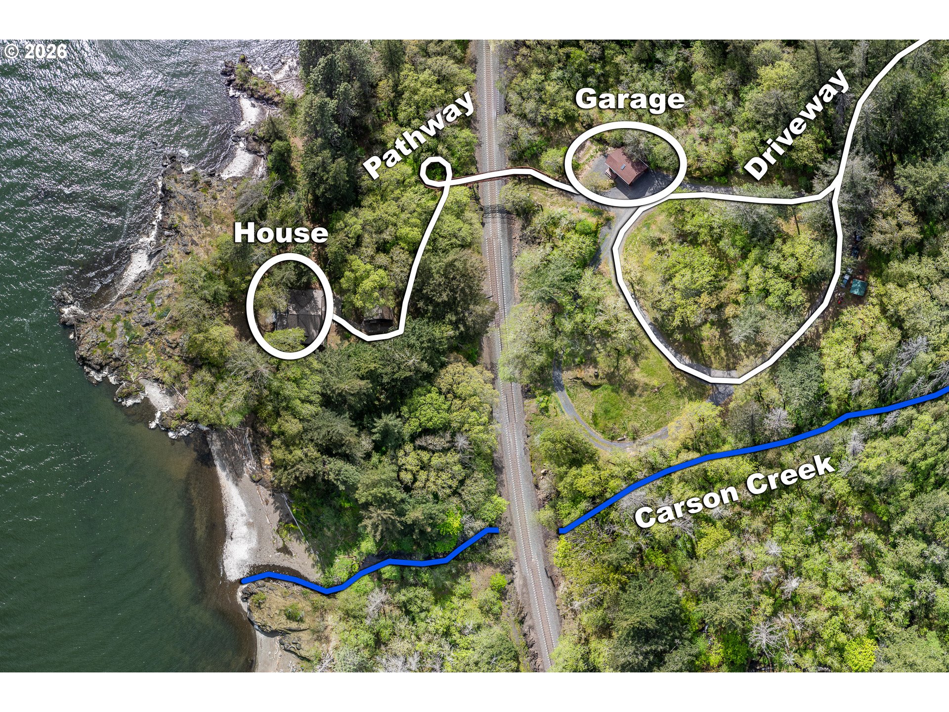 One-of-a-kind waterfront property in the heart of the Columbia River Gorge. Welcome to your own private paradise! Bordered to the south by the Columbia River, this property boasts an expansive beach, multiple inlets, and a bluff along 750+ feet of private waterfront. The beautiful year-round Carson Creek flows through the lush, forested acreage, providing a habitat for abundant wildlife. Just steps from the water lies a custom-built home offering stunning sunrise-to-sunset views. The home features stone siding quarried on-site and a covered wrap-around porch, inviting you to relax and enjoy the serene surroundings. Main Level Features: beamed ceilings, Australian Cypress floors, open-concept living area with a custom fireplace, primary suite, and laundry nook. Upper Level Features: large picture windows, family room, spacious office/bonus room, 2nd bedroom with private balcony, 2nd bathroom with walk-in shower and soaking tub. A custom-built detached guest studio provides privacy for your visitors, complete with a walk-in closet, bathroom, loft, and fireplace. Enjoy the abundant wildlife and breathtaking views from your private beach, explore the creek bed, or take advantage of river access as a watersports launch site! This property offers something for everyone. Located in the Columbia Gorge National Scenic Area. Buyer due diligence is recommended for any improvements or changes.